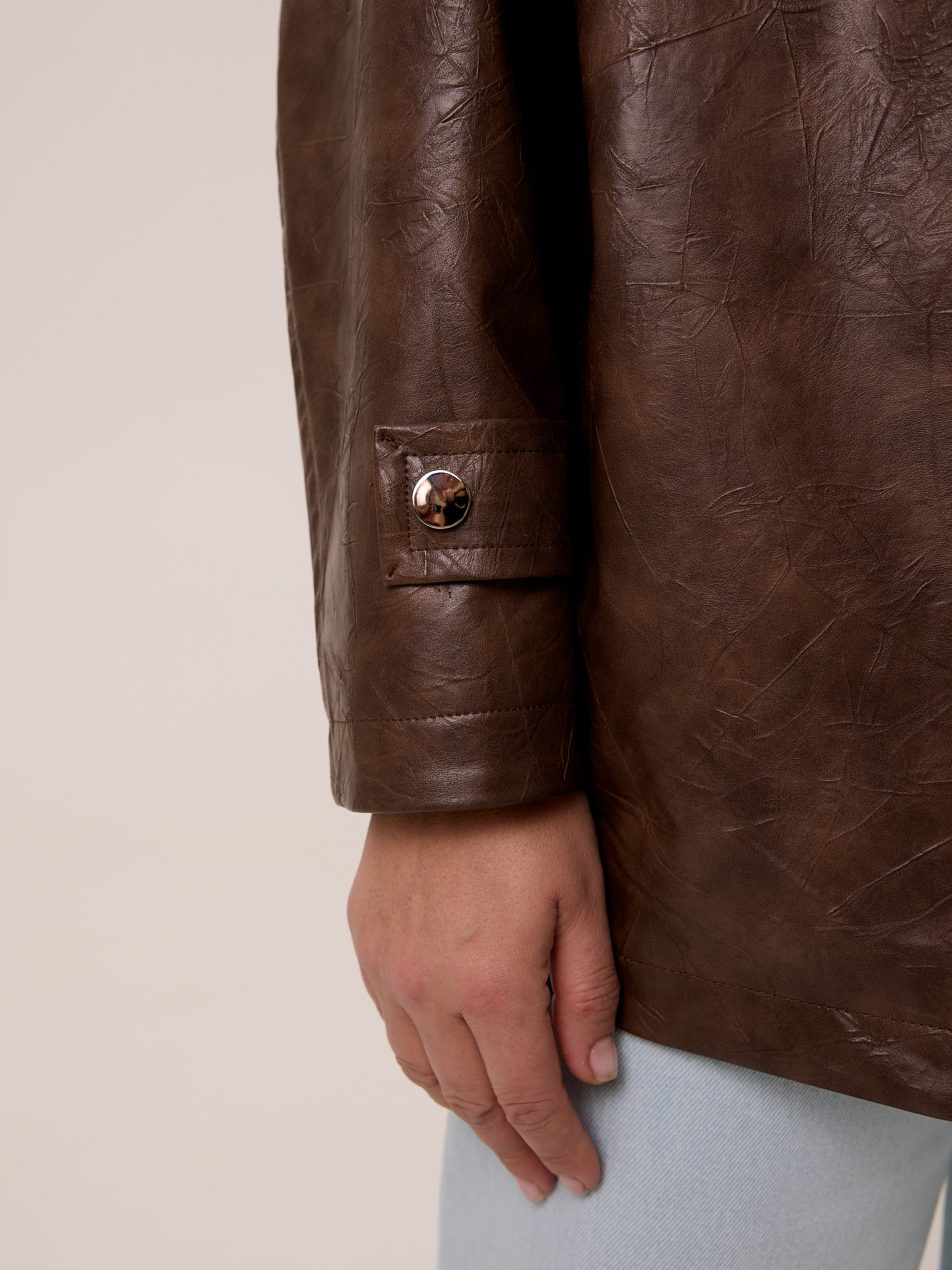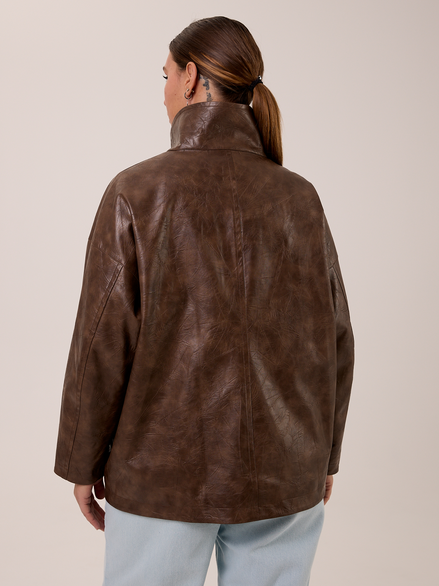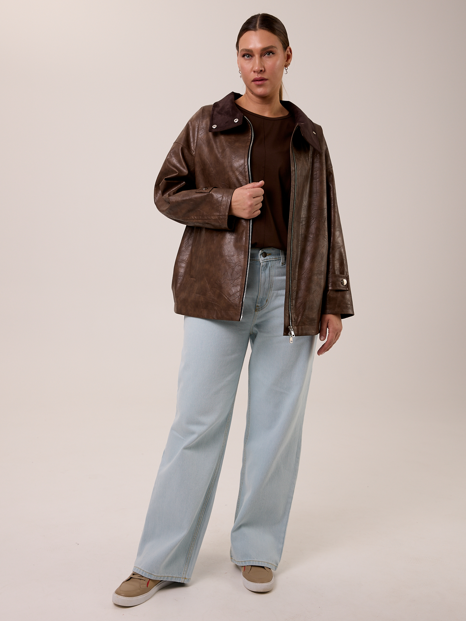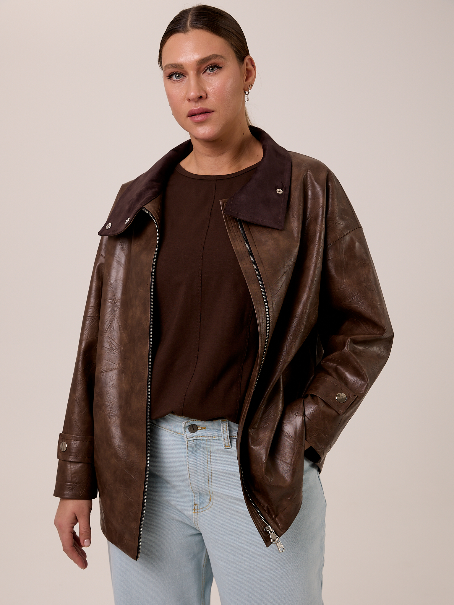Куртка типа «бомбер», объемная, со спущенным плечевым поясом. Воротник- высокая стойка с отделкой из замши, застегивается на кнопки. Рукава широкие с патами внизу. Боковые карманы с листочками. Куртка застегивается на металлическую молнию. Изделие выполнено из искусственной кожи с утепленной подкладкой термофин 60гр/м2.