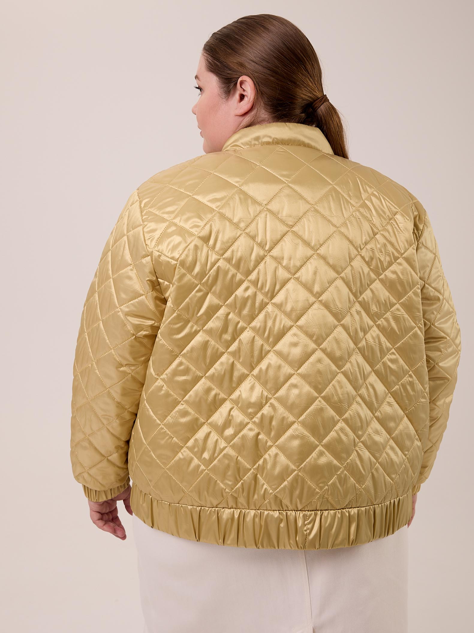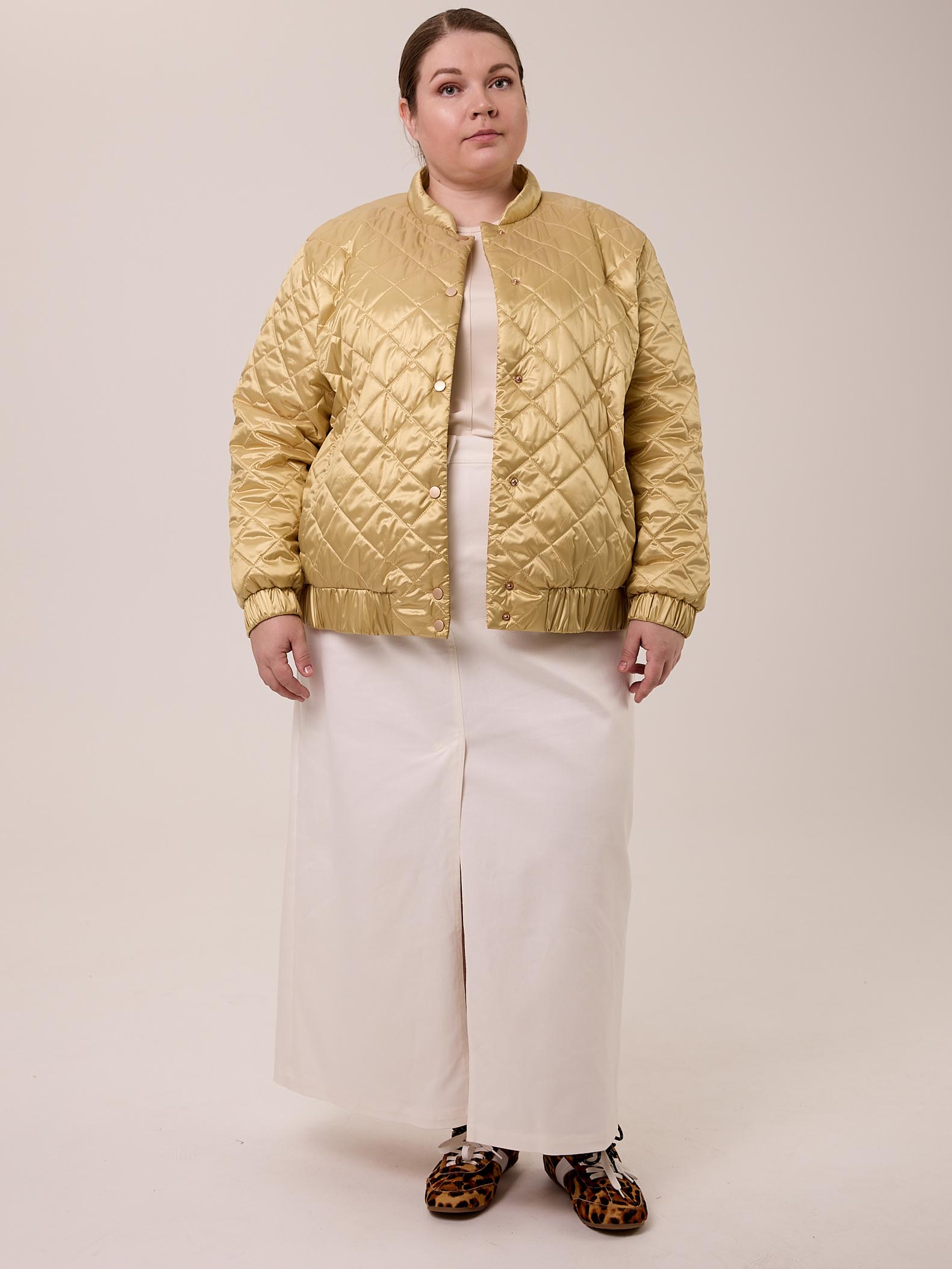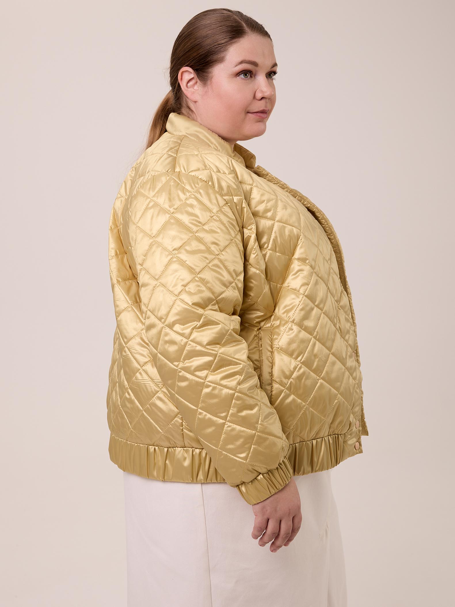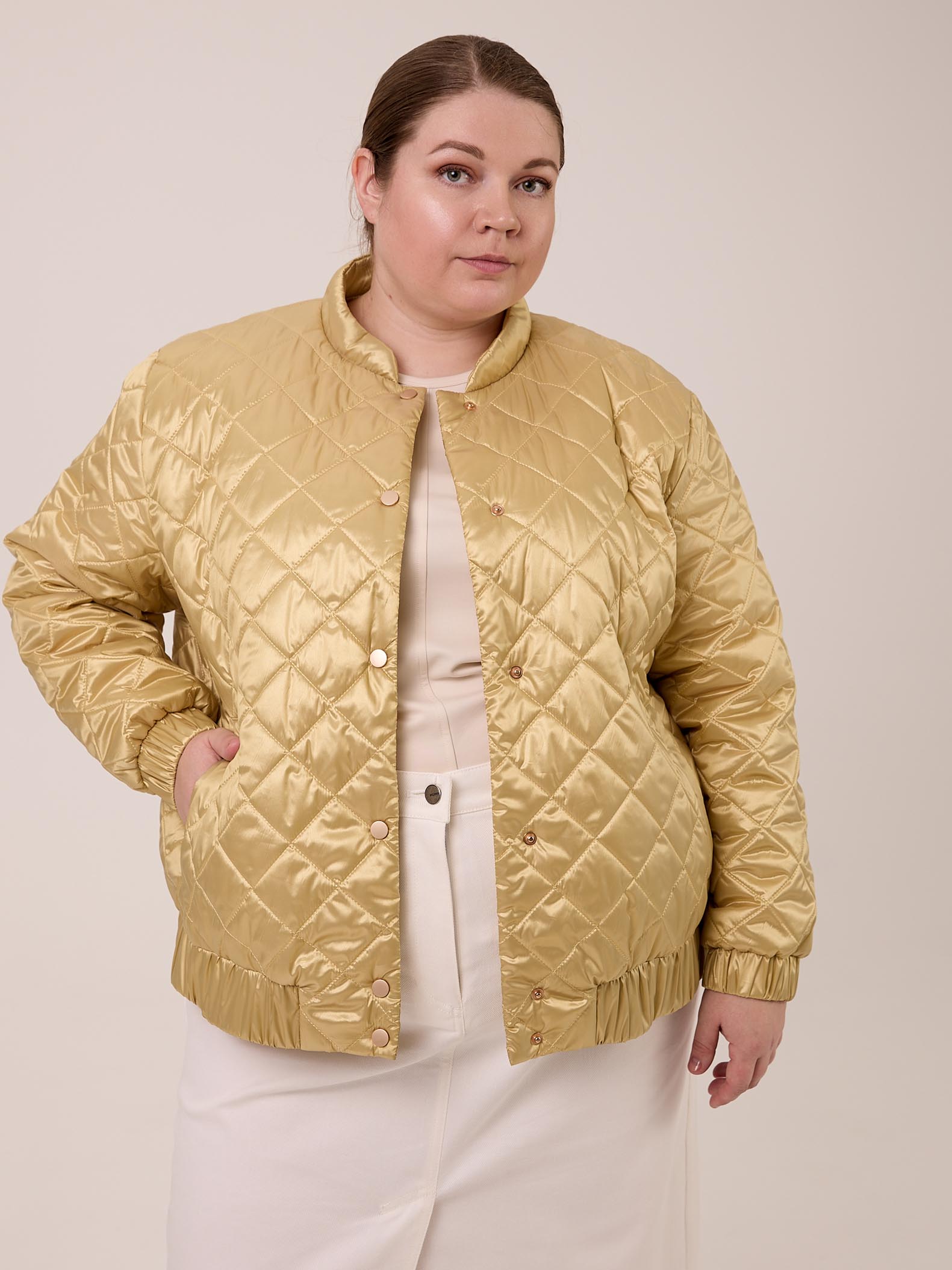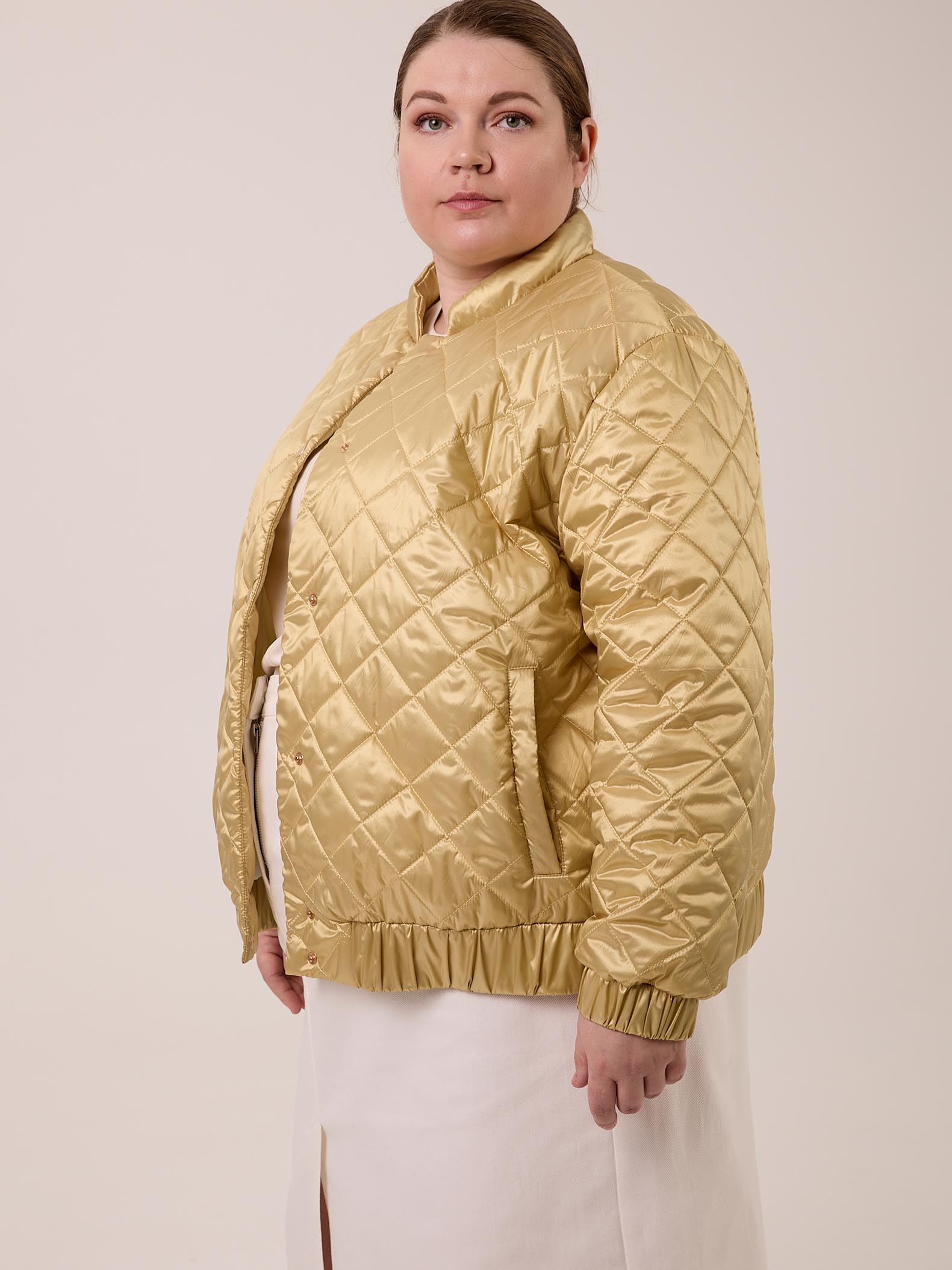 Куртка – бомбер – облегченная куртка из стеганной курточной с водоотталкивающем покрытием ткани с легким мерцанием, застежка на декоративные кнопки, по низу рукава и изделия – резинка.