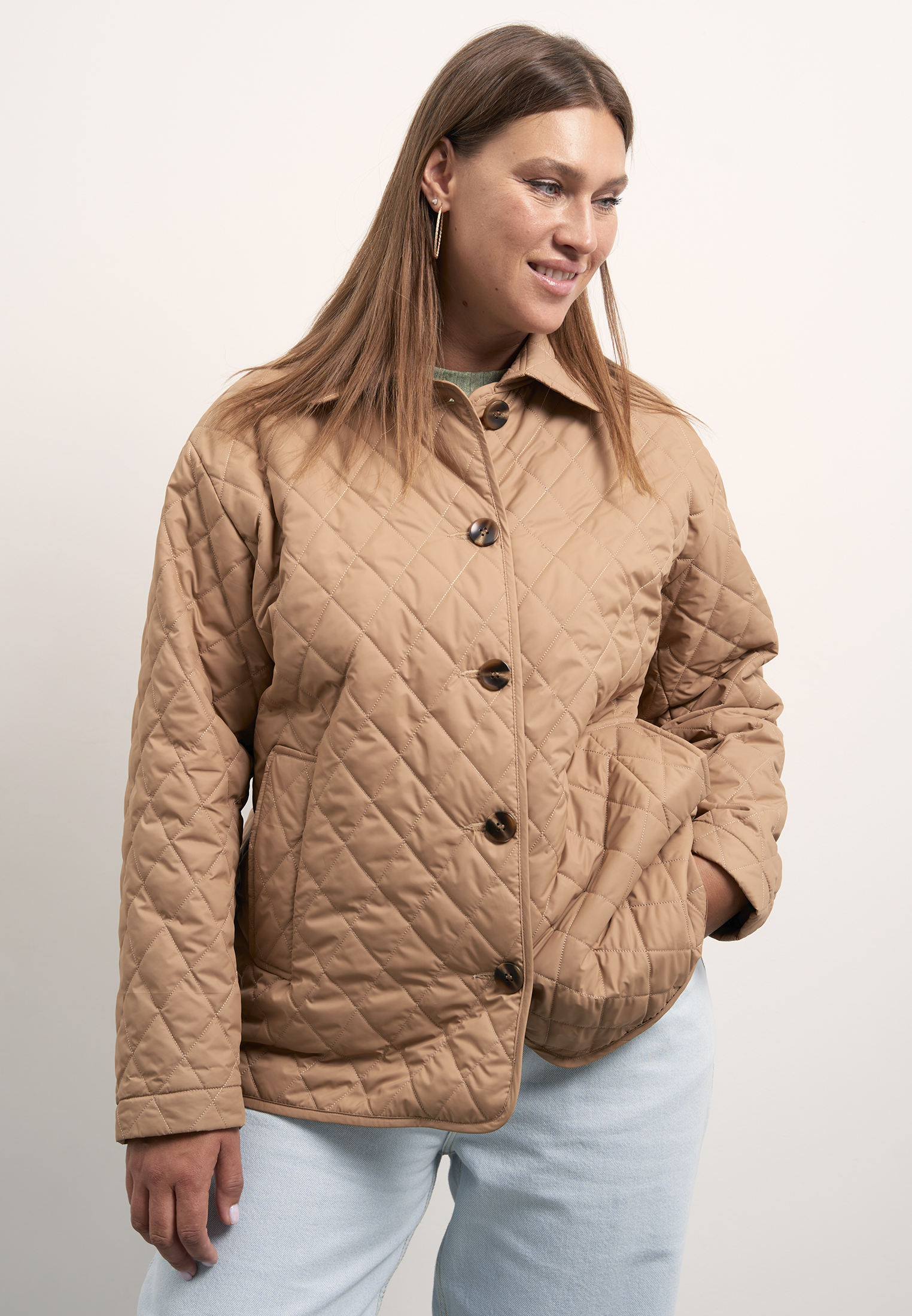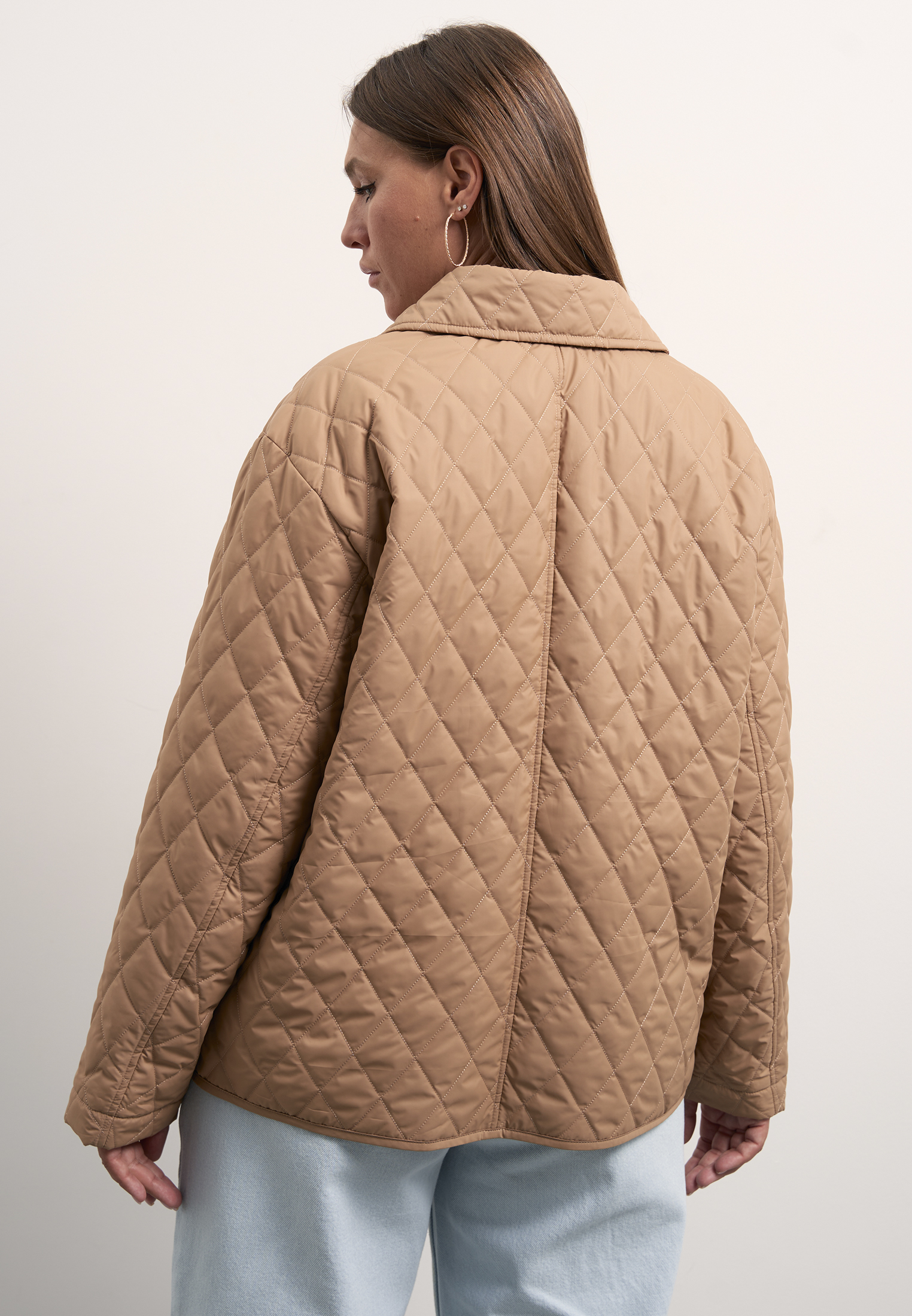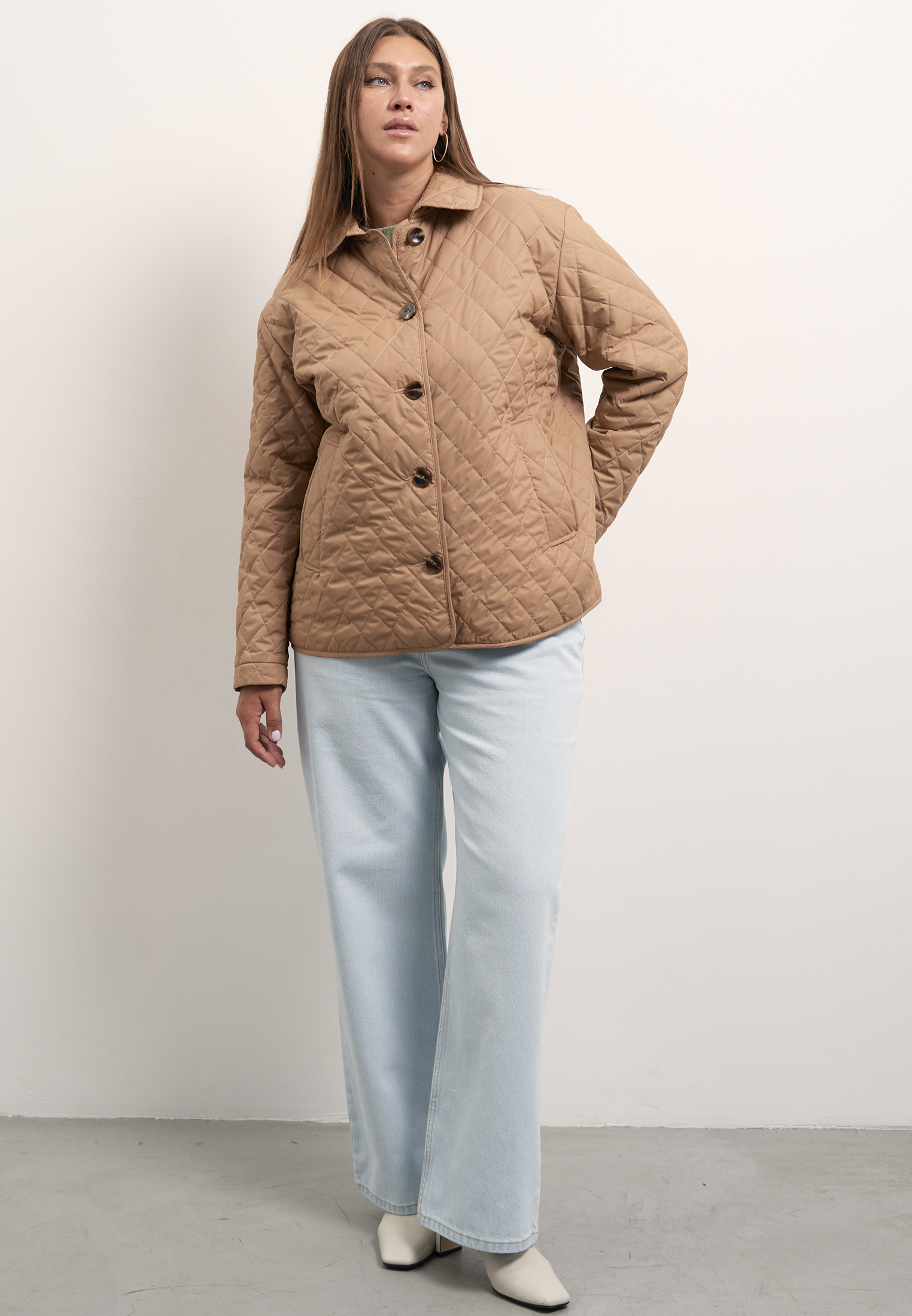 Куртка прямого силуэта, длиной до бедер. Воротник отложной с закругленными углами. Плечевой пояс немного спущен. Боковые карманы прорезные с листочками. Застегивается куртка на петли и пуговицы. Утеплитель термофин 60гр/м2. Изделие выполнено из стеганой ткани в трех цветах: темно-синем, темно-бежевом, свестло-сером.
