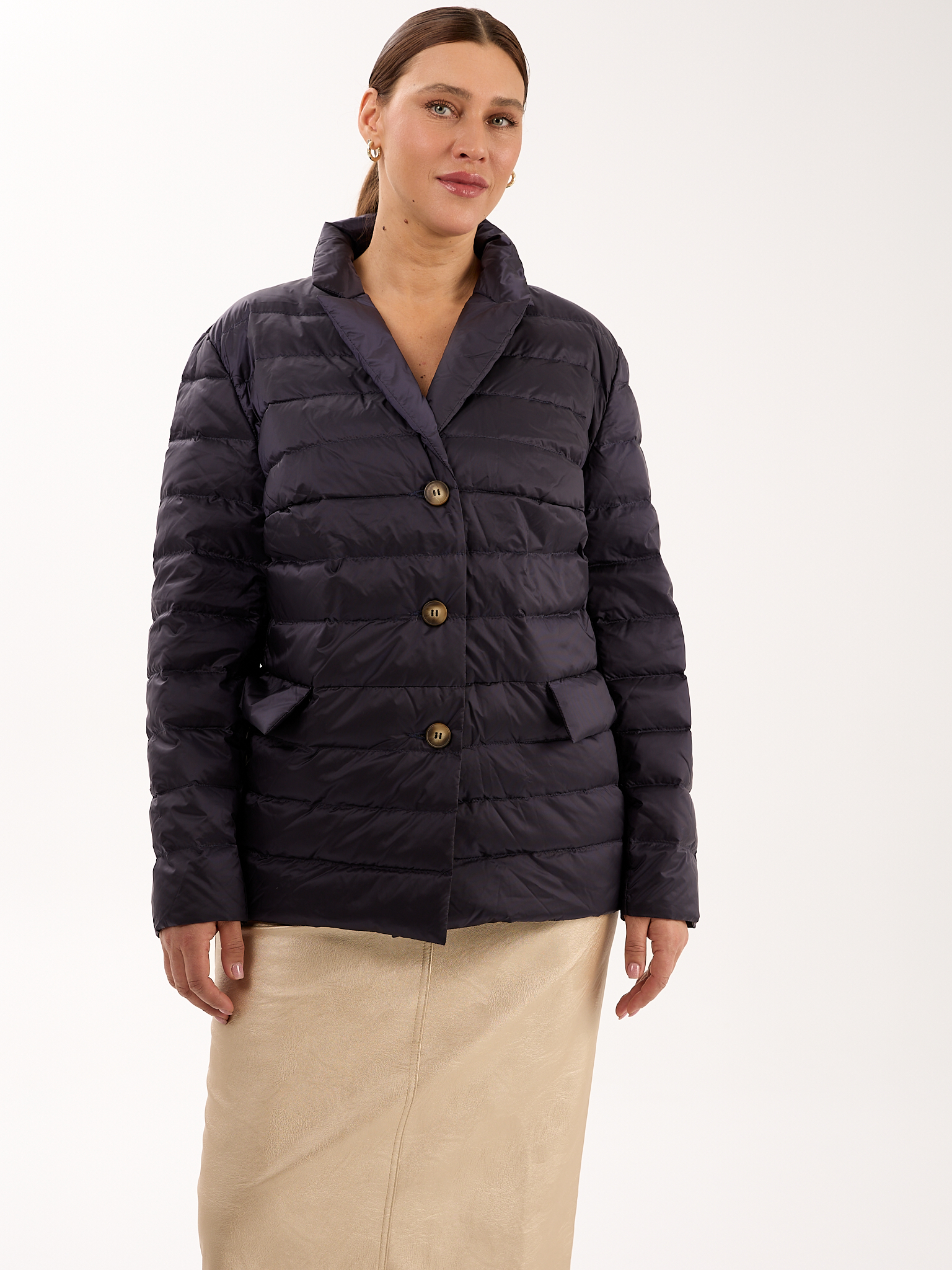 Легкий жакет-пуховик полуприлегающего силуэта, длиной до бедер. Воротник английский с лацканами. Рукава втачные двухшовные. Нагрудная вытачка обеспечивает хорошую посадку. Карманы горизонтальные, пиджачного типа, с клапанами. Изделие застегивается на петли и пуговицы. Выполнено из нейлоновой курточной ткани в трех цветах: темно-синем, серо-голубом, лиловом.