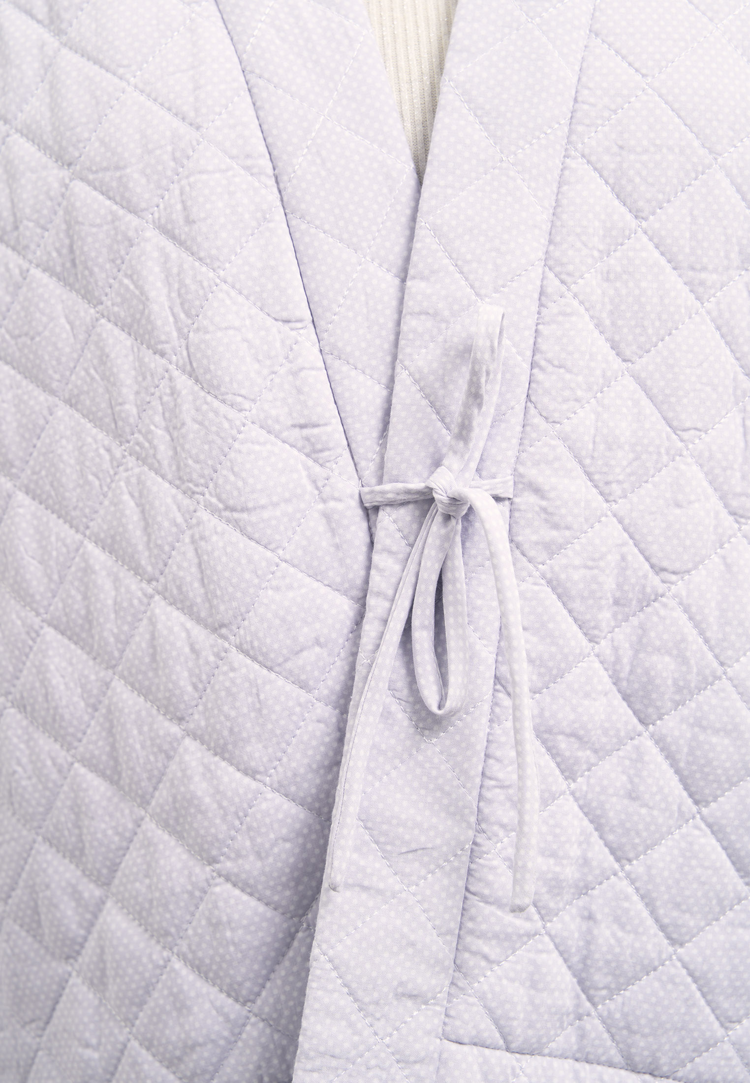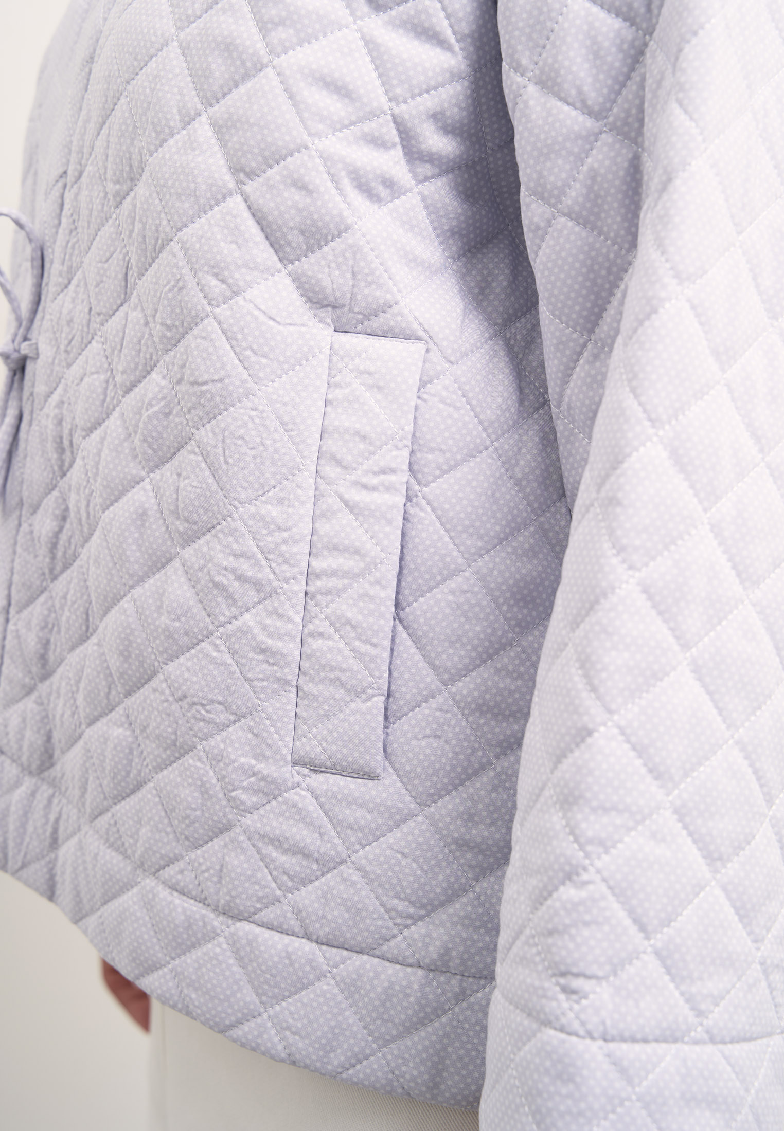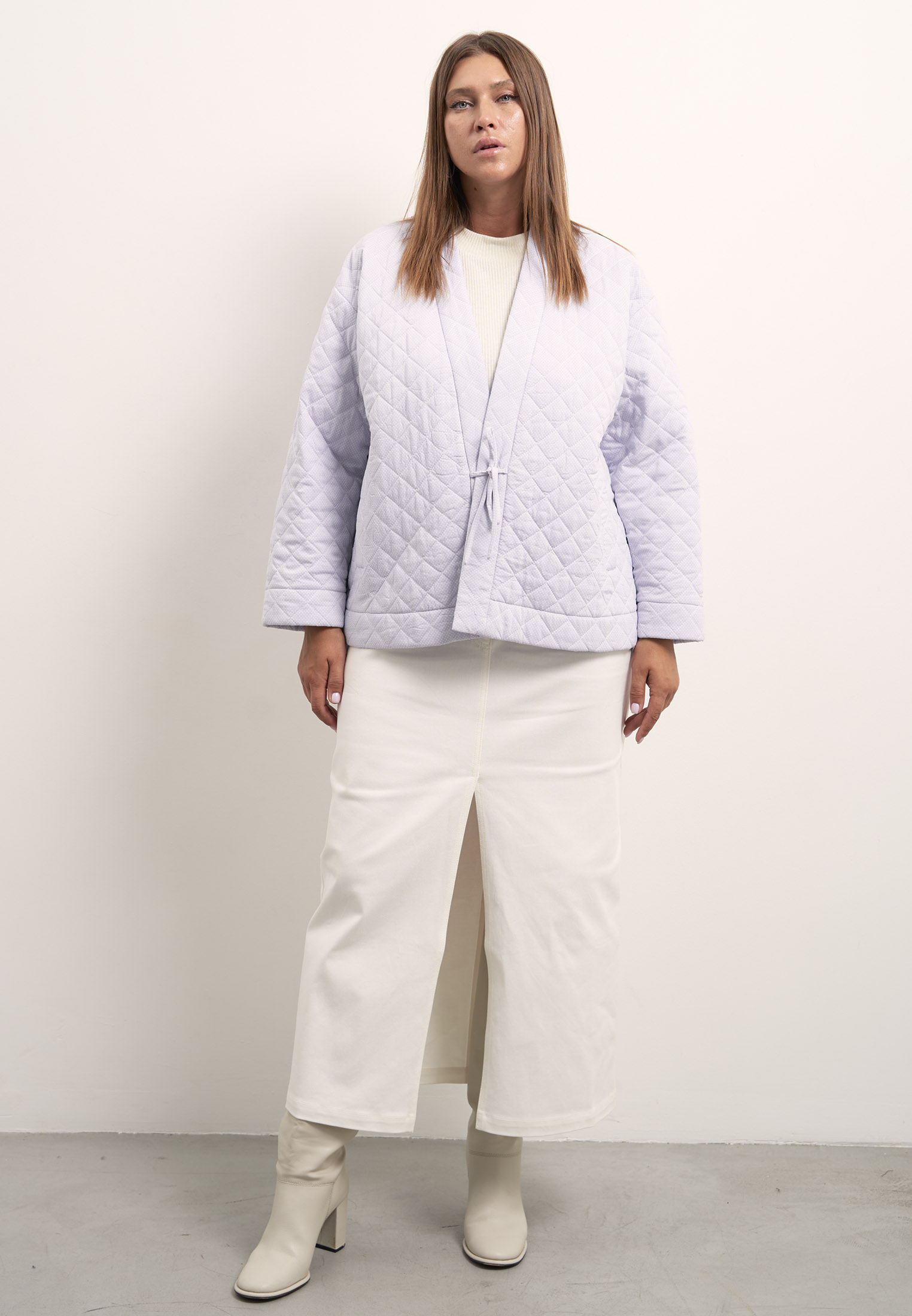 Уютный жакет «овер» свободного кроя на завязках. Рукава спущенные. Боковые карманы прорезные с листочками. Утеплитель термофин 60 г/м. Жакет выполнен из двусторонней стеганой вискозной ткани в св. сиреневом цвете.