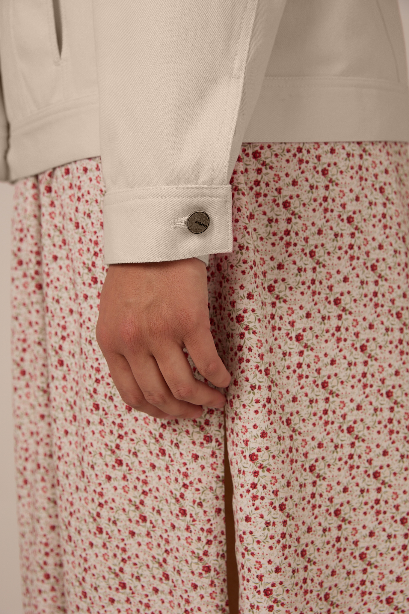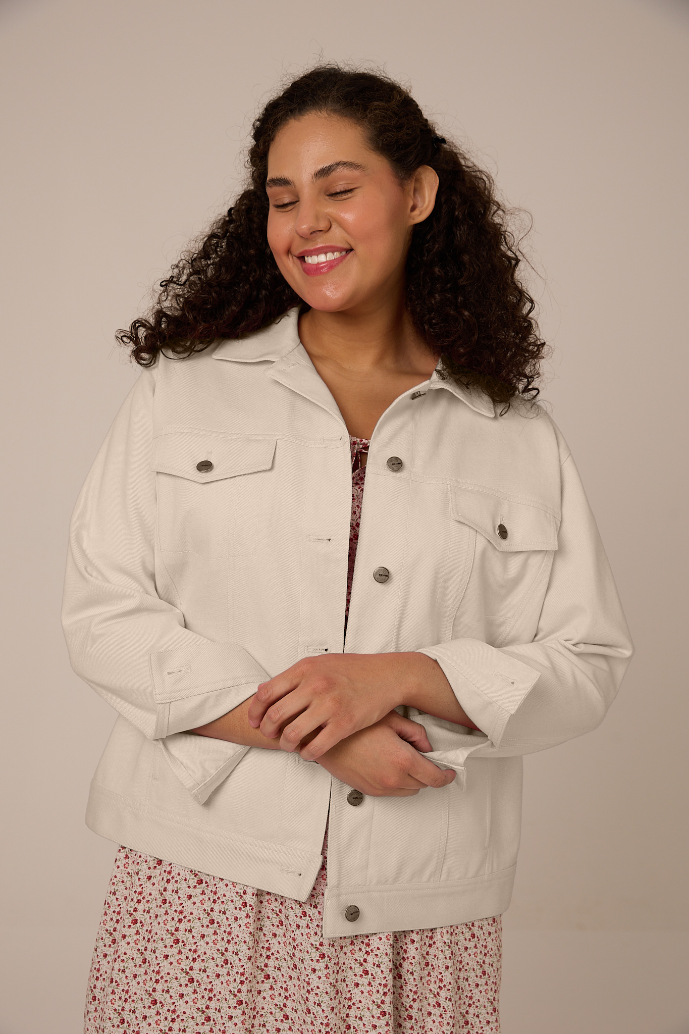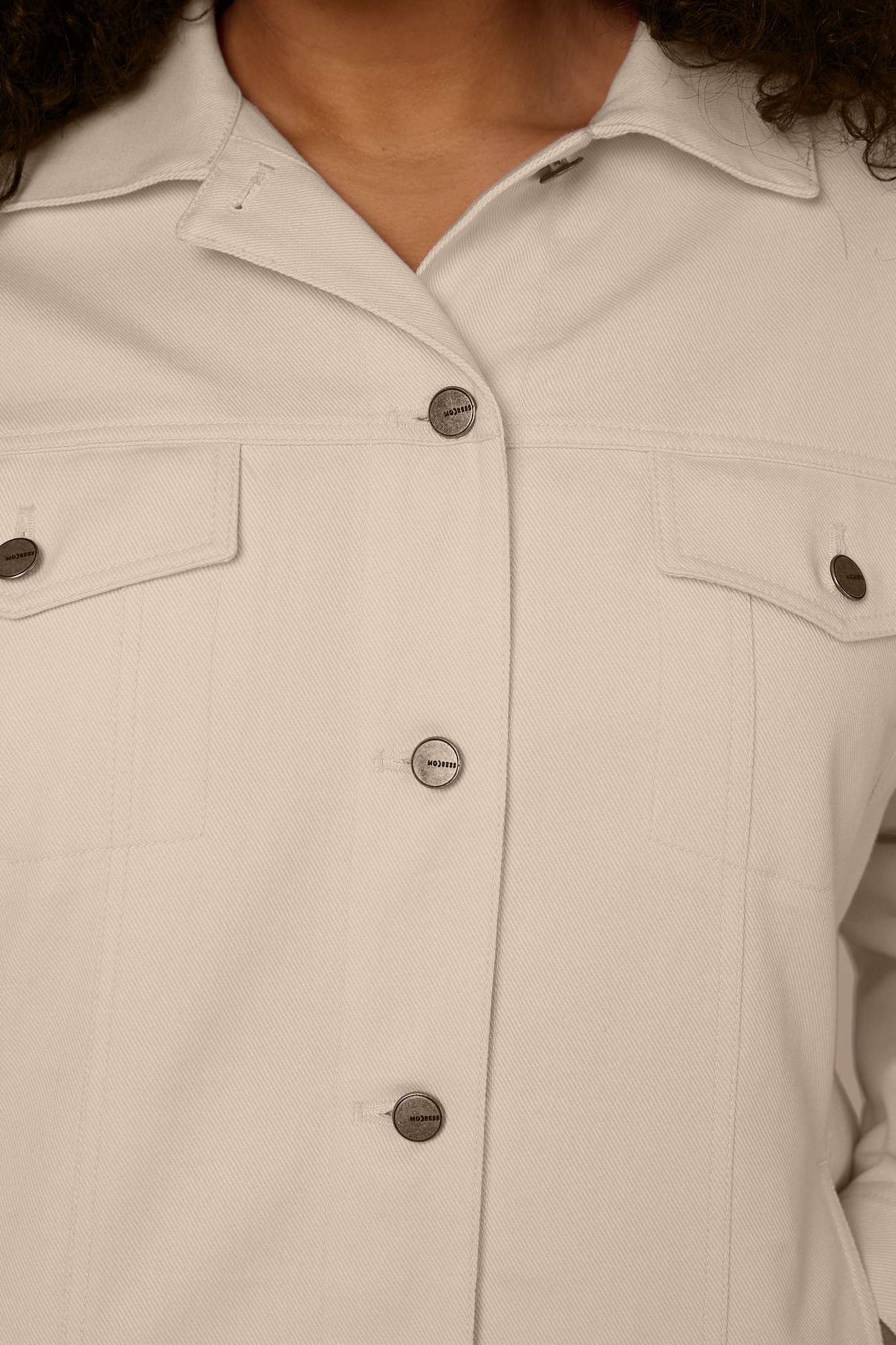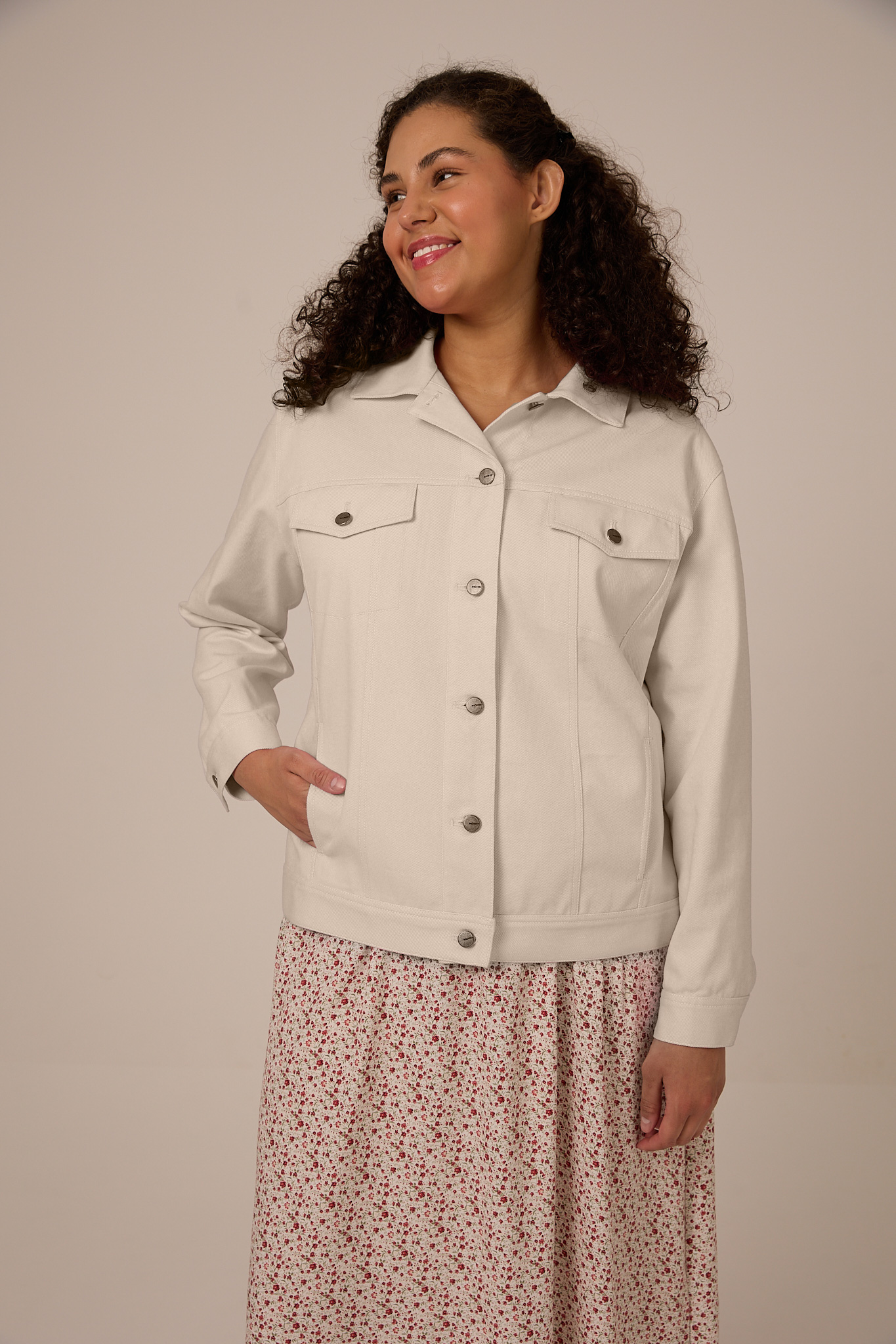 Куртка прямого кроя, длиной до бедер. Воротник отложной. Плечевой пояс приспущен, рукава двухшовные с манжетами. На спинке и полочке отрезные кокетки. На модели выполнены нагрудные карманы с клапанами и боковые карманы в рельефах. По низу изделия притачной пояс. Куртка и манжеты рукавов застегиваются на болты и петли. Модель выполнена из 100% хлопка в молочном, желтом и розовом цветах.