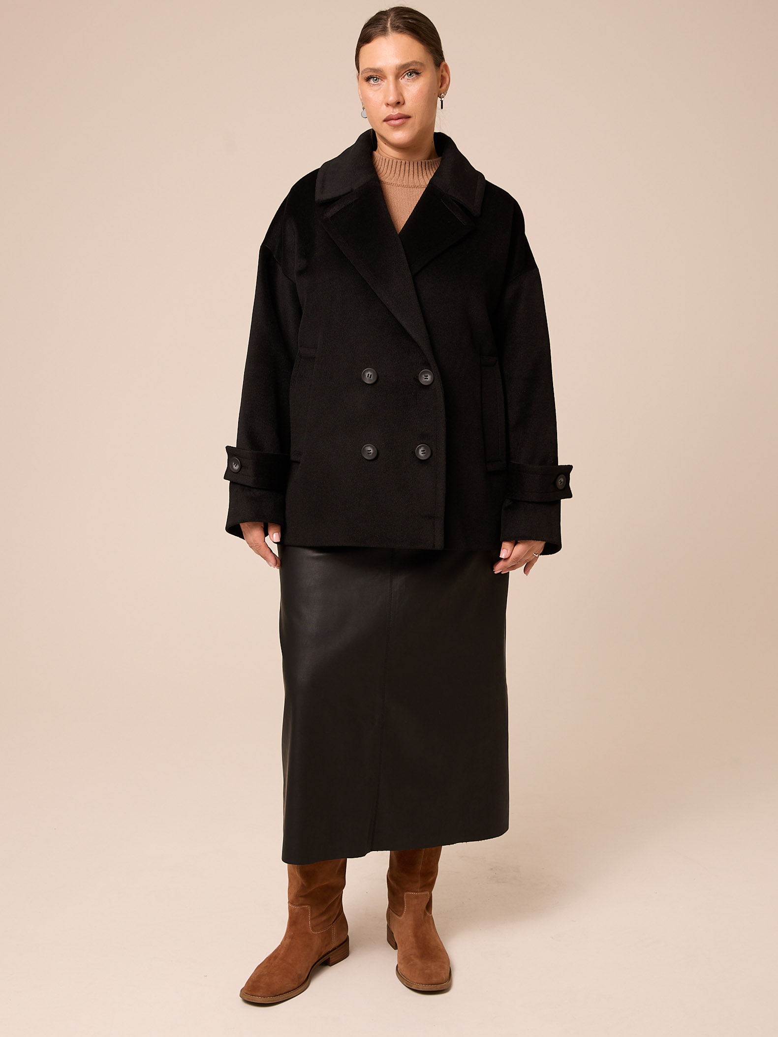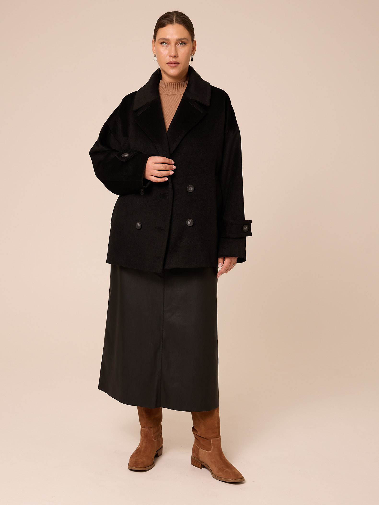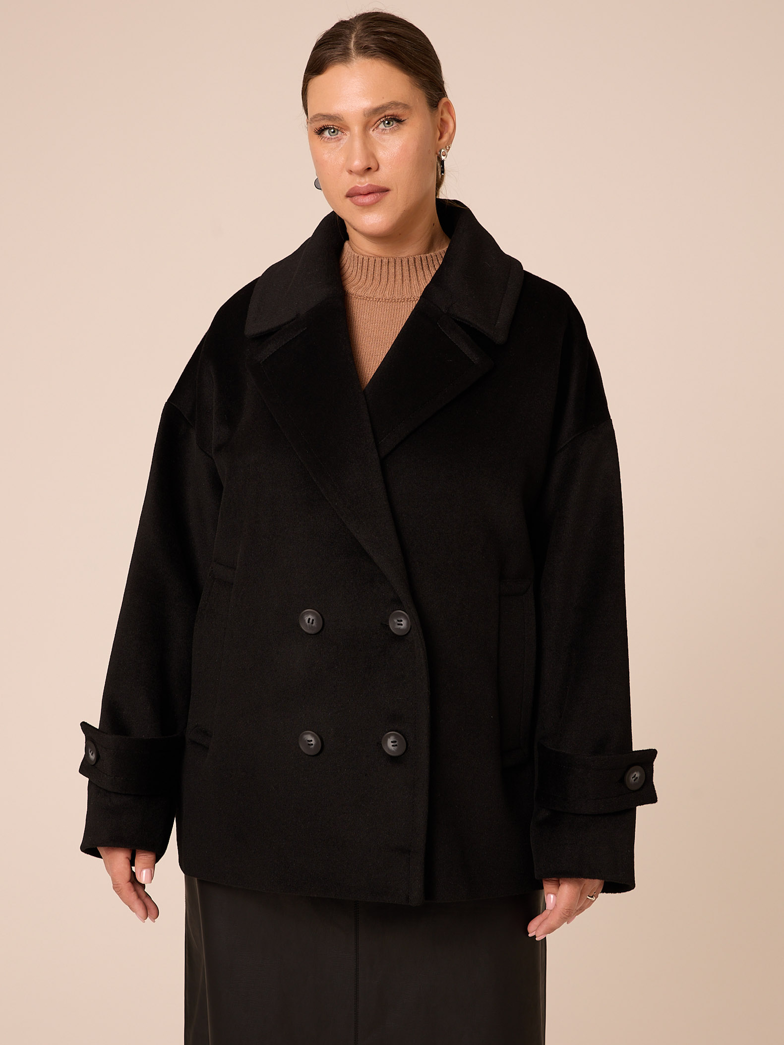 Короткое двубортное полупальто прямого свободного кроя. Воротник широкий «английский» с лацканами. Рукава спущенные с патами. Боковые карманы прорезные с широкими листочками. Длина изделия до линии бедер. Застегивается пальто на петли и пуговицы. Изделие выполнено на подкладке.