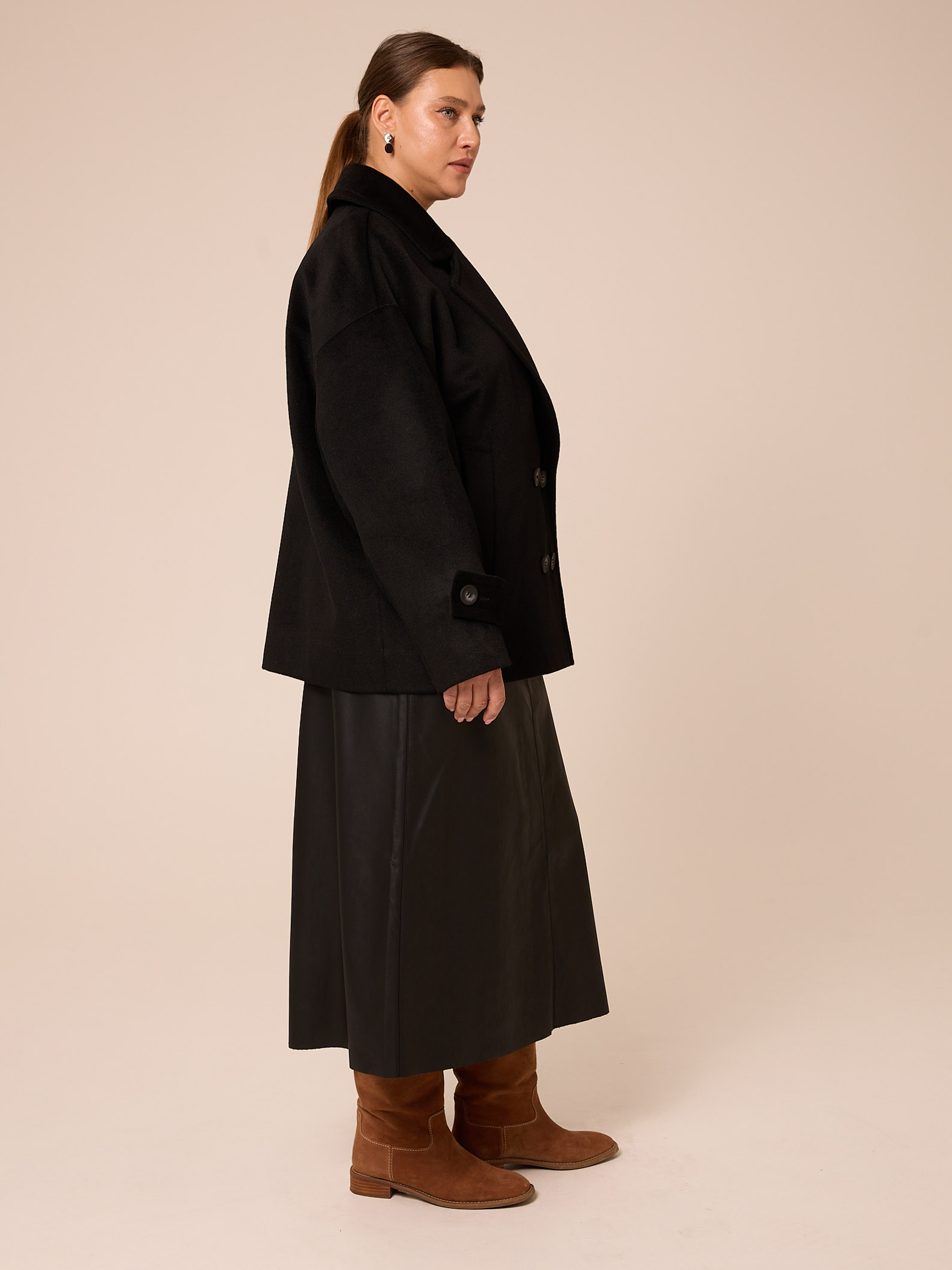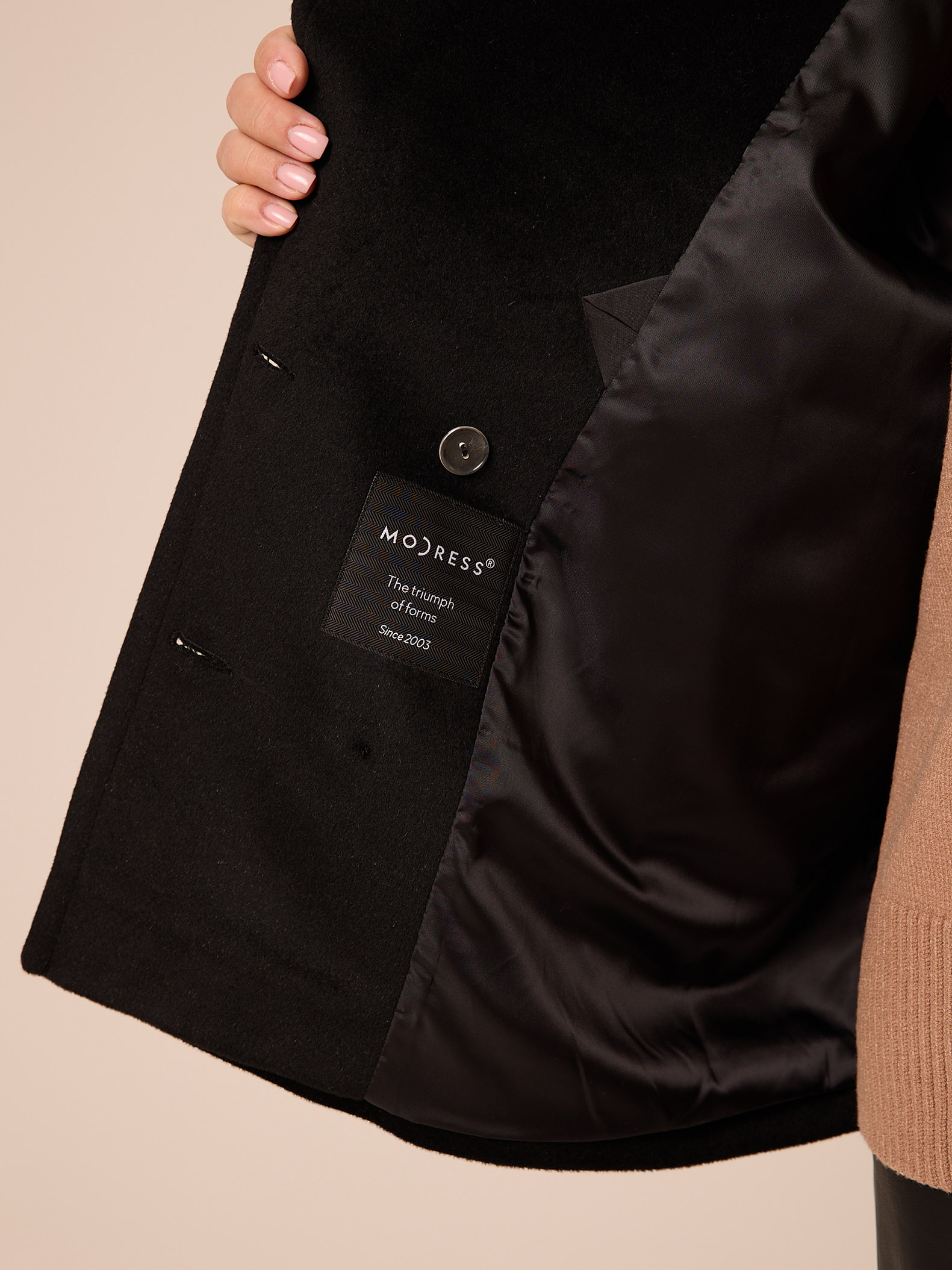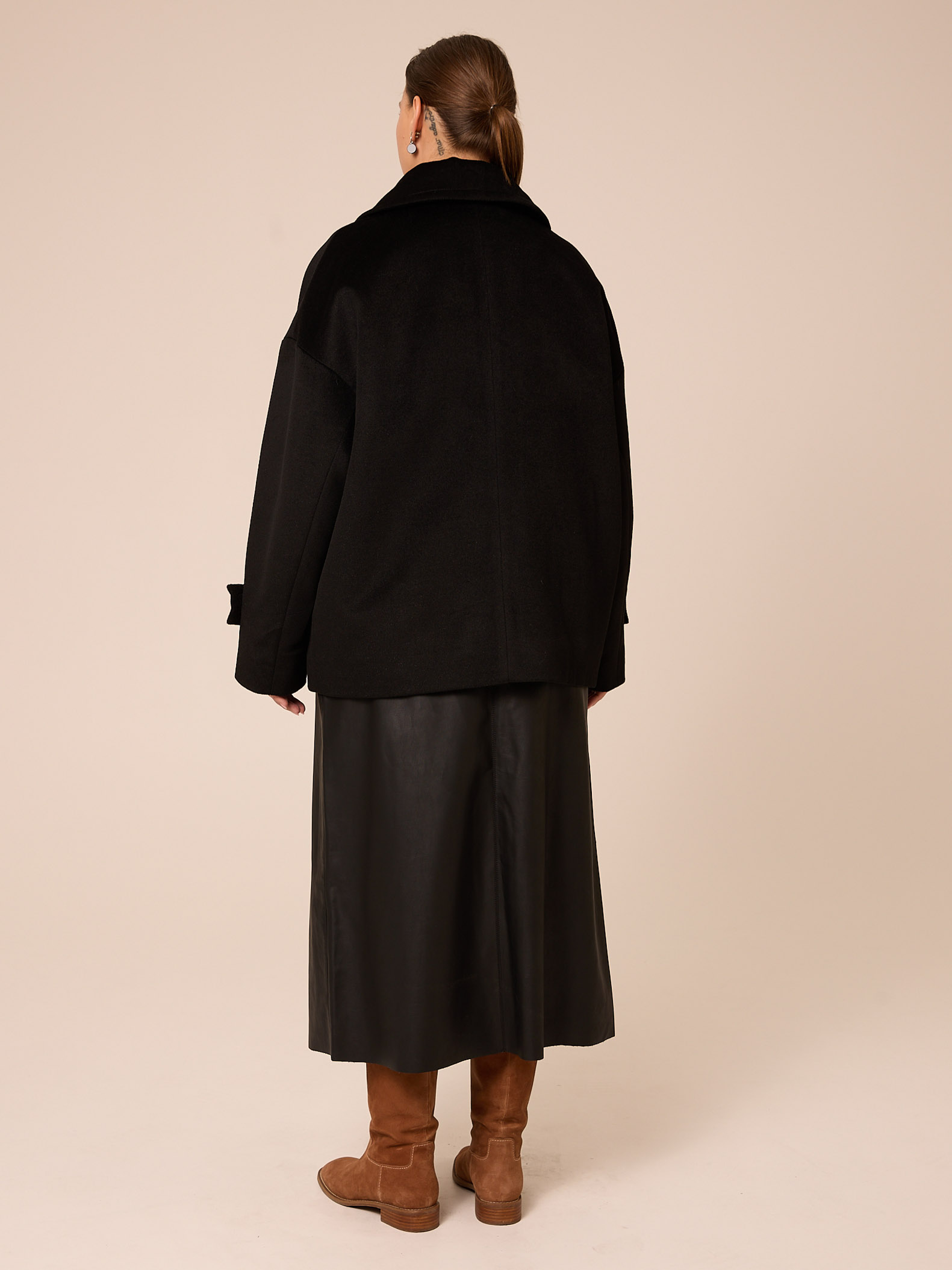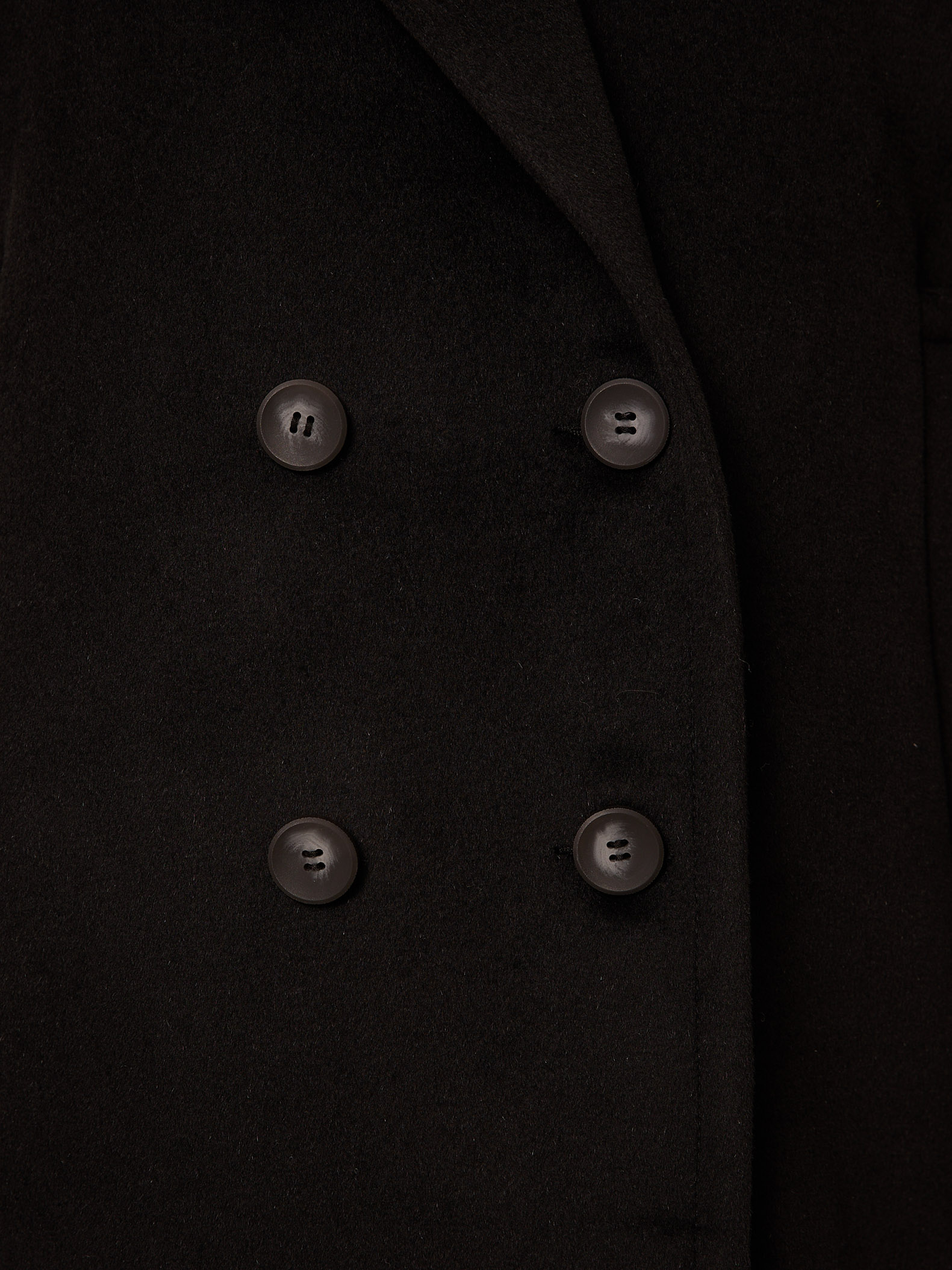Короткое двубортное полупальто прямого свободного кроя. Воротник широкий «английский» с лацканами. Рукава спущенные с патами. Боковые карманы прорезные с широкими листочками. Длина изделия до линии бедер. Застегивается пальто на петли и пуговицы. Изделие выполнено на подкладке.