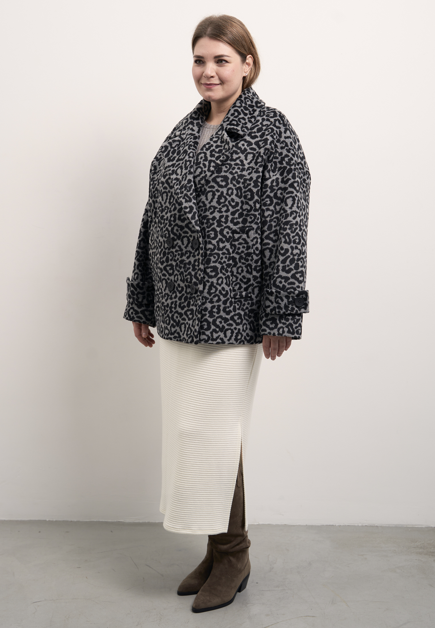 Короткое двубортное полупальто прямого свободного кроя. Воротник широкий «английский» с лацканами. Рукава спущенные с патами. Боковые карманы прорезные с широкими листочками. Длина изделия до линии бедер. Застегивается пальто на петли и пуговицы. Изделие выполнено на подкладке.