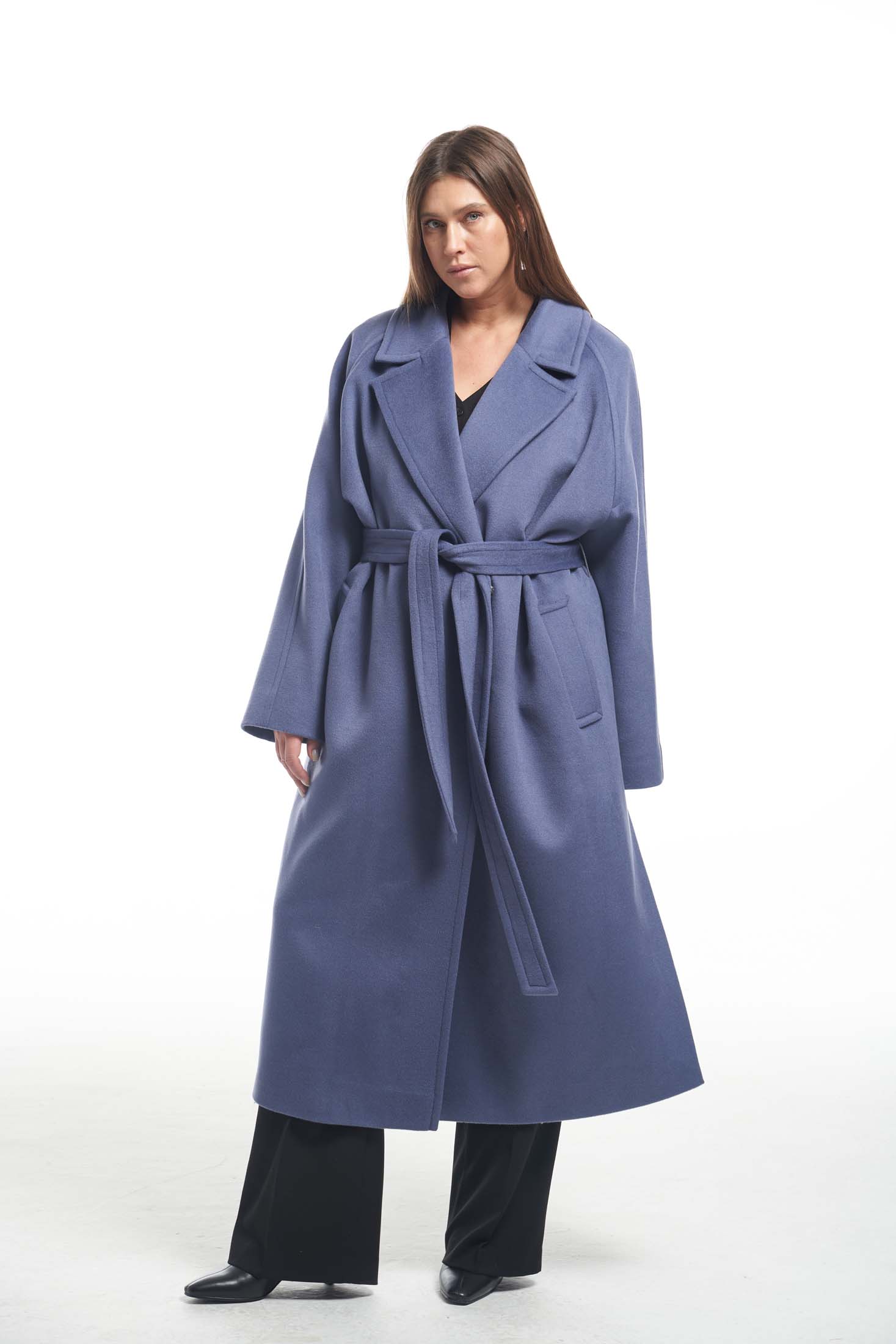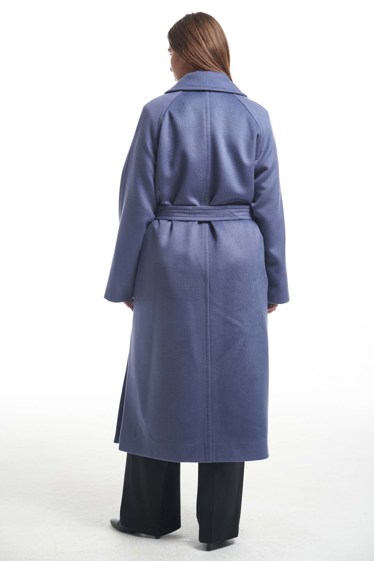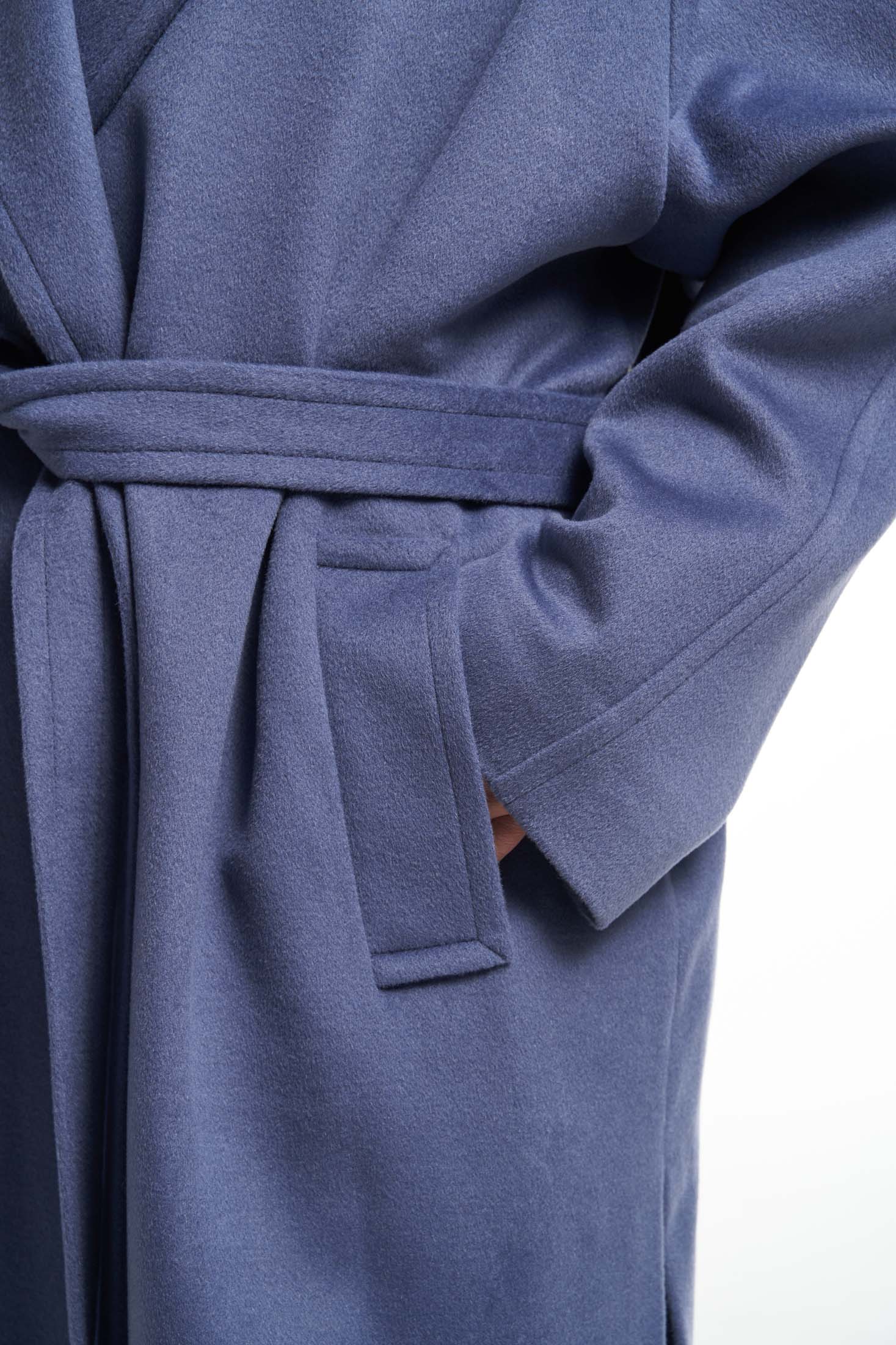 Драповое пальто-халат с английским воротником и съемным поясом. Рукава реглан. Боковые карманы прорезные с листочками. В боковых швах разрезы. Пальто застегивается на пришивные кнопки. По воротнику, краю борта, верхнему шву рукава и листочкам выполнена широкая эффектная отстрочка. Пальто выполнено из ткани с высоким содержанием шерсти на поливискозной подкладке.