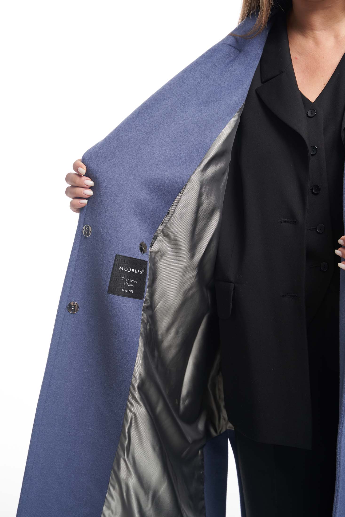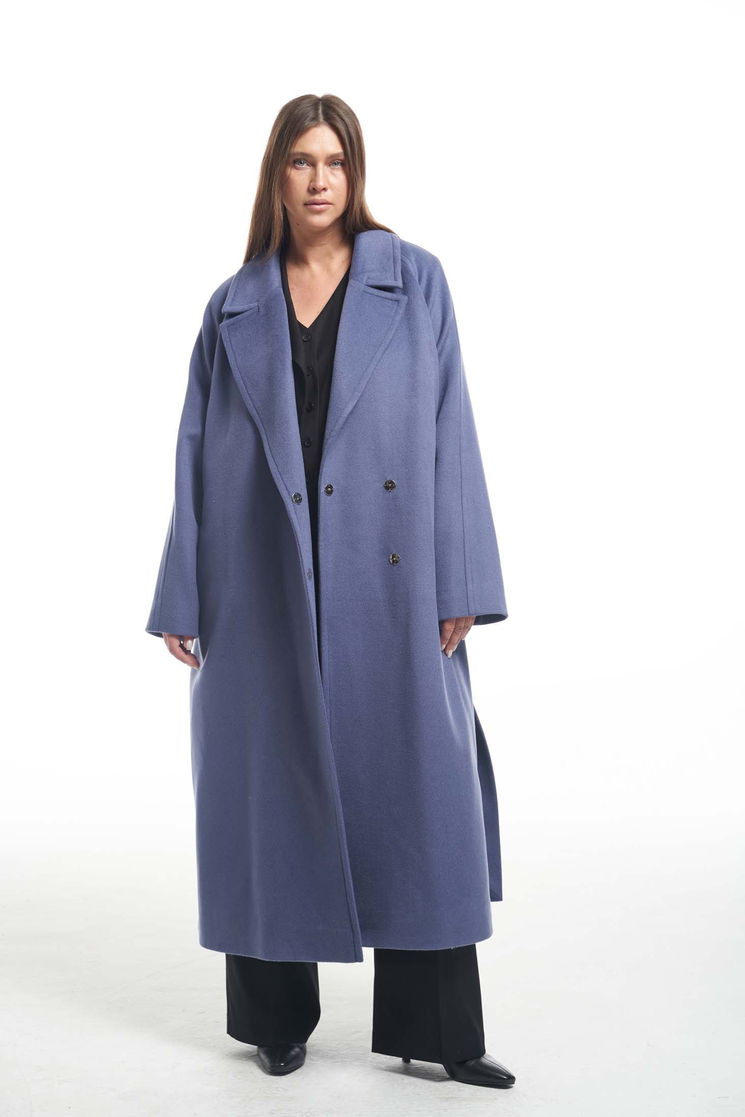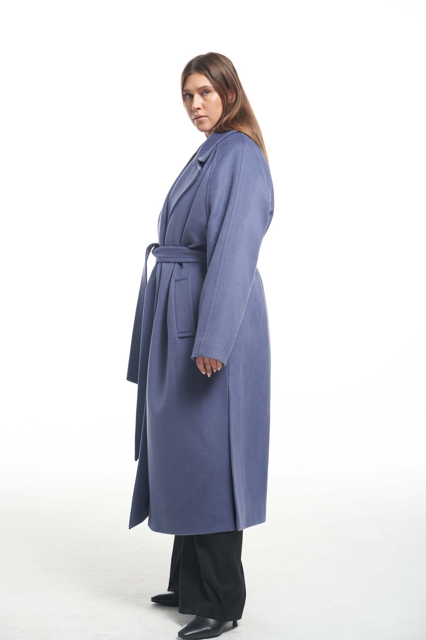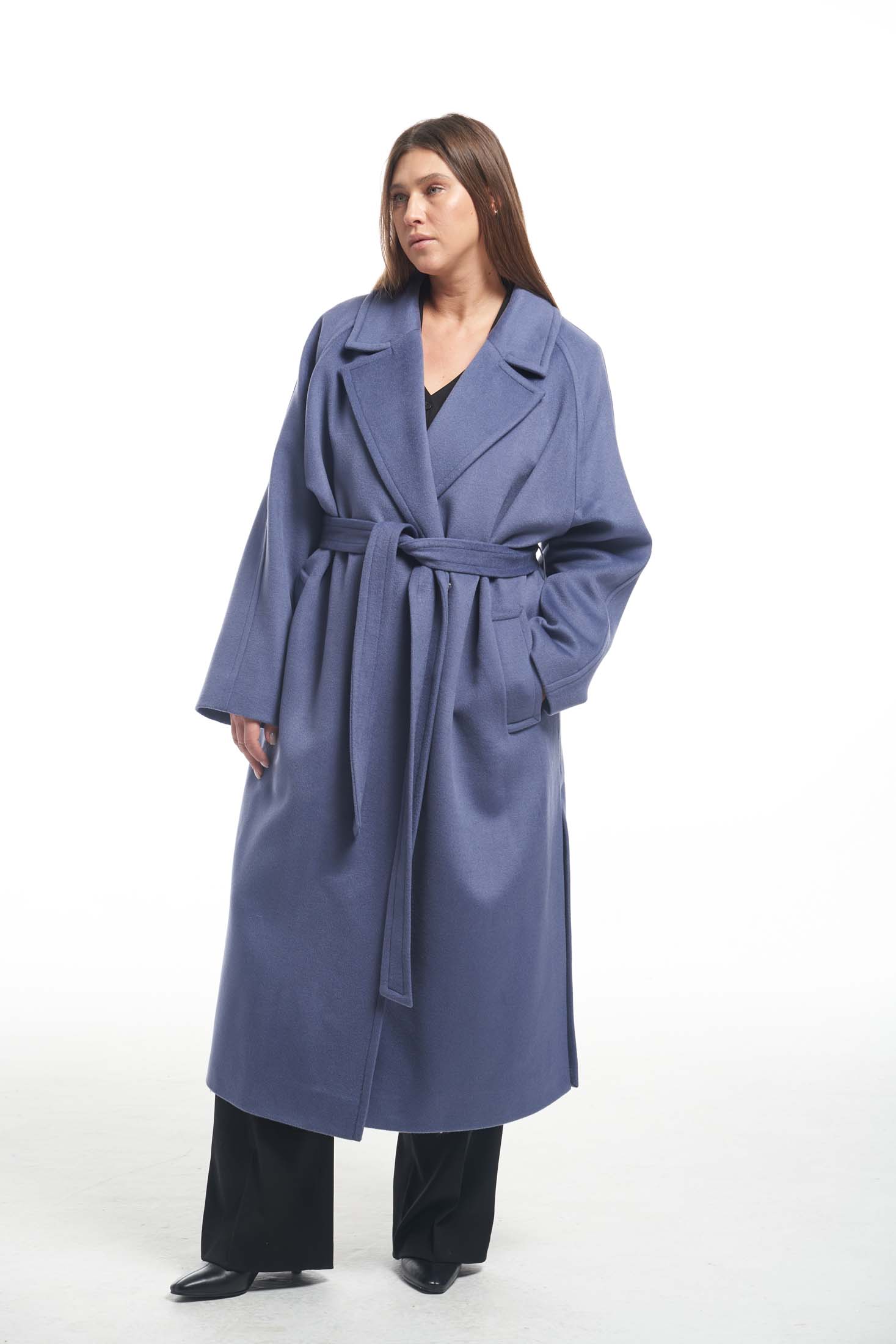 Драповое пальто-халат с английским воротником и съемным поясом. Рукава реглан. Боковые карманы прорезные с листочками. В боковых швах разрезы. Пальто застегивается на пришивные кнопки. По воротнику, краю борта, верхнему шву рукава и листочкам выполнена широкая эффектная отстрочка. Пальто выполнено из ткани с высоким содержанием шерсти на поливискозной подкладке.