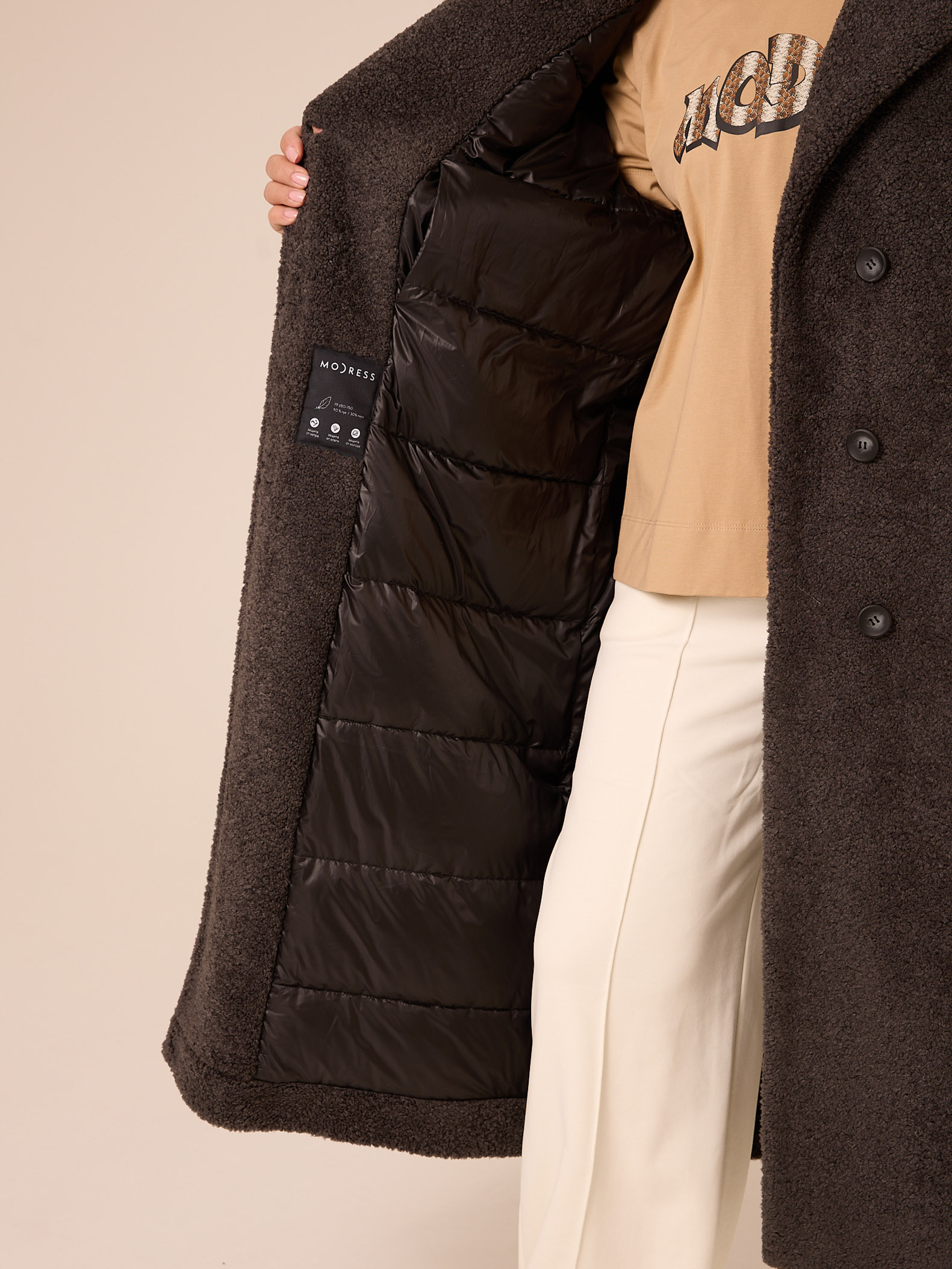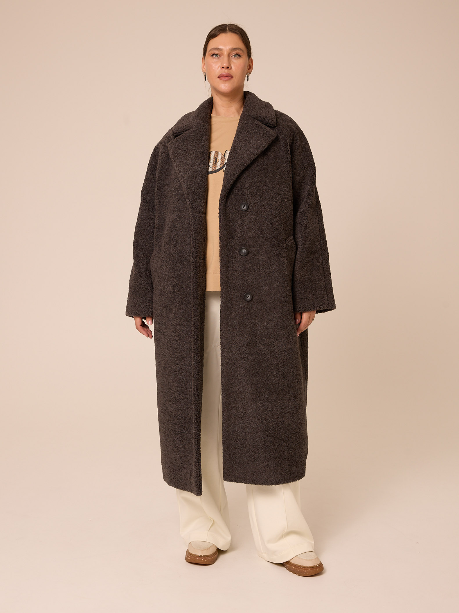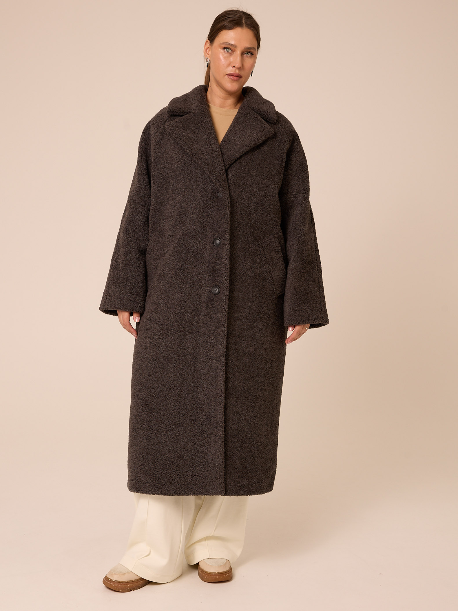 Утеплитель термофин «микро» 60 гр/м2 (новая разработка, более тонкий вариант термофина 60гр/м2). Длинное пальто прямого силуэта с английским воротником. Рукава реглан. Боковые карманы прорезные с листочками. Есть внутренний карман. Застегивается изделие на петли и пуговицы. Выполнено из эко-меха «шерпа» на подкладке с утеплителем.