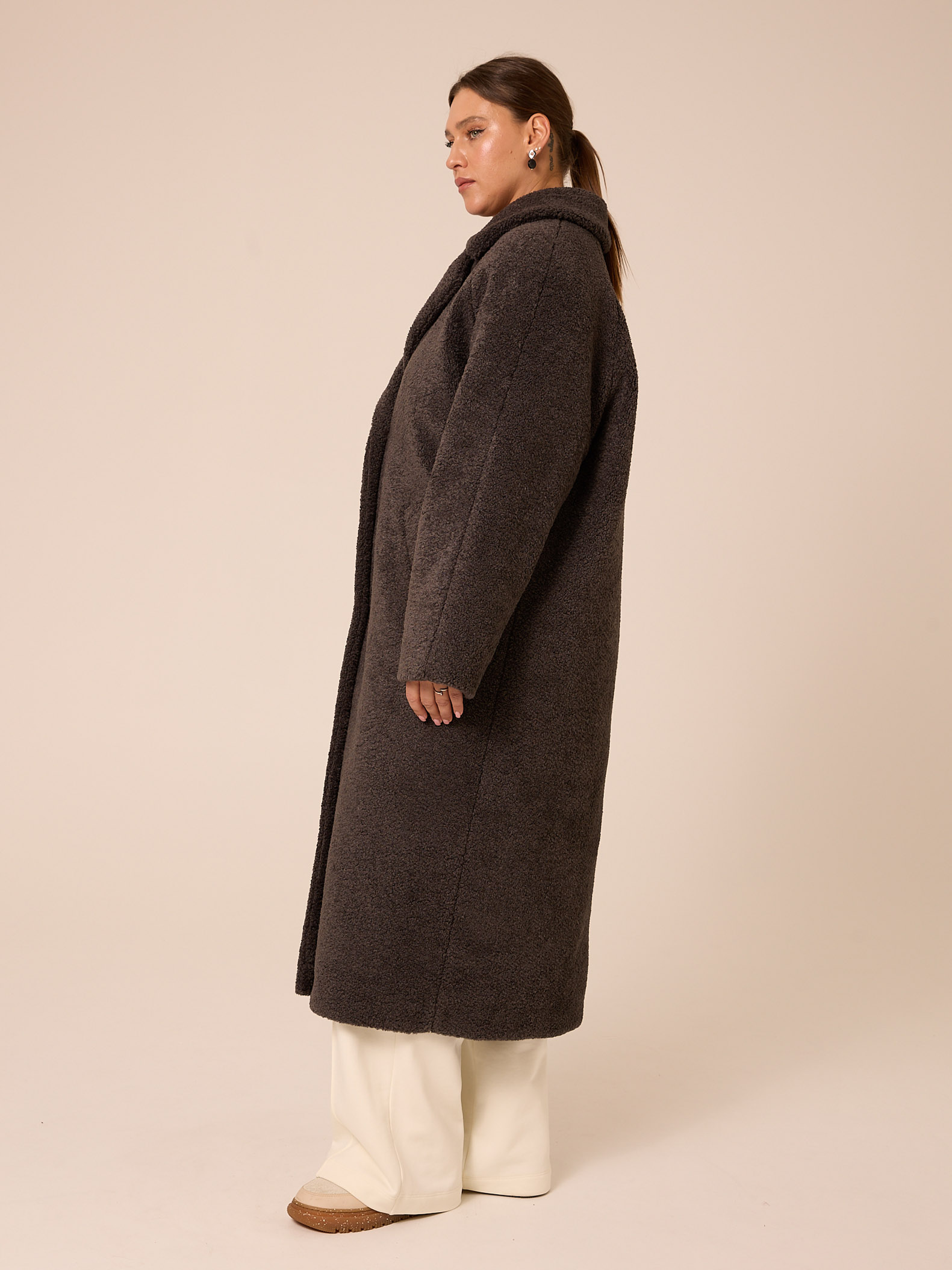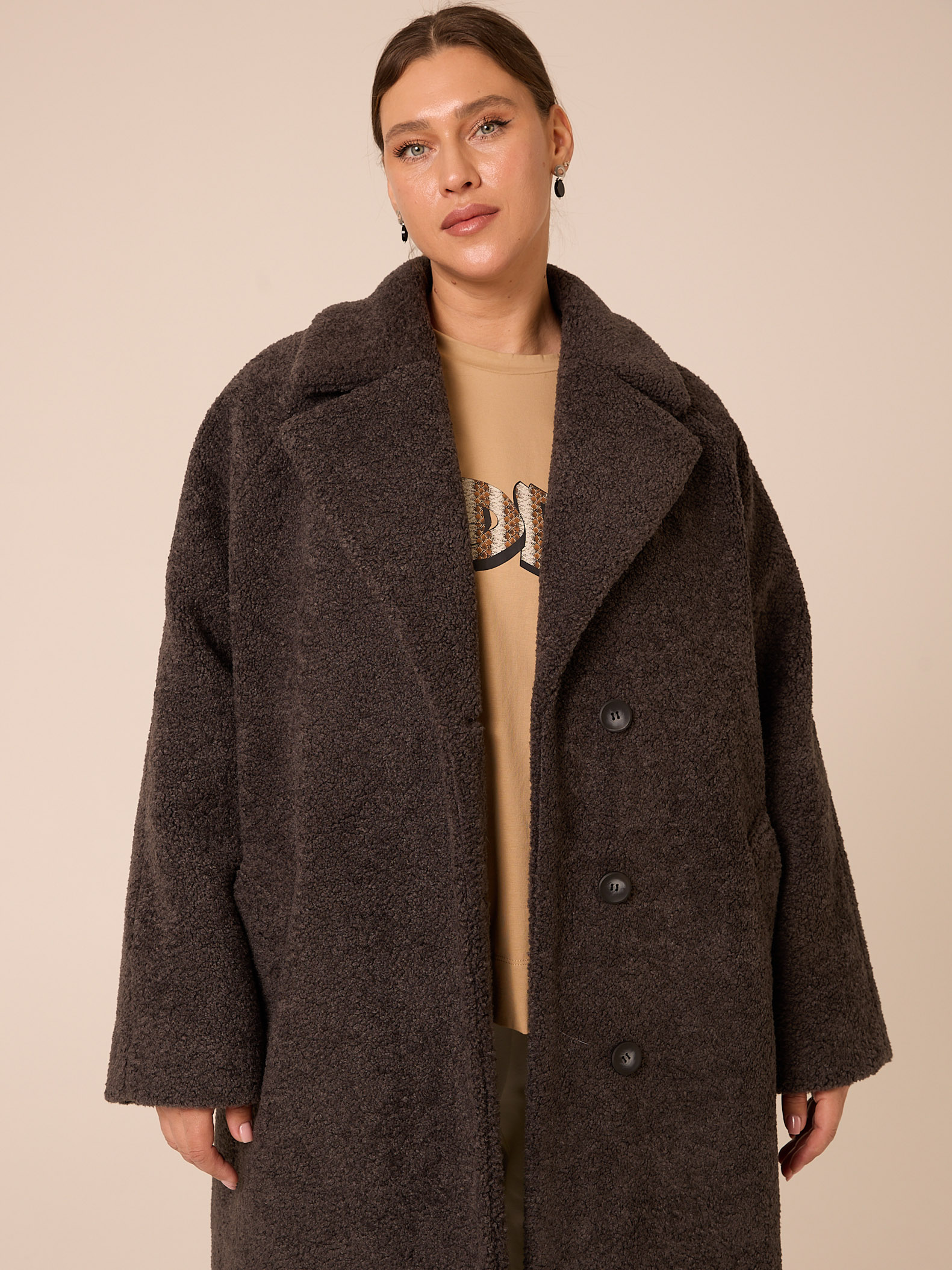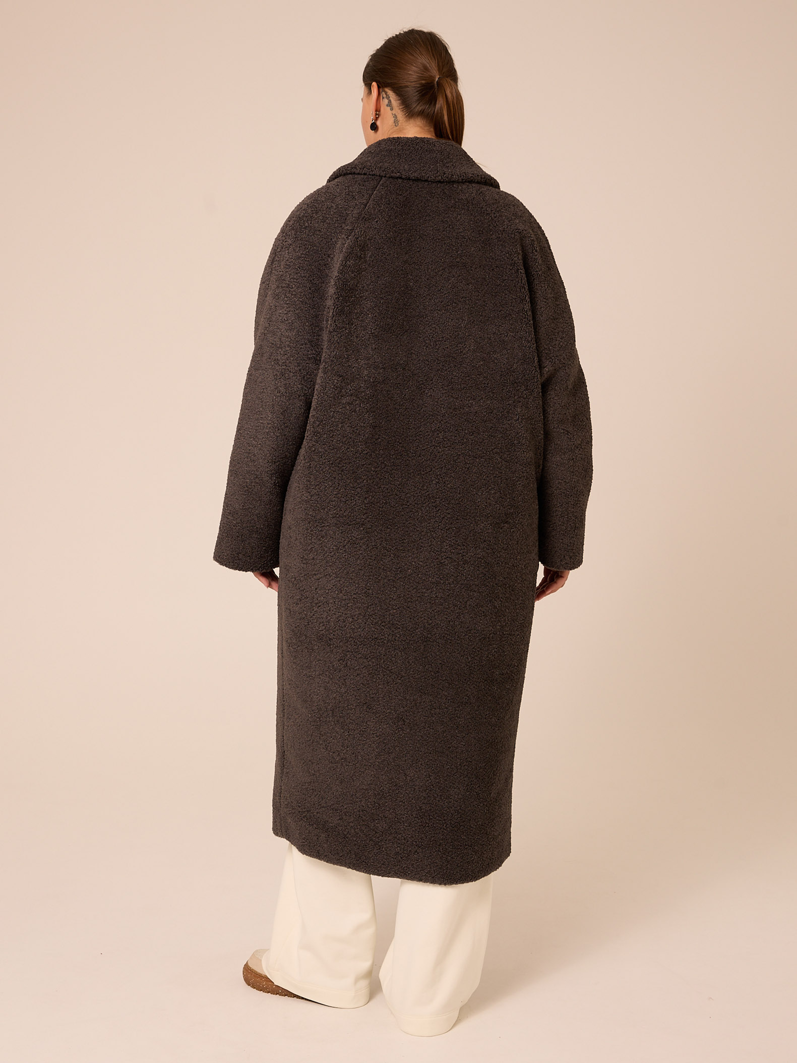 Утеплитель термофин «микро» 60 гр/м2 (новая разработка, более тонкий вариант термофина 60гр/м2). Длинное пальто прямого силуэта с английским воротником. Рукава реглан. Боковые карманы прорезные с листочками. Есть внутренний карман. Застегивается изделие на петли и пуговицы. Выполнено из эко-меха «шерпа» на подкладке с утеплителем.