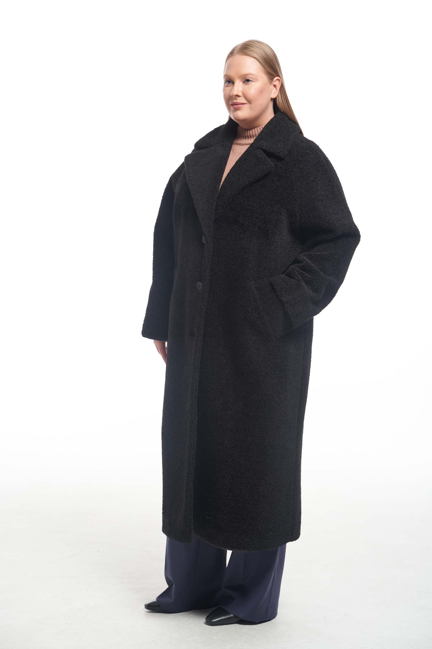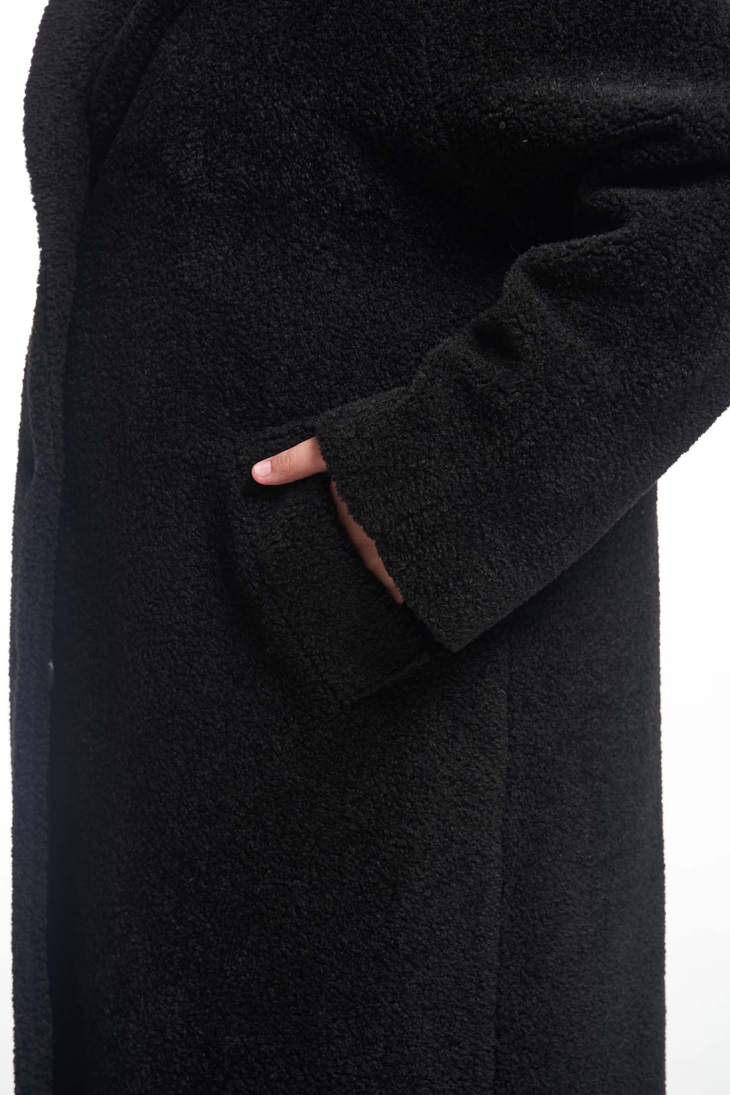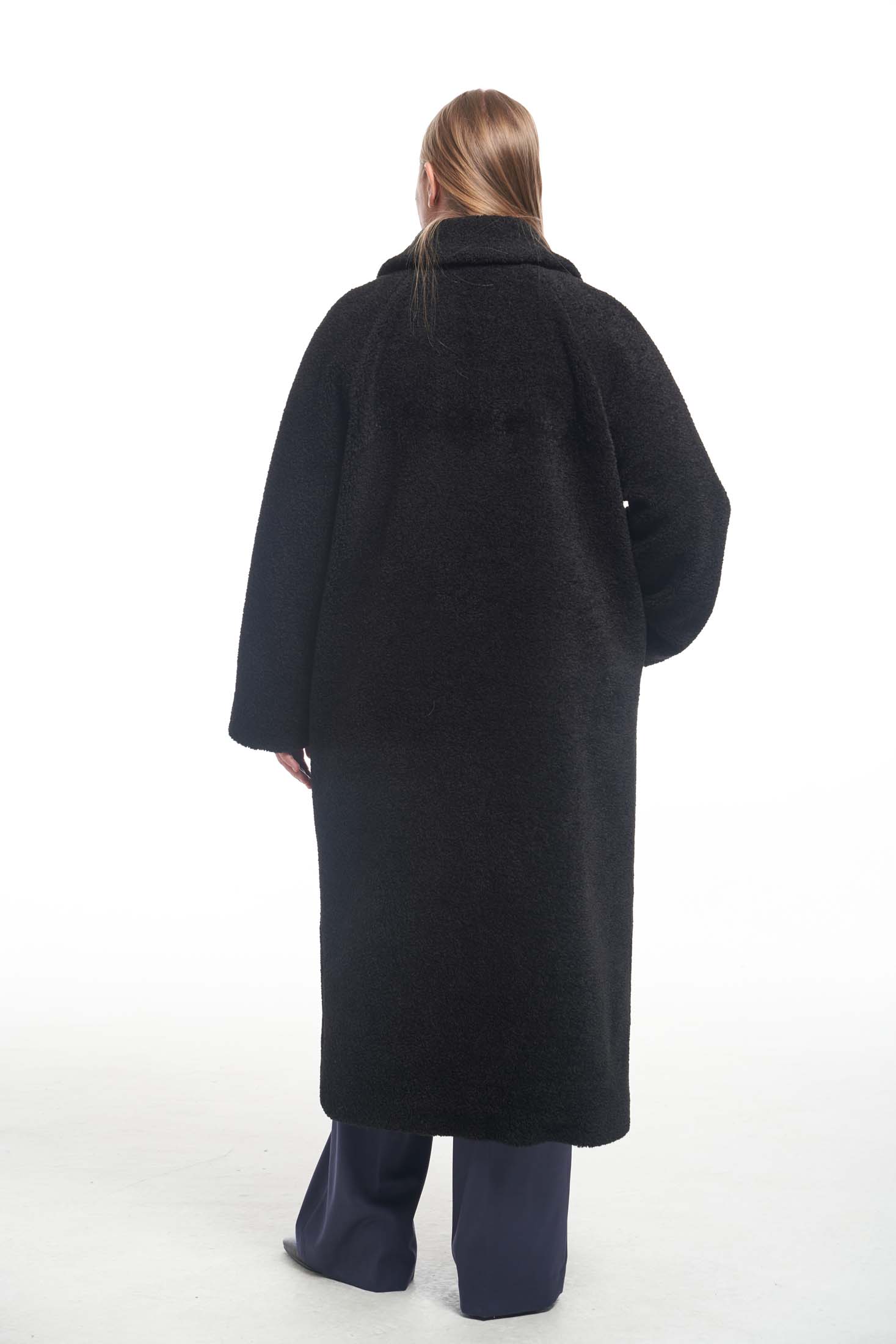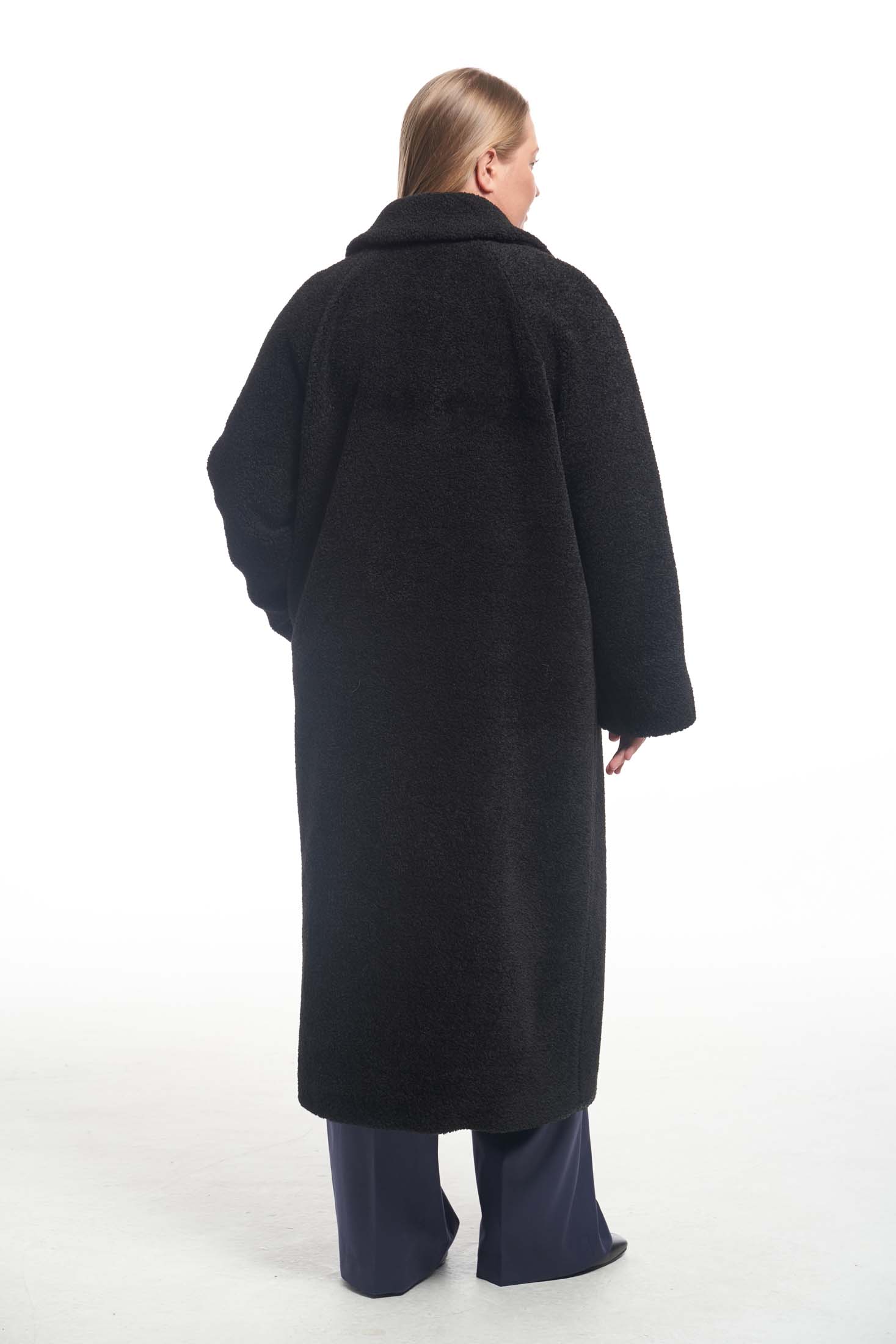Пальто меховое свободного кроя «овер» с английским воротником. Рукава реглан. Боковые карманы прорезные с листочками. Пальто застегивается на петли и пуговицы. Выполнено из искусственного меха на подкладке.