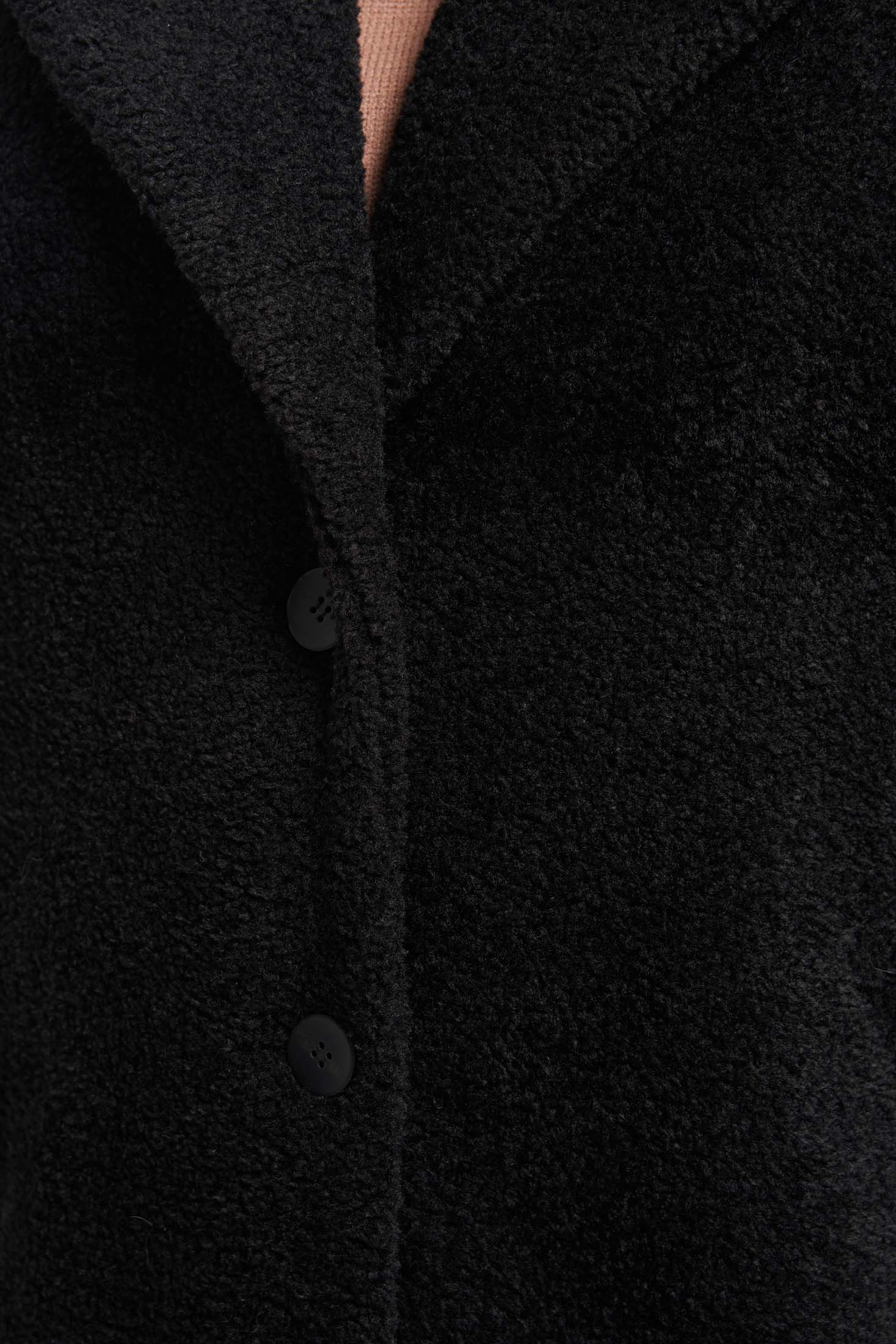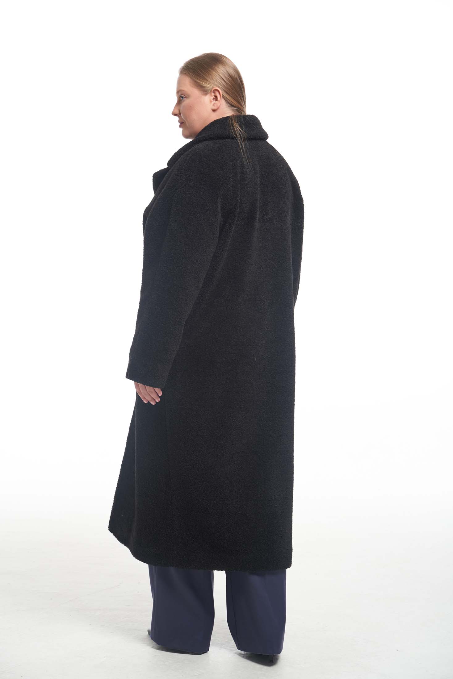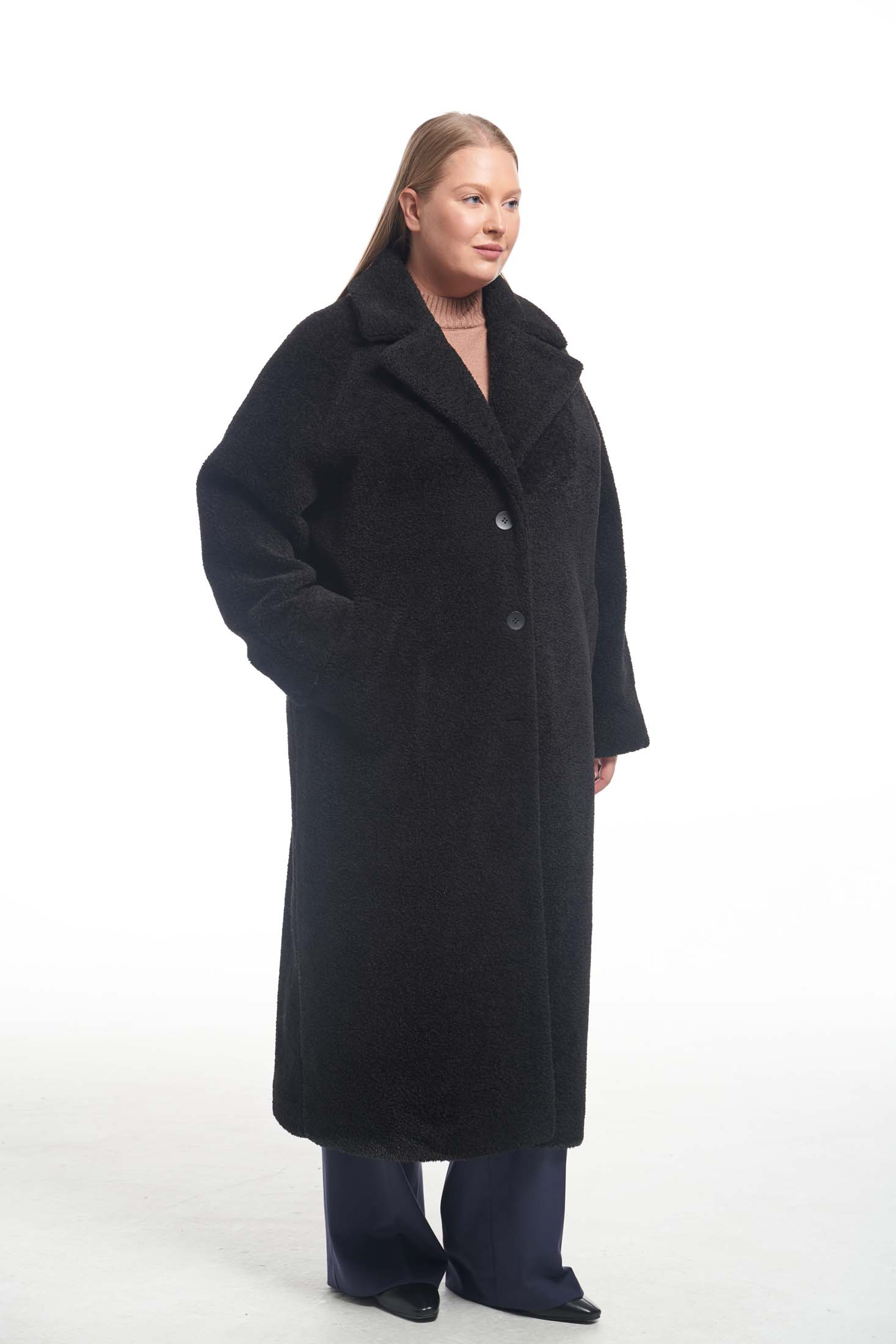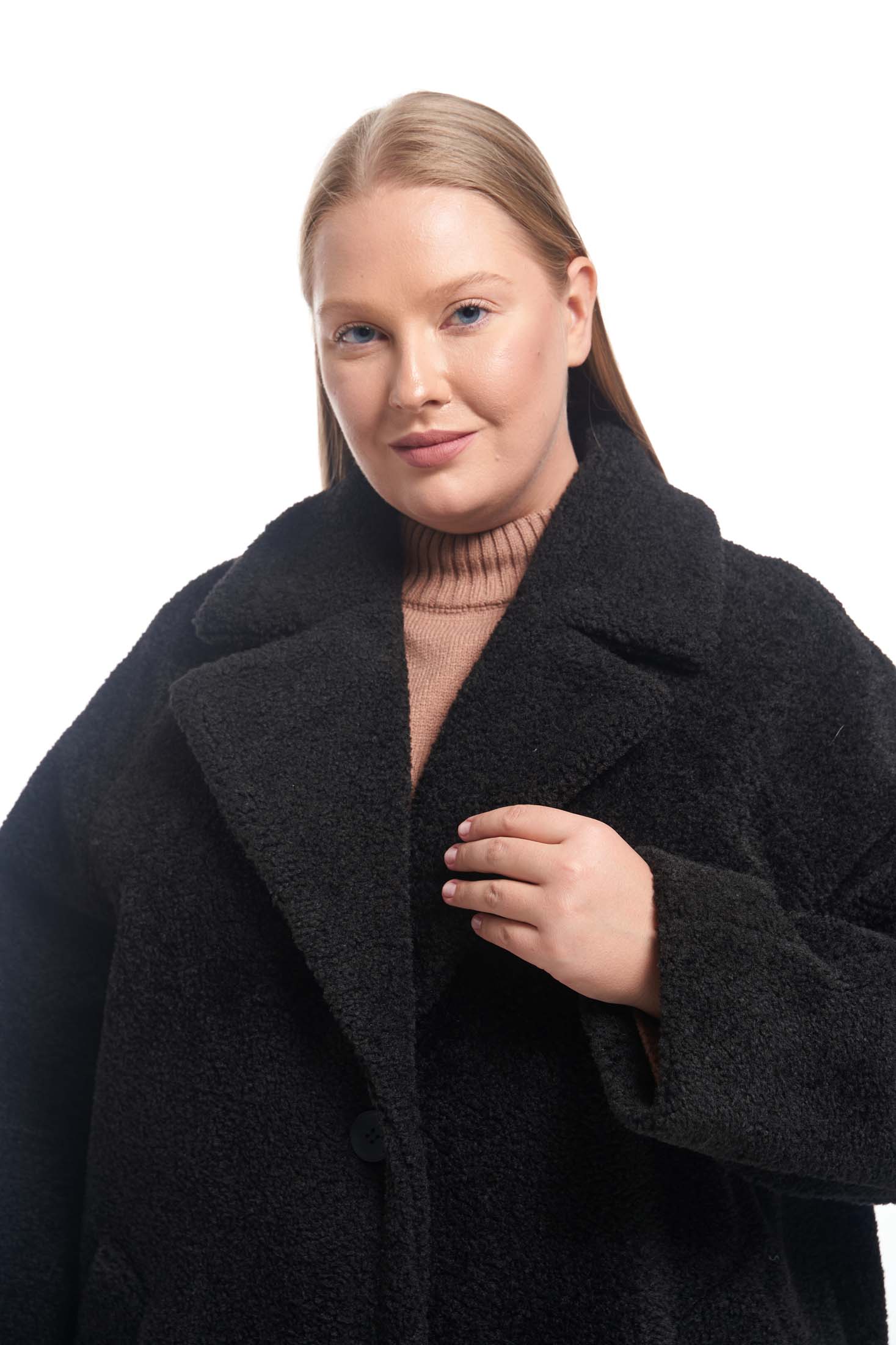 Пальто меховое свободного кроя «овер» с английским воротником. Рукава реглан. Боковые карманы прорезные с листочками. Пальто застегивается на петли и пуговицы. Выполнено из искусственного меха на подкладке.