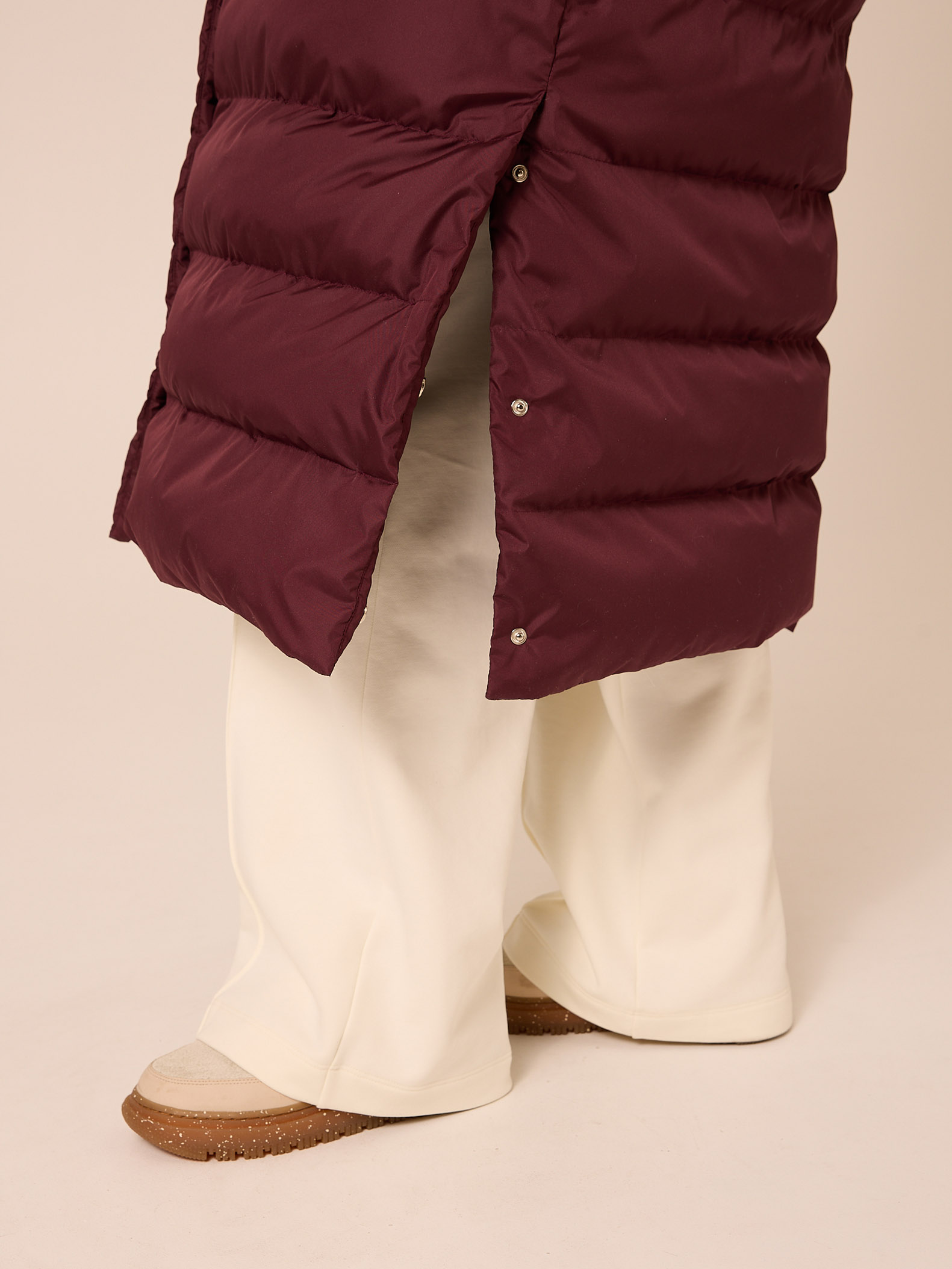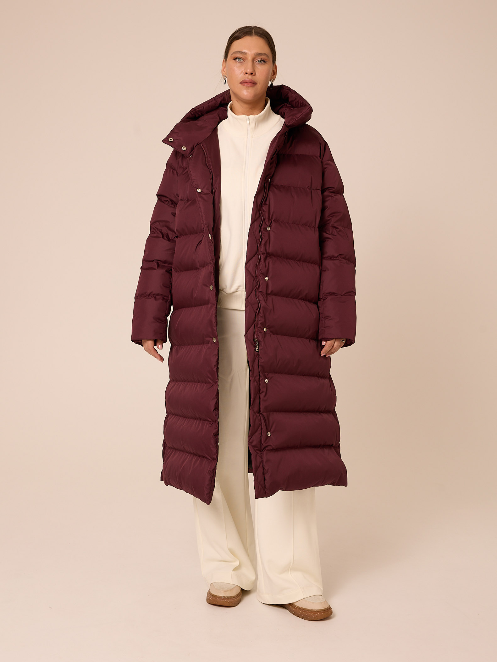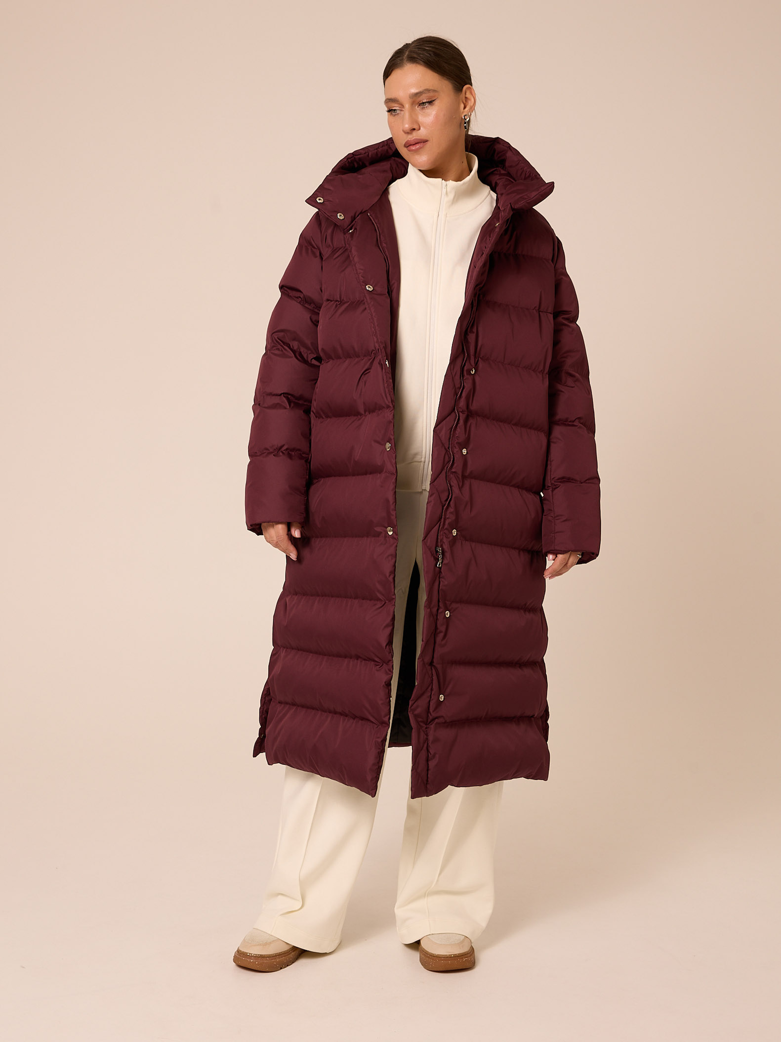 Утеплитель лебяжий синтепух 165-180гр/м2 +термофин 60гр/м2. Длинное пальто прямого кроя. Плечевой пояс немного спущен. Капюшон втачной с кулиской. Боковые карманы прорезные с листочками. Есть внутренний накладной карман на подкладке. В боковых швах выполнены разрезы на кнопках. Пальто застегивается на внутреннюю молнию и кнопки. Выполнено из курточной ткани с водоотталкивающей пропиткой. Цвета: черный, бордовый, св. желтый.