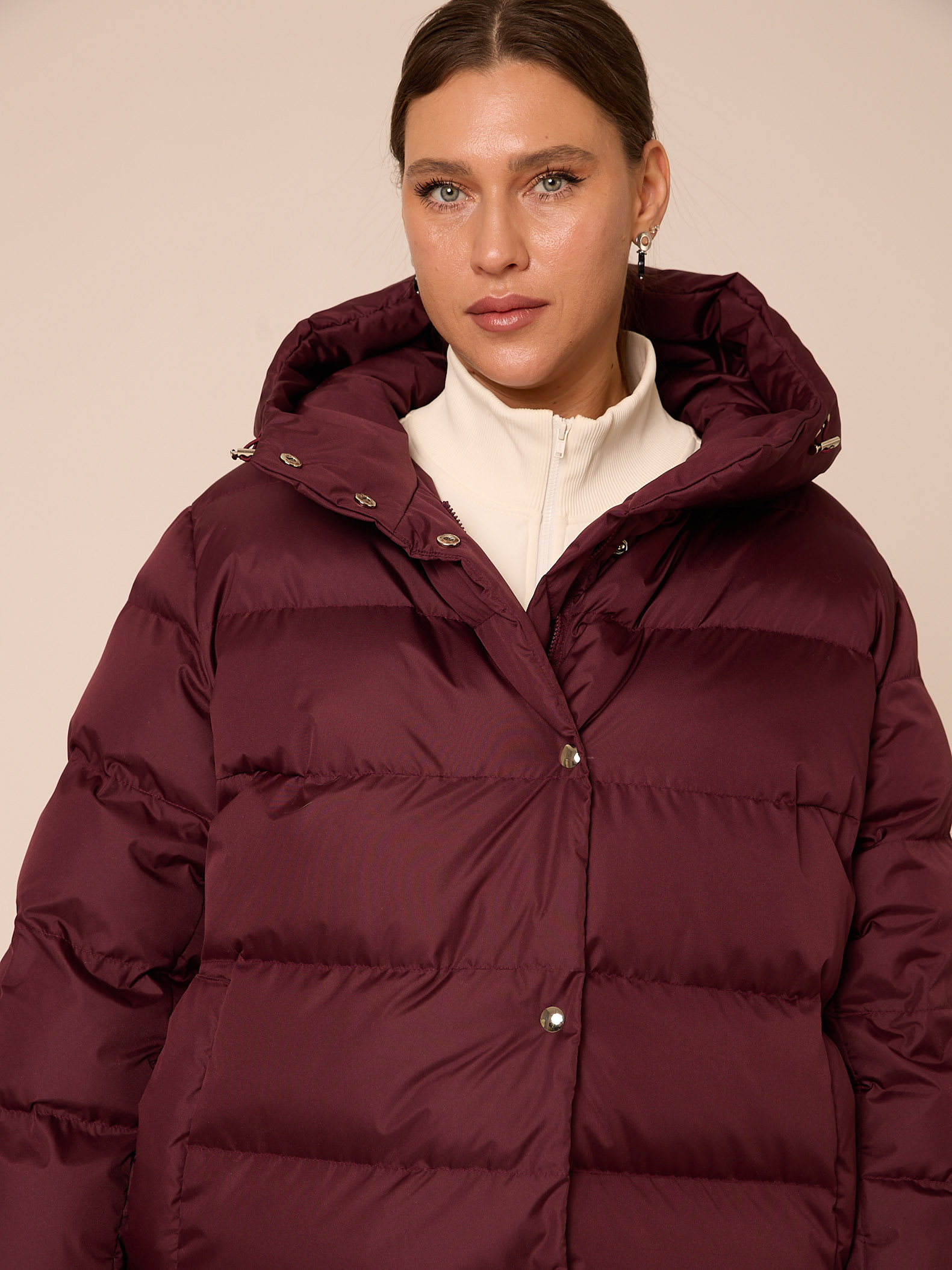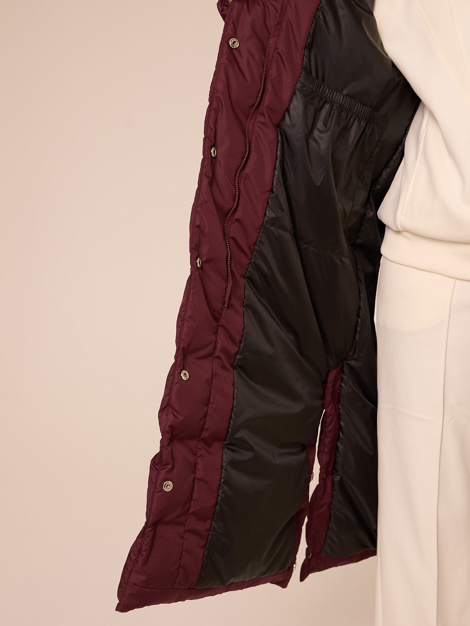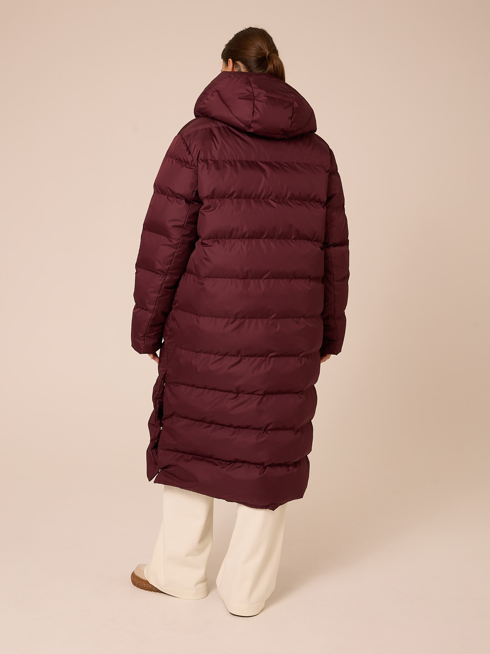 Утеплитель лебяжий синтепух 165-180гр/м2 +термофин 60гр/м2. Длинное пальто прямого кроя. Плечевой пояс немного спущен. Капюшон втачной с кулиской. Боковые карманы прорезные с листочками. Есть внутренний накладной карман на подкладке. В боковых швах выполнены разрезы на кнопках. Пальто застегивается на внутреннюю молнию и кнопки. Выполнено из курточной ткани с водоотталкивающей пропиткой. Цвета: черный, бордовый, св. желтый.