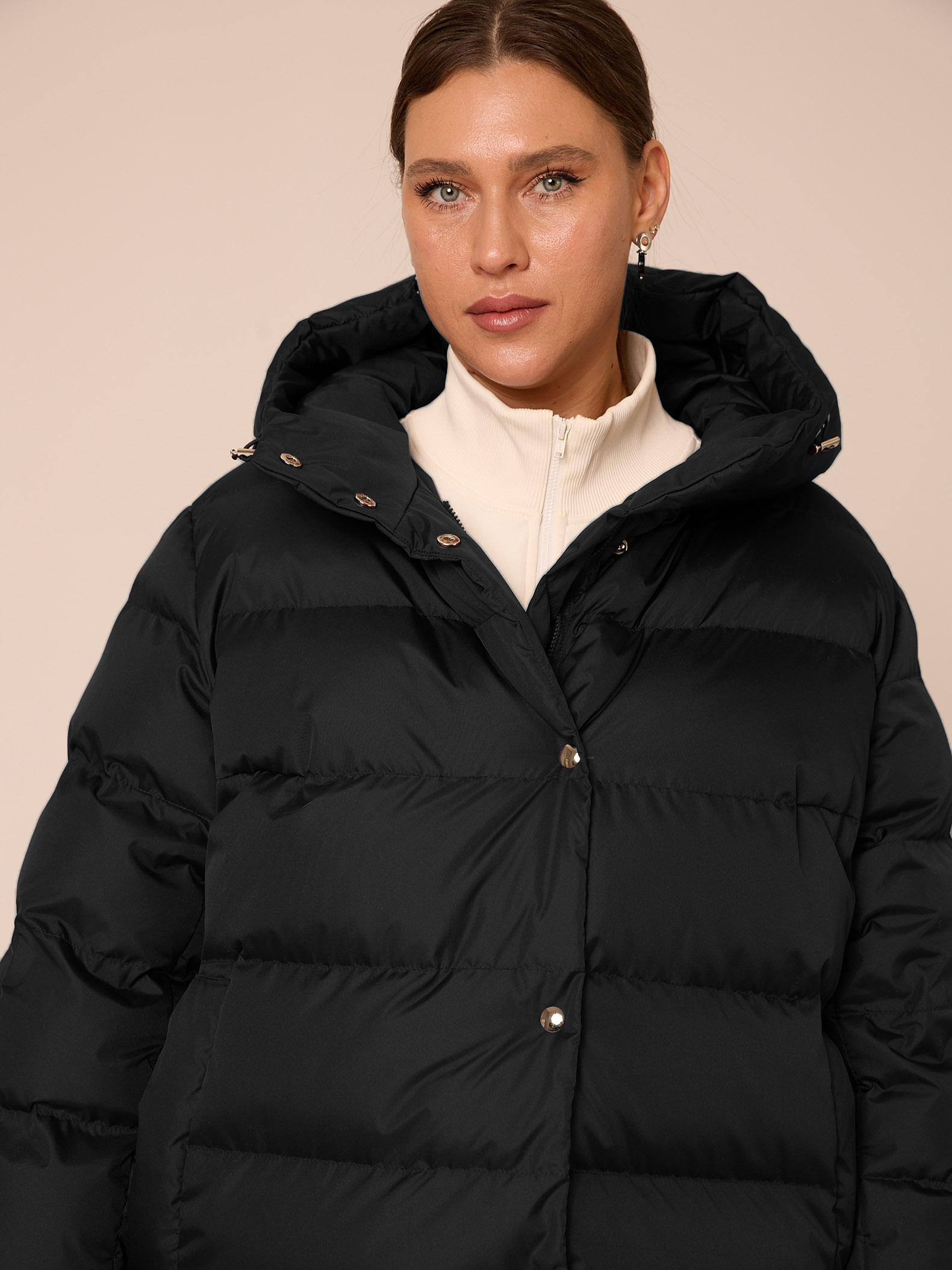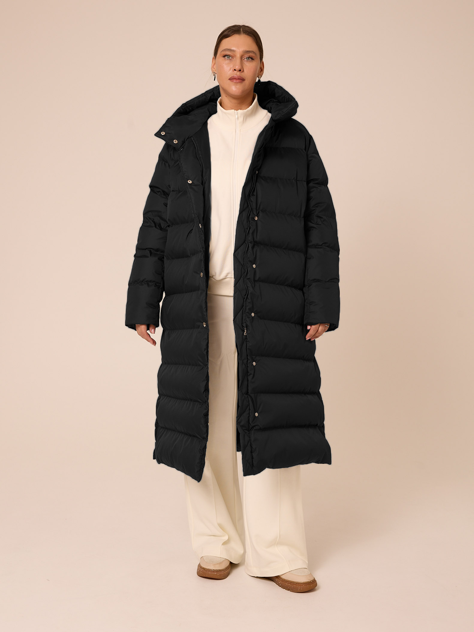 Утеплитель лебяжий синтепух 165-180гр/м2 +термофин 60гр/м2. Длинное пальто прямого кроя. Плечевой пояс немного спущен. Капюшон втачной с кулиской. Боковые карманы прорезные с листочками. Есть внутренний накладной карман на подкладке. В боковых швах выполнены разрезы на кнопках. Пальто застегивается на внутреннюю молнию и кнопки. Выполнено из курточной ткани с водоотталкивающей пропиткой. Цвета: черный, бордовый, св. желтый.