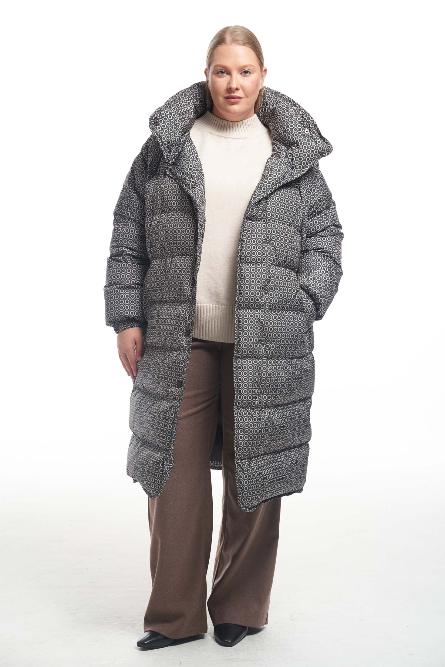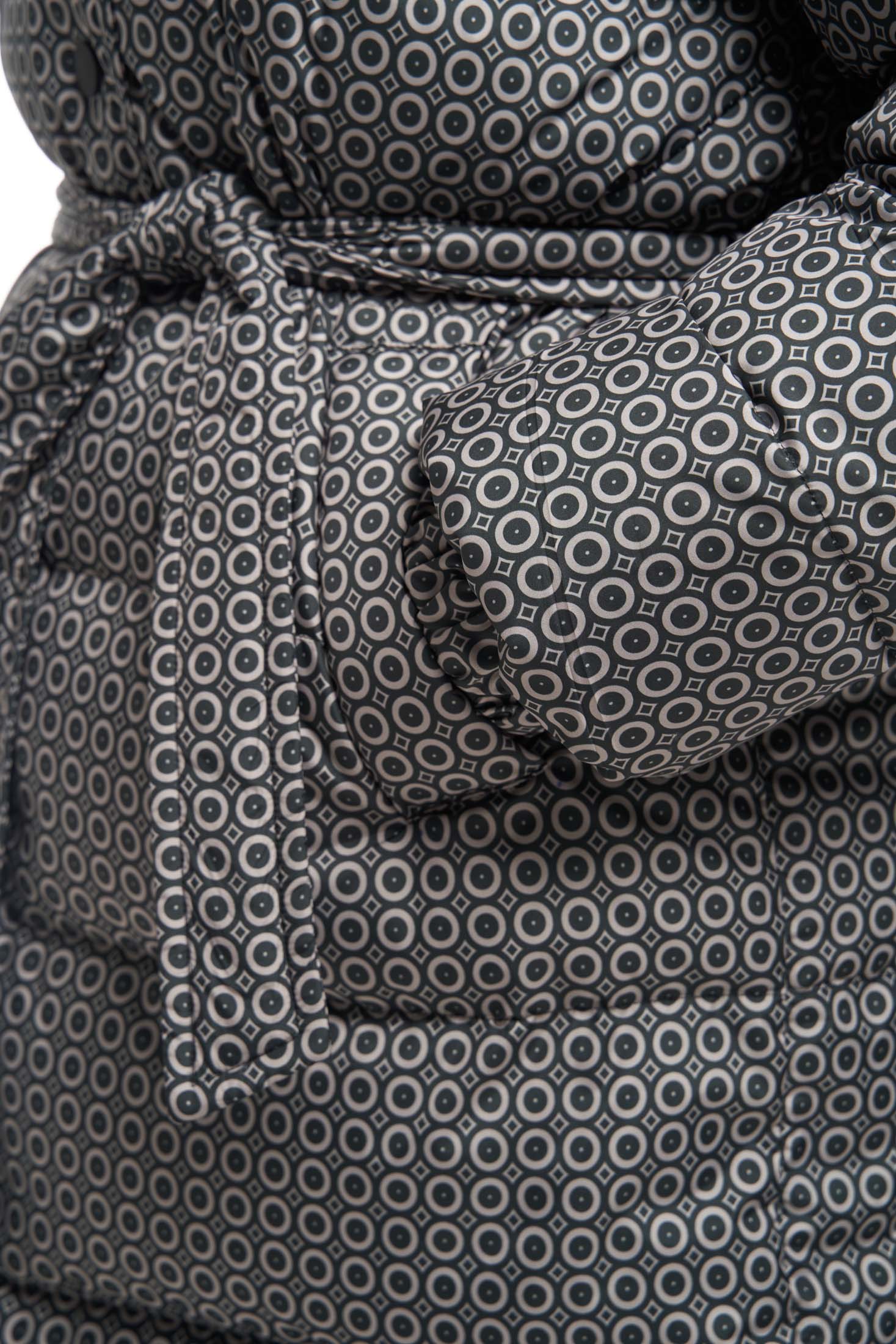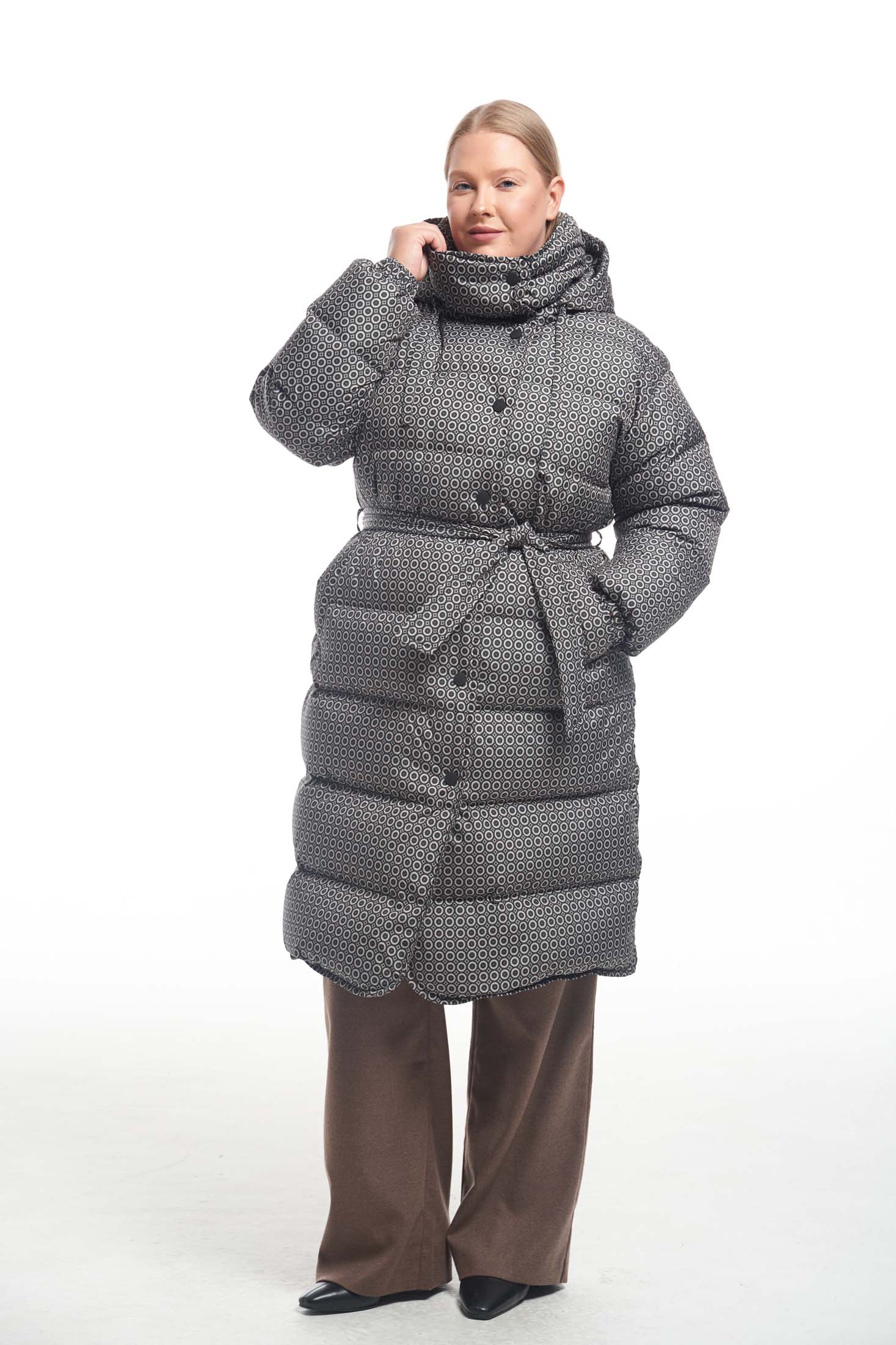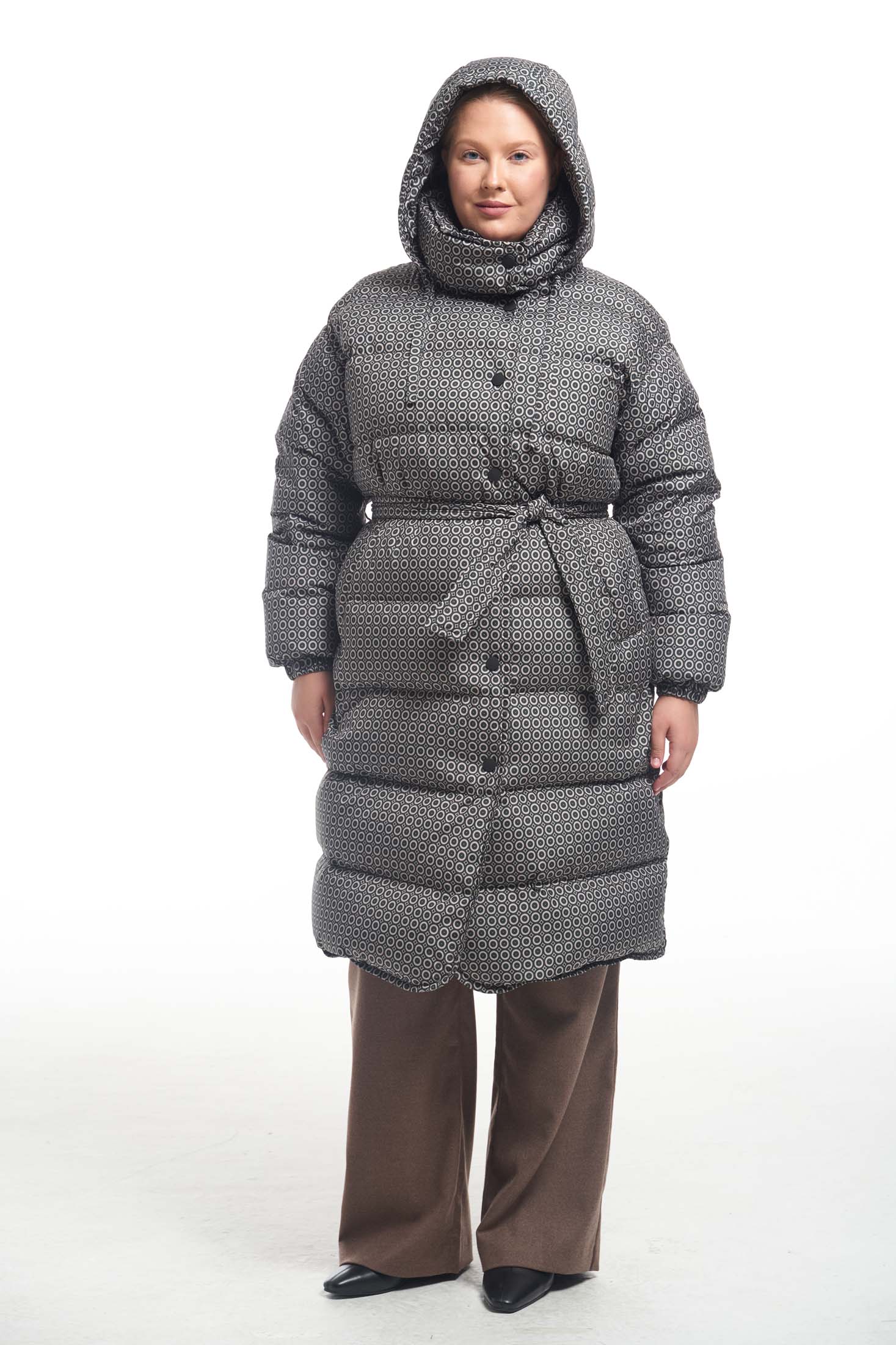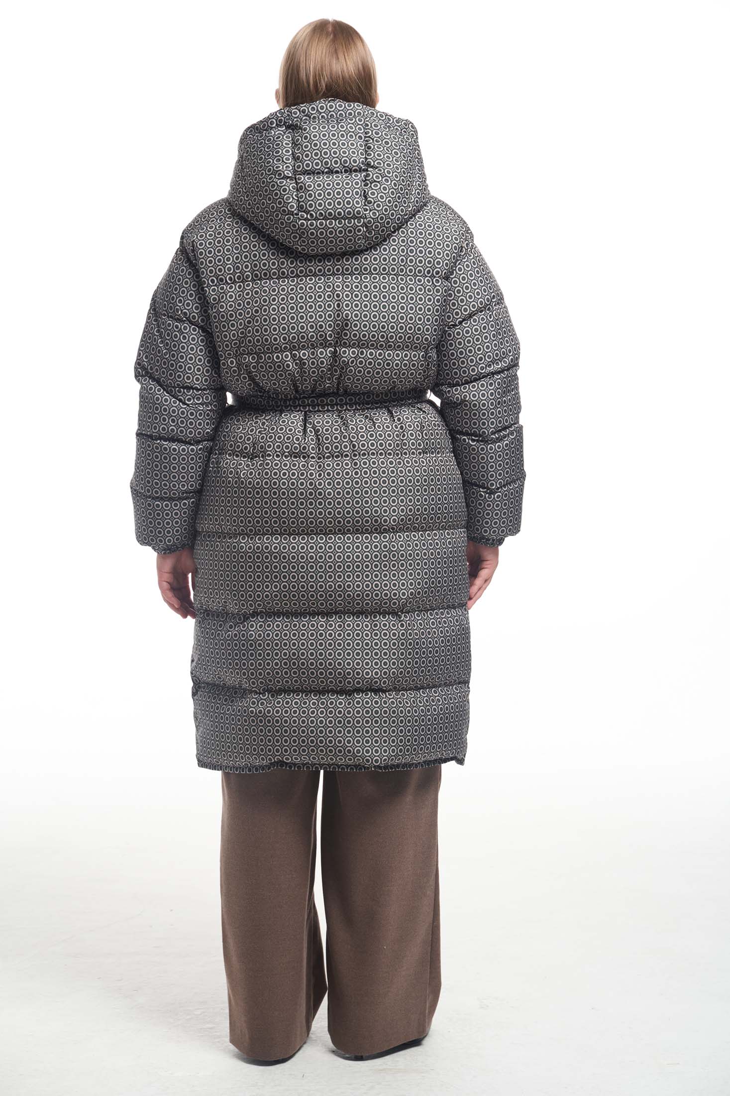 Пальто свободного кроя с горизонтальной стежкой и съемным поясом. Плечевой пояс спущенный. Воротник –объемная, высокая стойка с закругленными углами. Капюшон съемный. Карманы прорезные с листочками. Пальто без нагрудных вытачек, но, благодаря особому распределению прибавки, обладает хорошей посадкой. Низ рукавов собран на эластичную тесьму с внутренней стороны. Длина изделия чуть ниже колена. Застегивается на декоративные кнопки. Низ борта закруглен. Есть внутренний накладной карман на подкладке. При изготовлении применяется двухслойный пухпакет.