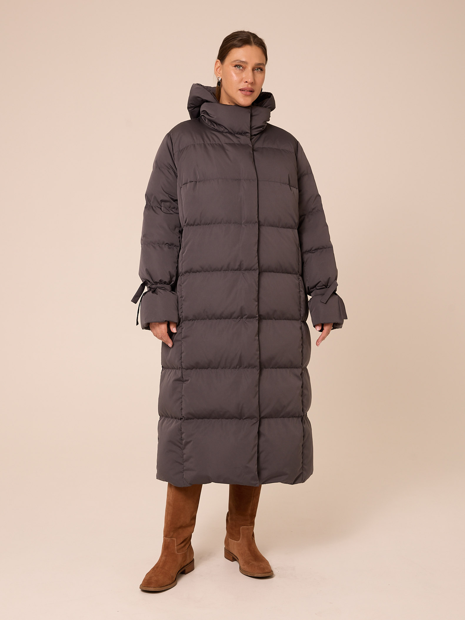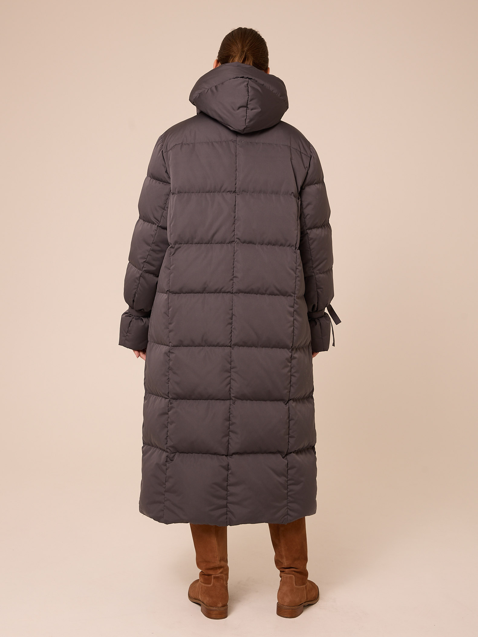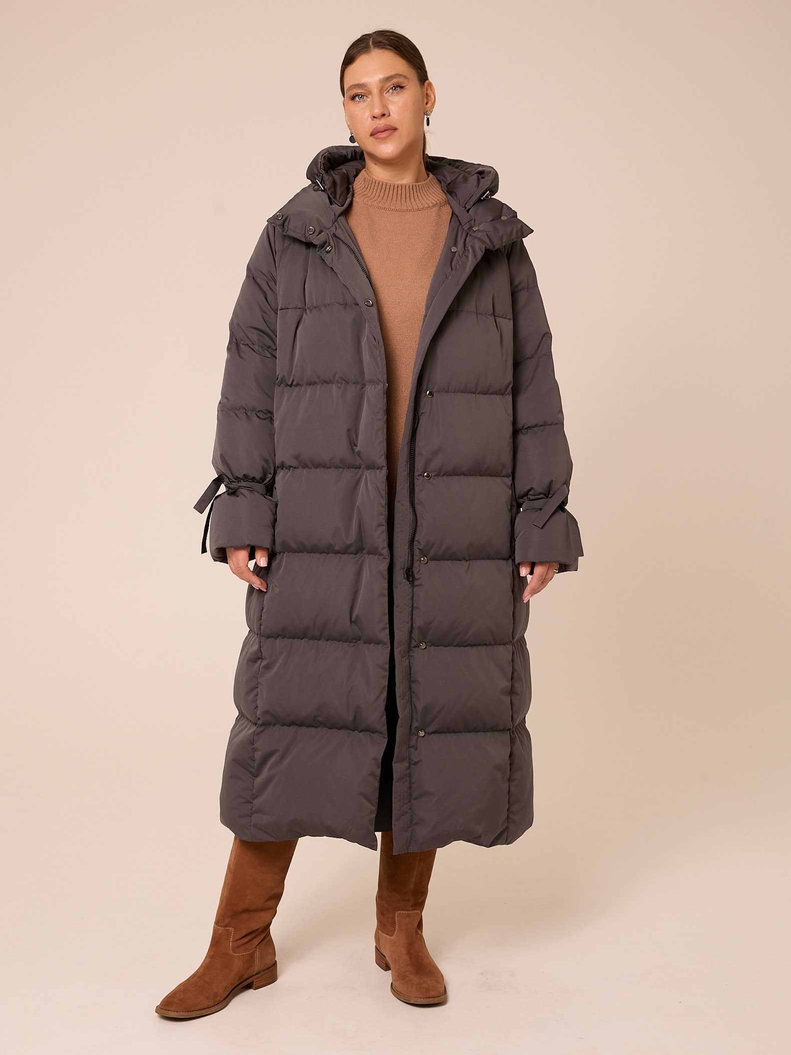 Натуральный пух 90/перо10 (170гр/м2) FP 650+. Длинное пальто прямого силуэта. Воротник- высокая стойка. Капюшон съемный. Плечевой пояс немного спущен. По низу рукавов выполнены декоративные паты-ленты для регулировки объема. Боковые карманы прорезные с узкой листочкой, застегиваются на молнию. Нагрудная вытачка обеспечит хорошую посадку. По низу изделия выполнена кулиска с регулируемой резинкой. Пуховик застегивается на внутреннюю молнию и кнопки. Изделие выполнено из курточной ткани с водоотталкивающей пропиткой в двух цветах: св. сером и т. сером.