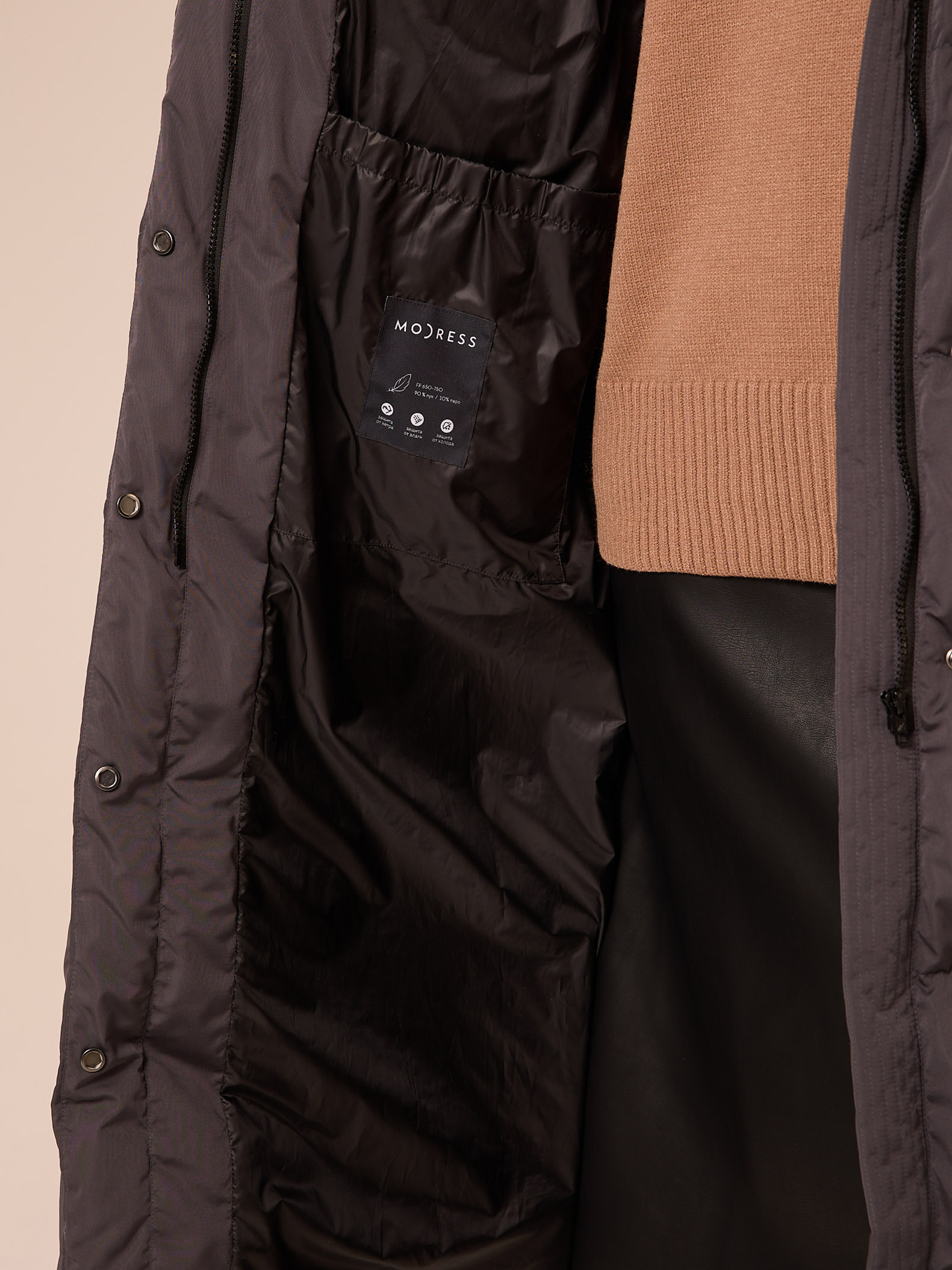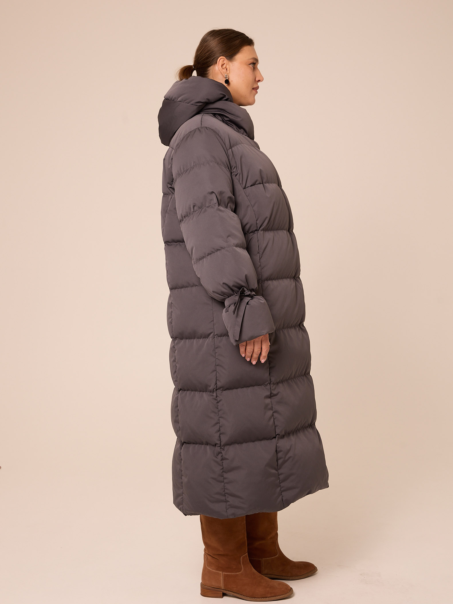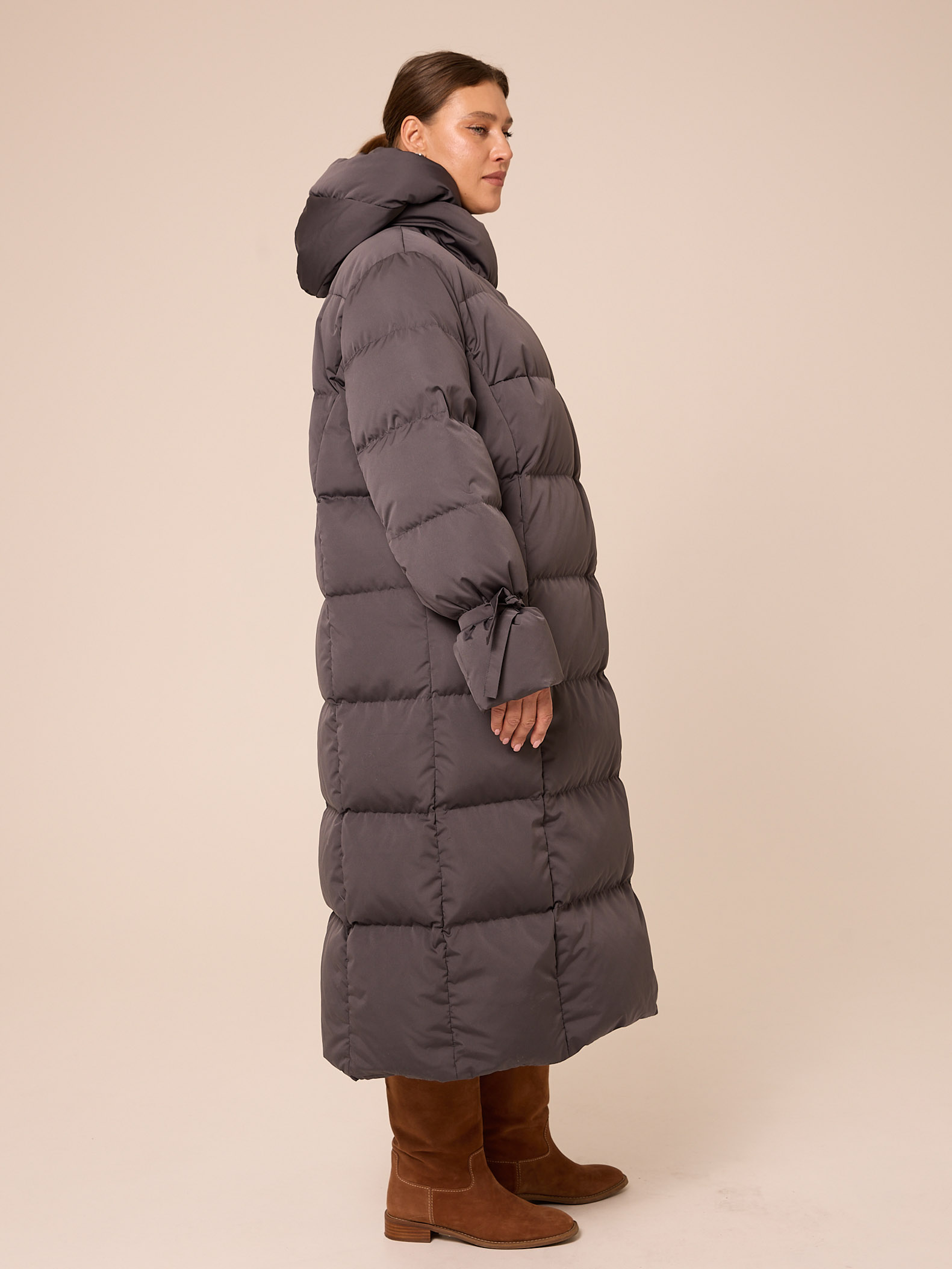 Натуральный пух 90/перо10 (170гр/м2) FP 650+. Длинное пальто прямого силуэта. Воротник- высокая стойка. Капюшон съемный. Плечевой пояс немного спущен. По низу рукавов выполнены декоративные паты-ленты для регулировки объема. Боковые карманы прорезные с узкой листочкой, застегиваются на молнию. Нагрудная вытачка обеспечит хорошую посадку. По низу изделия выполнена кулиска с регулируемой резинкой. Пуховик застегивается на внутреннюю молнию и кнопки. Изделие выполнено из курточной ткани с водоотталкивающей пропиткой в двух цветах: св. сером и т. сером.