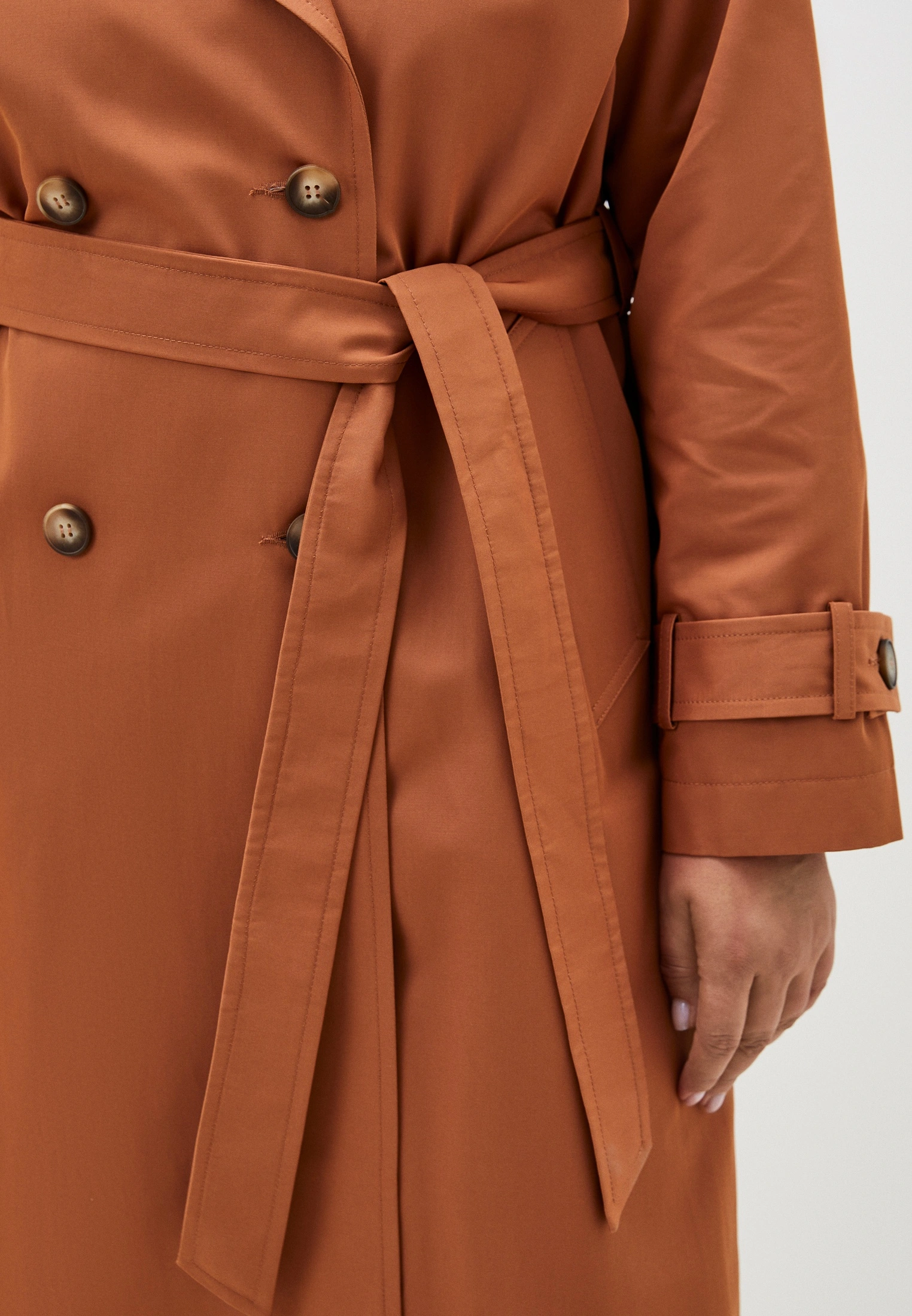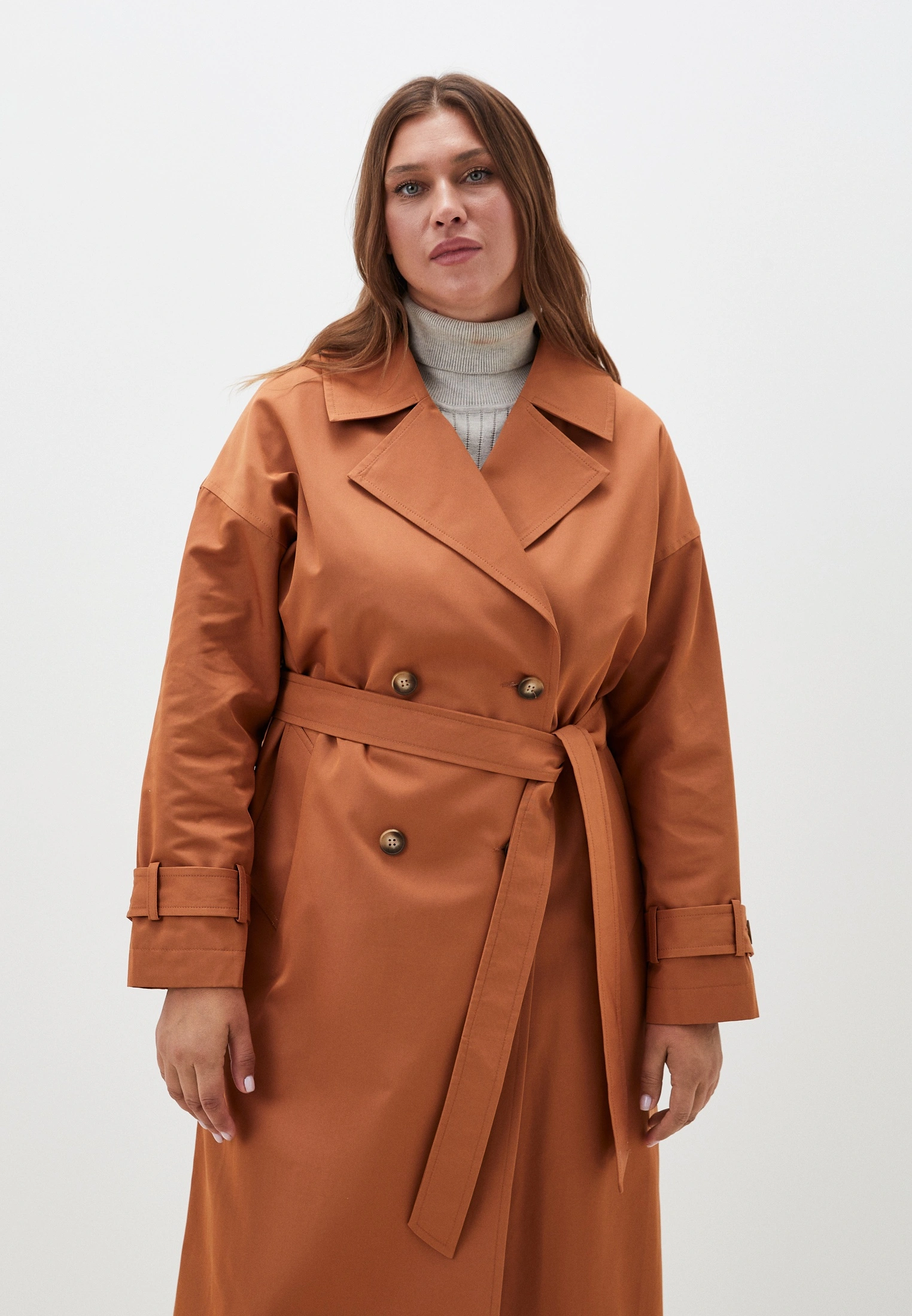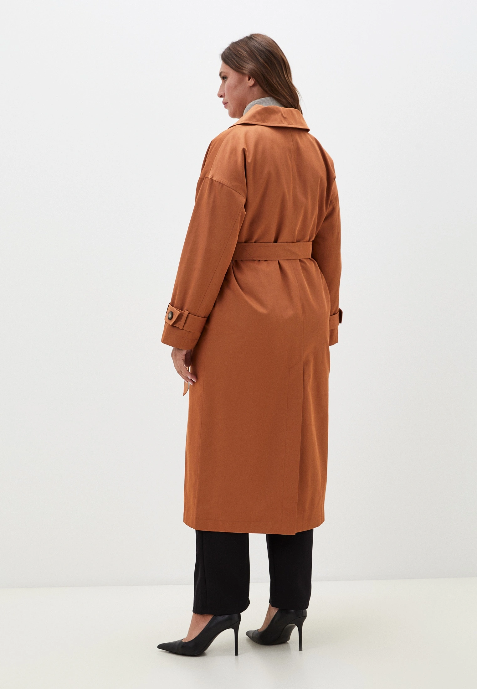 Двубортный тренч свободного кроя с поясом. Воротник широкий с лацканами. Рукава спущенные с патами. Боковые карманы прорезные с листочками. В среднем шве спинки выполнена шлица. Плащ длиной до икр, застегивается на петли и пуговицы. Изделие выполнено из плащевой ткани с высоким содержанием хлопка.