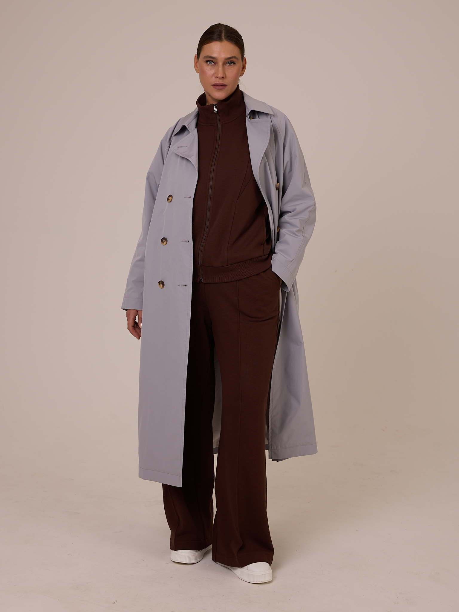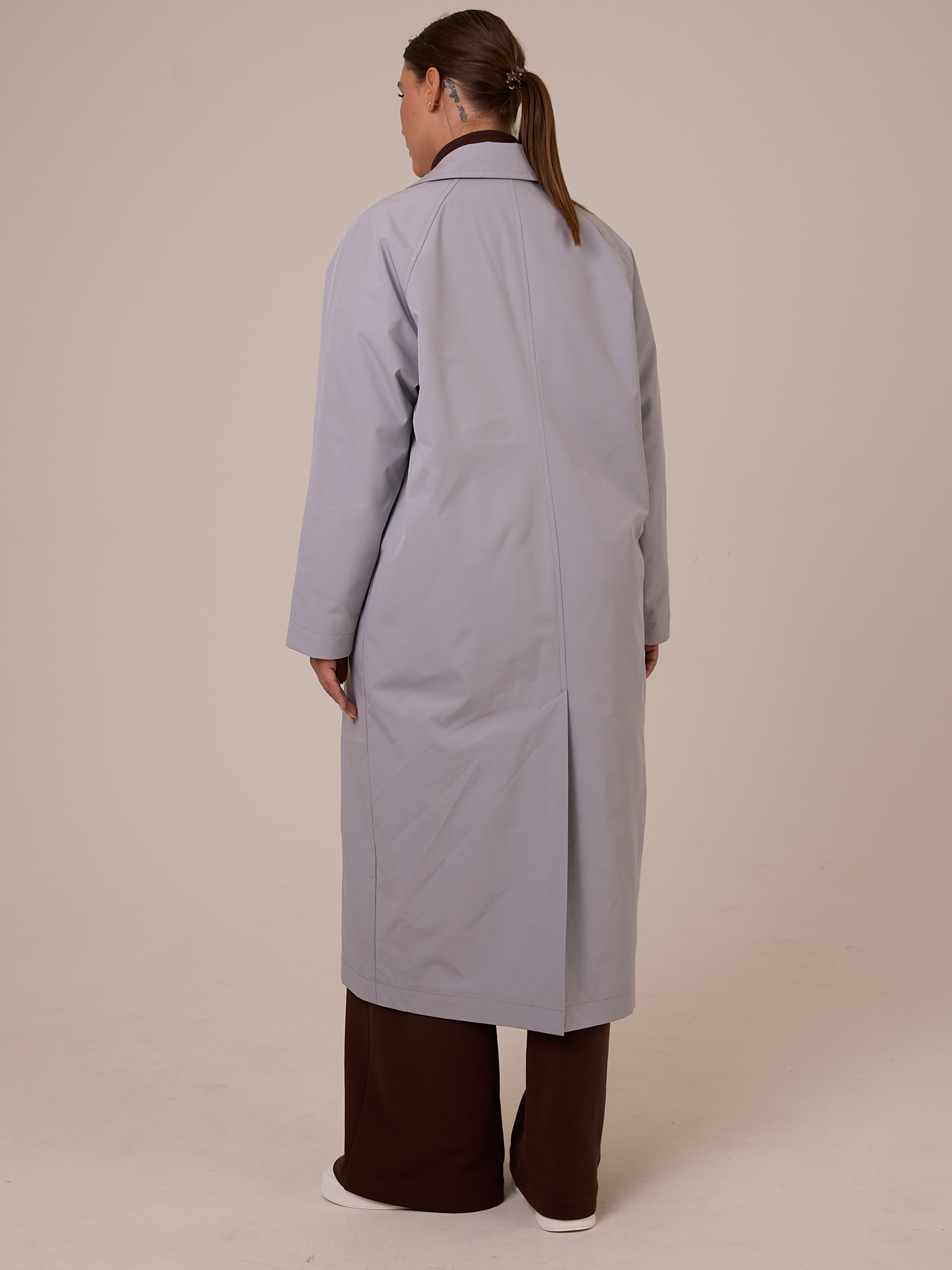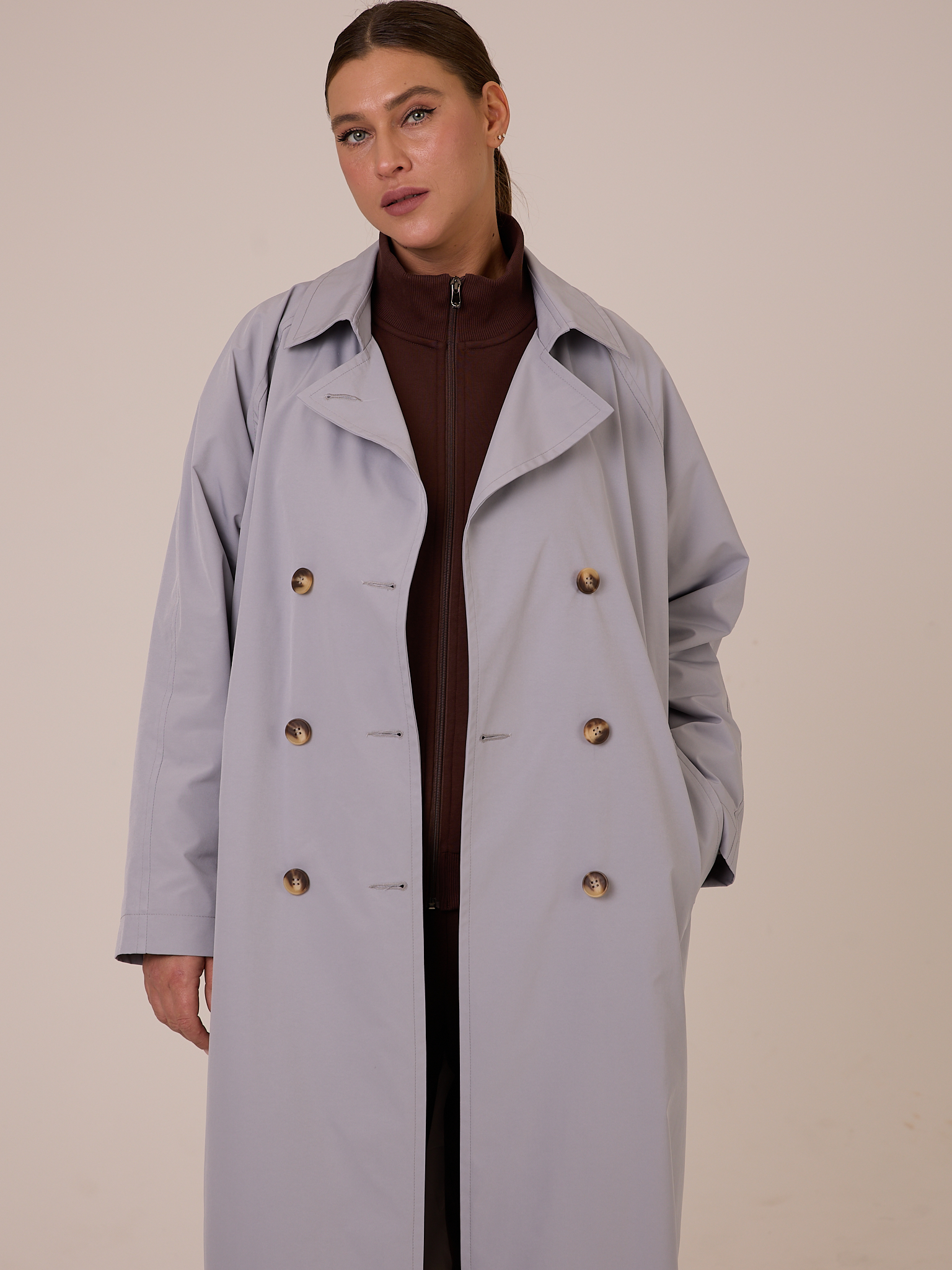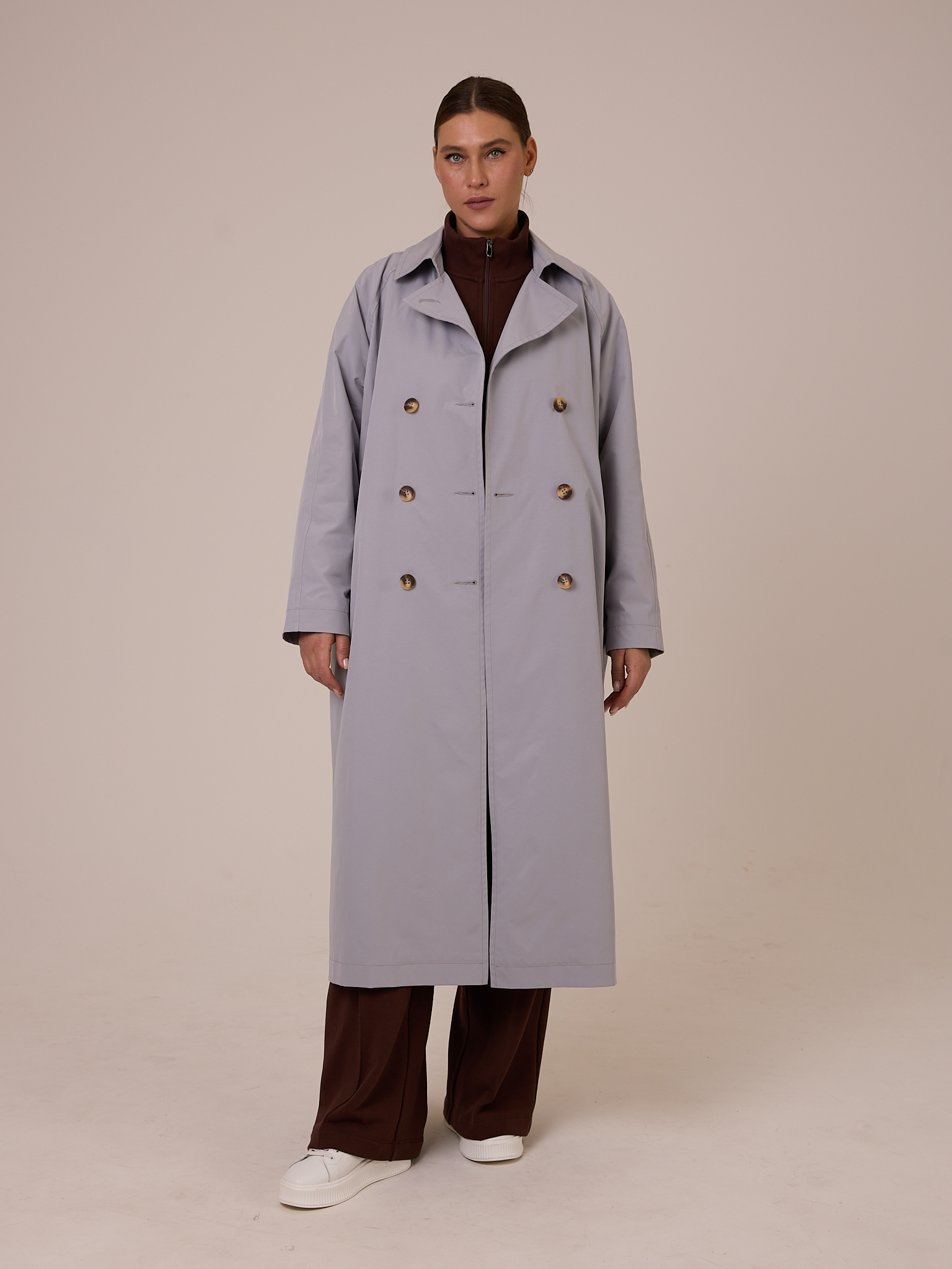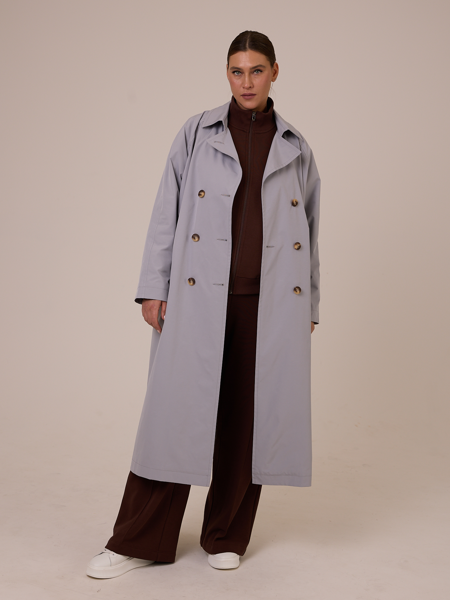 Плащ типа «овер», двубортный, длиной миди. Воротник отложной на стойке с возможностью отложить лацканы. Рукава реглан. Боковые карманы прорезные с листочками. В среднем шве спинки выполнена шлица. Плащ застегивается на пуговицы. Изделие выполнено из плащевой ткани на подкладке. Цвета: серый, молочный.