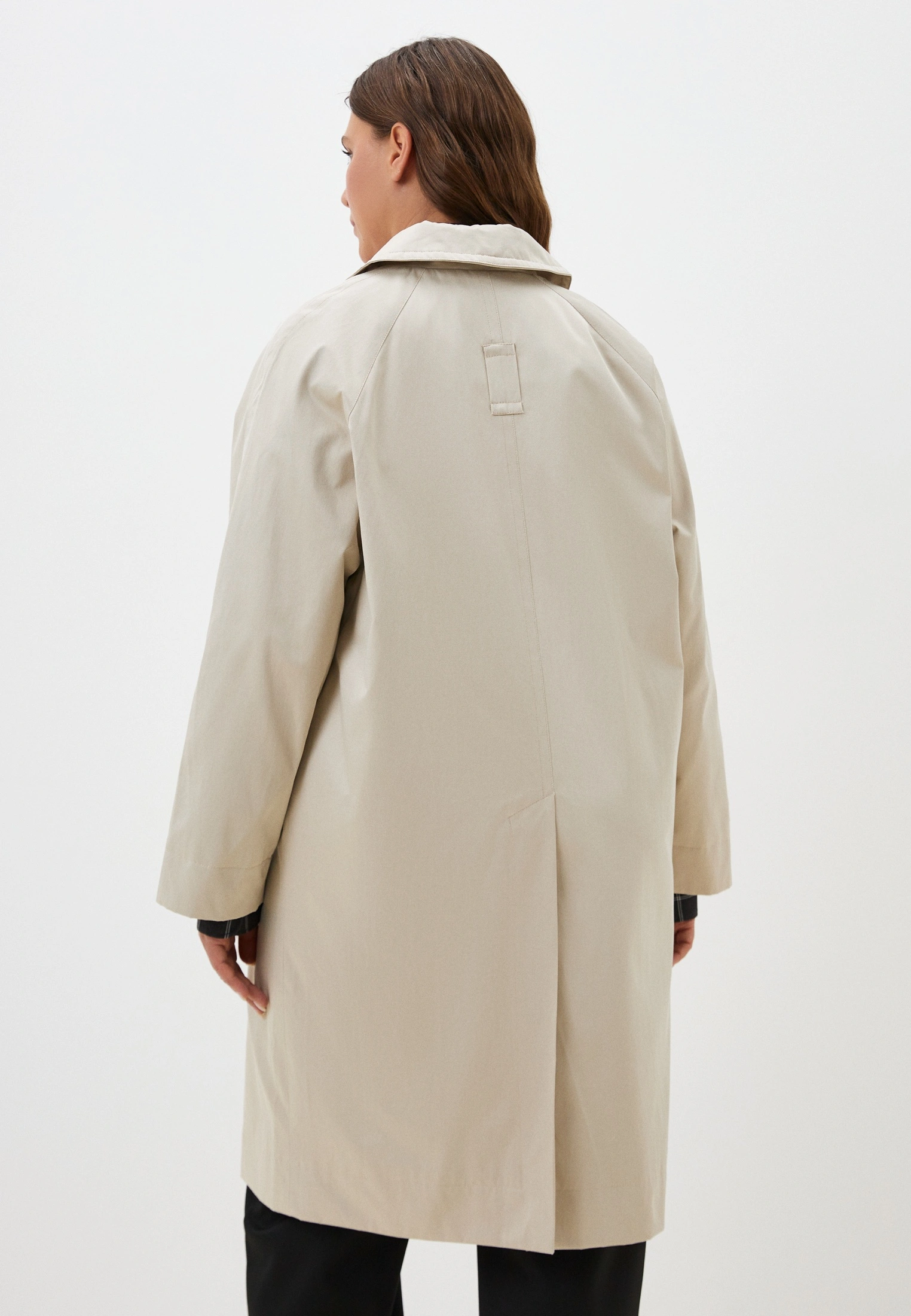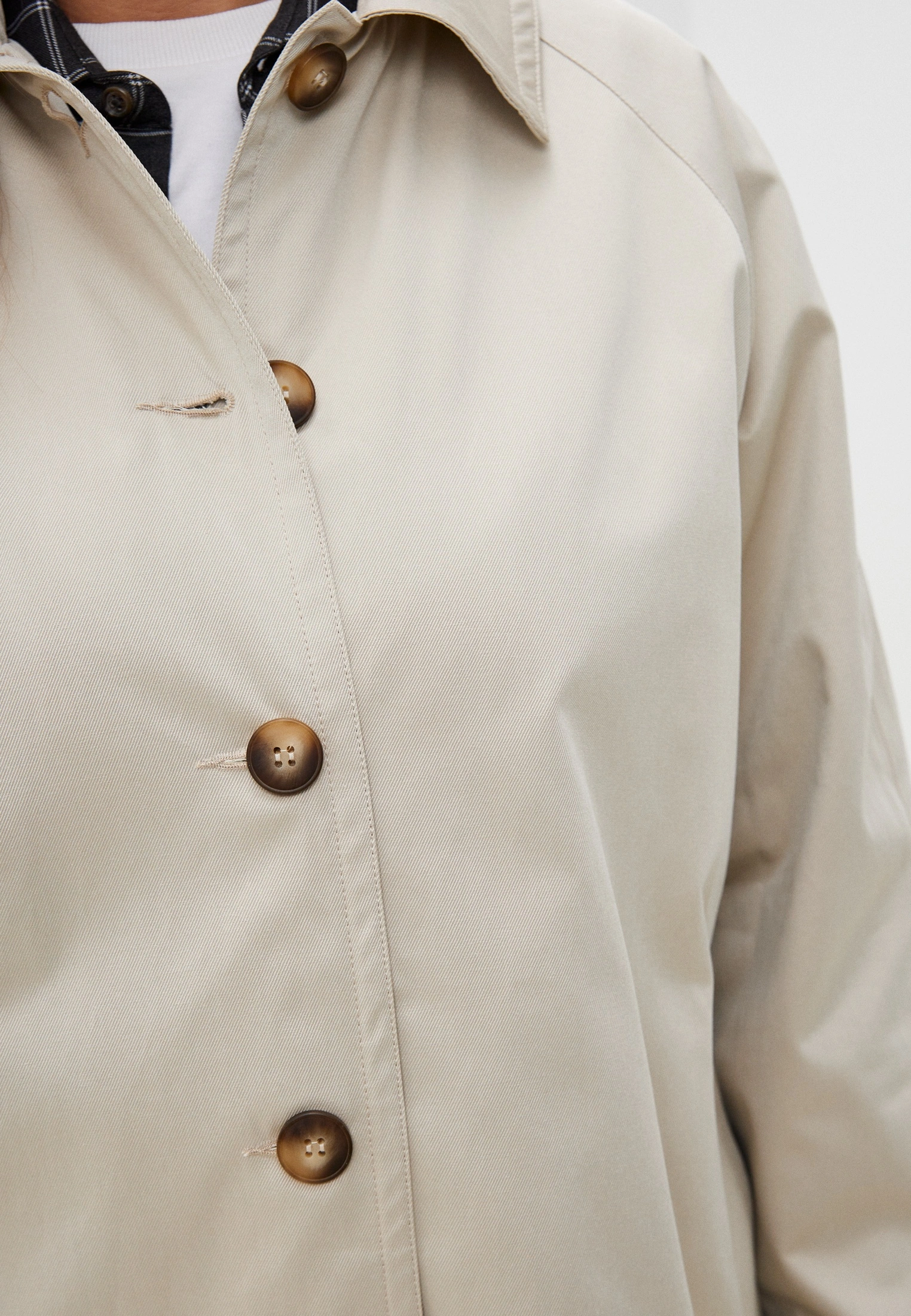 Плащ свободный, прямого силуэта, длиной чуть ниже колен. Воротник отложной. Рукава реглан с заниженной проймой. Боковые карманы прорезные с листочкой. В среднем шве спинки выполнена высокая шлица. Застегивается плащ на петли и пуговицы. Выполнен из плащевой ткани с высоким содержанием хлопка.