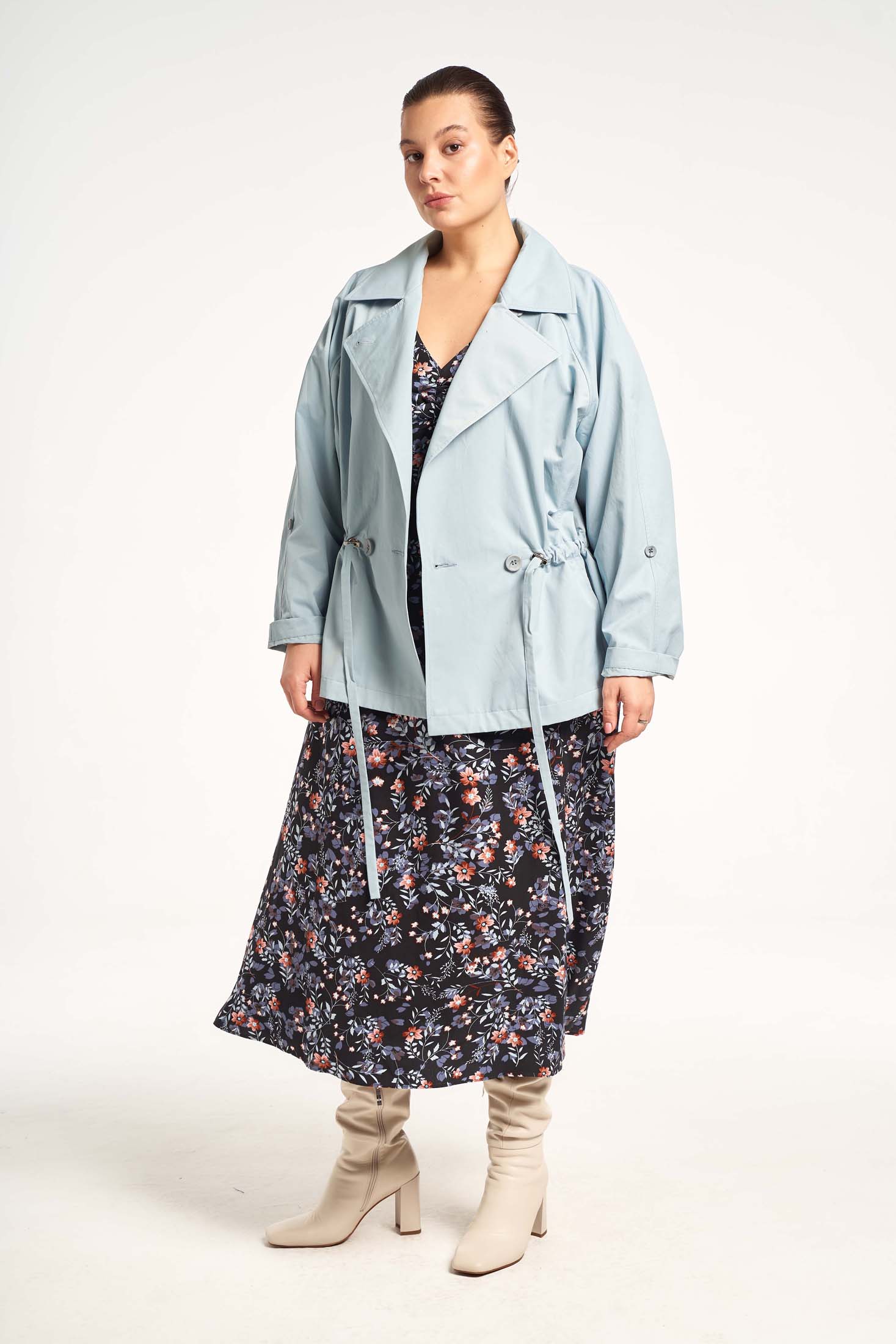 Жакет двубортный прямого силуэта с кулиской на талии. Длина чуть ниже линии бедер. Широкий английский воротник с лацканами. Рукава реглан с патами для отворота рукава. Боковые карманы в рельефных швах. Застегивается изделие на петли и пуговицы. На спинке – отлетная кокетка. Жакет выполнен без подкладки из плащевой ткани с высоким содержанием хлопка.