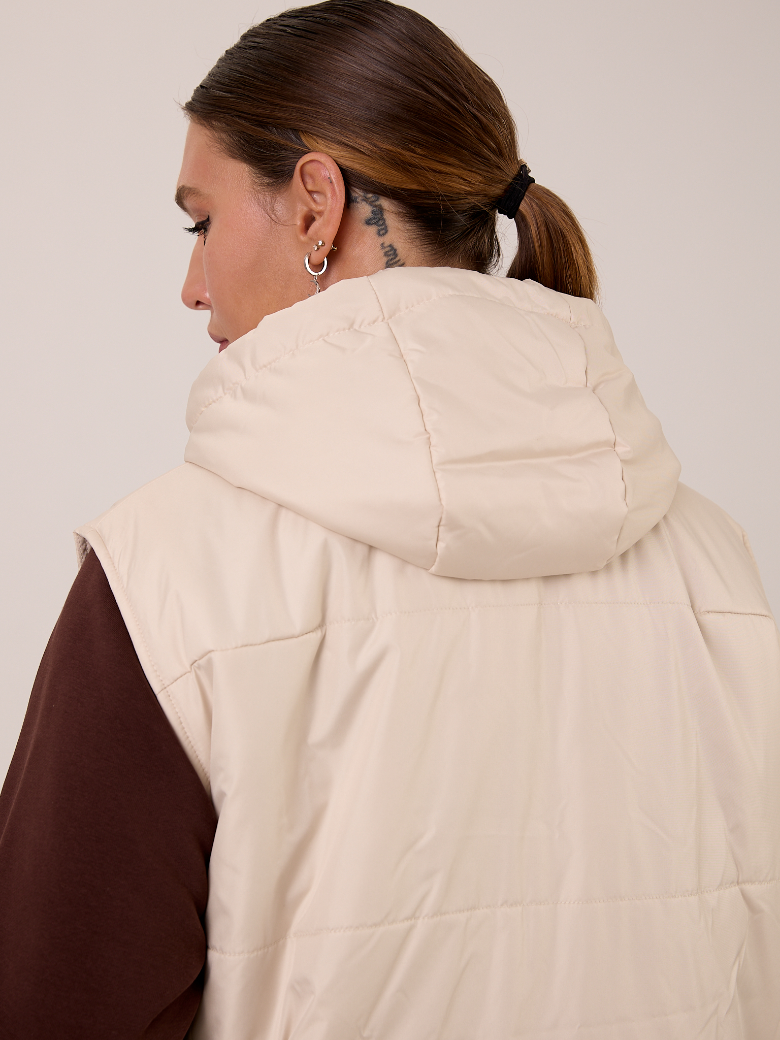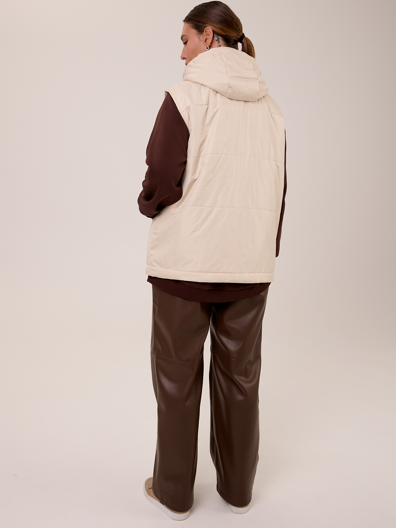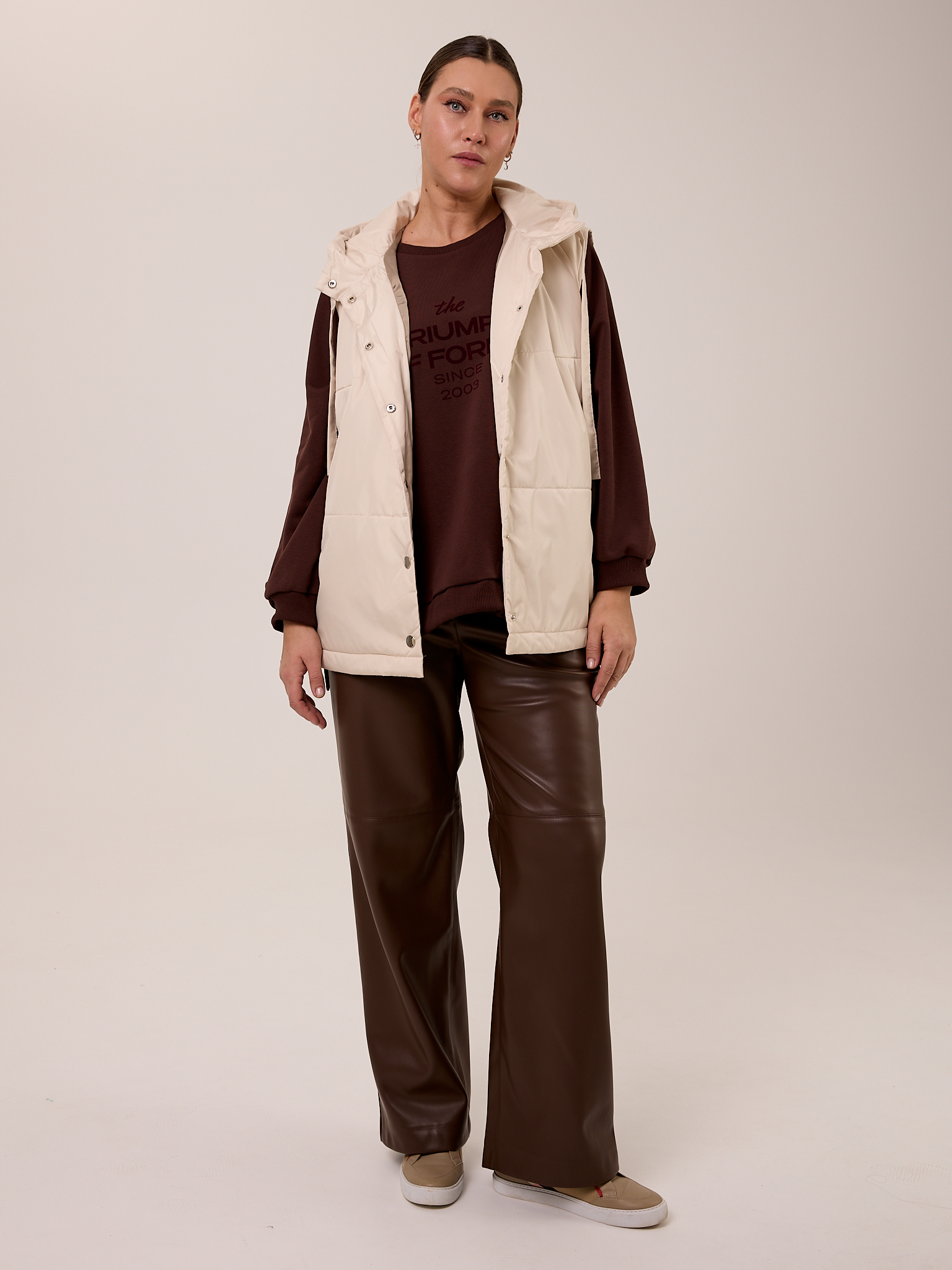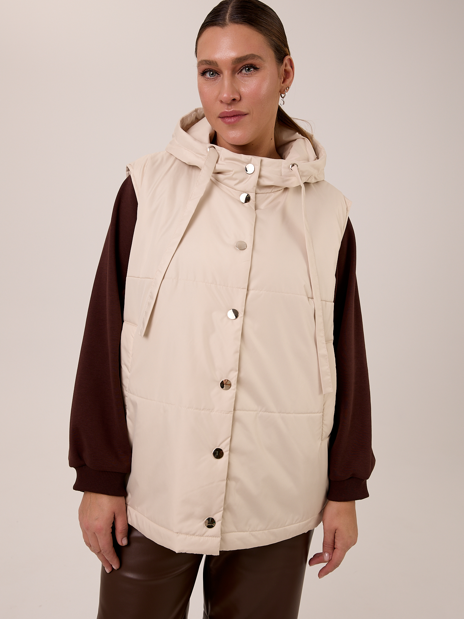 Утеплитель термофин 100гр/м2. Жилет прямого кроя, длиной чуть ниже линии бедер. Капюшон втачной со стойкой. В капюшоне выполнена кулиска с лентами. Боковые карманы с листочками. Нагрудная вытачка обеспечивает хорошую посадку на большие размеры. Жилет выполнен из практичной курточной ткани с водоотталкивающей пропиткой. Застегивается изделие на металлические кнопки.