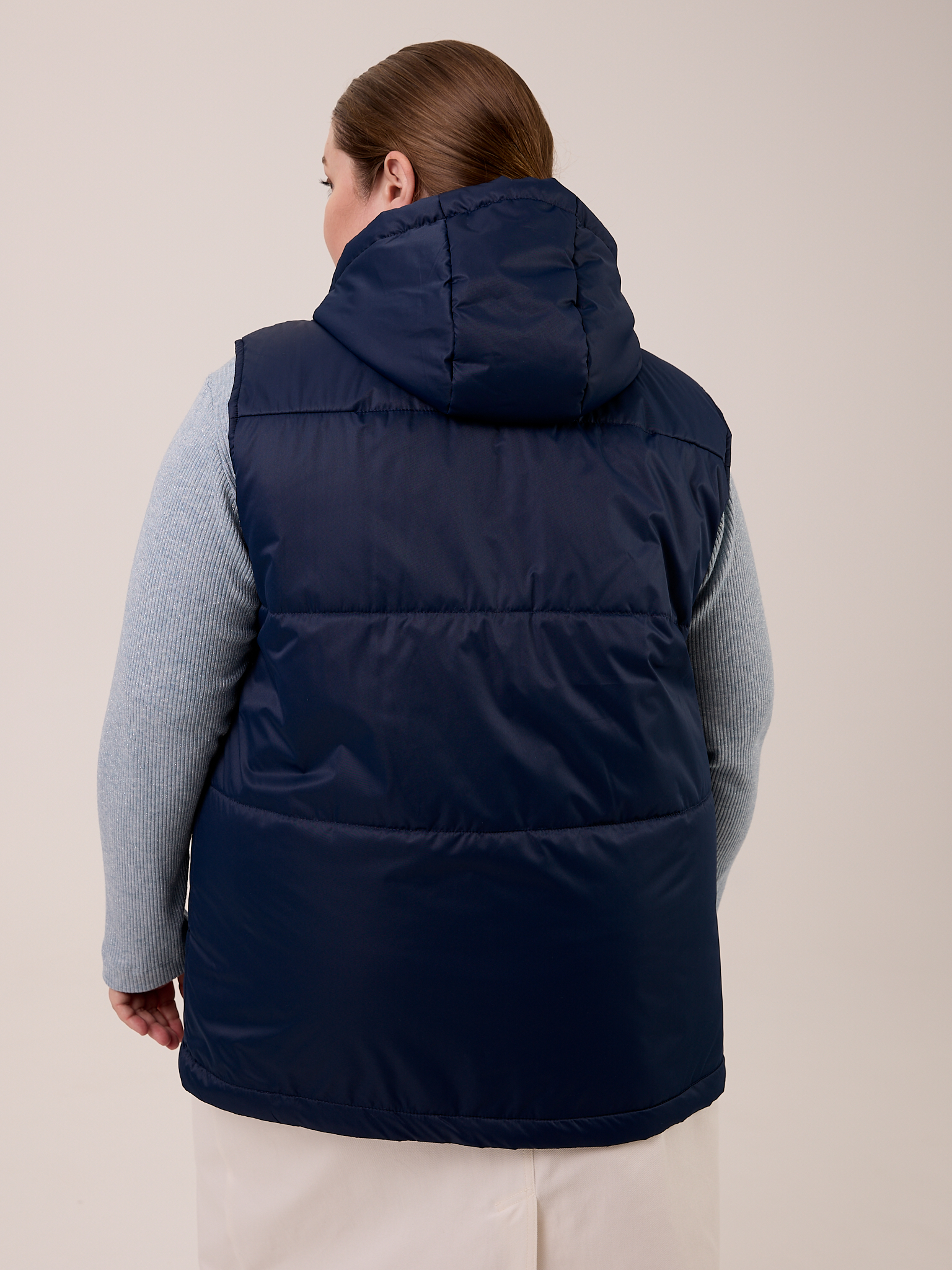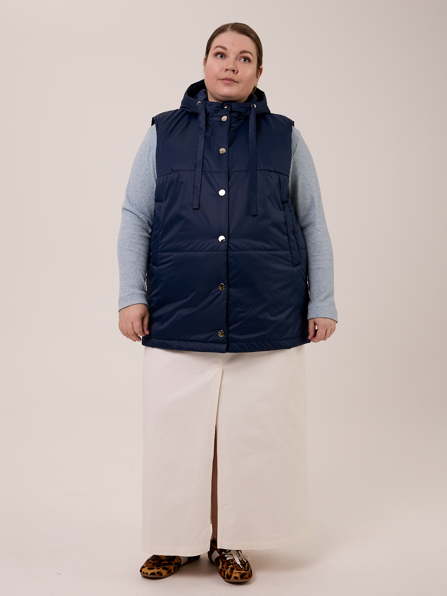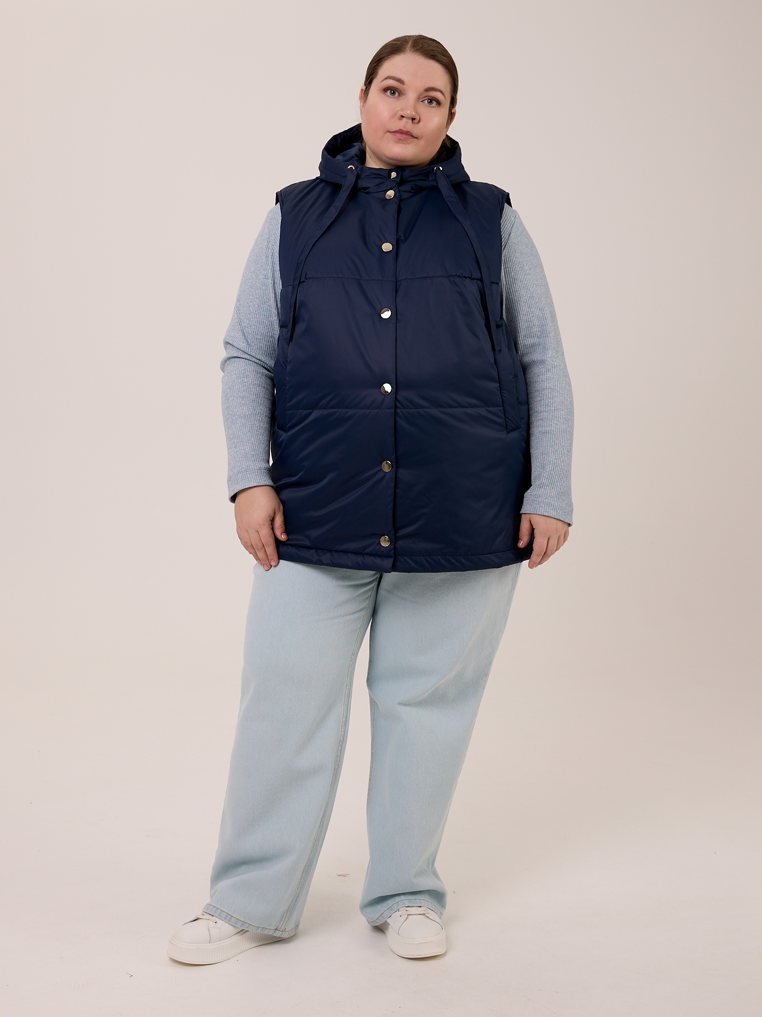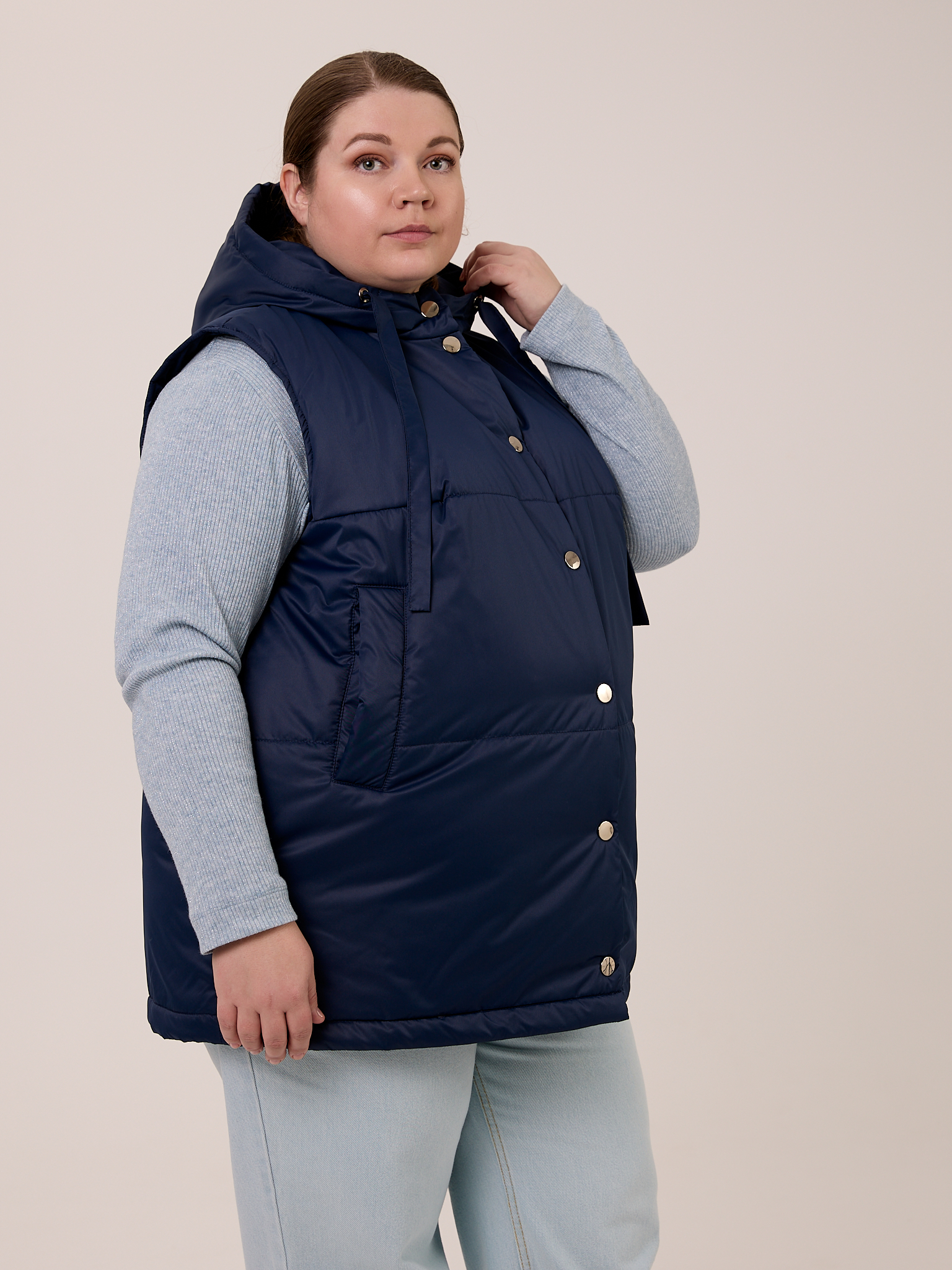 Утеплитель термофин 100гр/м2. Жилет прямого кроя, длиной чуть ниже линии бедер. Капюшон втачной со стойкой. В капюшоне выполнена кулиска с лентами. Боковые карманы с листочками. Нагрудная вытачка обеспечивает хорошую посадку на большие размеры. Жилет выполнен из практичной курточной ткани с водоотталкивающей пропиткой. Застегивается изделие на металлические кнопки.