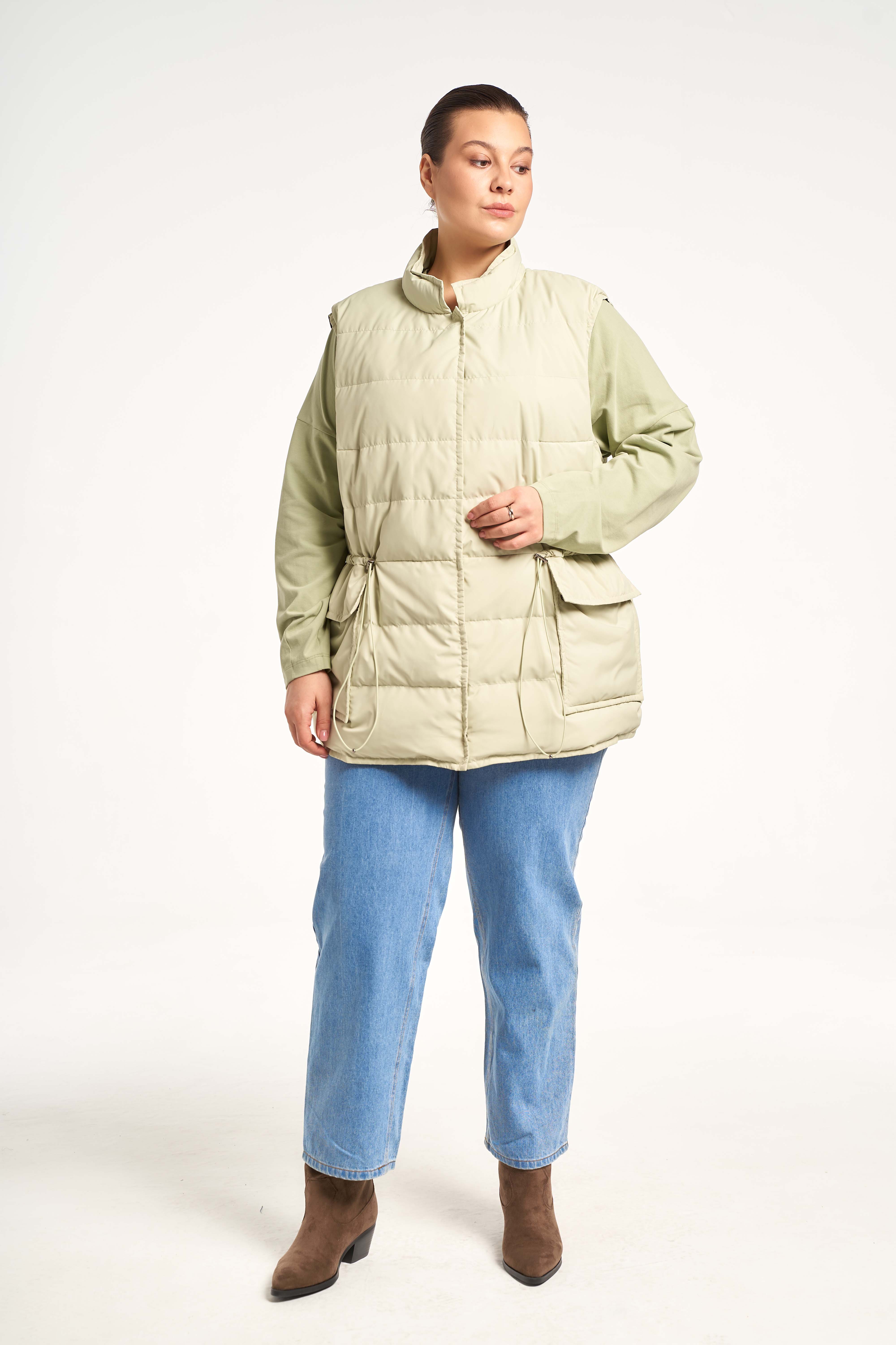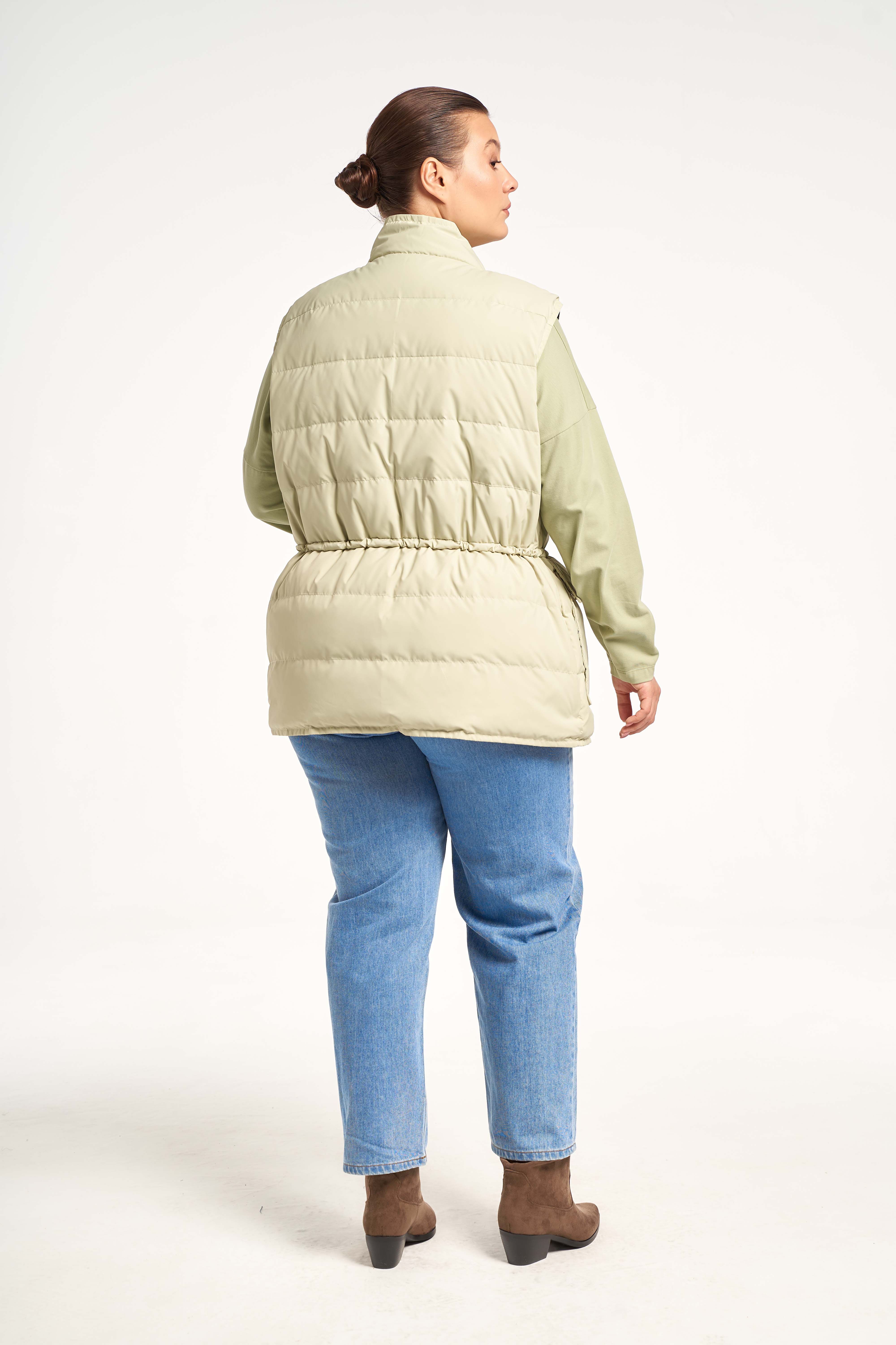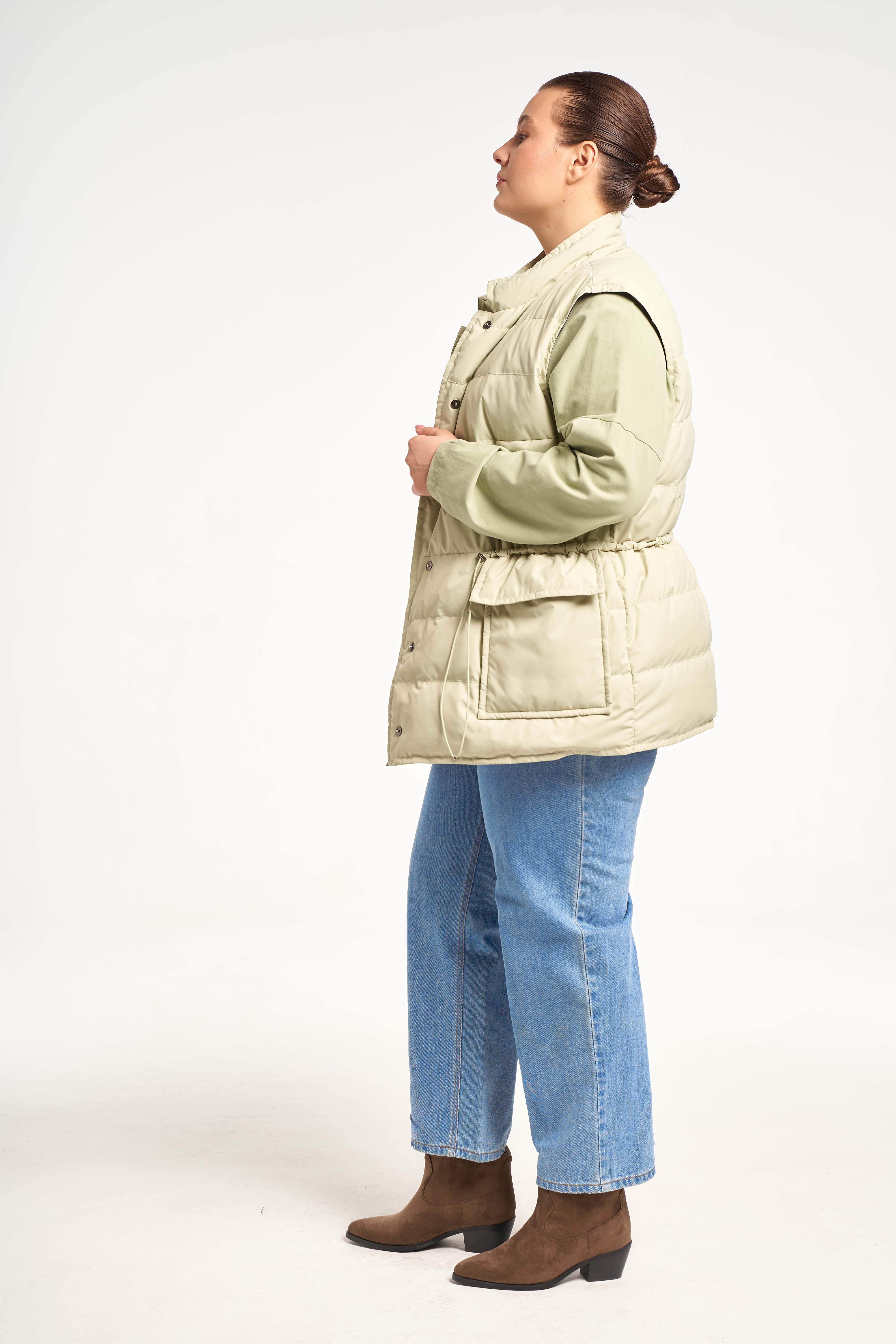Легкий жилет прямого кроя с кулиской на талии. Воротник-невысокая стойка. Карманы накладные с клапанами. Застегивается жилет на потайные кнопки.