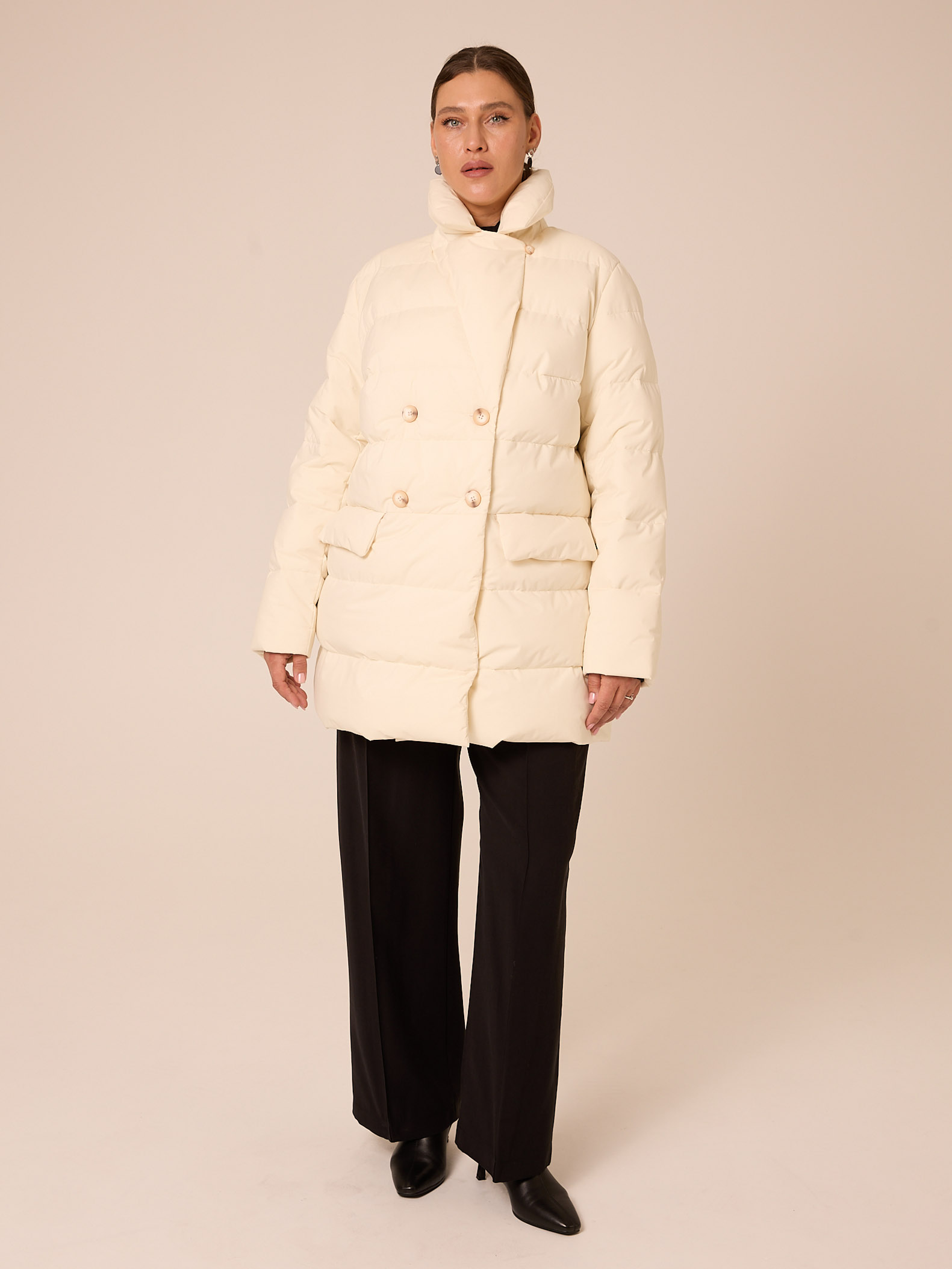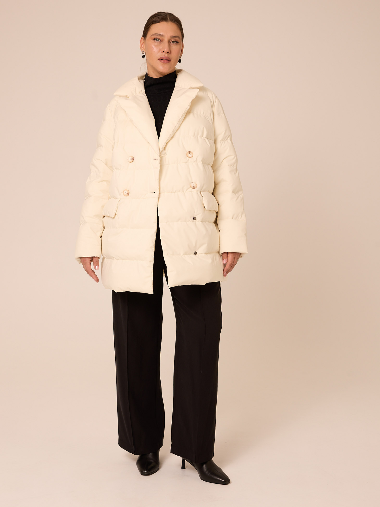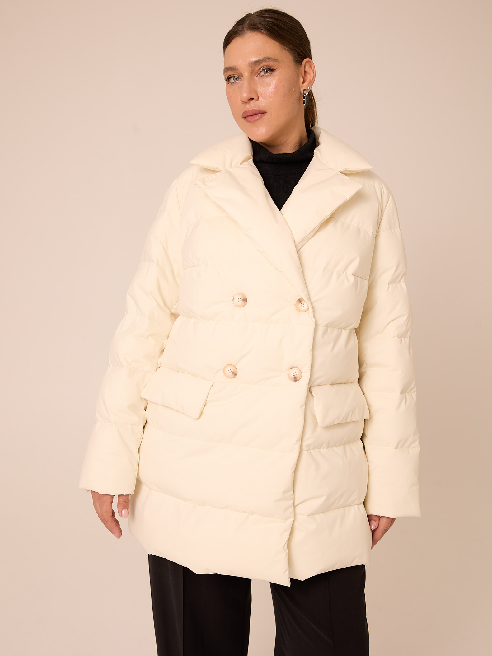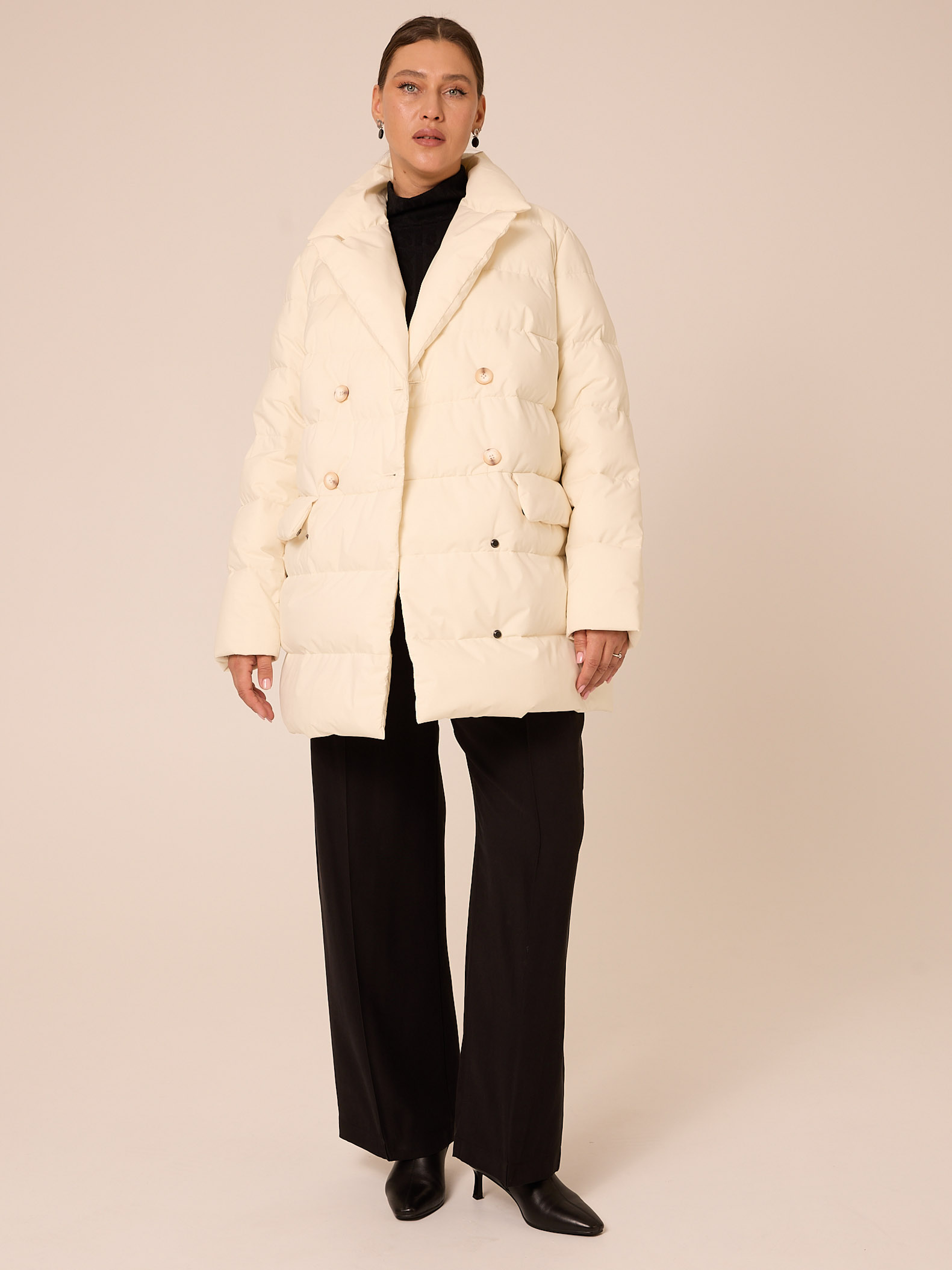 Утеплитель лебяжий синтепух 120гр/м2 + термофин 60гр/м2. Куртка прямого кроя, длиной ниже линии бедер. Плечевой пояс немного спущен. Воротник типа английского, с лацканами, застегивается до верха. Рукава двухшовные. Боковые карманы с клапанами, выполнены в горизонтальном подрезе. Нагрудная вытачка обеспечит хорошую посадку. Есть внутренний накладной карман на подкладке. Куртка двубортная, застегивается на петли и пуговицы и дополнительные потайные кнопки. Выполнена в трех цветах: светло сером, молочном и черном.