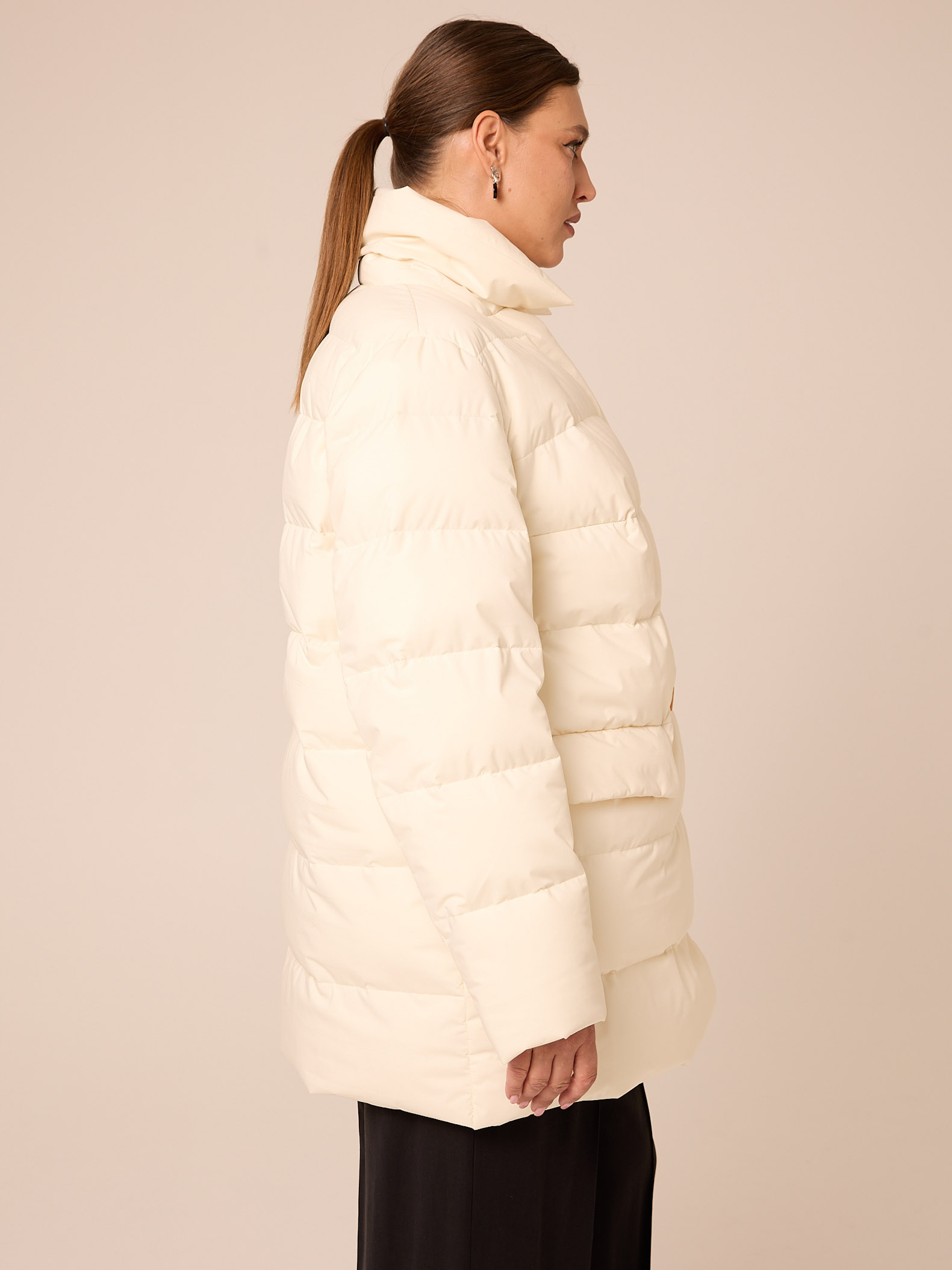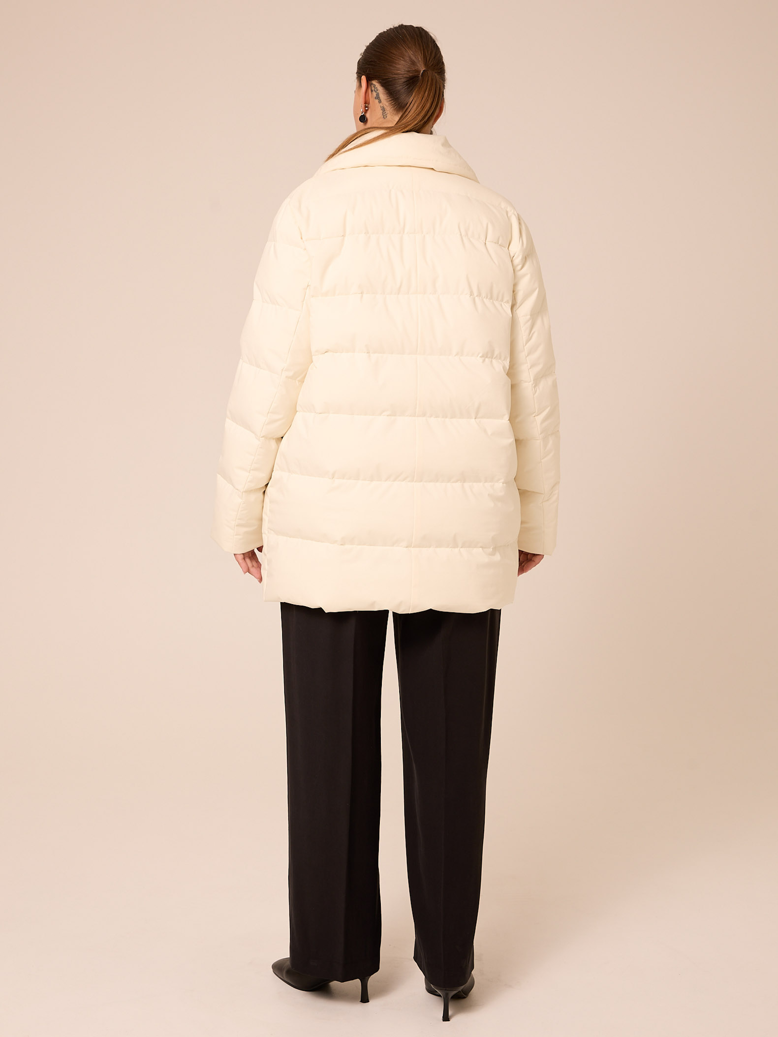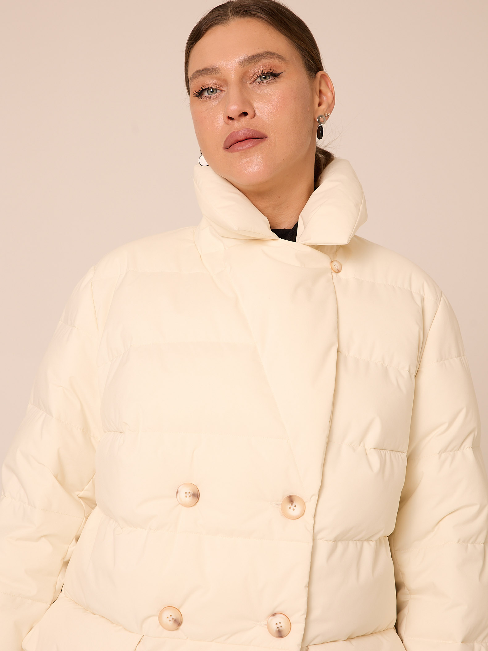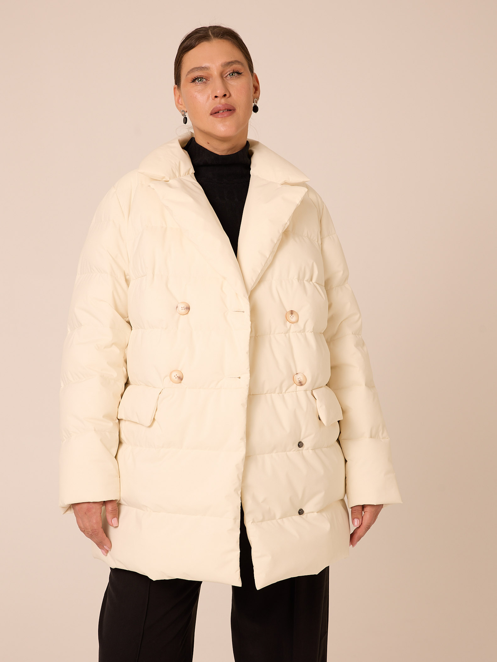 Утеплитель лебяжий синтепух 120гр/м2 + термофин 60гр/м2. Куртка прямого кроя, длиной ниже линии бедер. Плечевой пояс немного спущен. Воротник типа английского, с лацканами, застегивается до верха. Рукава двухшовные. Боковые карманы с клапанами, выполнены в горизонтальном подрезе. Нагрудная вытачка обеспечит хорошую посадку. Есть внутренний накладной карман на подкладке. Куртка двубортная, застегивается на петли и пуговицы и дополнительные потайные кнопки. Выполнена в трех цветах: светло сером, молочном и черном.