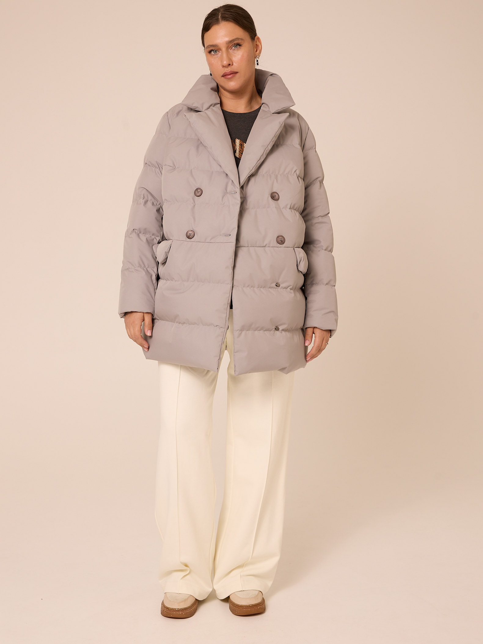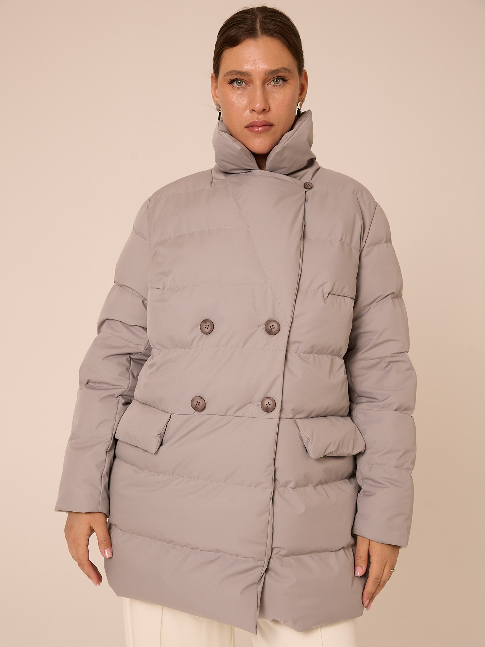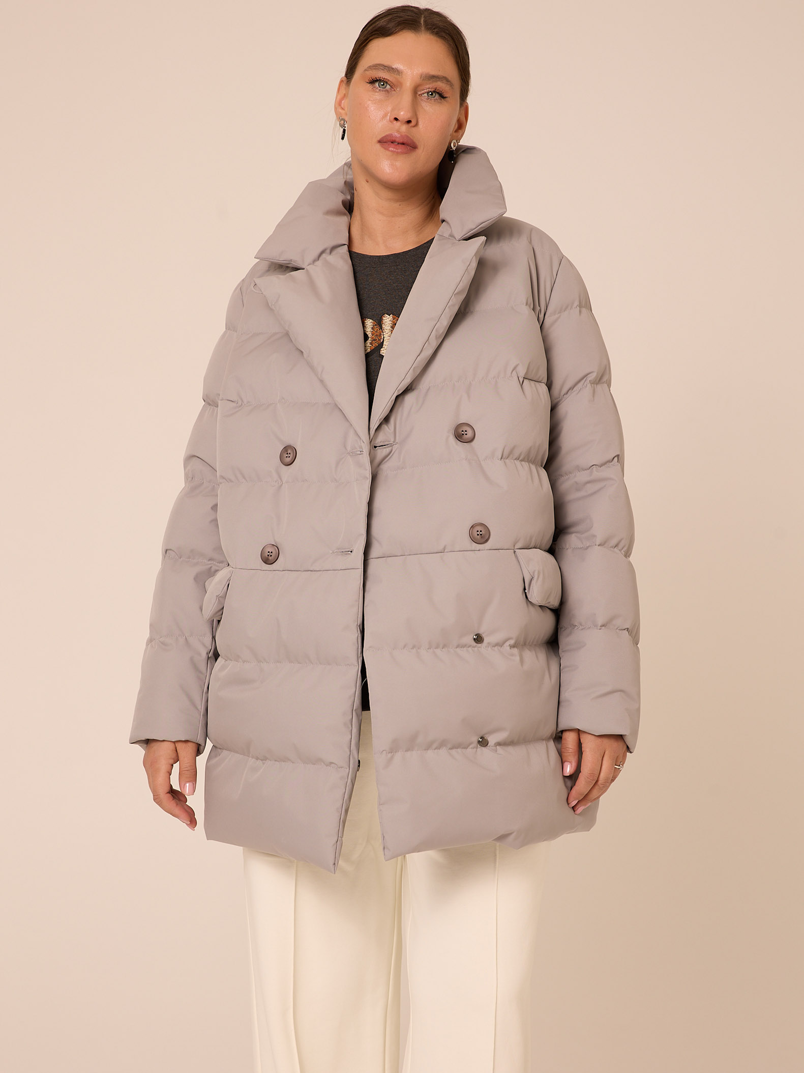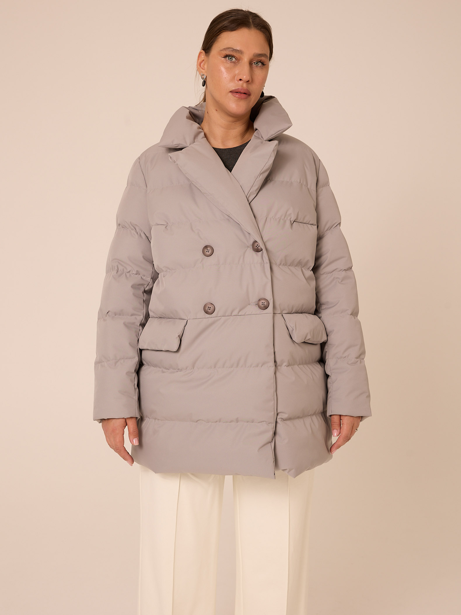 Утеплитель лебяжий синтепух 120гр/м2 + термофин 60гр/м2. Куртка прямого кроя, длиной ниже линии бедер. Плечевой пояс немного спущен. Воротник типа английского, с лацканами, застегивается до верха. Рукава двухшовные. Боковые карманы с клапанами, выполнены в горизонтальном подрезе. Нагрудная вытачка обеспечит хорошую посадку. Есть внутренний накладной карман на подкладке. Куртка двубортная, застегивается на петли и пуговицы и дополнительные потайные кнопки. Выполнена в трех цветах: светло сером, молочном и черном.