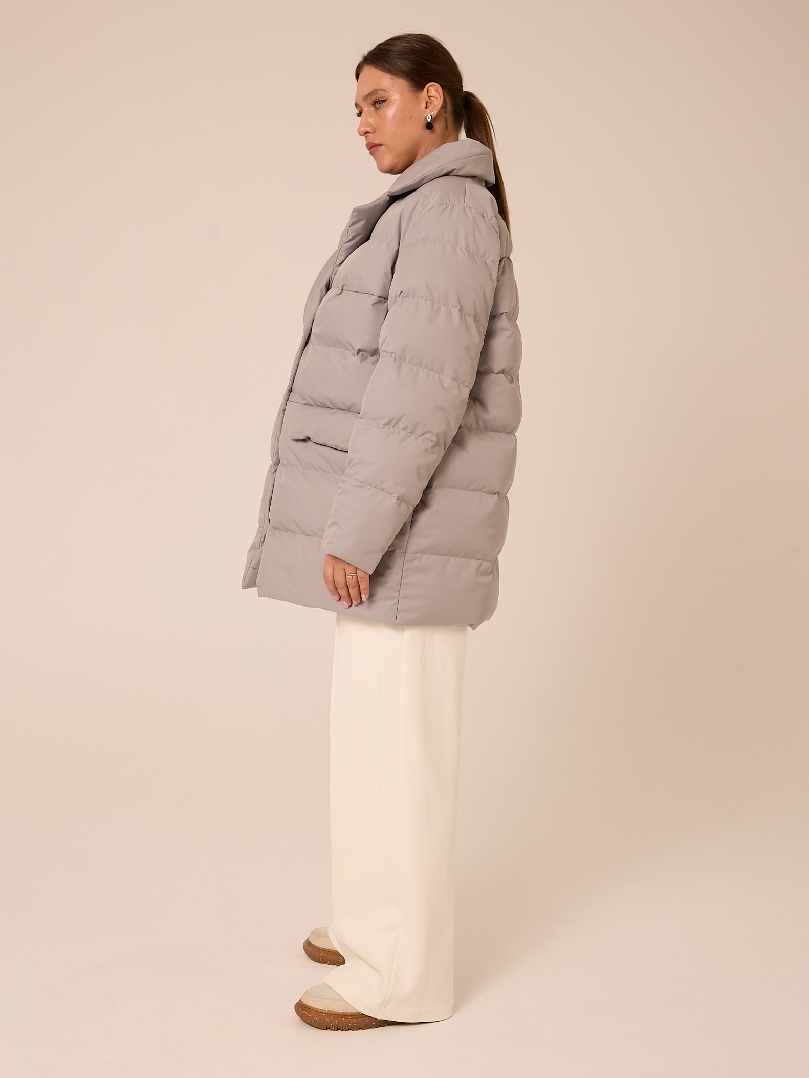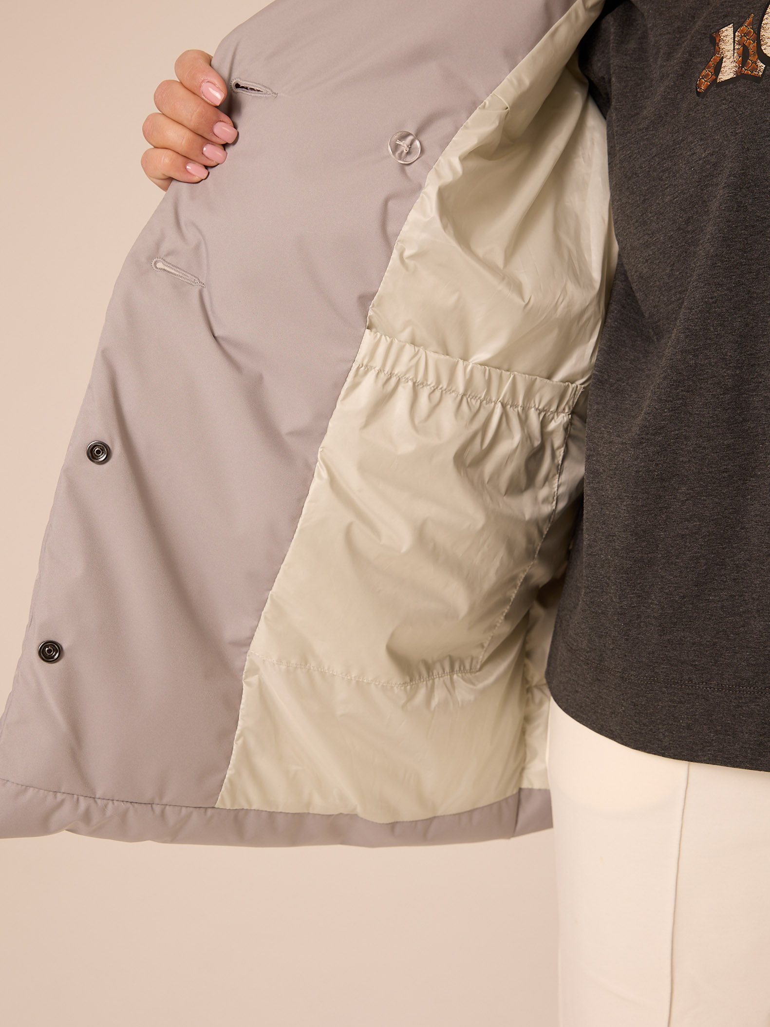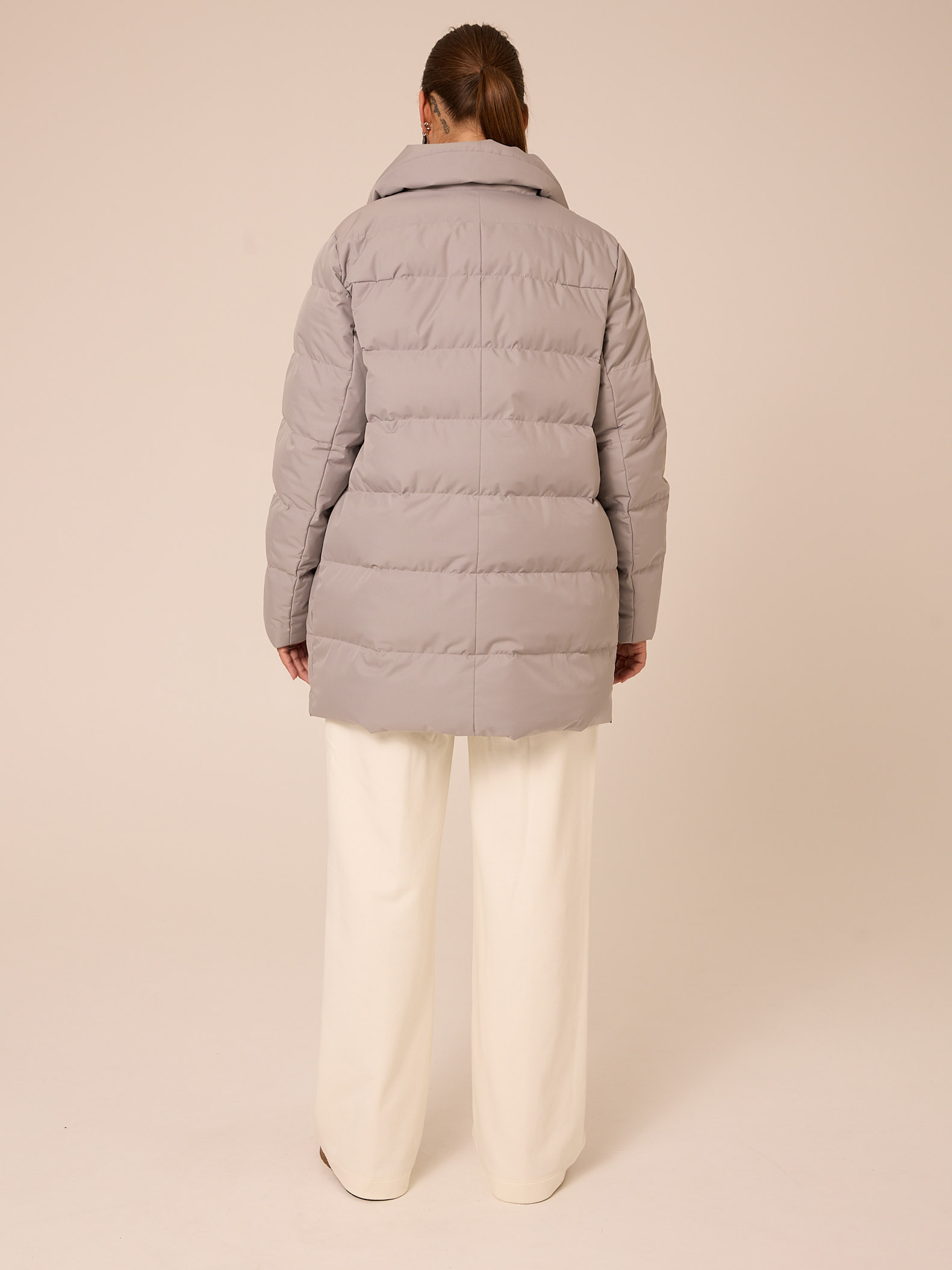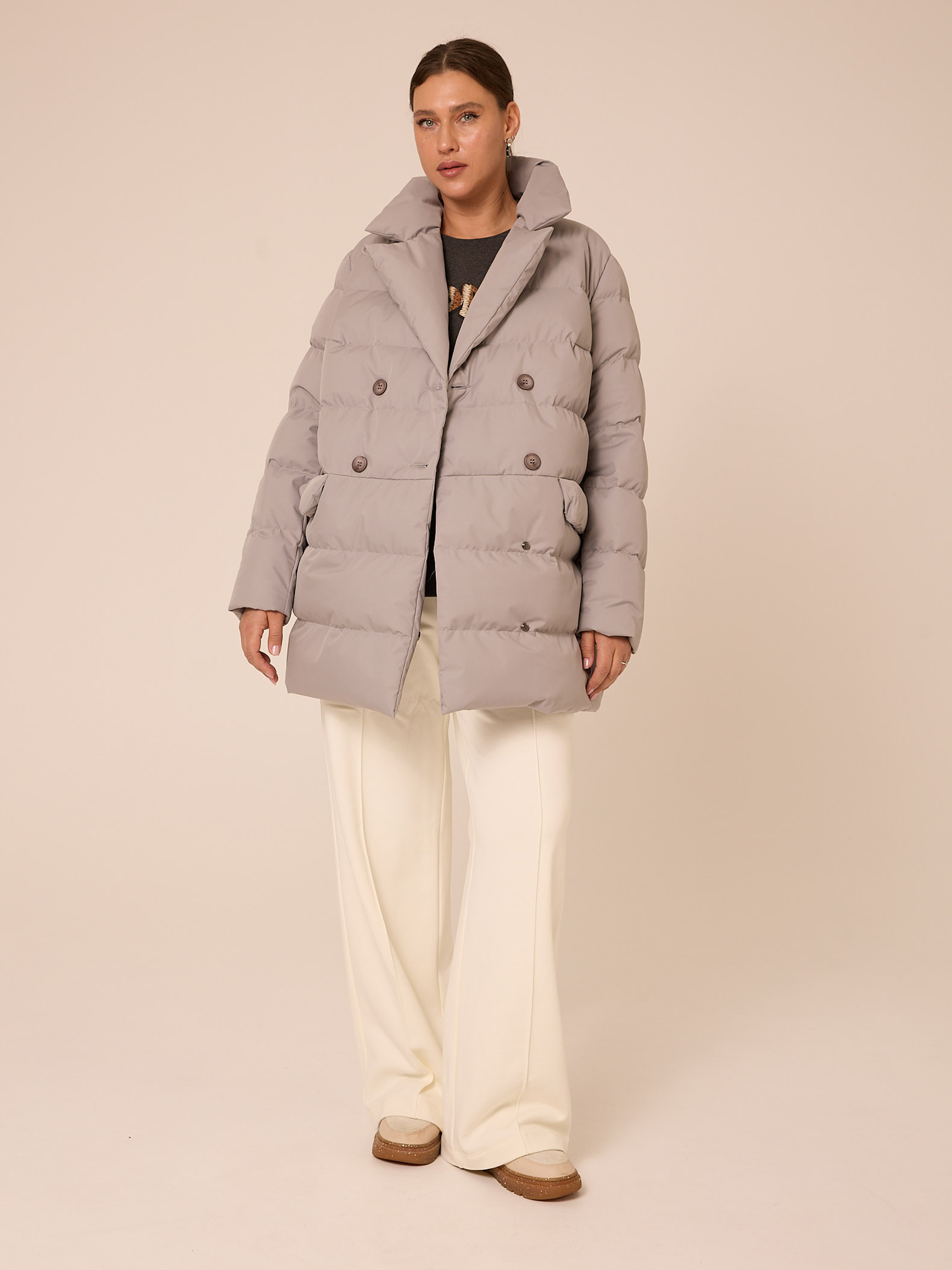 Утеплитель лебяжий синтепух 120гр/м2 + термофин 60гр/м2. Куртка прямого кроя, длиной ниже линии бедер. Плечевой пояс немного спущен. Воротник типа английского, с лацканами, застегивается до верха. Рукава двухшовные. Боковые карманы с клапанами, выполнены в горизонтальном подрезе. Нагрудная вытачка обеспечит хорошую посадку. Есть внутренний накладной карман на подкладке. Куртка двубортная, застегивается на петли и пуговицы и дополнительные потайные кнопки. Выполнена в трех цветах: светло сером, молочном и черном.