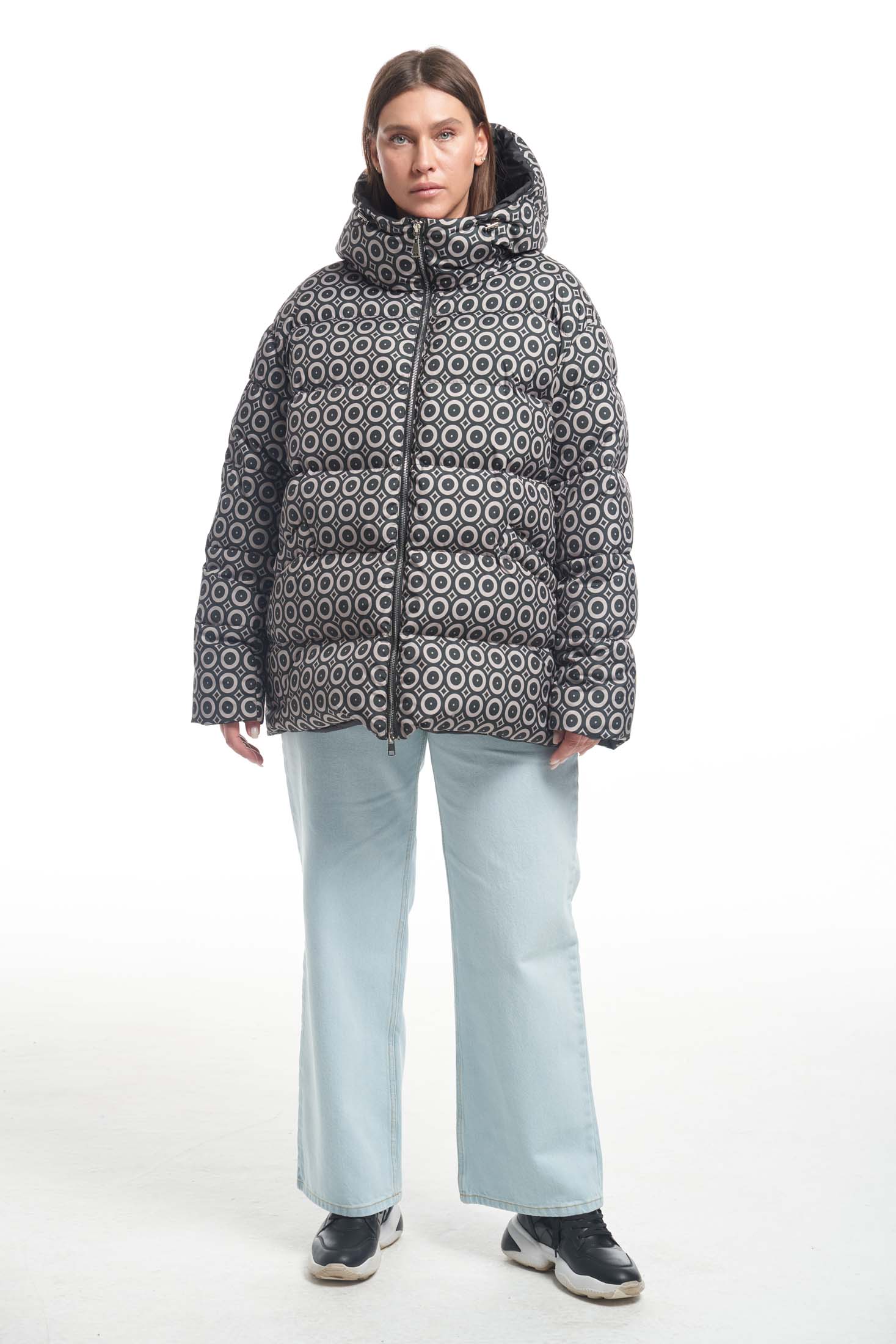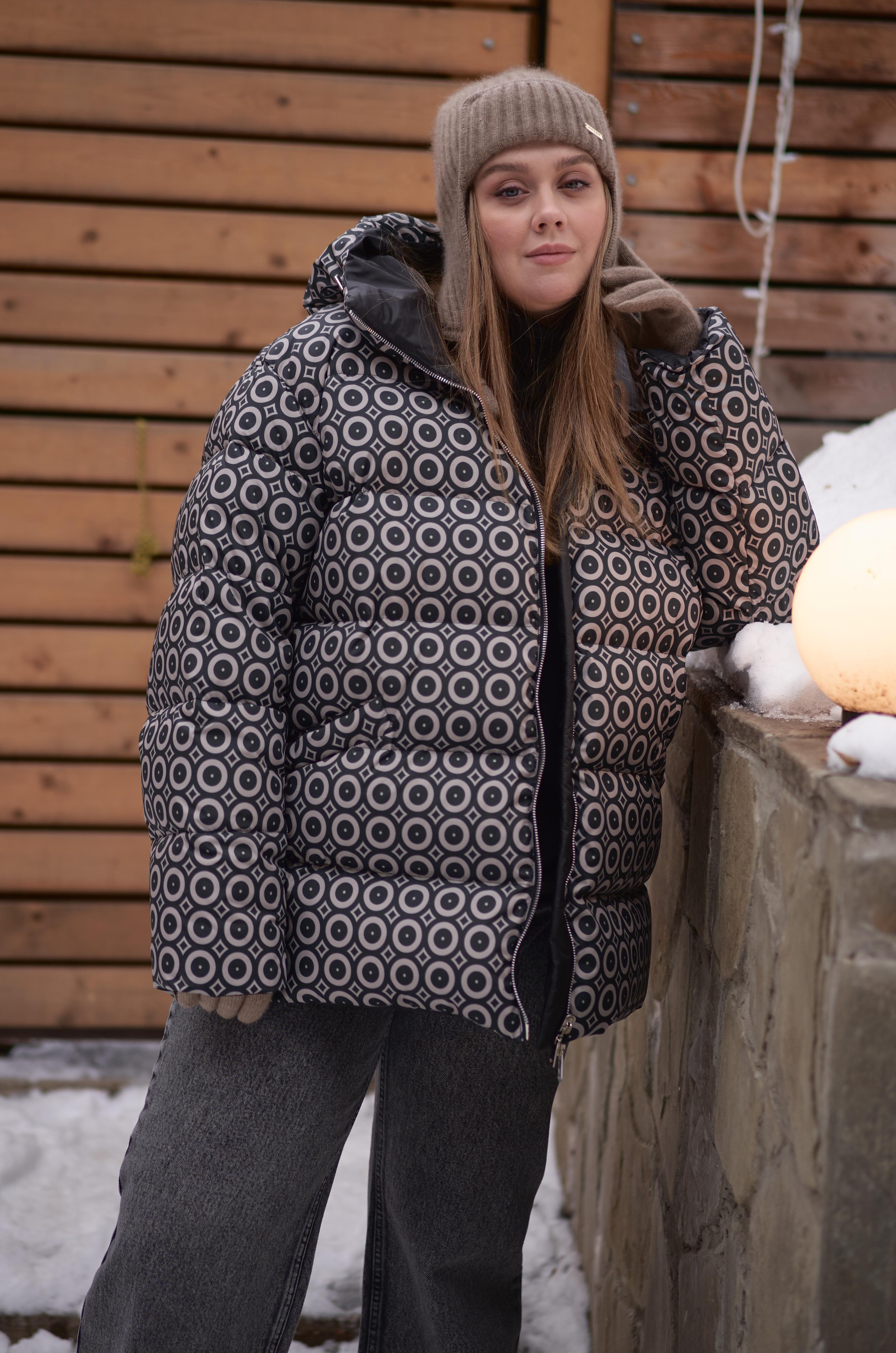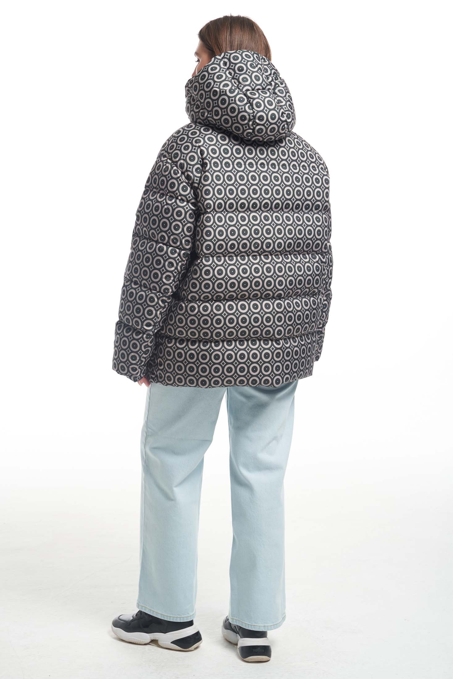 Двусторонний пуховик длиной чуть ниже линии бедер. Плечевой пояс немного спущен. Капюшон втачнойна высокой стойке. На капюшоне выполнена декоративная кулиска с резинкой. На однотонной стороне пуховика боковые карманы накладные. На принтованной стороне карманы прорезные с листочками. По низу изделия выполнена кулиска. Куртка застегивается на металлическую реверсивную молнию. При изготовлении применяется двухслойный пухпакет.