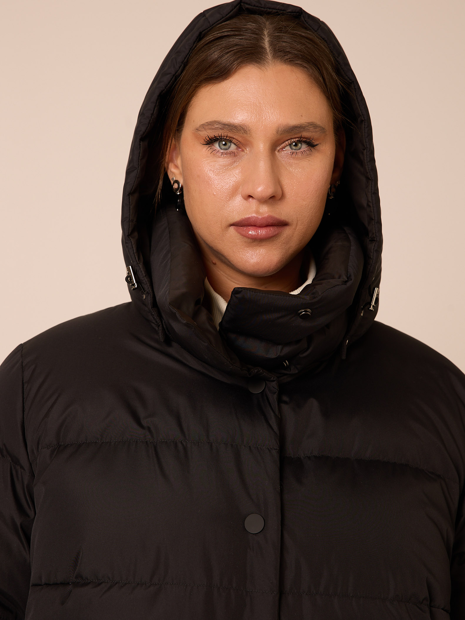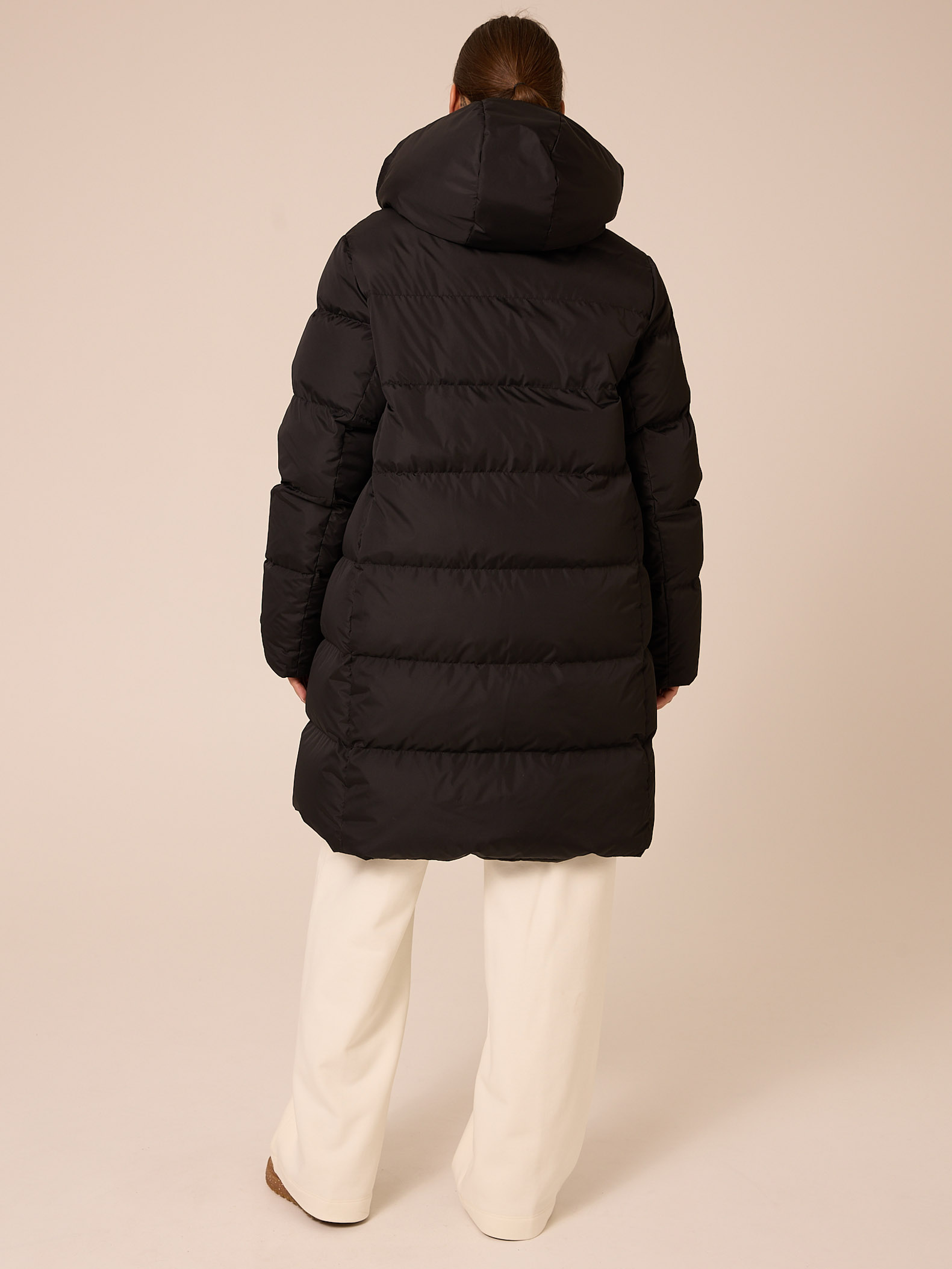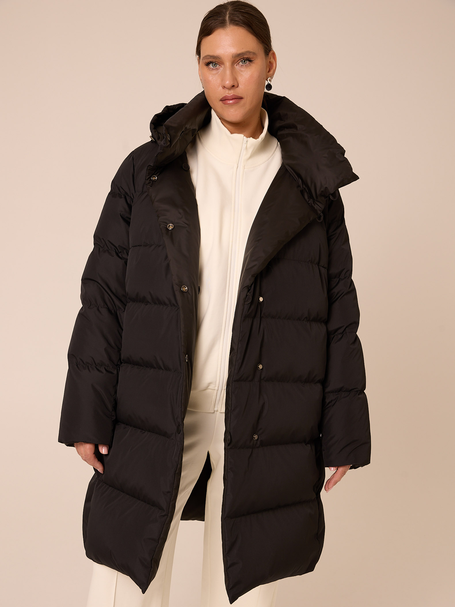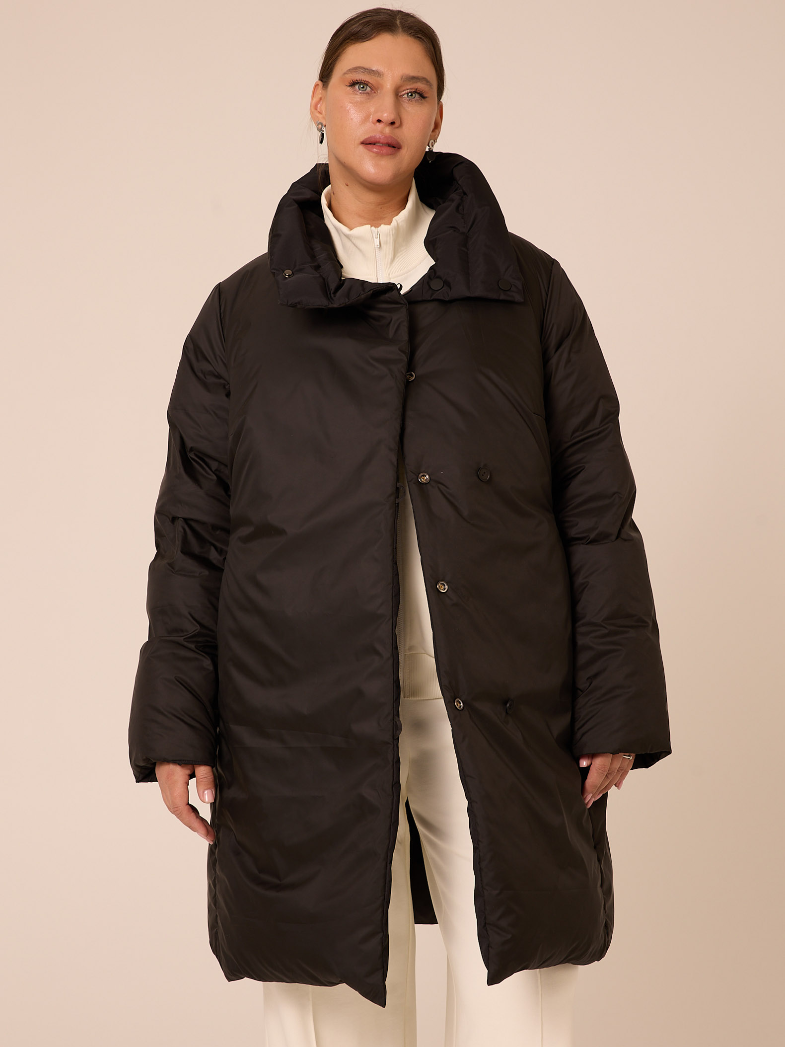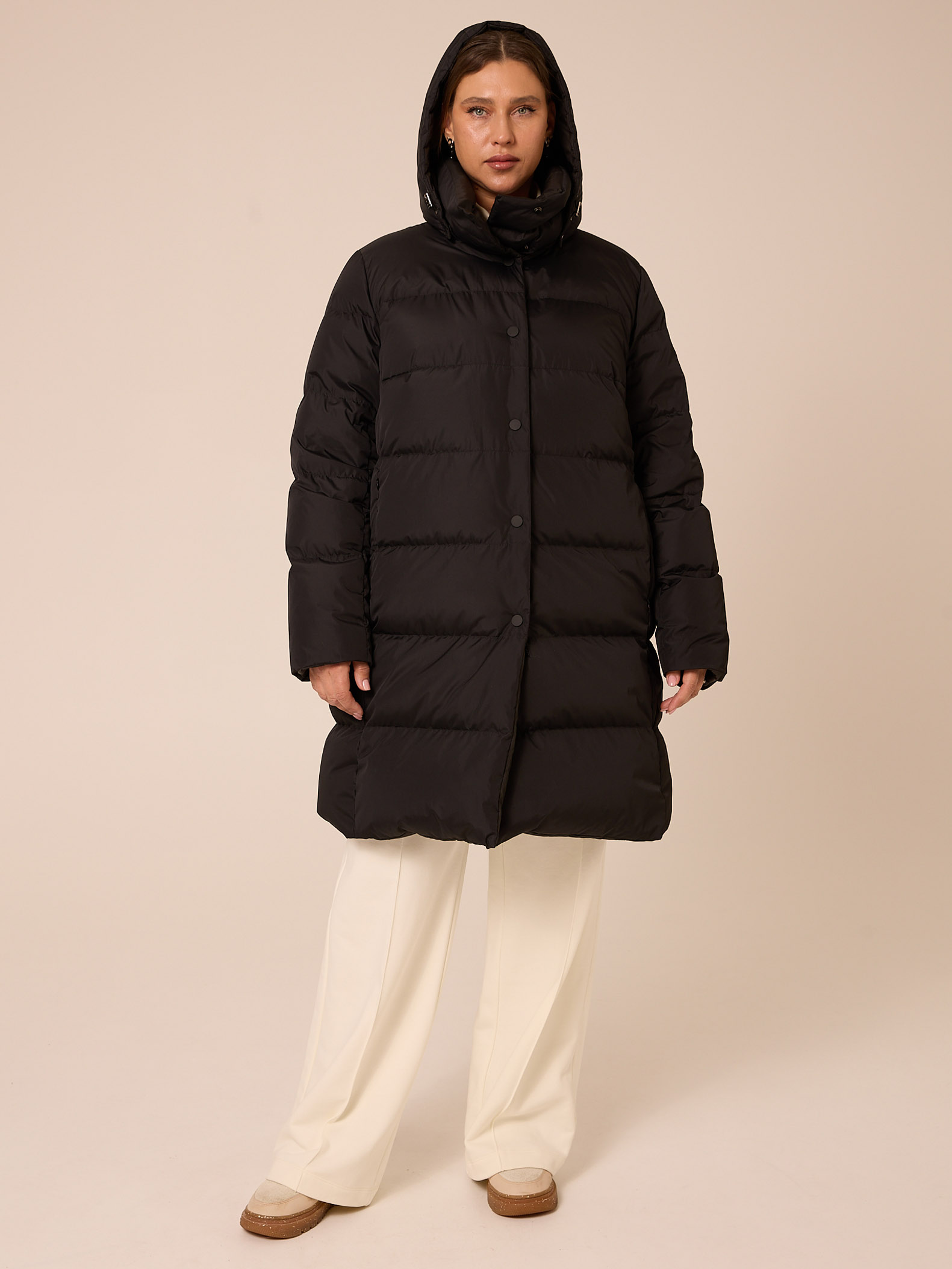 Пуховое двустороннее пальто, слегка расширенного к низу силуэта. Воротник – высокая стойка. Капюшон съемный, пристегивается на кнопки. Рукава втачные, двухшовные. Карманы выполнены в рельефах. Нагрудная вытачка обеспечит хорошую посадку. С одной стороны выполнена кулиска на талии с регулируемой резинкой. Застегивается пальто на кнопки с одной стороны и на петли/пуговицы с другой. Изделие выполнено из курточных тканей с водоотталкивающей пропиткой. Для пальто использовали два вида тканей: матовая и с деликатным глянцем. Выполнено в черном и коричневом цветах.