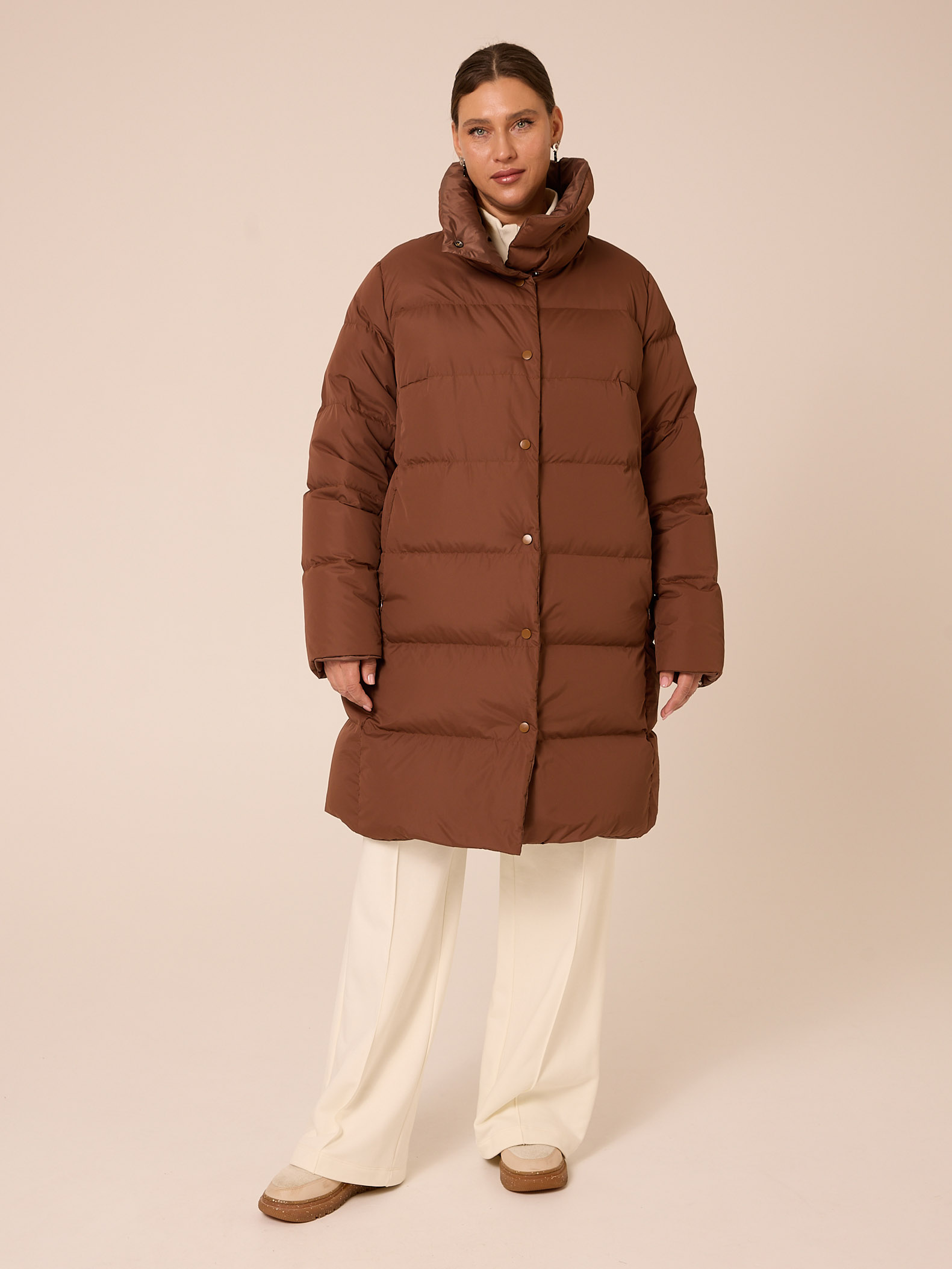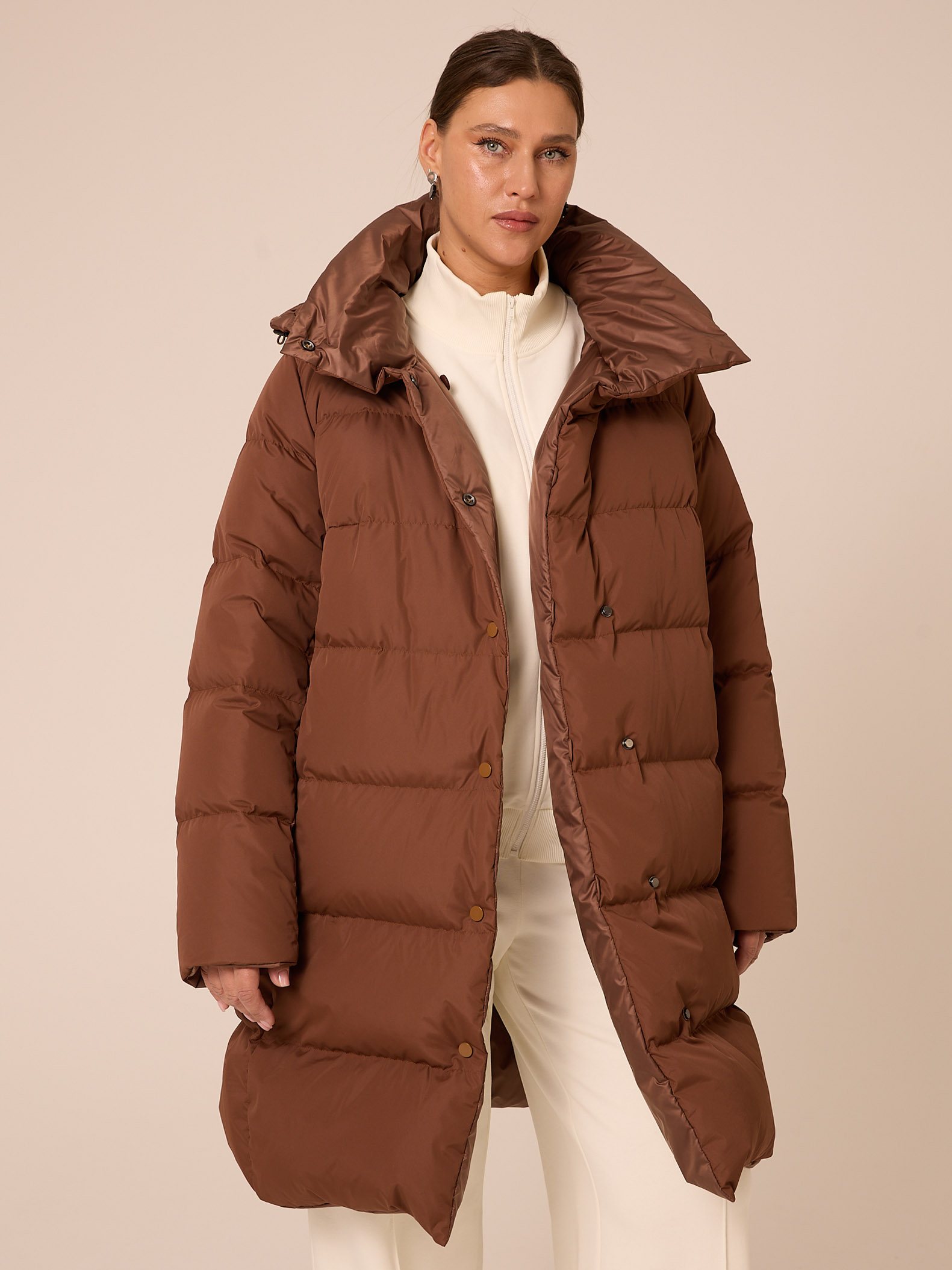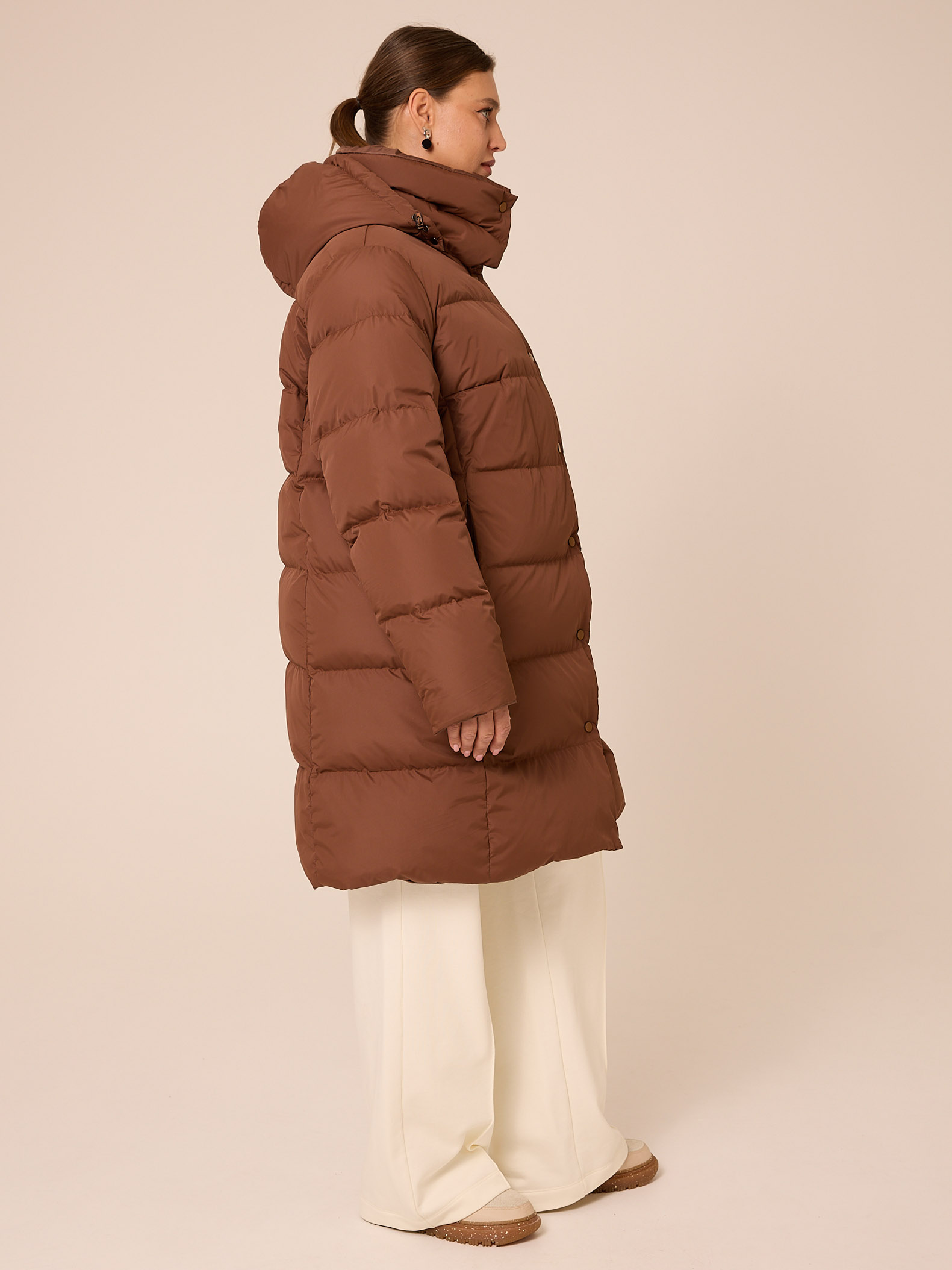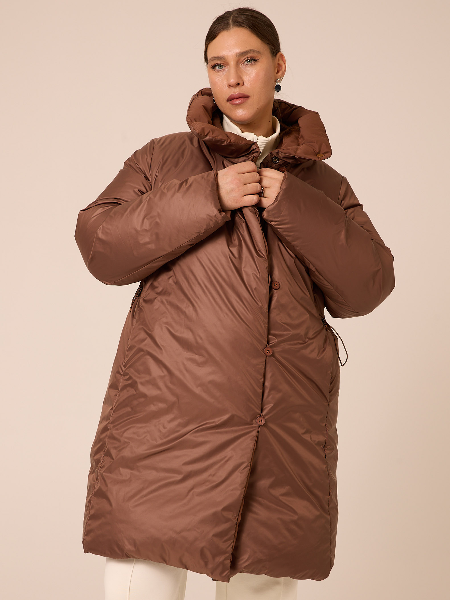 Пуховое двустороннее пальто, слегка расширенного к низу силуэта. Воротник – высокая стойка. Капюшон съемный, пристегивается на кнопки. Рукава втачные, двухшовные. Карманы выполнены в рельефах. Нагрудная вытачка обеспечит хорошую посадку. С одной стороны выполнена кулиска на талии с регулируемой резинкой. Застегивается пальто на кнопки с одной стороны и на петли/пуговицы с другой. Изделие выполнено из курточных тканей с водоотталкивающей пропиткой. Для пальто использовали два вида тканей: матовая и с деликатным глянцем. Выполнено в черном и коричневом цветах.
