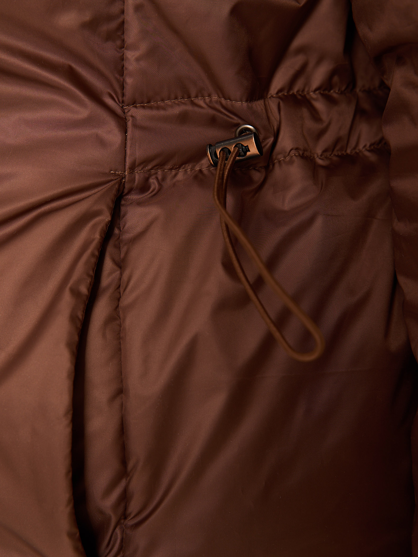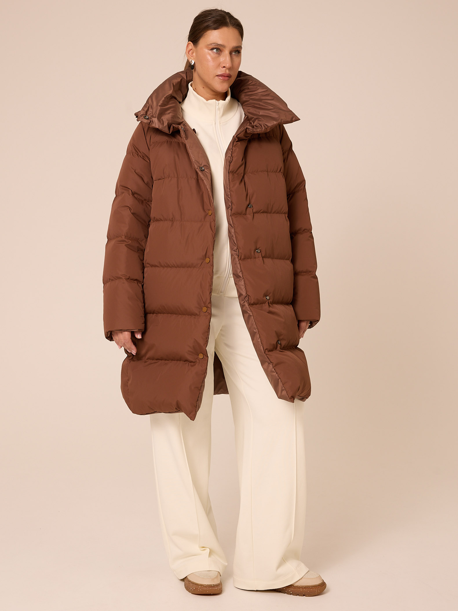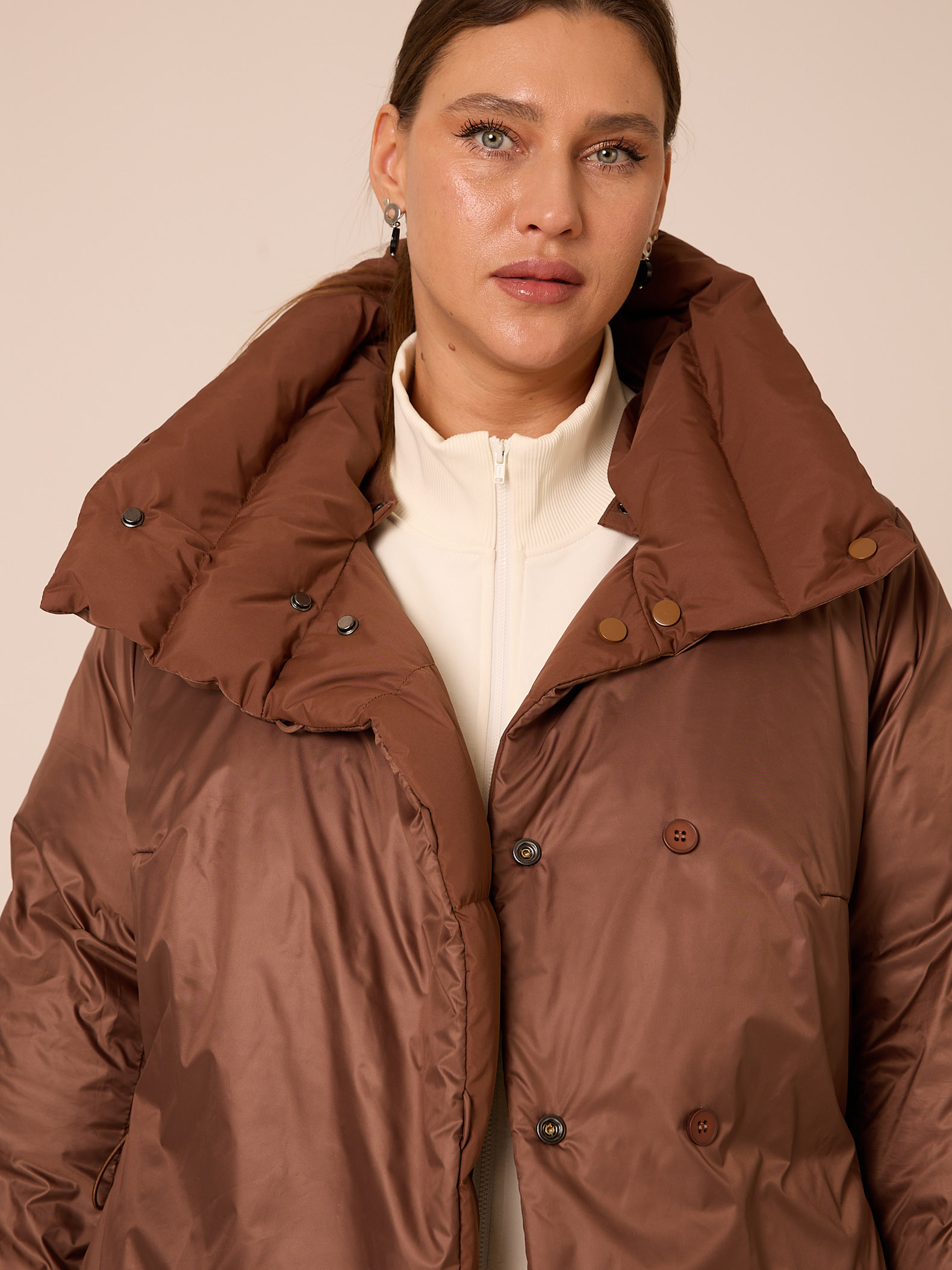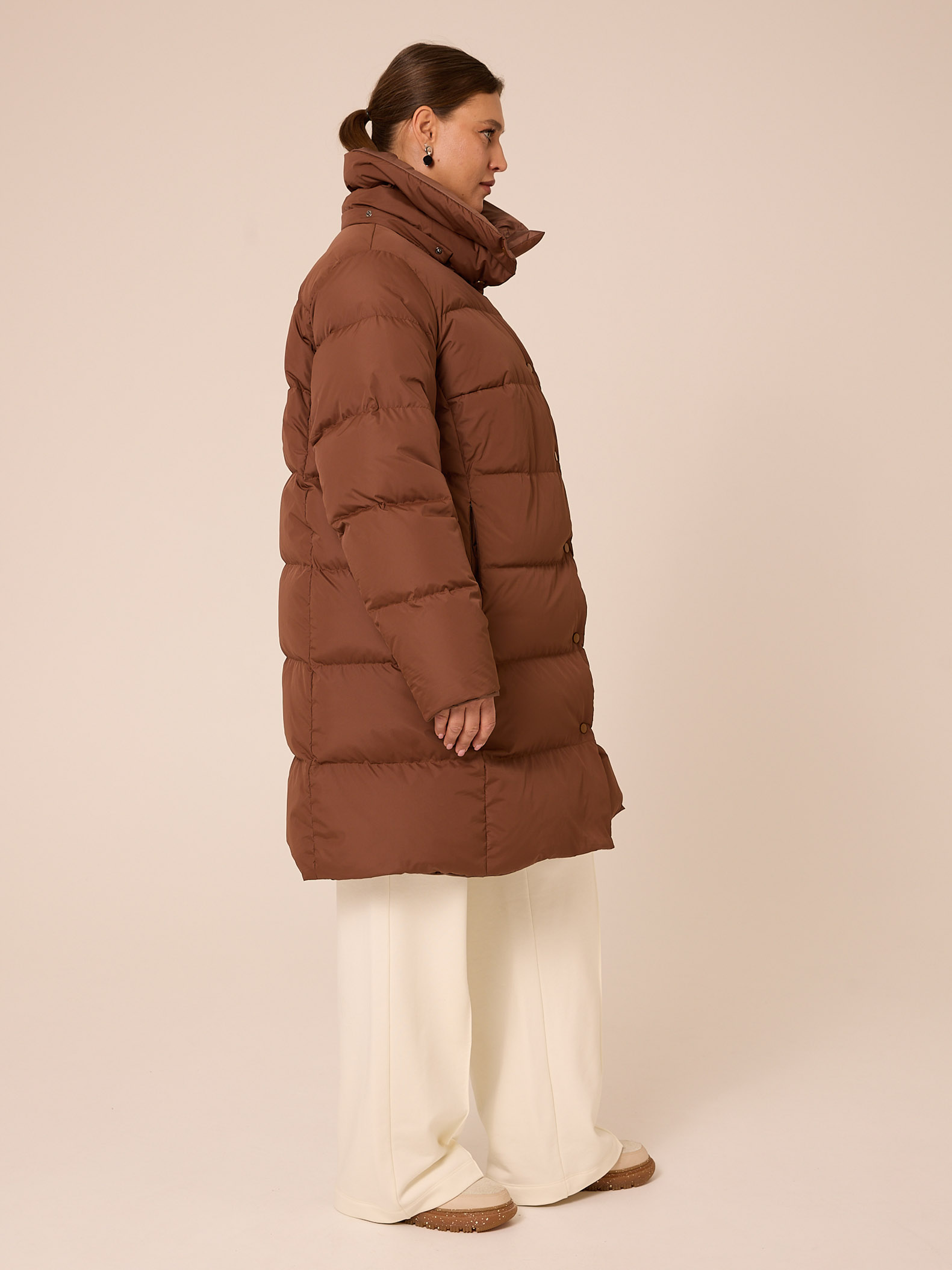 Пуховое двустороннее пальто, слегка расширенного к низу силуэта. Воротник – высокая стойка. Капюшон съемный, пристегивается на кнопки. Рукава втачные, двухшовные. Карманы выполнены в рельефах. Нагрудная вытачка обеспечит хорошую посадку. С одной стороны выполнена кулиска на талии с регулируемой резинкой. Застегивается пальто на кнопки с одной стороны и на петли/пуговицы с другой. Изделие выполнено из курточных тканей с водоотталкивающей пропиткой. Для пальто использовали два вида тканей: матовая и с деликатным глянцем. Выполнено в черном и коричневом цветах.