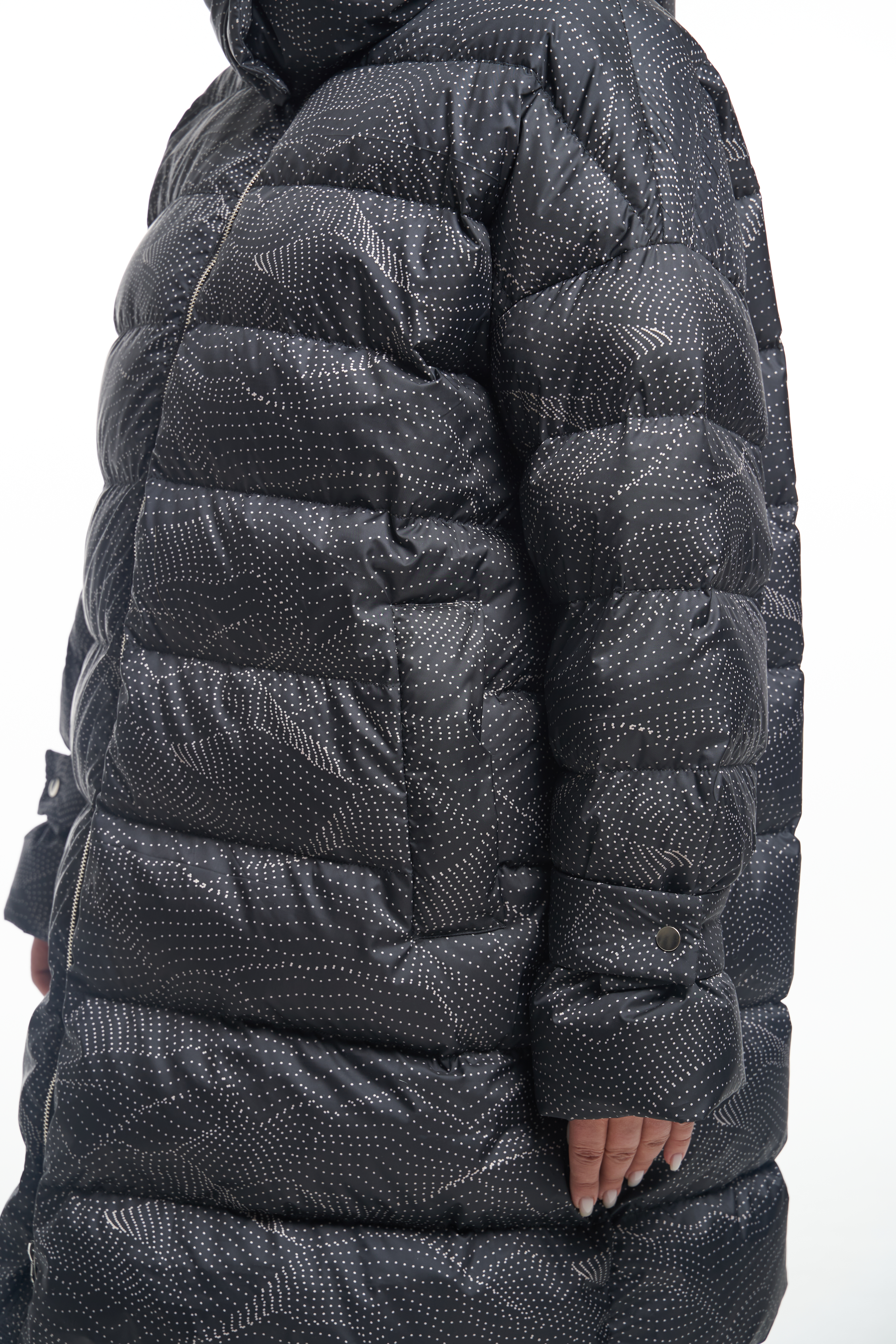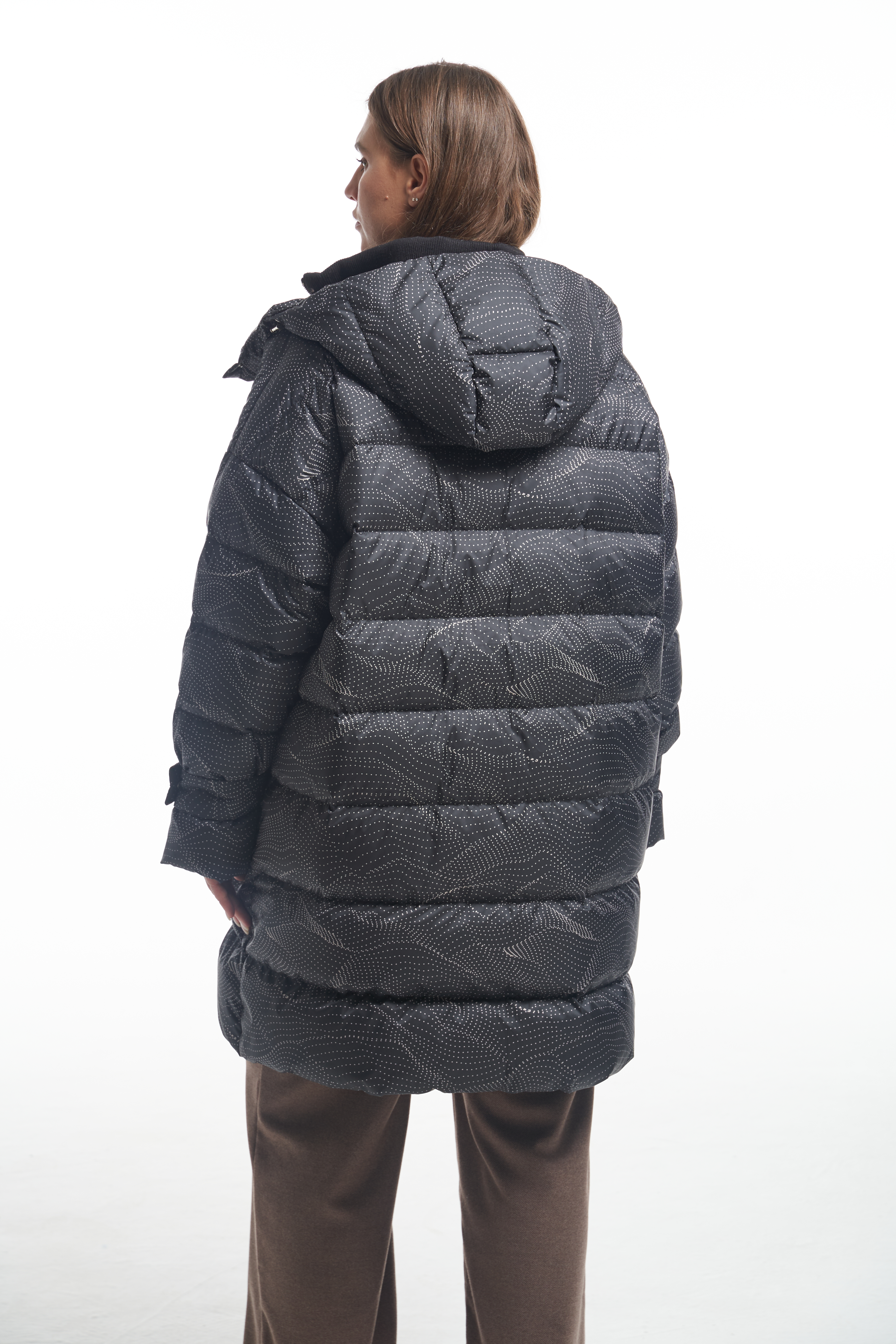 Удлиненная куртка А-образного силуэта со спущенным плечевым поясом. Особенностью данной модели является втачной капюшон вместе с трикотажным воротником. Боковые карманы прорезные с листочками. Рукава с регулируемыми, съемными патами. Куртка застегивается на металлическую молнию, капюшон и паты на декоративные кнопки. Длина изделия чуть выше колен. По низу изделия выполнена кулиска с регулируемой резинкой. Есть внутренний накладной карман на подкладке. При изготовлении применяется двухслойный пухпакет.