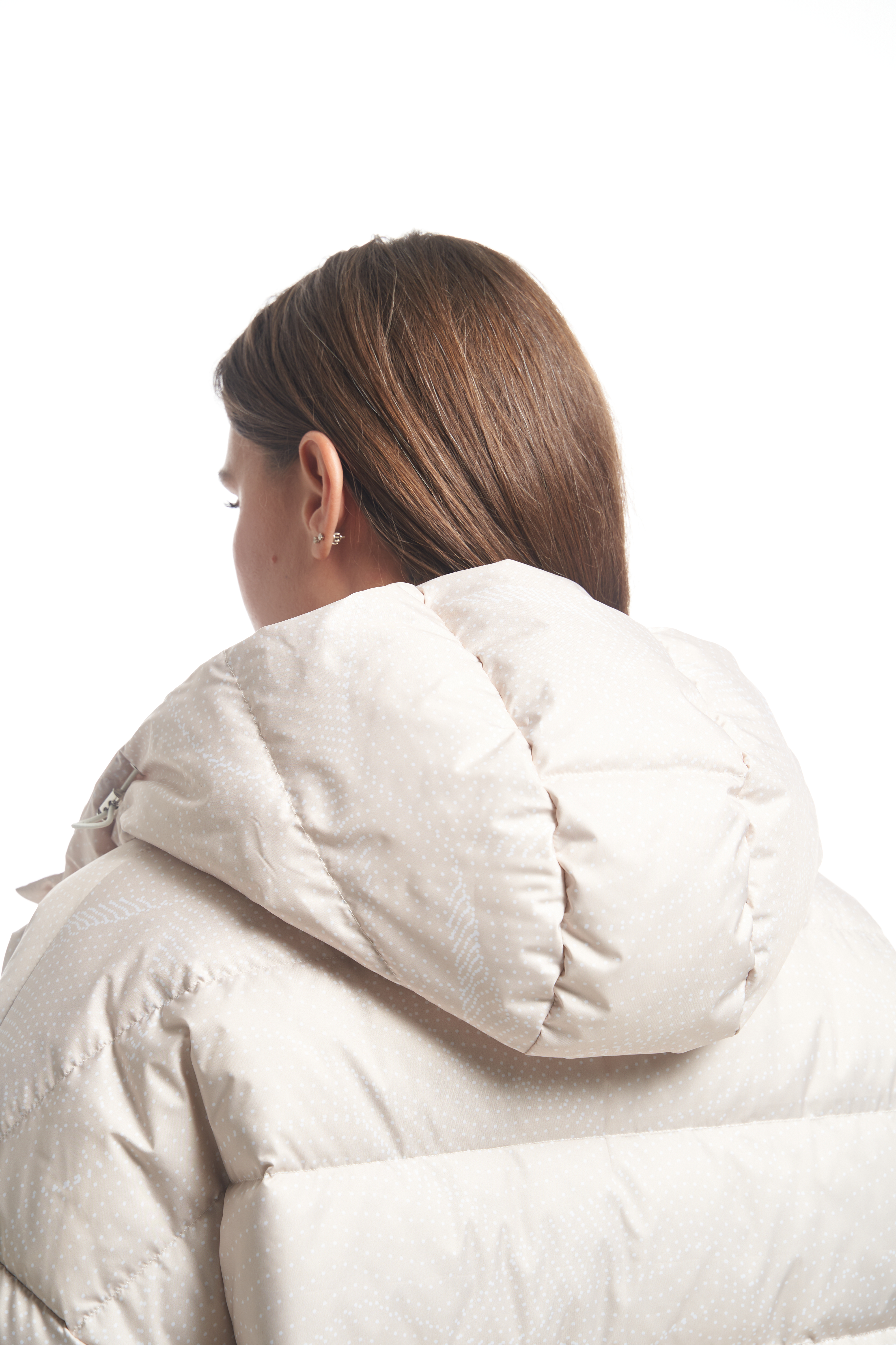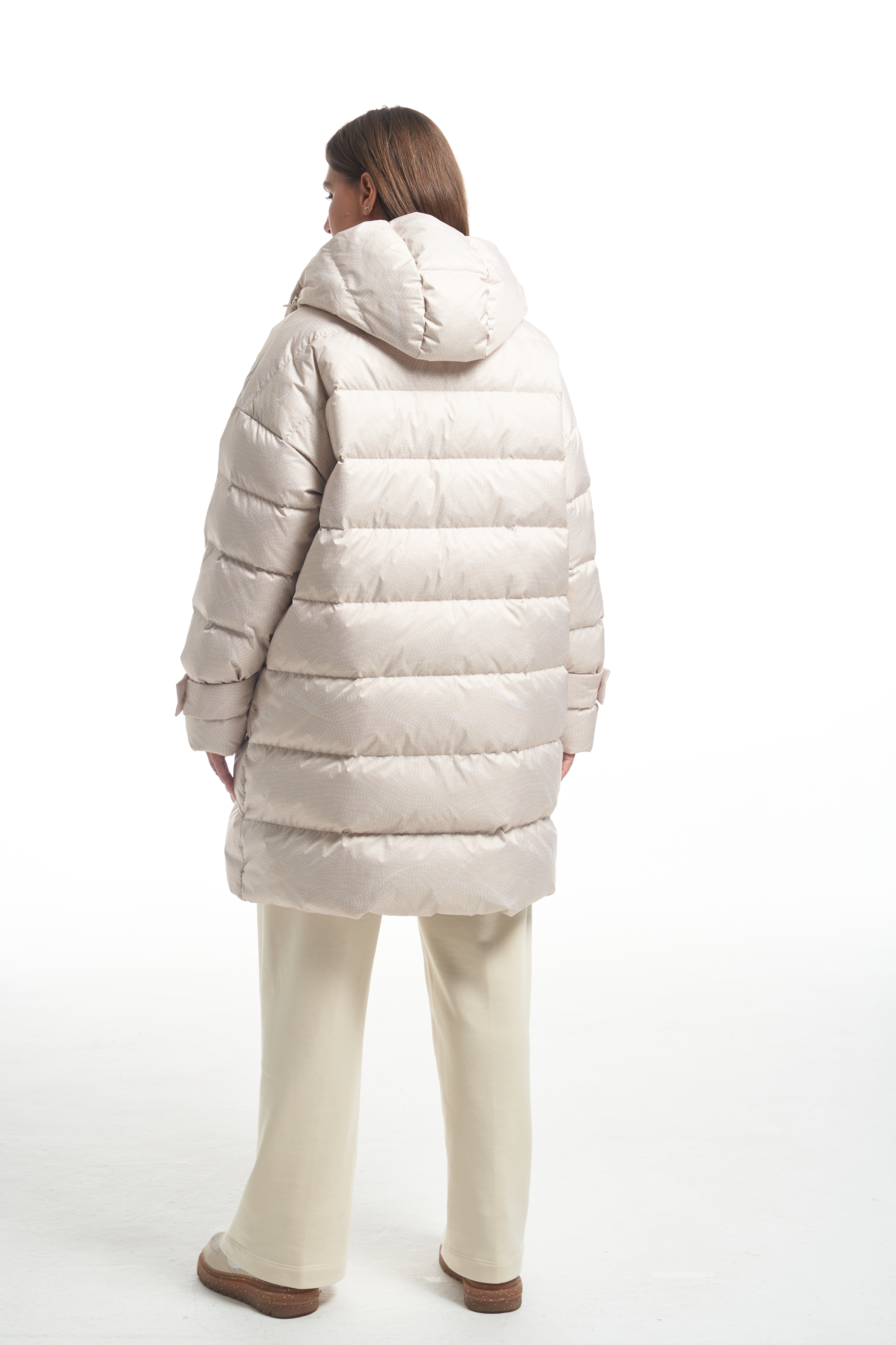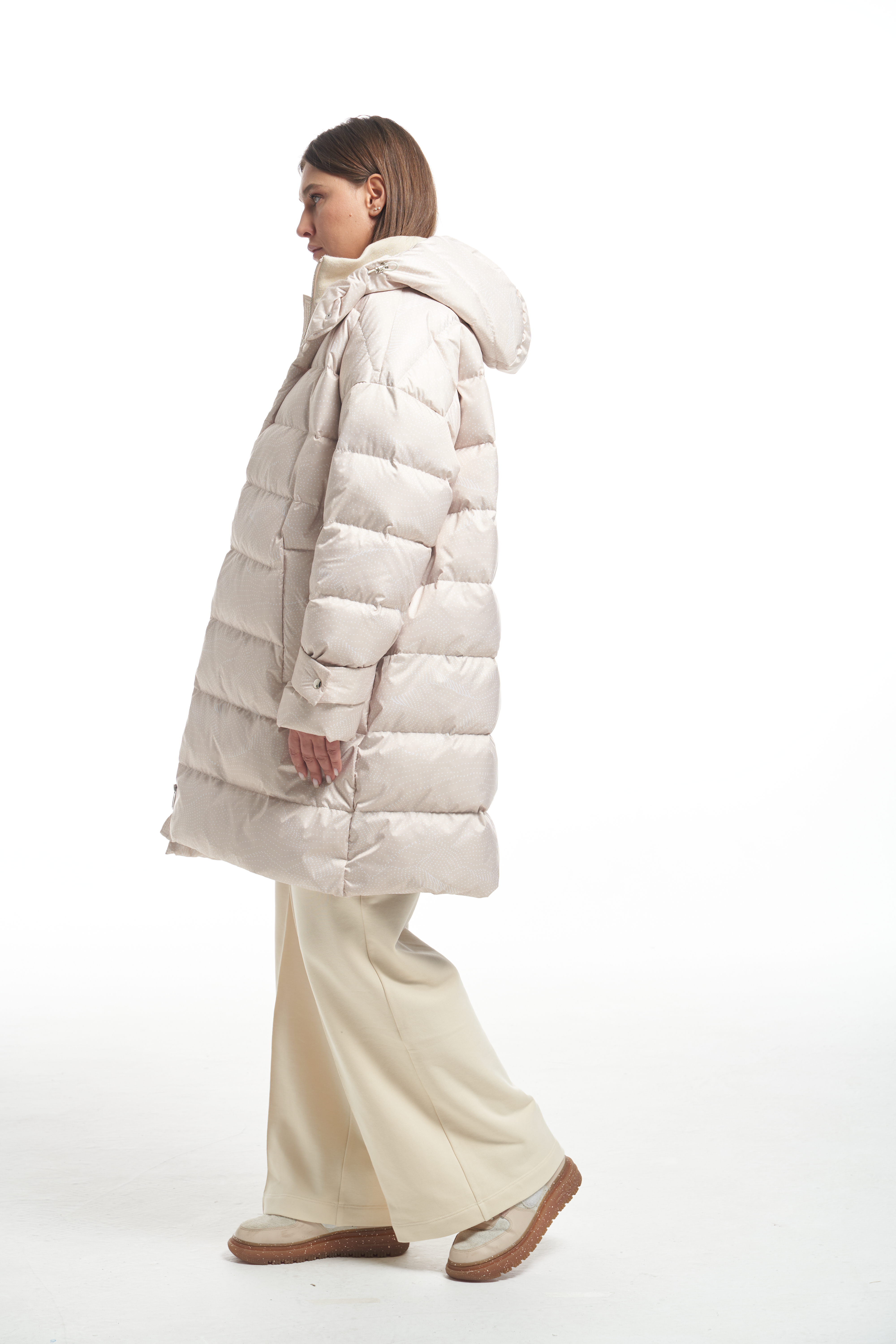 Удлиненная куртка А-образного силуэта со спущенным плечевым поясом. Особенностью данной модели является втачной капюшон вместе с трикотажным воротником. Боковые карманы прорезные с листочками. Рукава с регулируемыми, съемными патами. Куртка застегивается на металлическую молнию, капюшон и паты на декоративные кнопки. Длина изделия чуть выше колен. По низу изделия выполнена кулиска с регулируемой резинкой. Есть внутренний накладной карман на подкладке. При изготовлении применяется двухслойный пухпакет.