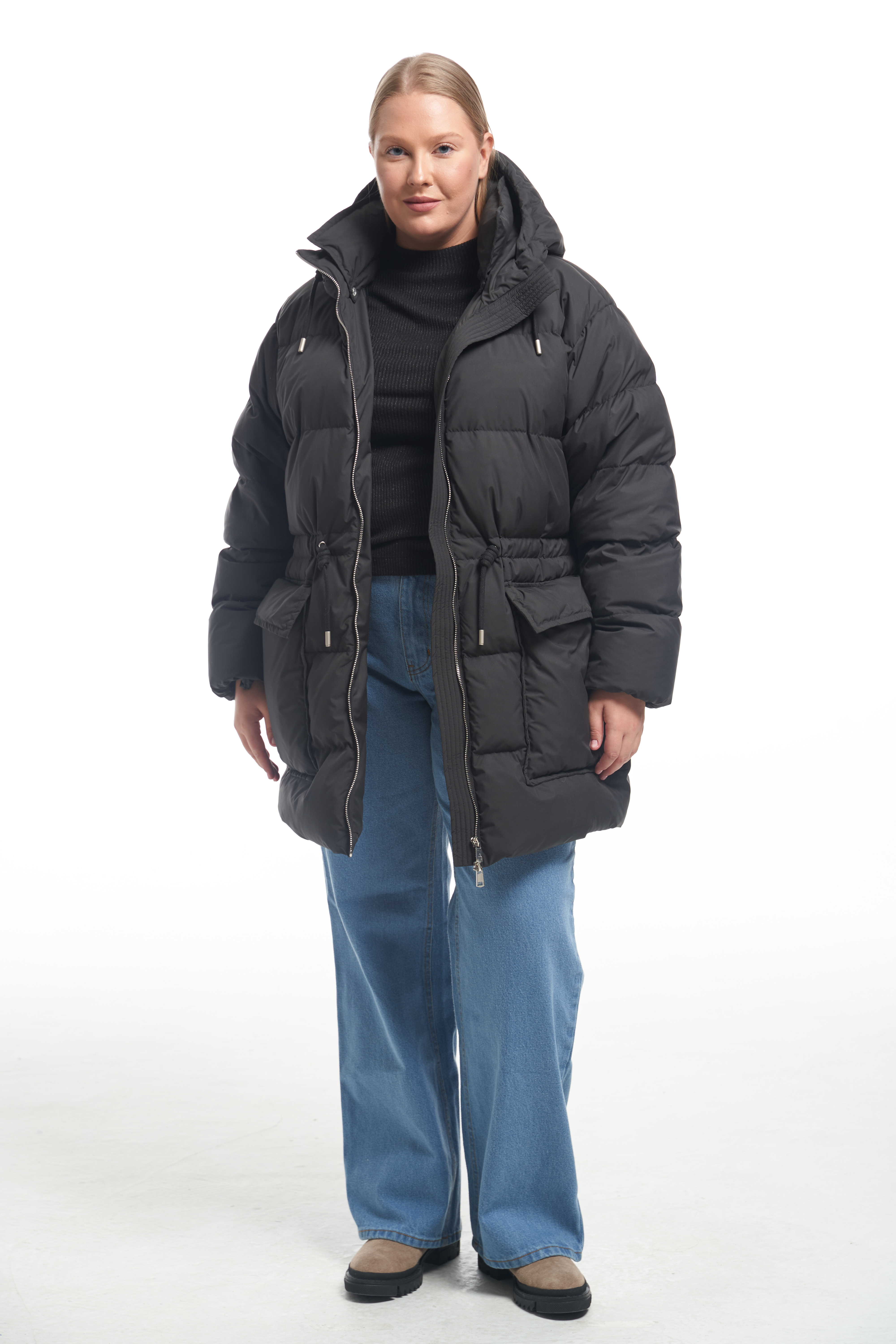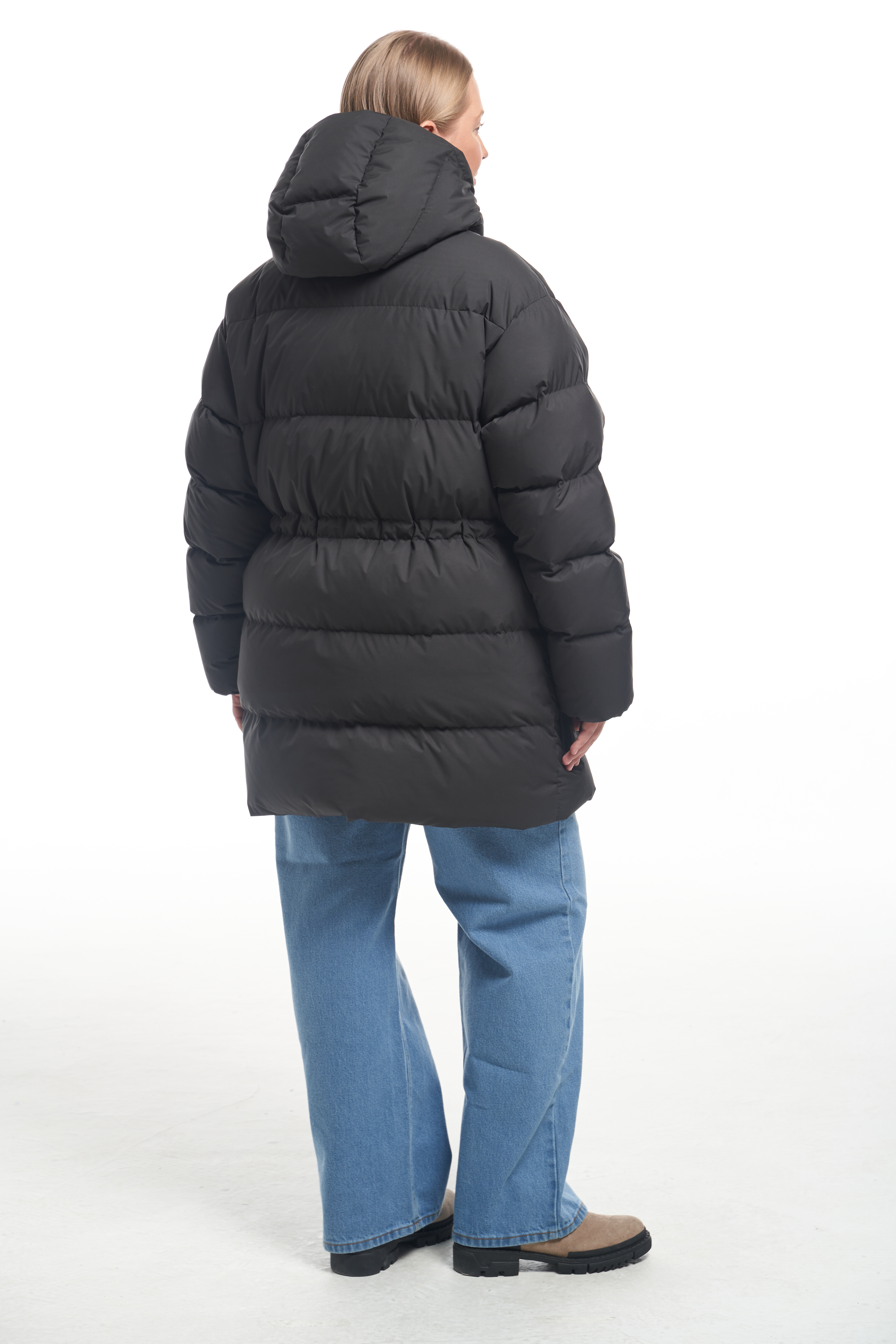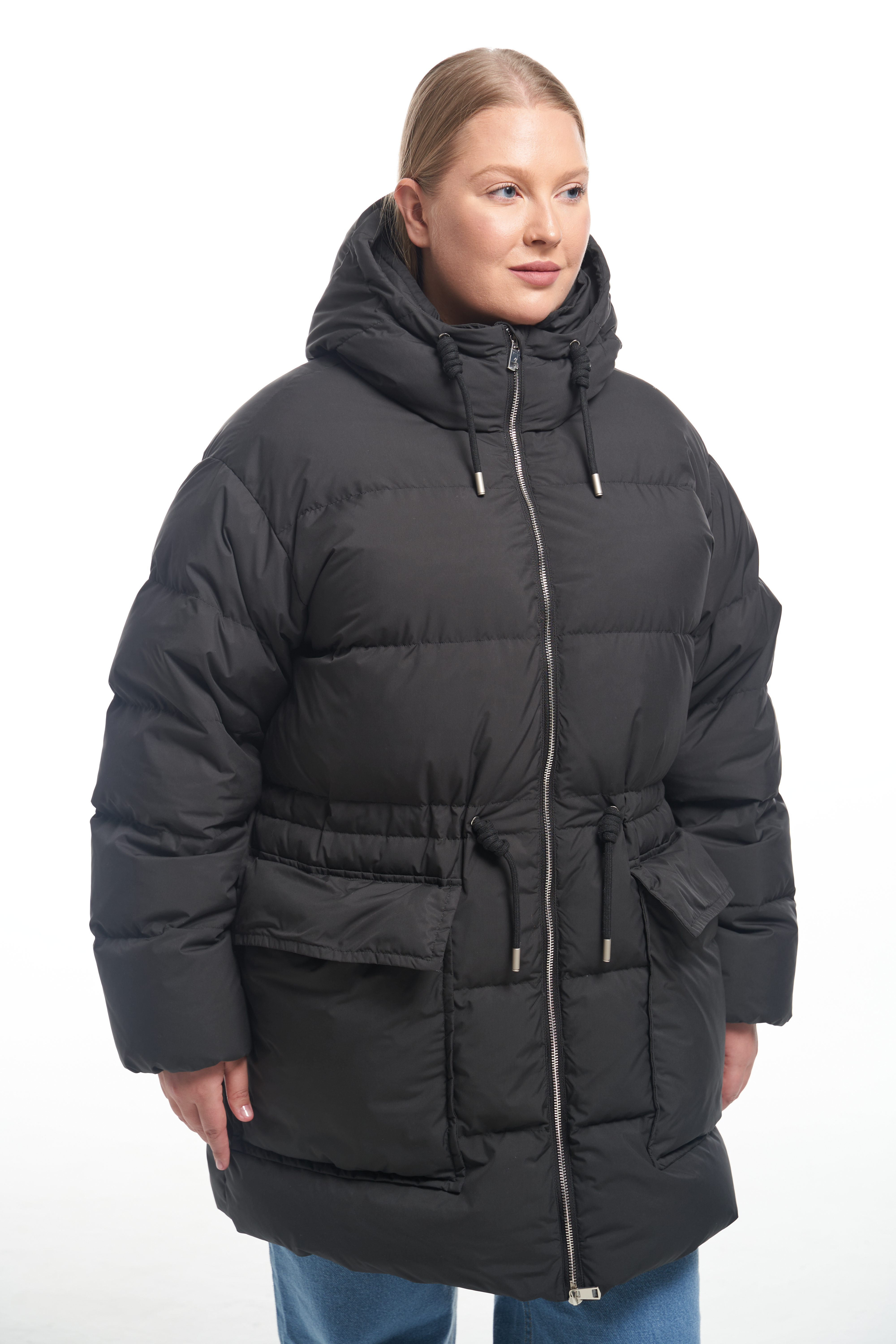 Куртка свободного прямого кроя с кулискойпо линии талии. Капюшон втачнойс кулиской. Особенность – съёмный воротник, который пристегивается внутри на пуговицы. Плечевой пояс спущенный. Низ рукавов собран на эластичную тесьму с внутренней стороны. Боковые карманы накладные с клапанами, прямоугольной формы. Есть внутренний накладной карман на подкладке. Куртка выполнена из плащевой ткани с водоотталкивающими свойствами. При изготовлении применяется двухслойный пухпакет.