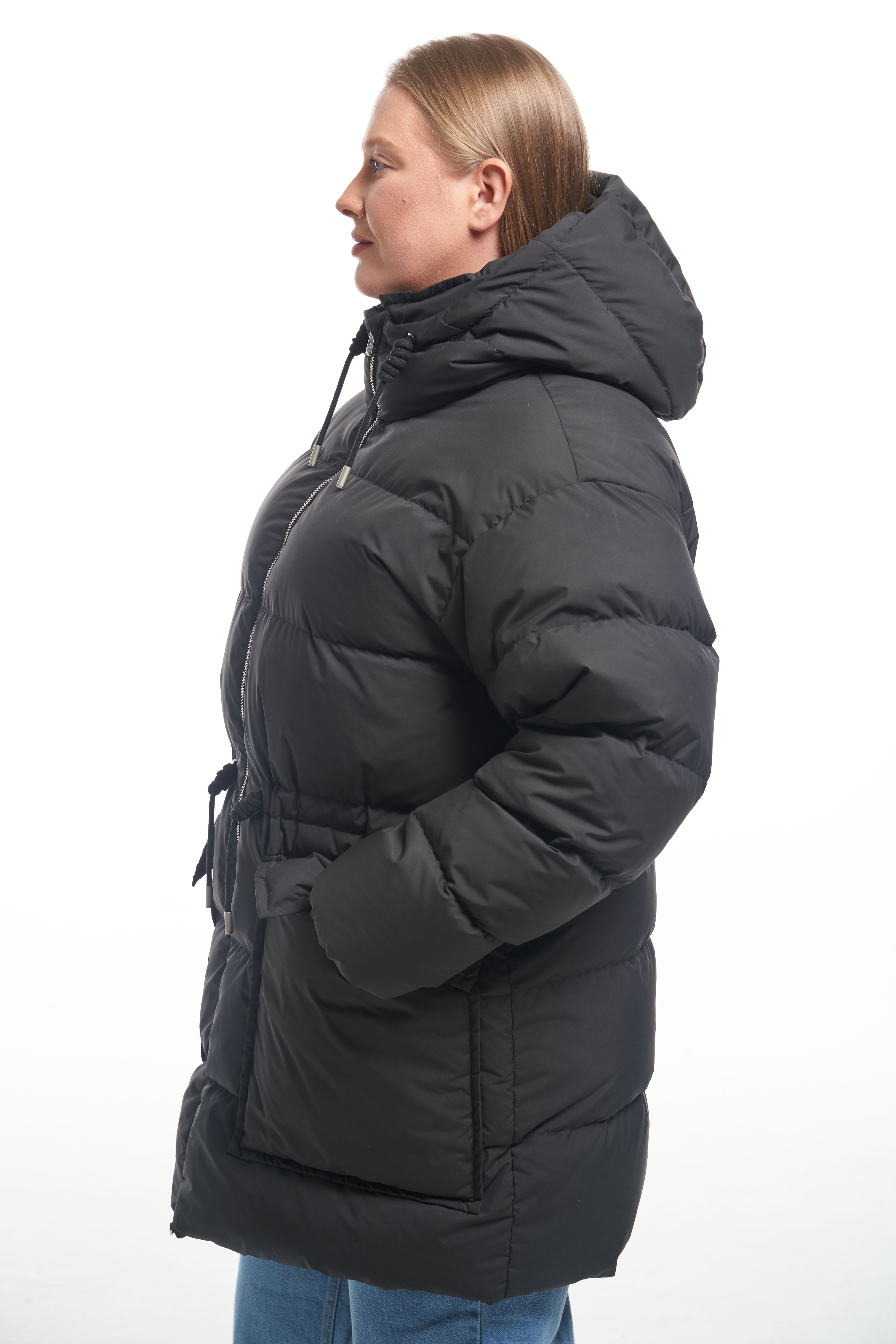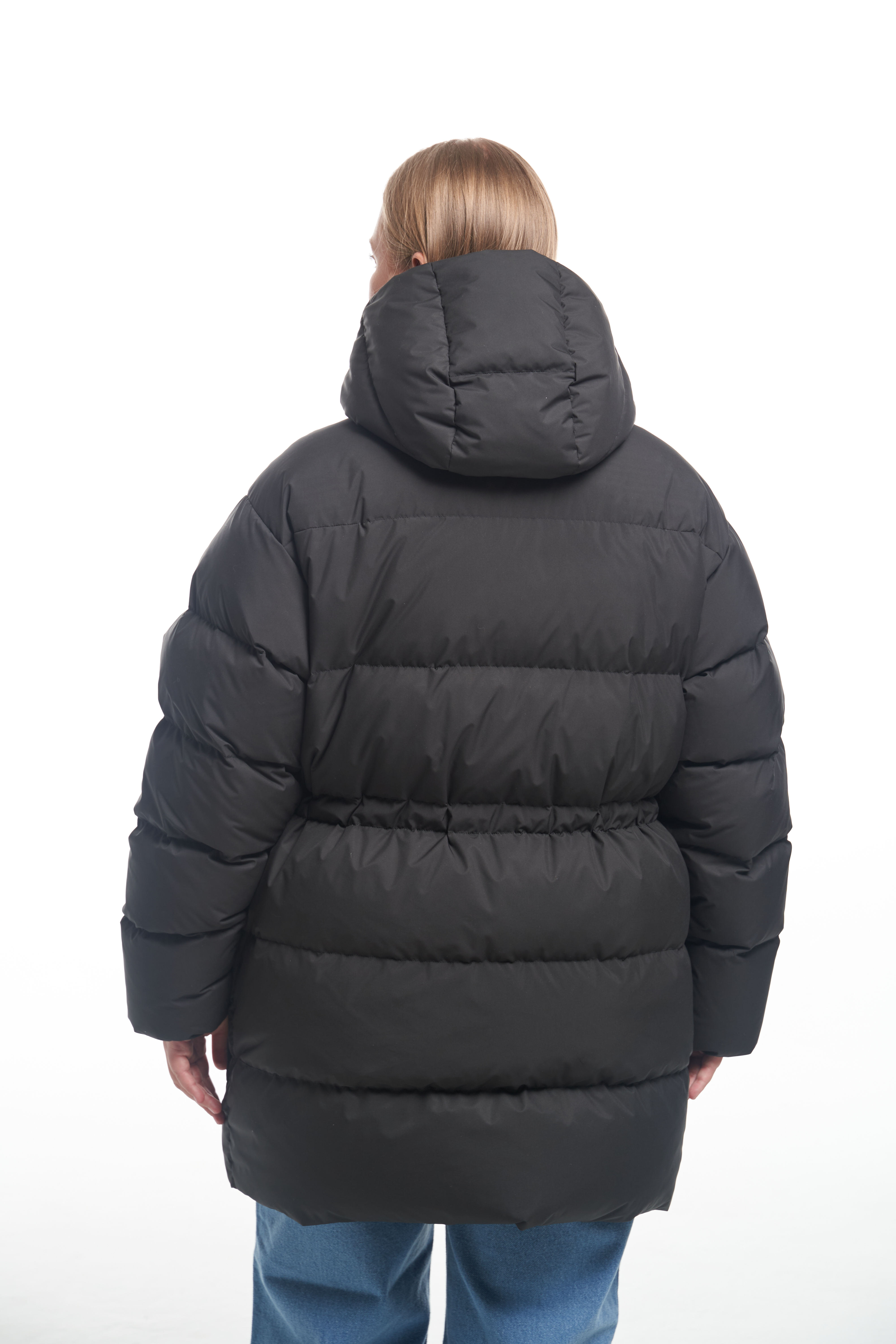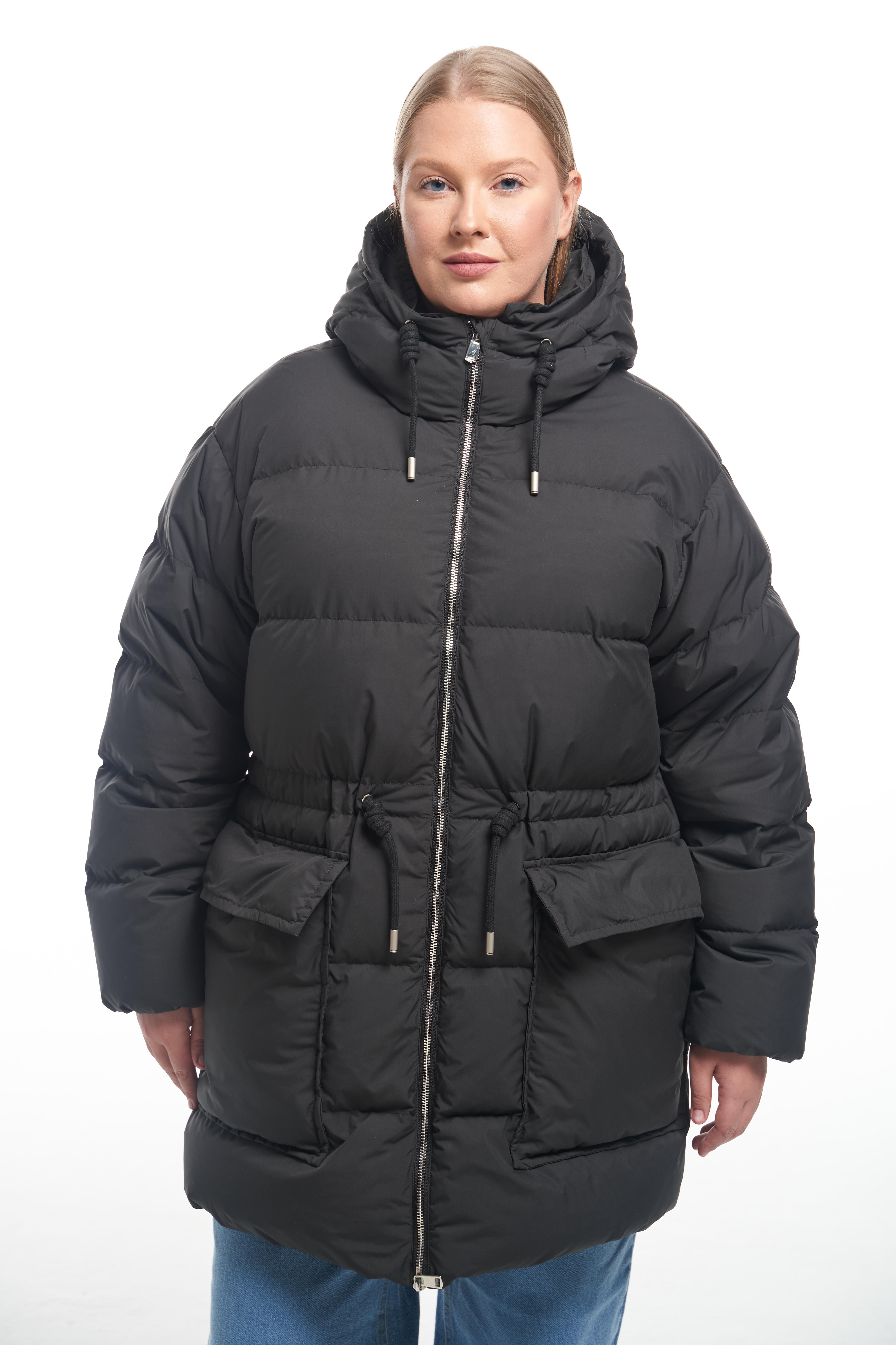 Куртка свободного прямого кроя с кулискойпо линии талии. Капюшон втачнойс кулиской. Особенность – съёмный воротник, который пристегивается внутри на пуговицы. Плечевой пояс спущенный. Низ рукавов собран на эластичную тесьму с внутренней стороны. Боковые карманы накладные с клапанами, прямоугольной формы. Есть внутренний накладной карман на подкладке. Куртка выполнена из плащевой ткани с водоотталкивающими свойствами. При изготовлении применяется двухслойный пухпакет.