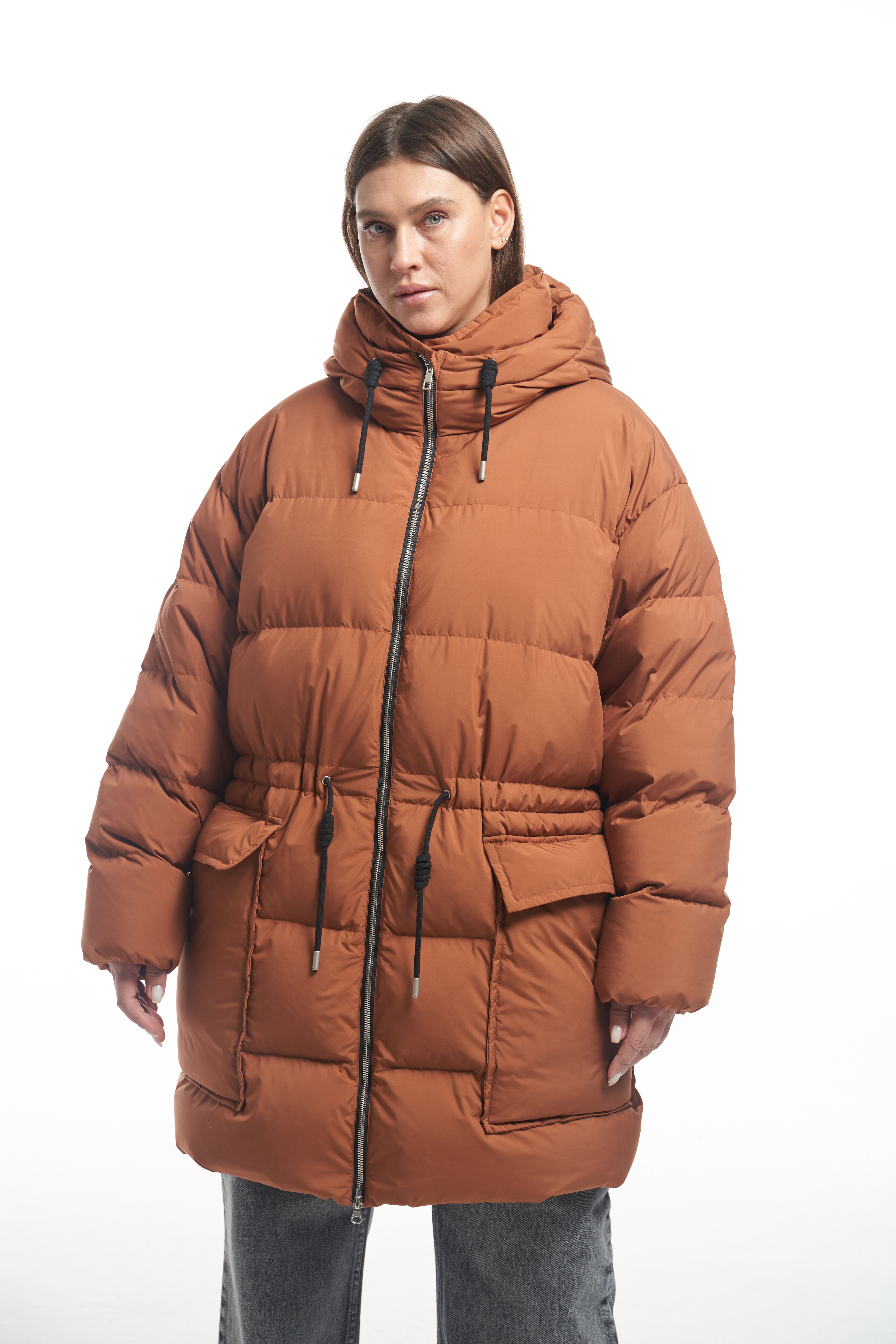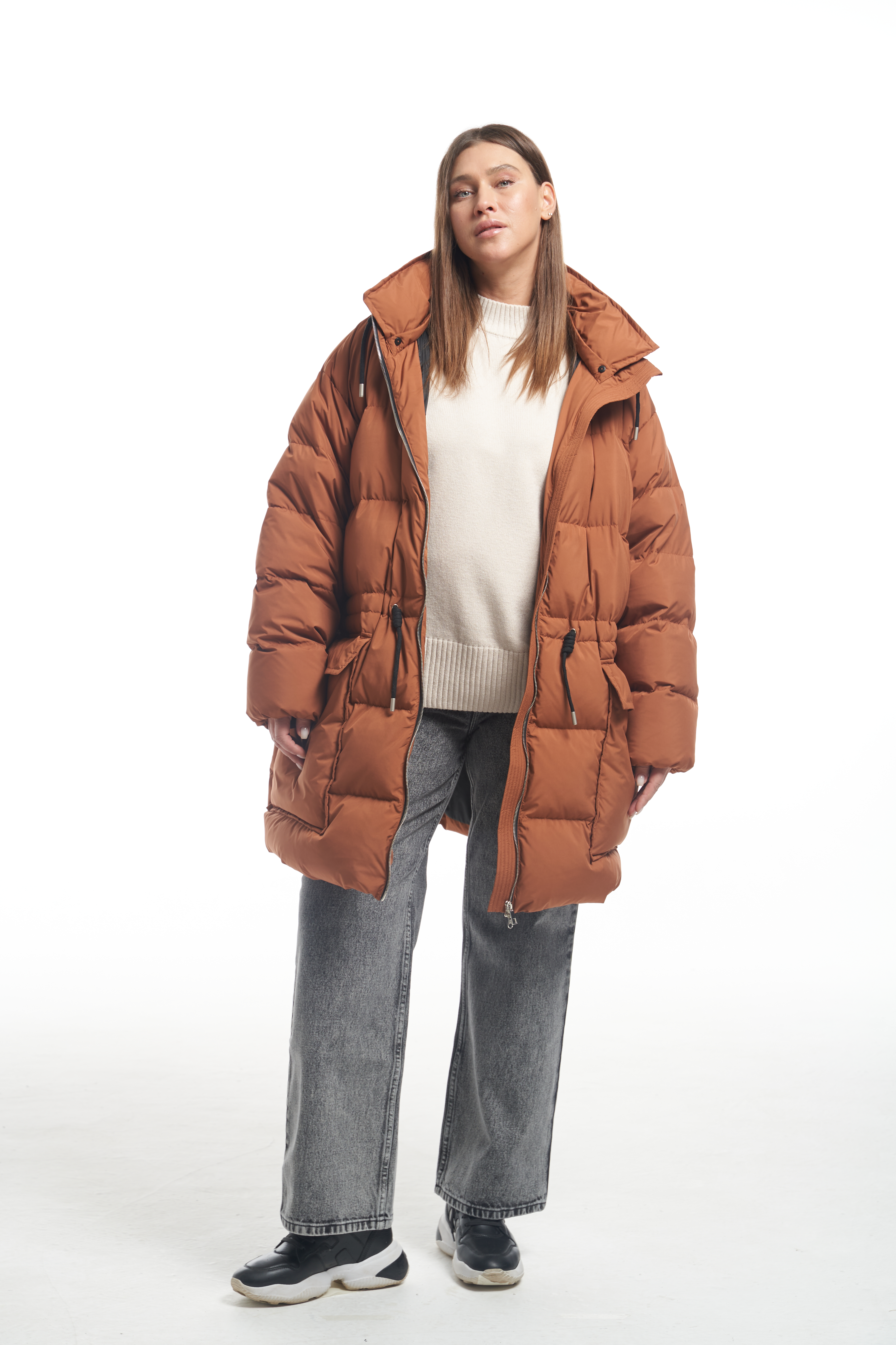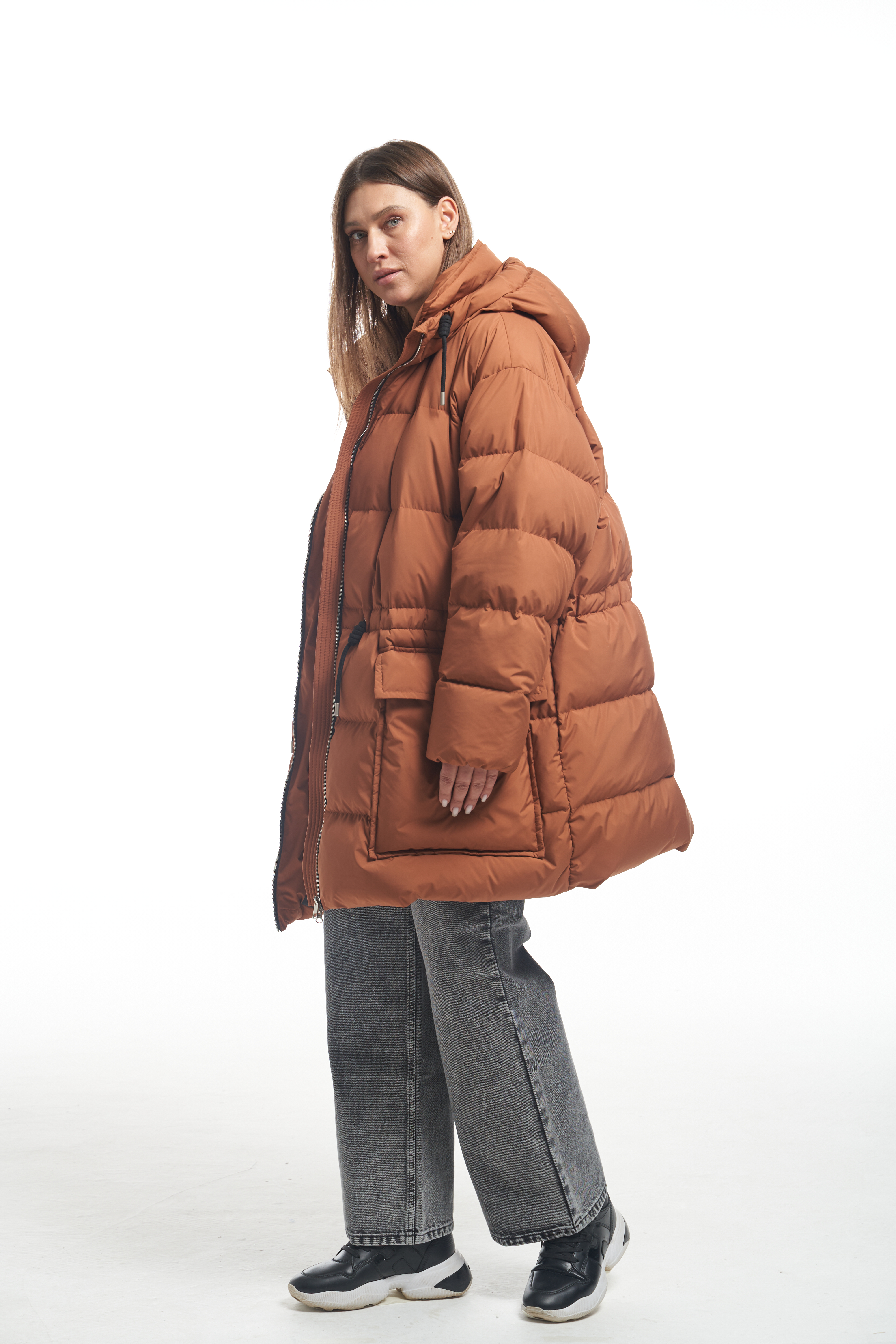 Куртка свободного прямого кроя с кулискойпо линии талии. Капюшон втачнойс кулиской. Особенность – съёмный воротник, который пристегивается внутри на пуговицы. Плечевой пояс спущенный. Низ рукавов собран на эластичную тесьму с внутренней стороны. Боковые карманы накладные с клапанами, прямоугольной формы. Есть внутренний накладной карман на подкладке. Куртка выполнена из плащевой ткани с водоотталкивающими свойствами. При изготовлении применяется двухслойный пухпакет.