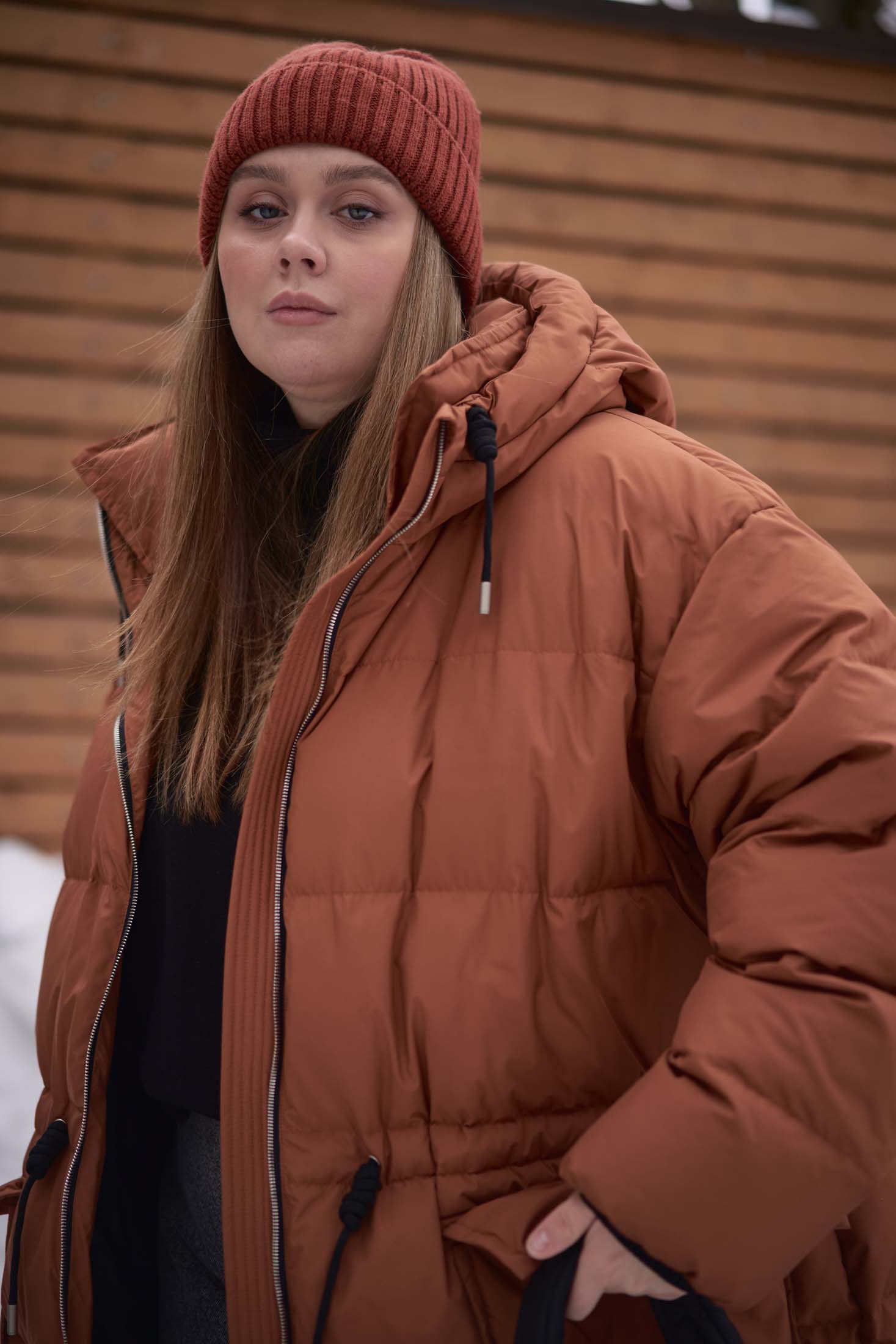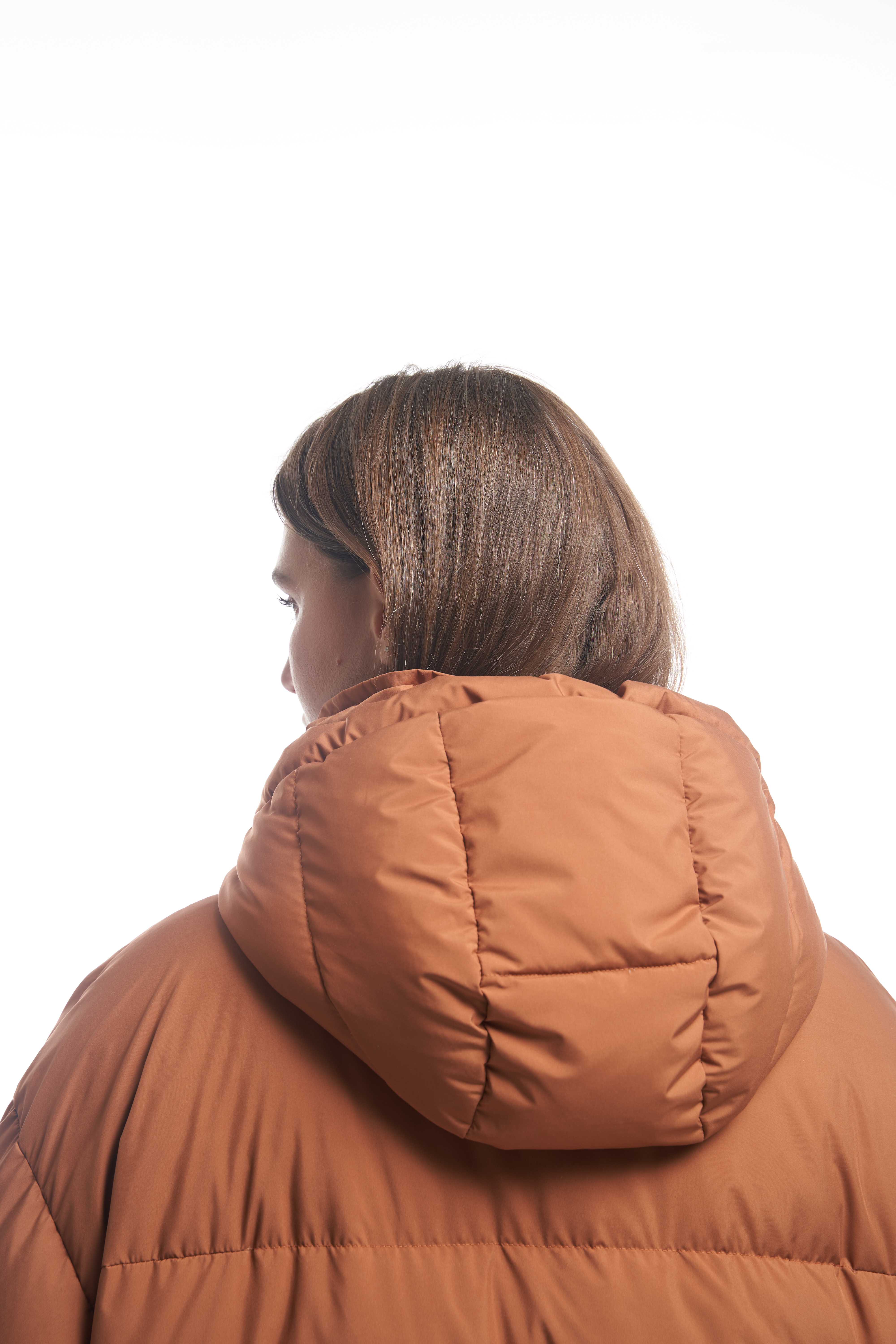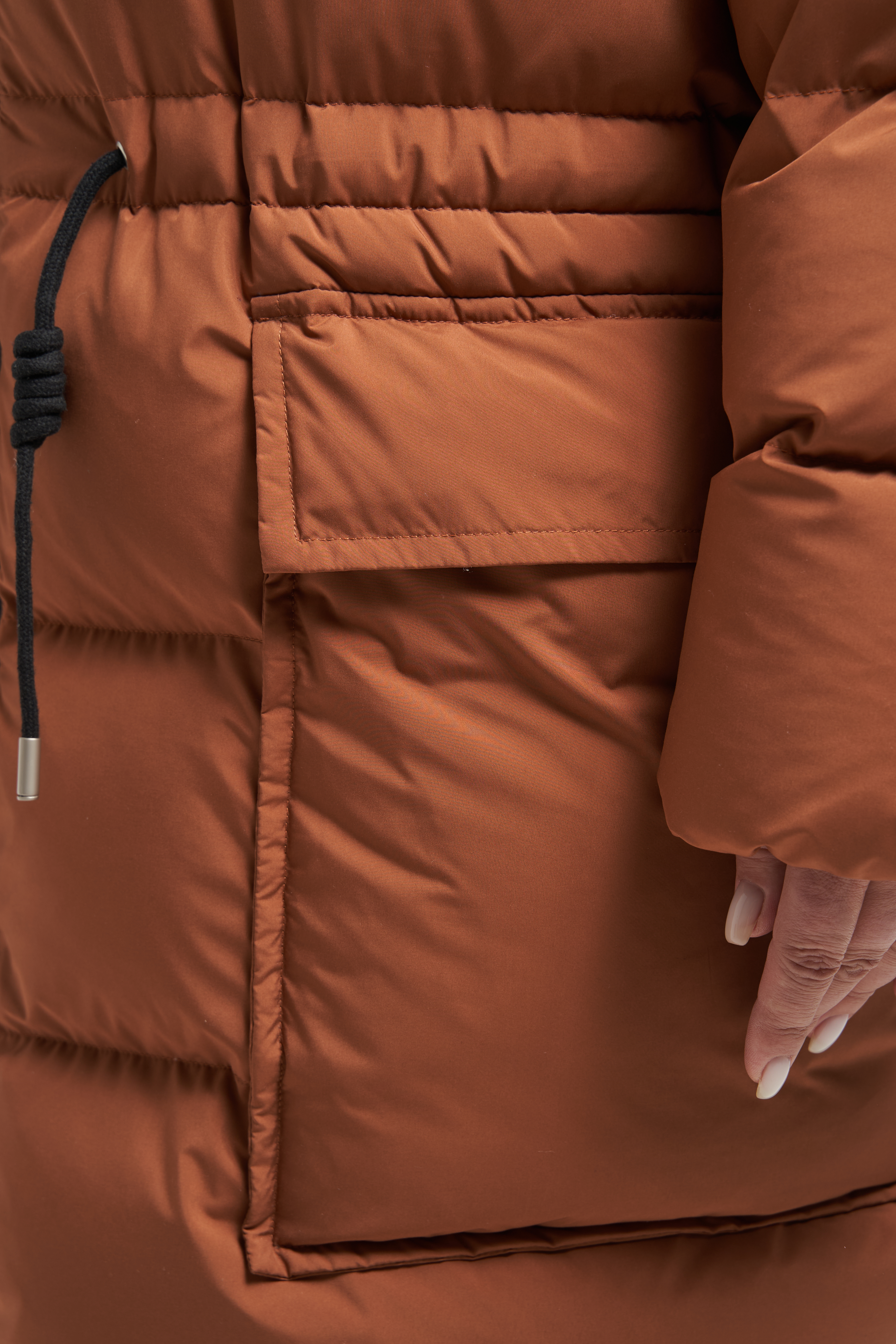 Куртка свободного прямого кроя с кулискойпо линии талии. Капюшон втачнойс кулиской. Особенность – съёмный воротник, который пристегивается внутри на пуговицы. Плечевой пояс спущенный. Низ рукавов собран на эластичную тесьму с внутренней стороны. Боковые карманы накладные с клапанами, прямоугольной формы. Есть внутренний накладной карман на подкладке. Куртка выполнена из плащевой ткани с водоотталкивающими свойствами. При изготовлении применяется двухслойный пухпакет.