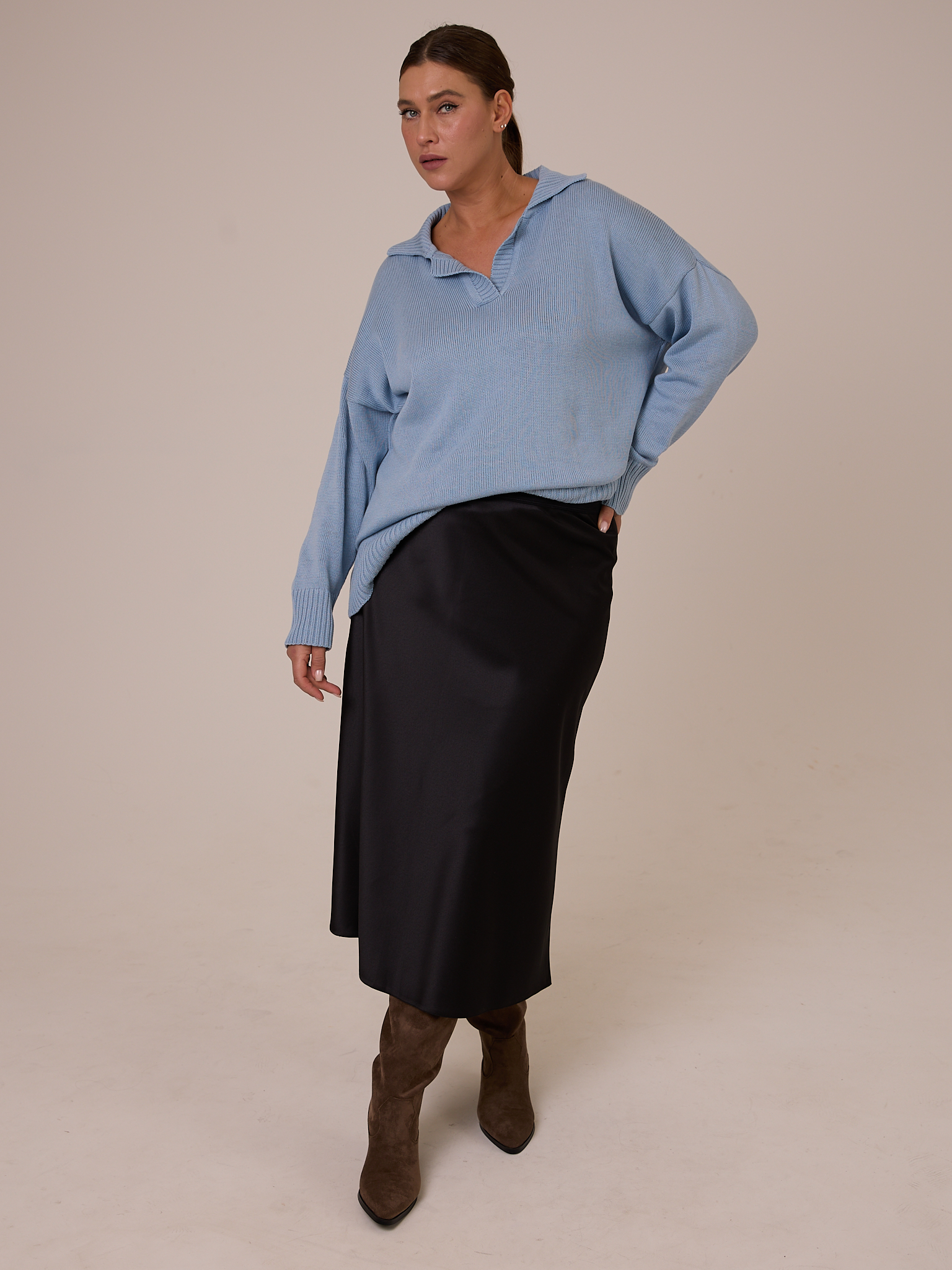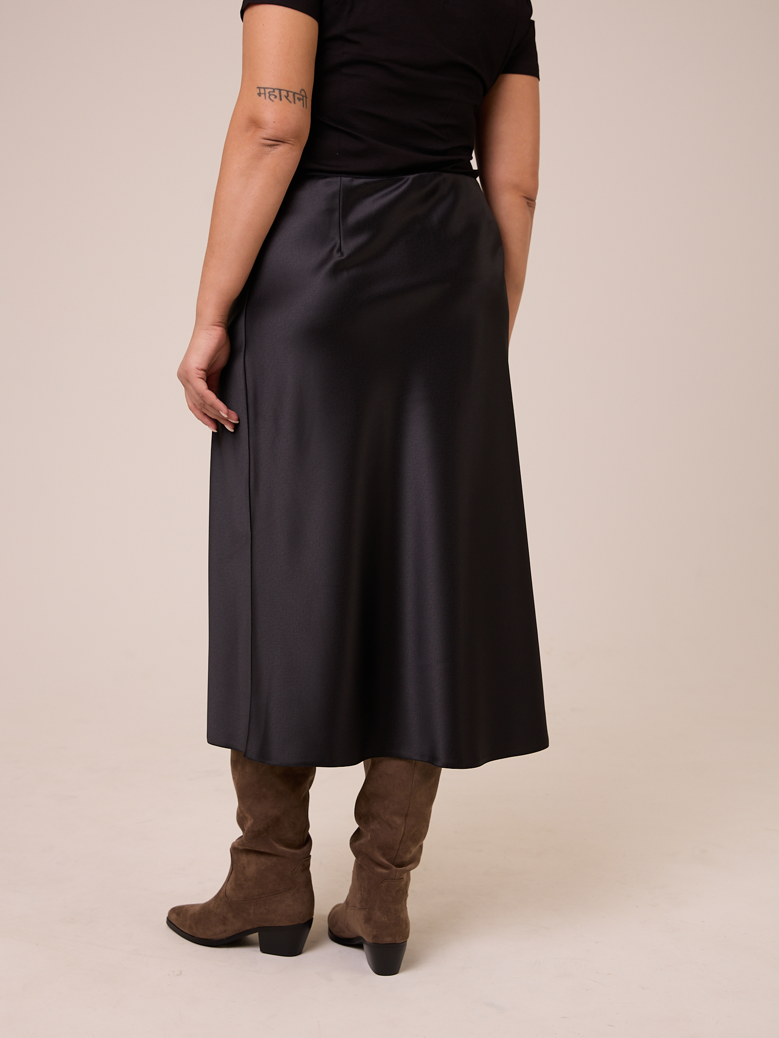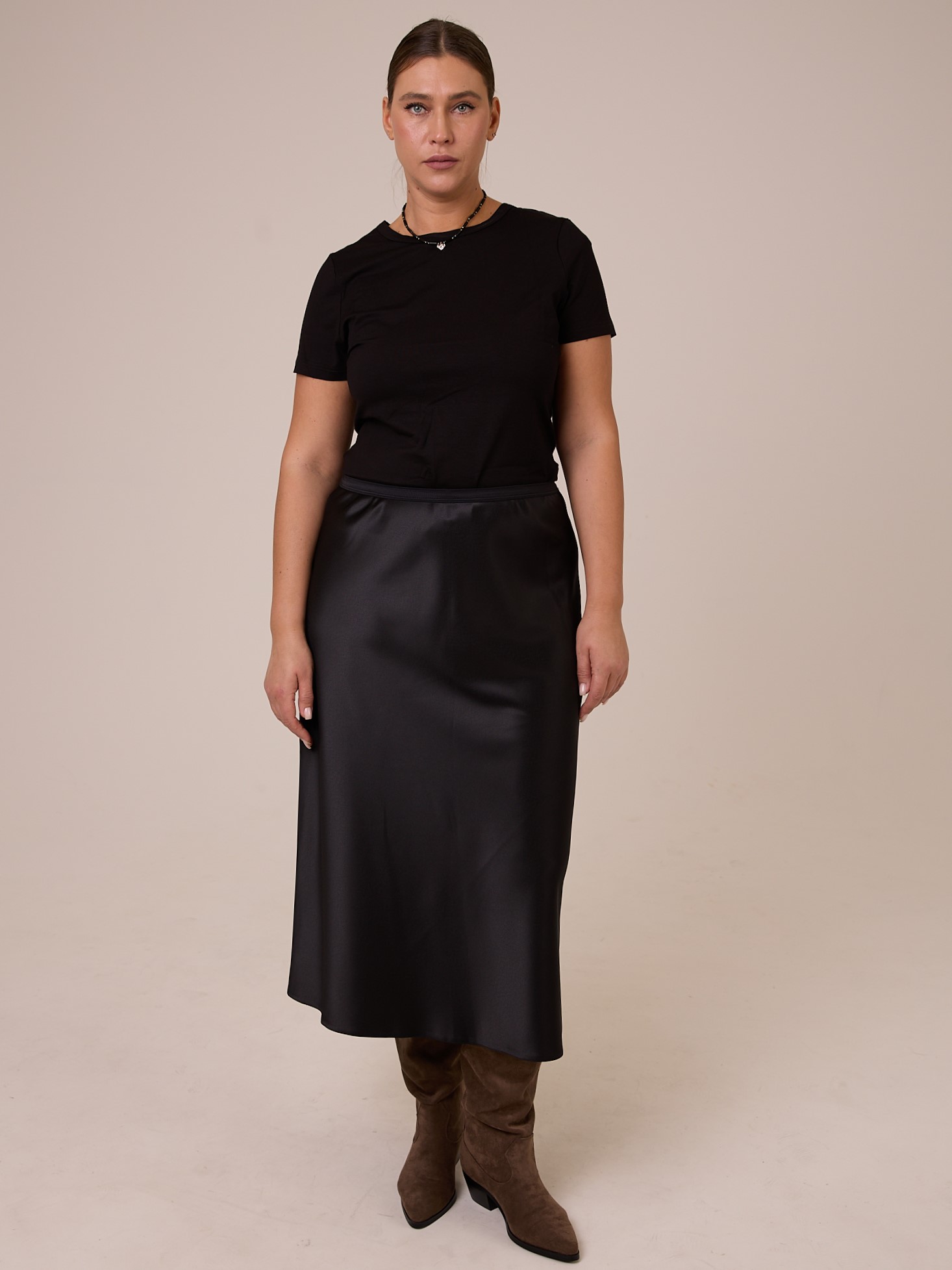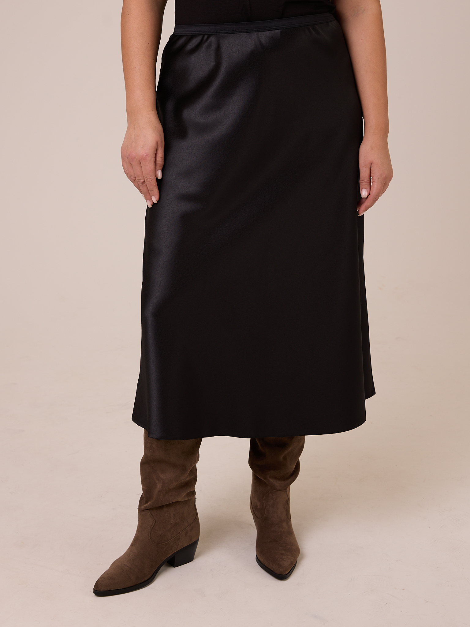 Юбка по «косой», длиной миди. Полуприлегающая в области бедер, умеренно расклешенная книзу. Пояс выполнен из эластичной тесьмы. Изделие выполнено из струящегося плотного вискозного атласа в черном цвете