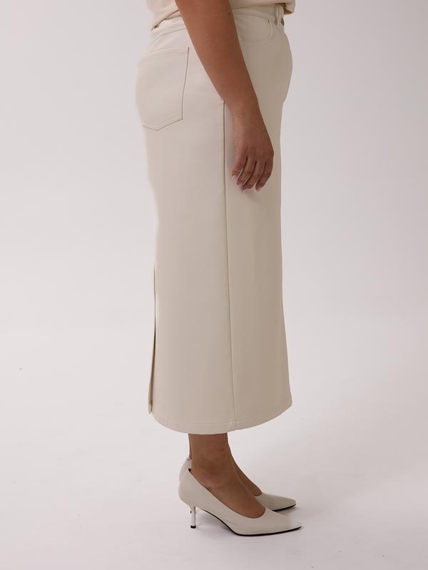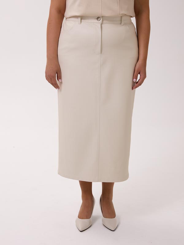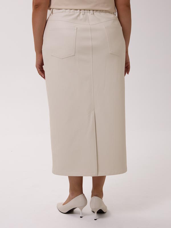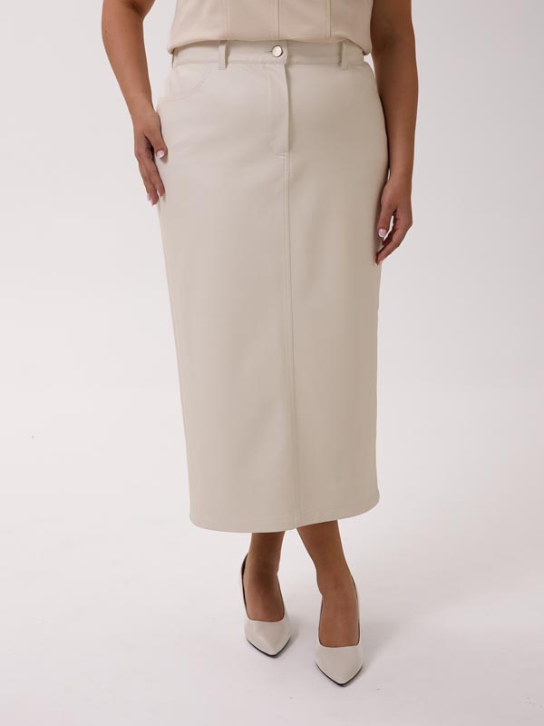 Юбка «карандаш» длиной макси со шлицей сзади. Посадка стандартная. Боковые карманы закругленные, задние карманы -накладные пятиугольные. Пояс частично ( по спинке) выполнен с эластичной тесьмой внутри. Есть шлевки для ремня. Юбка застегивается на металлическую молнию и болт. Модель выполнена из искусственной кожи в двух вариантах: золотом и серебряном.