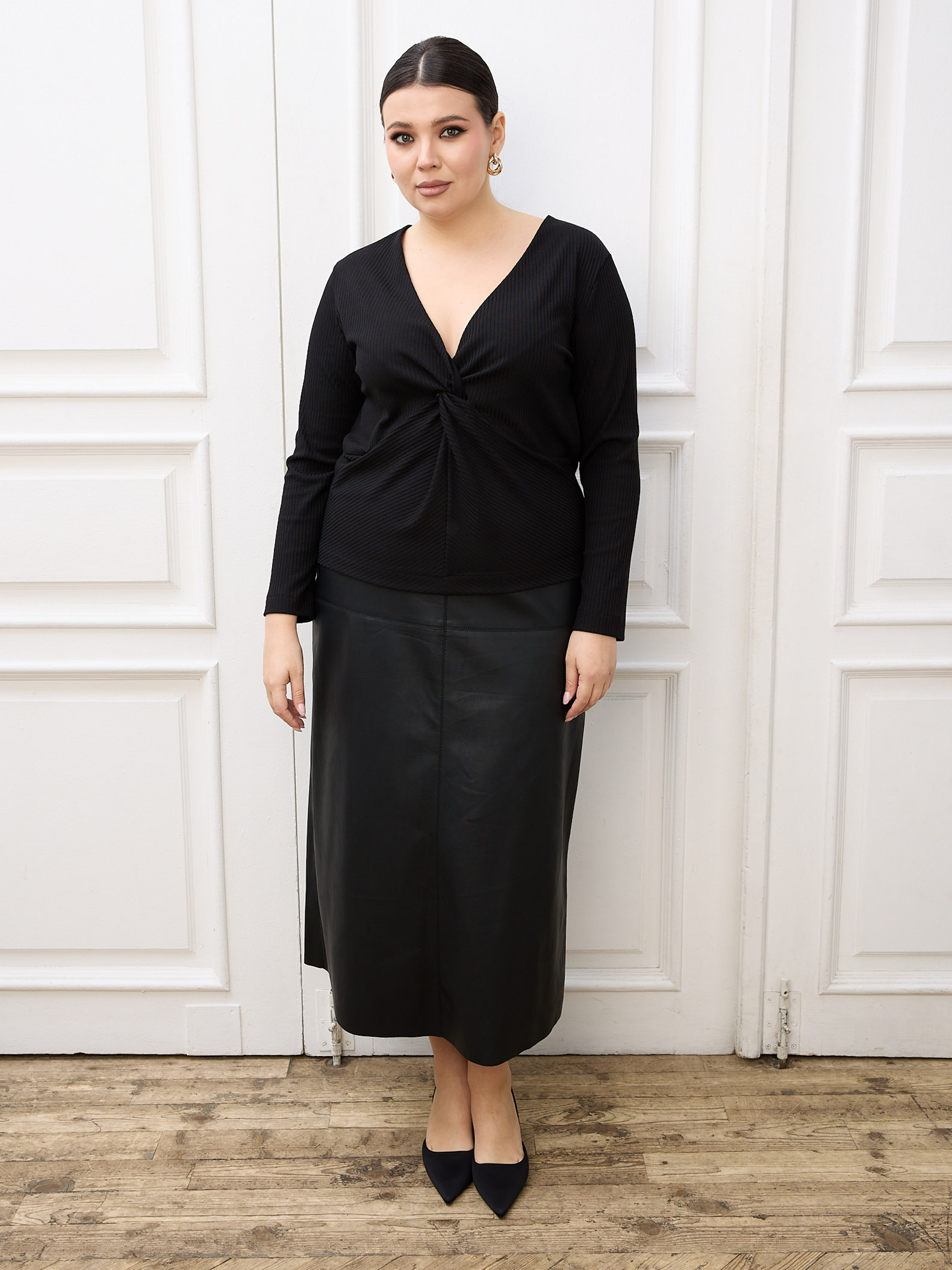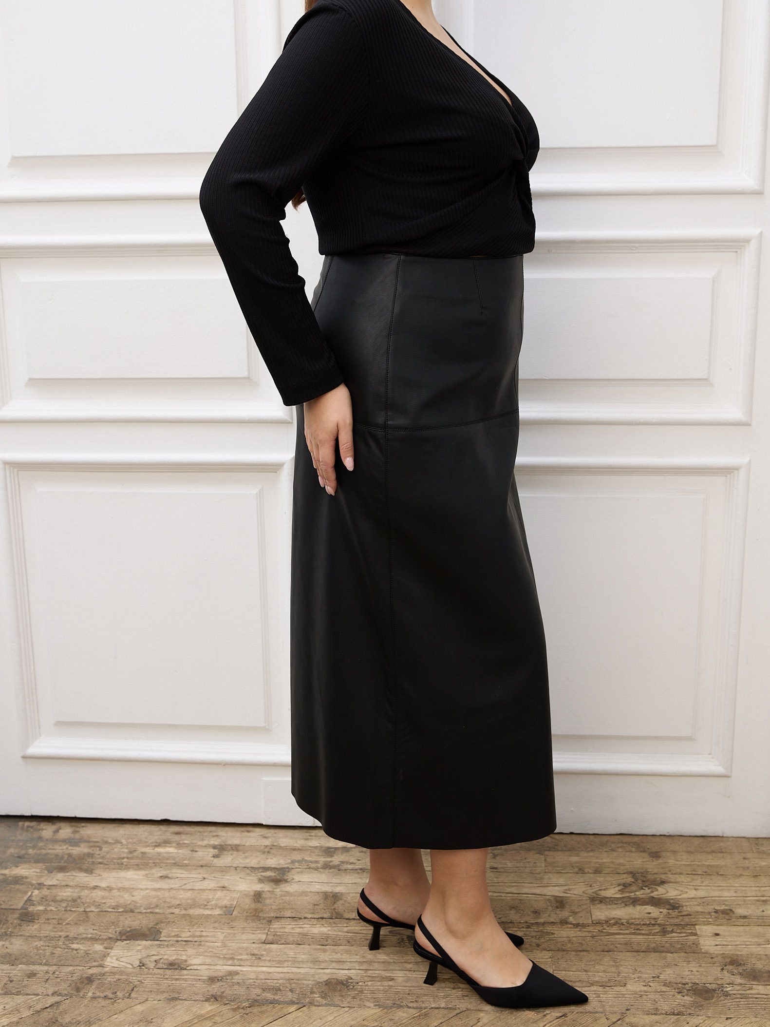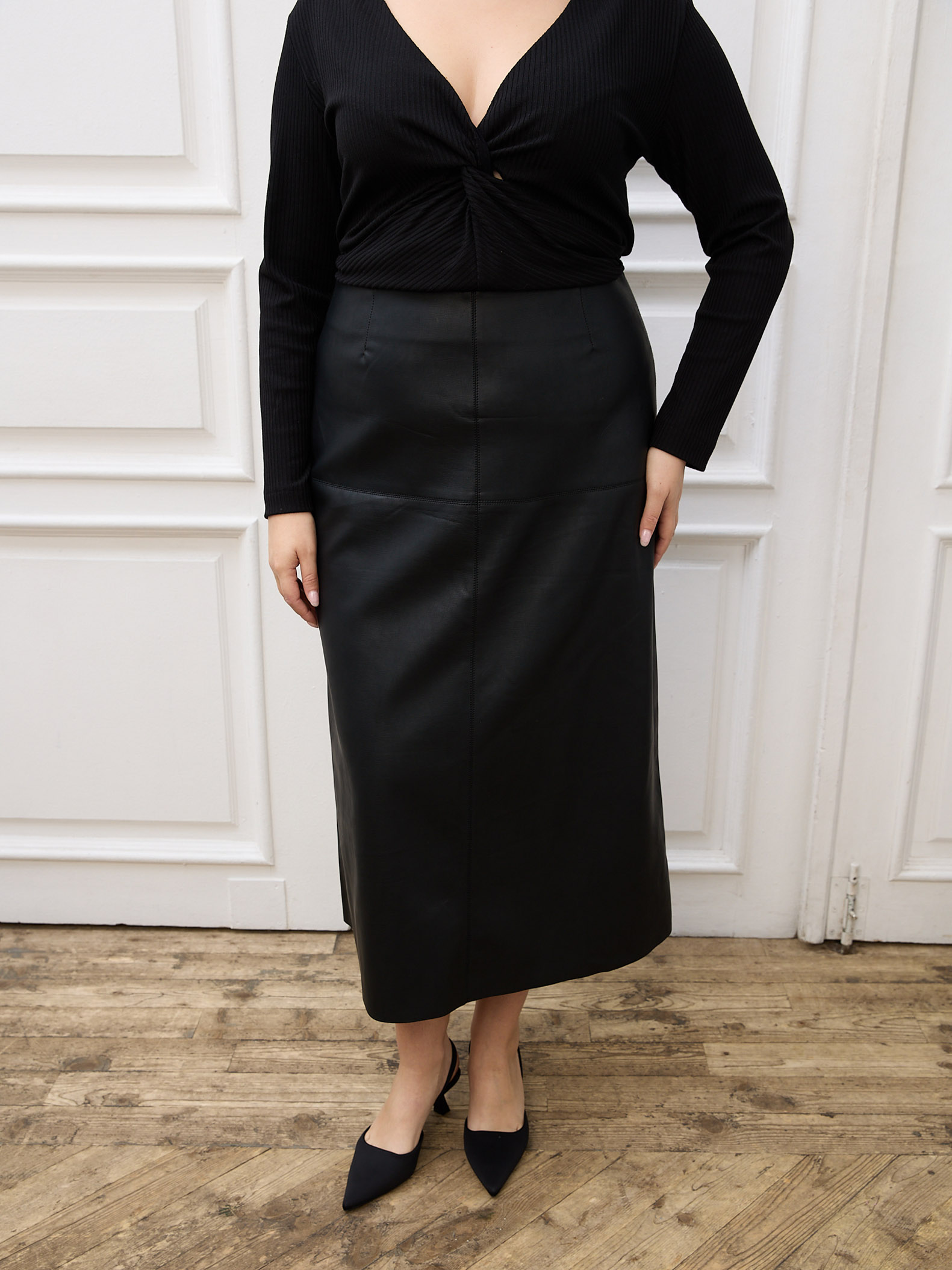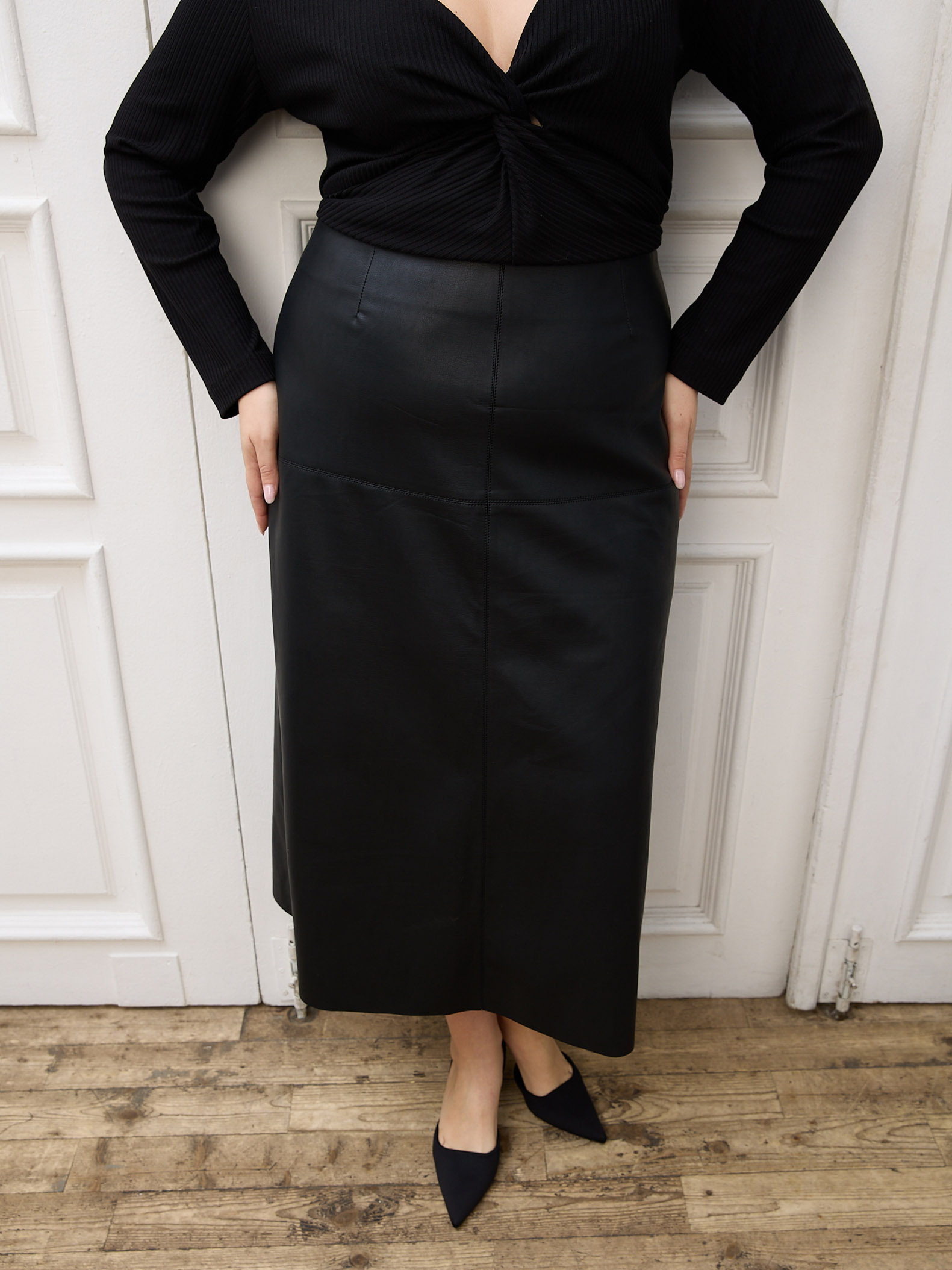 Длинная юбка А-силуэта. На линии бедер декоративно-конструктивный подрез, имитирующий кокетку. Металлическая застежка-молния в среднем шве спинки. Юбка выполнена из экокожи на вискозной основе в черном и бордовом цвете.