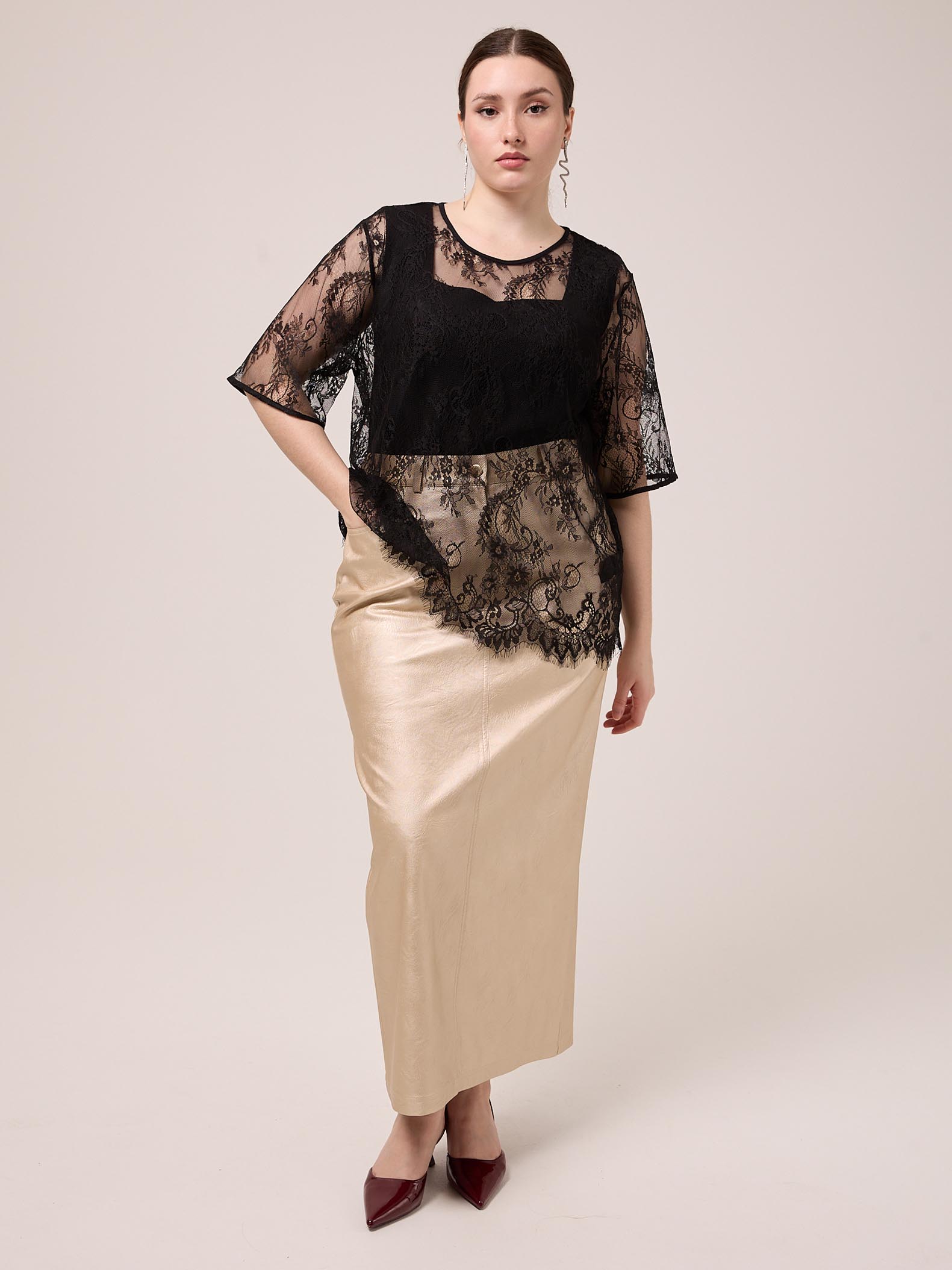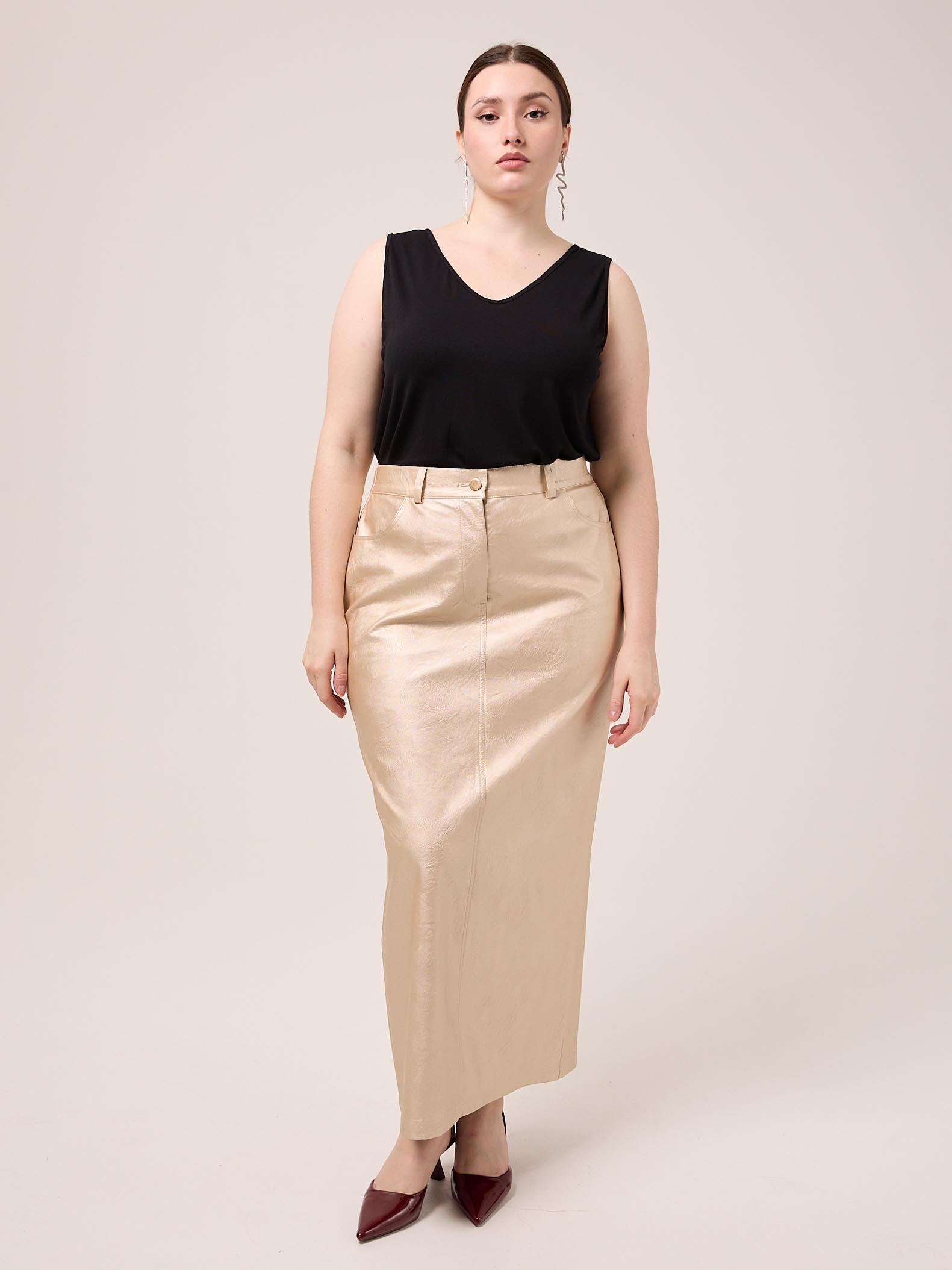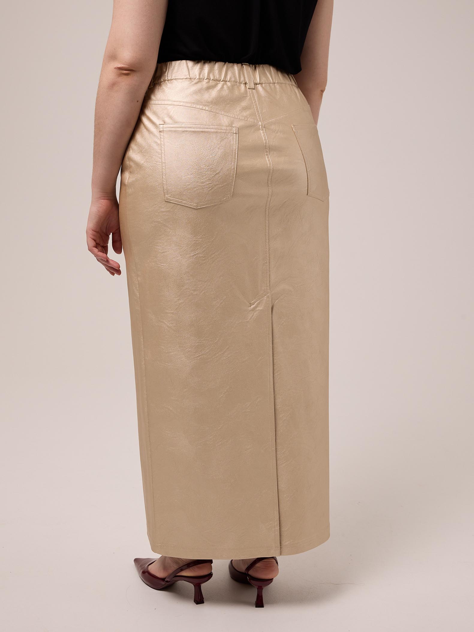 Юбка «карандаш» длиной макси со шлицей сзади. Посадка стандартная. Боковые карманы закругленные, задние карманы -накладные пятиугольные. Пояс частично ( по спинке) выполнен с эластичной тесьмой внутри. Есть шлевки для ремня. Юбка застегивается на металлическую молнию и болт. Модель выполнена из искусственной кожи в двух вариантах: золотом и серебряном.