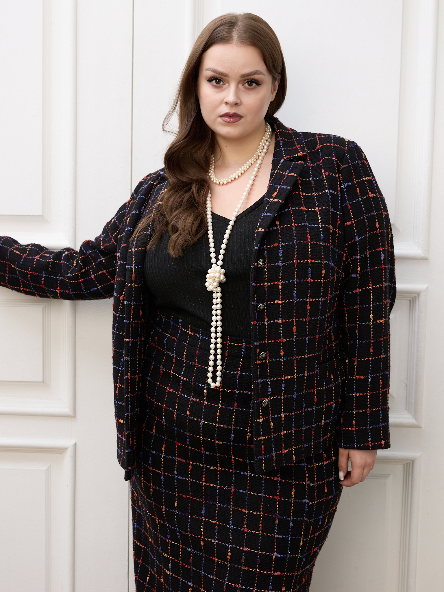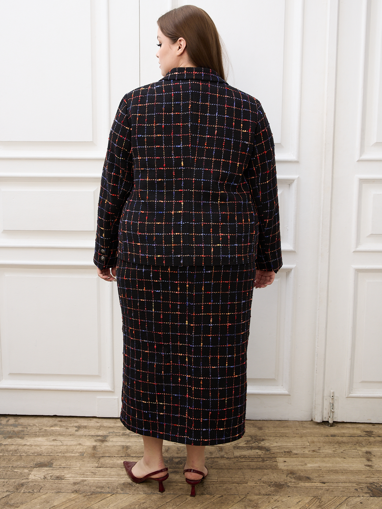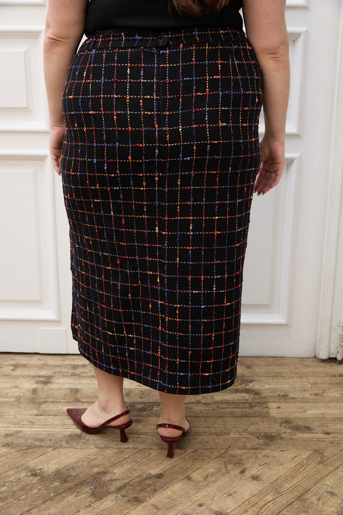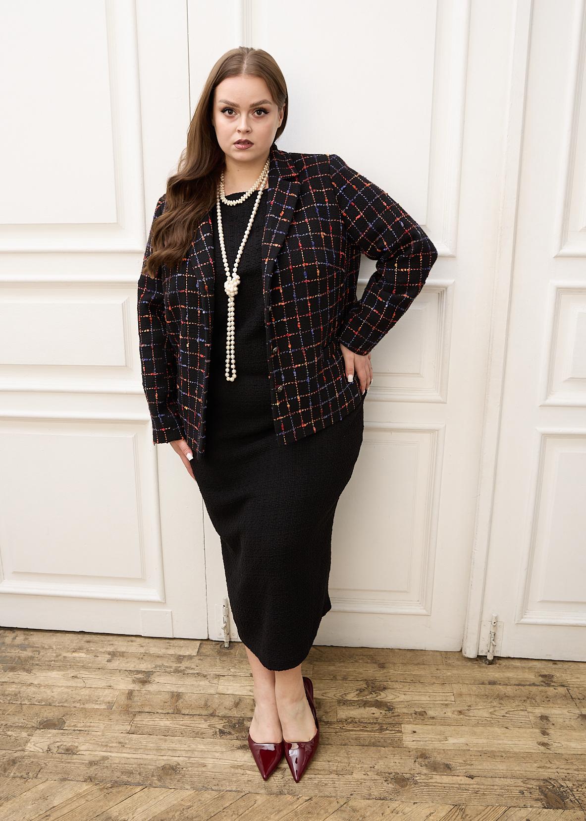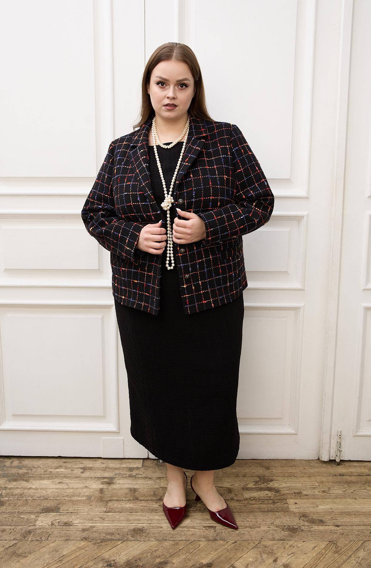 Юбка является частью костюма KLAUDI. Прямая юбка длиной макси. Пояс притачной, частично с резинкой внутри. С левой стороны разрез. Юбка сзади застегивается на молнию и пуговицу. Выполнена из костюмной ткани типа «шанель» с высоким содержанием хлопка и деликатным вкраплением люрекса. Подкладка – поливискоза. Цвет черный с клеткой мультиколор.