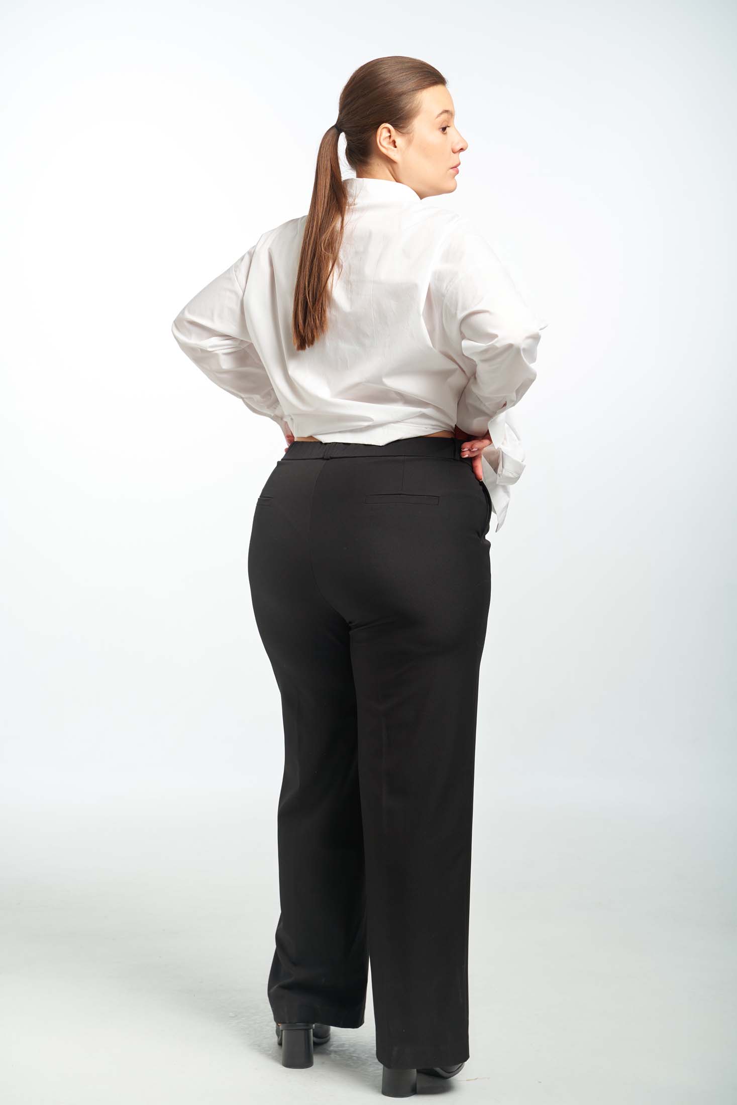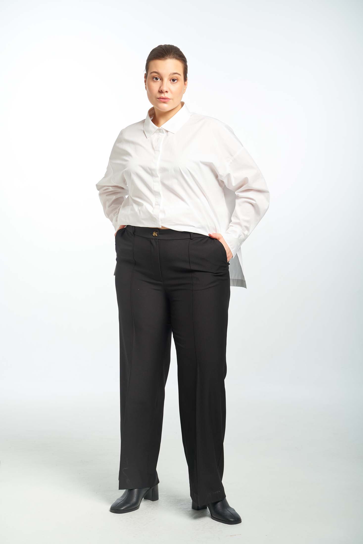Брюки прямого кроя, умеренно широкие по всей длине, с отстроченными стрелками. Пояс притачной, по спинке с эластичной тесьмой внутри. Боковые карманы на передних половинках. На задних половинках ложные карманы с листочками. Застежка спереди на молнию и пуговицу. Выполнены из вискозосодержащей костюмной ткани.