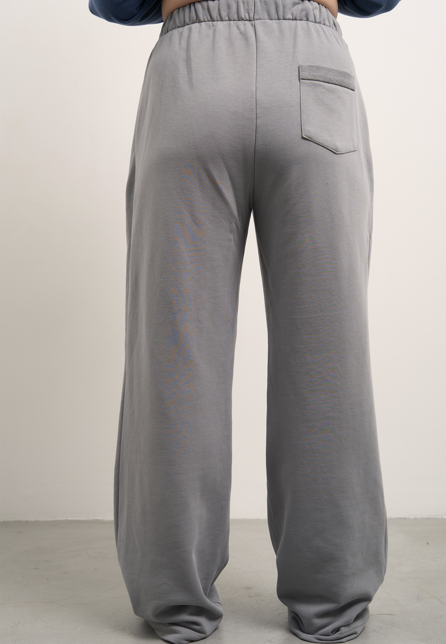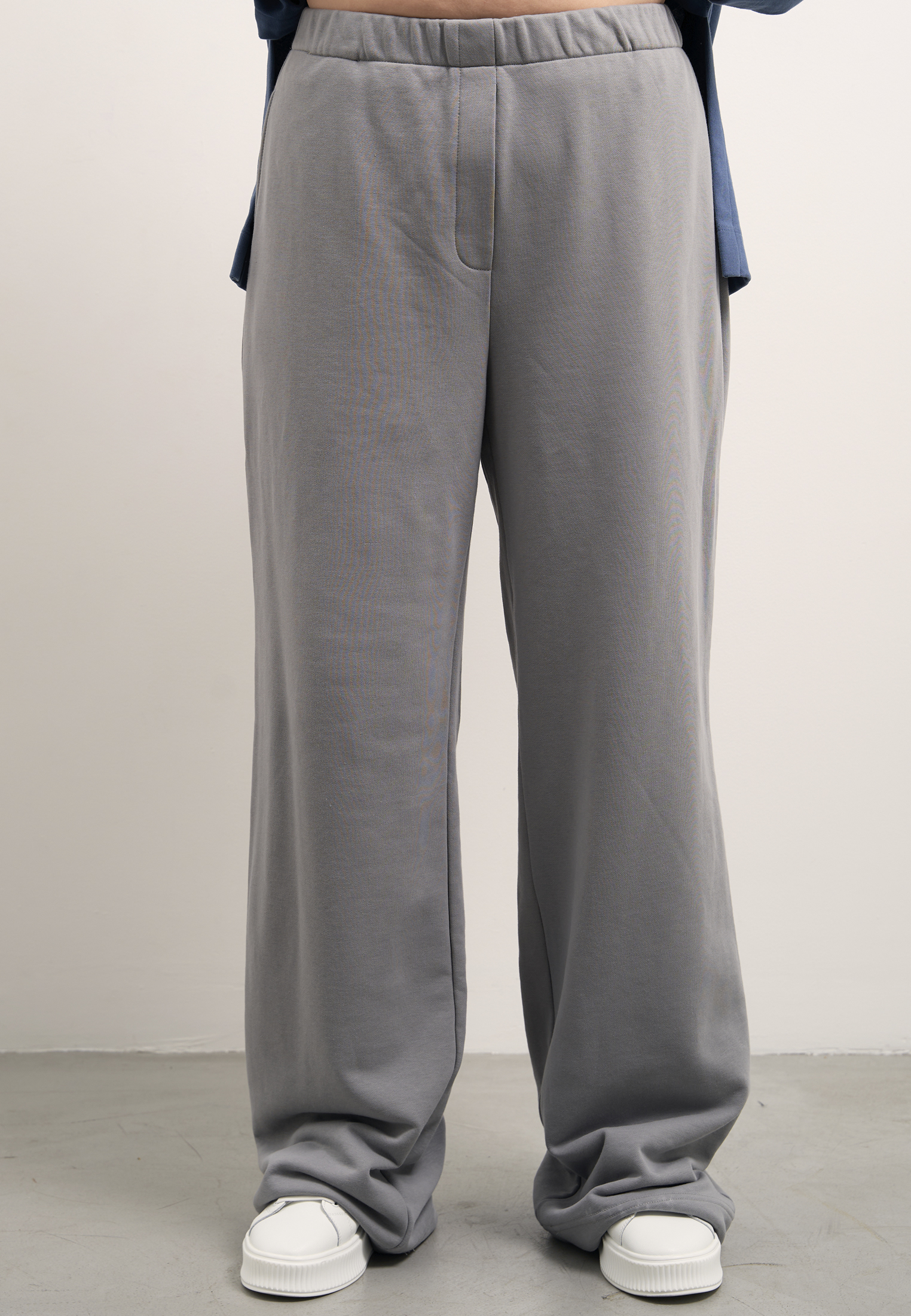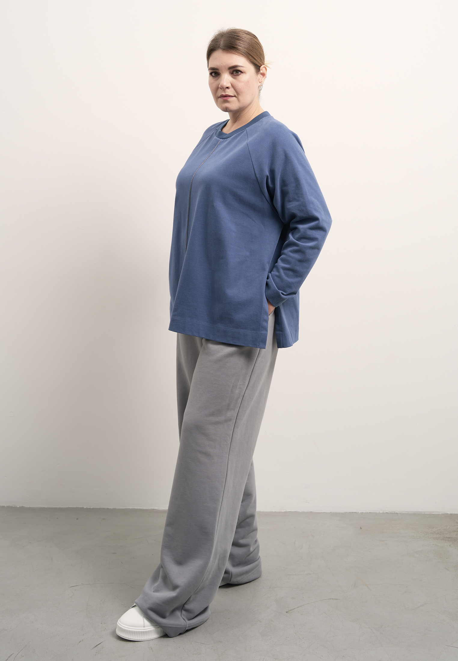 Брюки свободные, широкие по всей длине. Пояс цельнокроенный с эластичной тесьмой внутри и со шнуром. Боковые карманы на передних половинках. На правой задней половинке накладной карман. Брюки выполнены из хлопкового трикотажного футера в двух цветах: сером и темно бежевом.