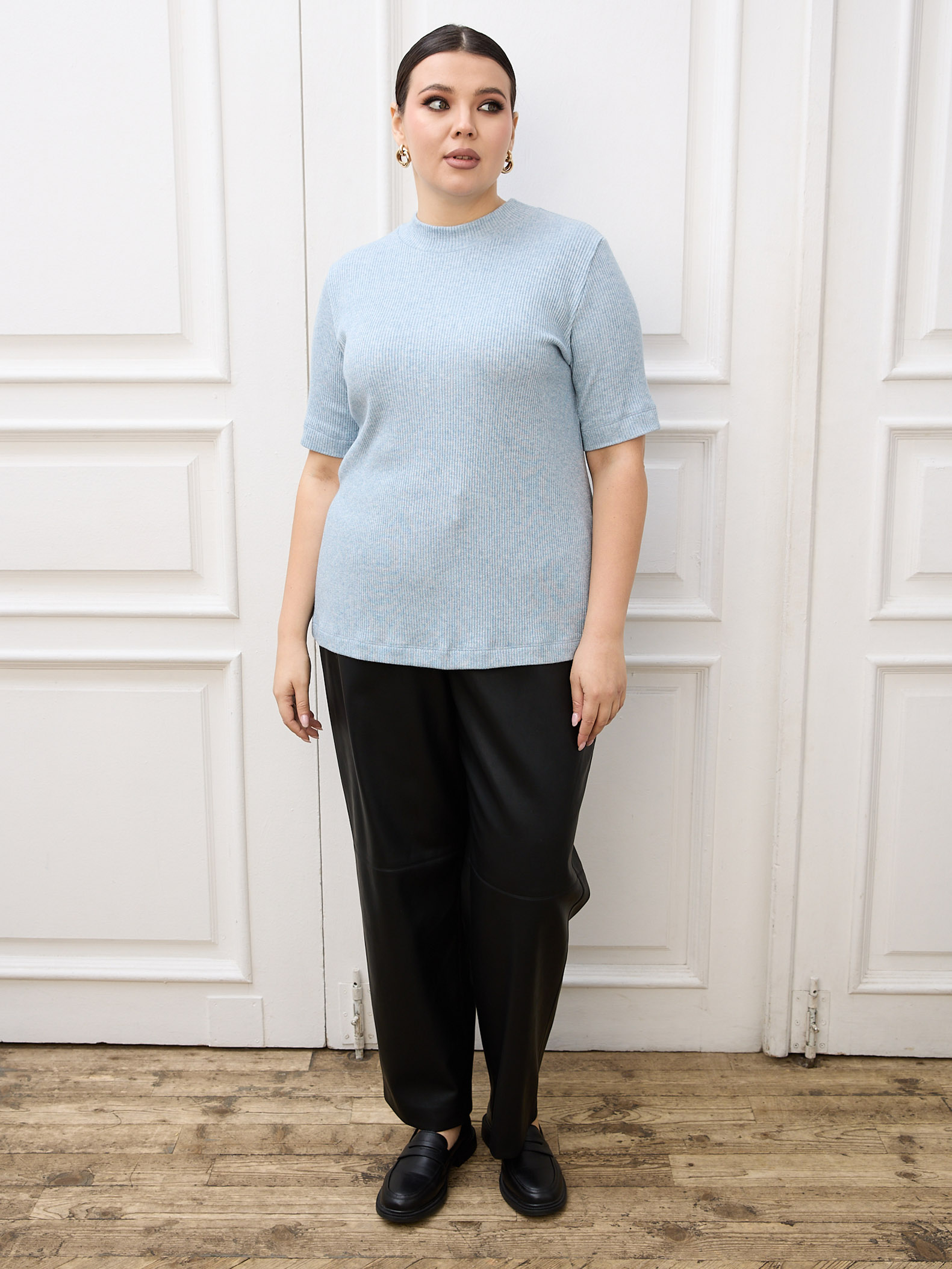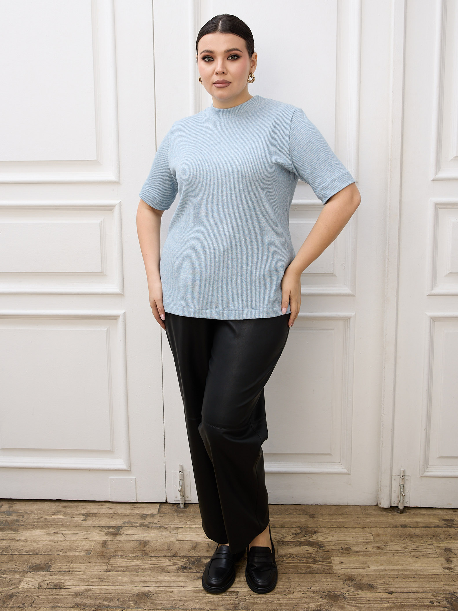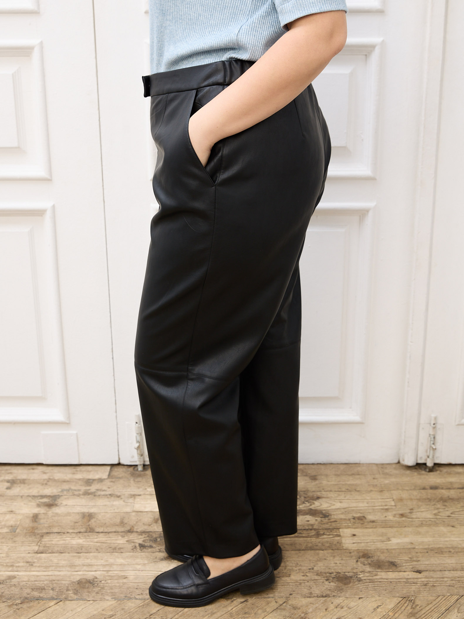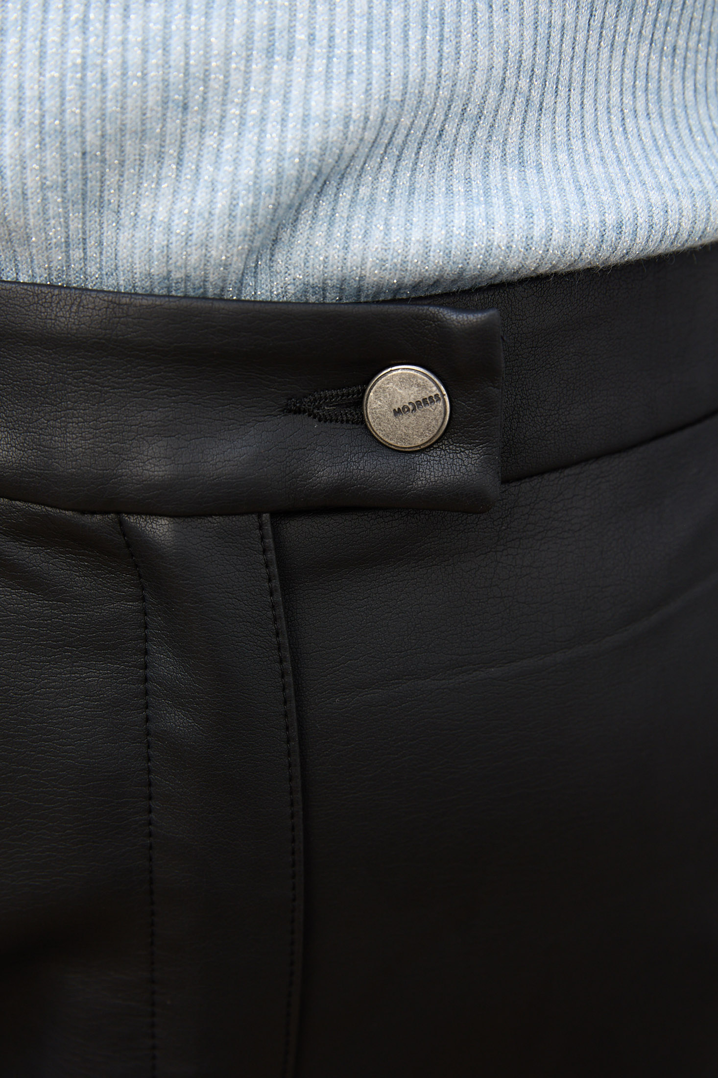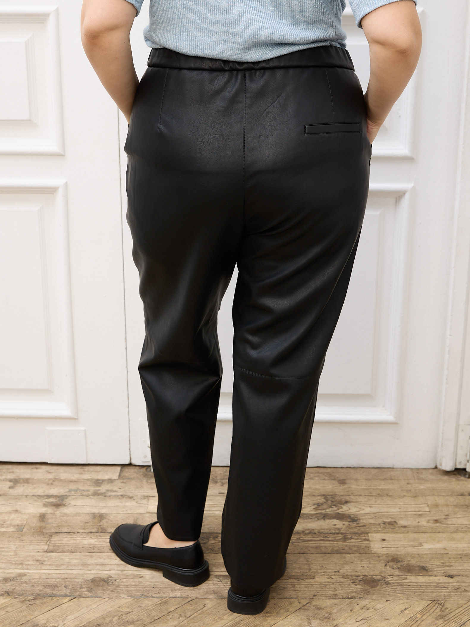 Брюки с классической посадкой, прилегающие в области бедер, немного заужены к низу. Длина до щиколотки. Пояс притачной, по спинке с эластичной тесьмой внутри. Боковые карманы на передних половинках. На правой задней половинке ложный карман «в рамку». Застежка спереди. На передних и задних половинках декоративно-конструктивные подрезы. Брюки выполнены из экокожи на вискозной основе в черном цвете.